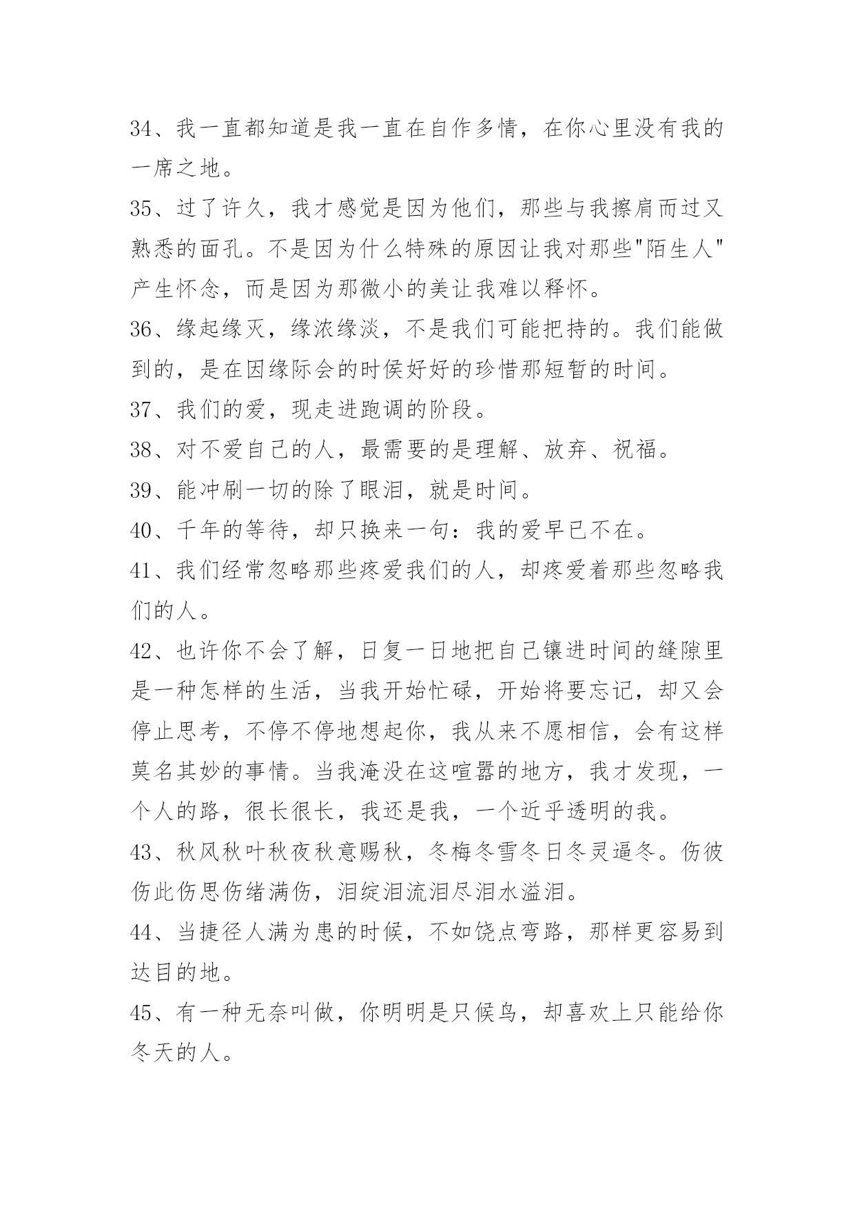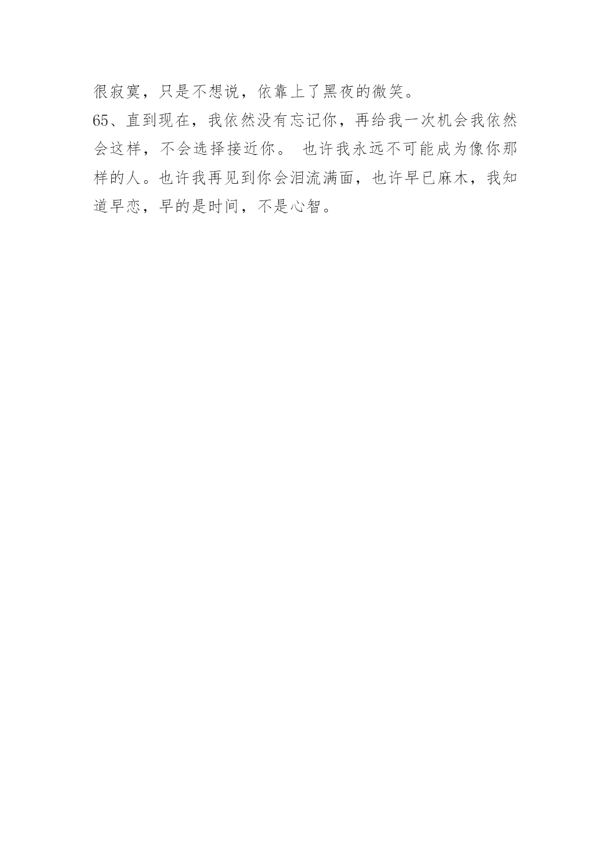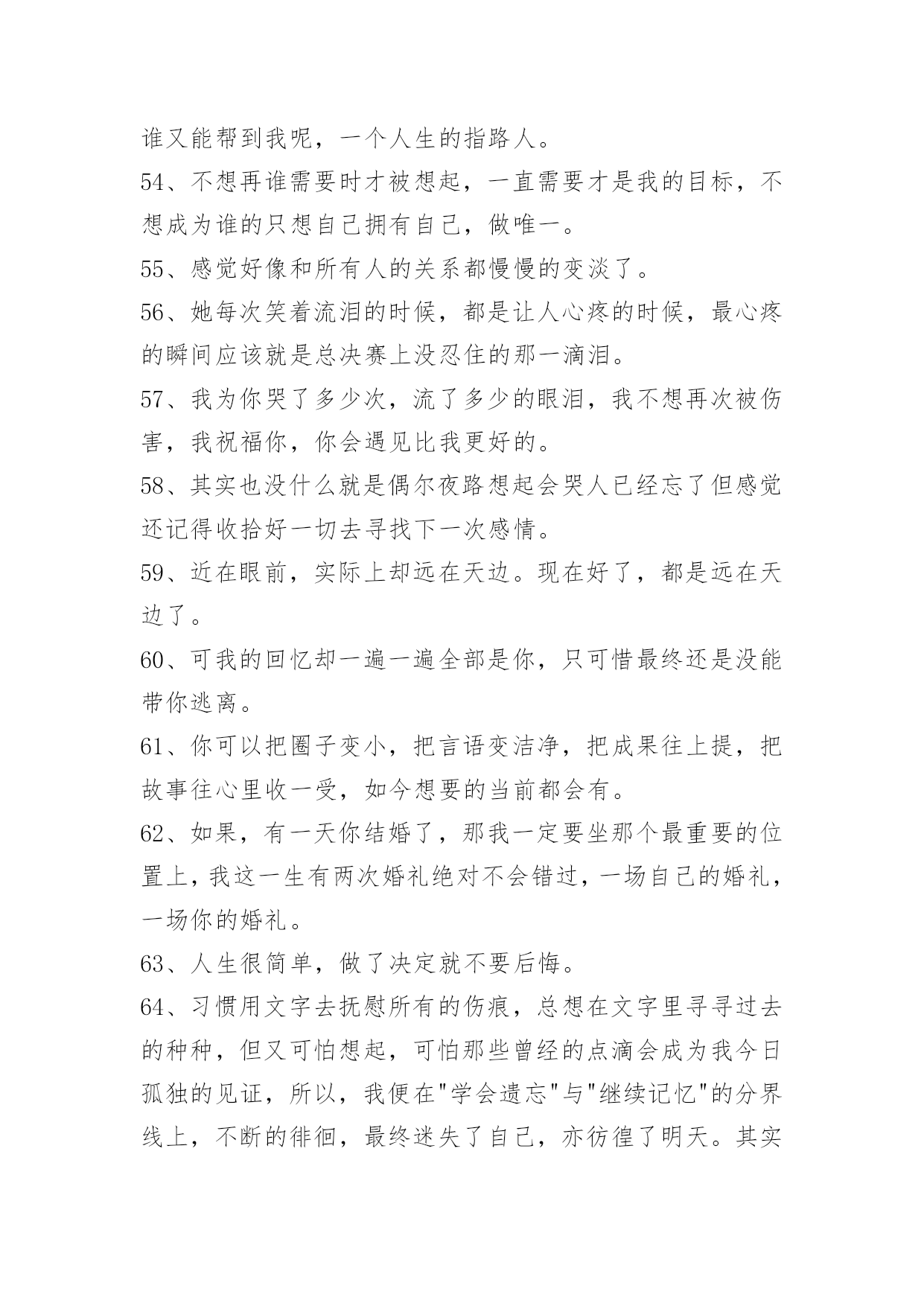 生活伤感句子精选生活伤感句子锦集65句人是无法掌握爱情的。仅有幸福可以自己决定。下面是关于生活伤感句子65句,供各位参考。1、世上无十全十美的事,一个人千辛万苦地去找找一件物事,等得到手也不过如此而已,本来拿在手里的东西却反而抛掉了。2、季节更迭,花开花落,时光流散,流年未尽。人生的浪,潮起潮落,风景便在这起起伏伏中若隐若现,静静的积蓄一份力量,默默的等待一份机遇,方能守得云开见月明,方能拨开迷雾见朝阳!3、无论再尽情的投入再美丽的舞姿…终究是只孤芳自赏的蝴蝶,下场…凄凉。4、最痛的痛是我们永远都提及不起的伤口。5、不想只是看着你的背影,不想只是让自己在爱情里心碎。6、忍着眼泪,许你没有我的未来。7、有些人还没离开你身边,只是因为念旧。8、再心痛的事情也会随着时间的流去而慢慢淡忘记忆,会痛一阵子但是不会痛一辈子。9、其实,越长大越孤单,越长大越对自己失望透顶。10、正如故乡是用来怀念的,青春就是用来追忆的,当你怀揣著它时,它一文不值,只有将它耗尽后,再回过头看,一切才有了意义——爱过我们的人和伤害过我们的人,都是我们青春存在的意义。11、晚自习在课上睡觉,睡到一半起来把灯关了,睡觉的最高境界。12、我住的城市从不下雪,可我还是觉得冷。13、暖律潜催,幽谷暄和,黄鹂翩翩,乍迁芳树。14、我比任何人都更想要你幸福,只是我知道这份幸福没我的份又会很难过。15、闭上眼最后看见的人是你,睁开眼第一个看见的人也是你,真幸福。16、这是不是就是喜欢一个人的感觉,未见思念,相见恨晚。17、听人说,只要转过身,就会有简单的生活,就会幸福;可那些曾经出现在生命里的人和事该怎么落处?18、坚强就是当你哭得撕心裂肺的时候还能给自己来段RAP。19、曾经秉烛夜话,如今水月镜花;人生忽而颠覆,似一把剪刀,剥离了情分二字,相忘天涯。20、我不想藏着对你的表白,要把心里的话儿写下来,贴上含羞草的邮票,传递我的情和爱,何时把这谜底打开,燕子啊快快飞过来。21、我不知道宁静如此的生活是否真的适合我。真实的,乏味。可我却不能再抗拒?我不喜欢带给我束缚的一切。却陷入生活的泥沼。22、忧愁如烟似梦,漫漫浸润那支离破碎的心,在苦苦的追问中,始终寻不到一个答案。23、你是月儿你是花,你是天涯,我是放不下,所有的现在,仅有的曾经,不再续写,不再有人表达我对你的台词,你是曾经戏台的'最美,你是现在电视剧的主角,我没有尽到全部的义务为你演一辈子配角。24、白树刻着那两个字,他们发誓相爱用尽这一生。25、流浪的脚步离开家园,只把乡愁饲养在井中,任何一丝不经意的涟漪,都有可能荡得我遍体伤痕。26、失瞧,有时候也是一种幸福,因为有所期待所以才会失瞧。因为有爱,才会有期待,所以纵使失瞧,也是一种幸福,虽然这种幸福有点痛。27、你所走过的路,不会骗你。28、那些不离不弃,那些那些承诺的誓言,难道只是对游戏?一场游戏。29、忘掉那断回忆删除那断记忆,怎脑海里还是有个你?30、不爱了是什么感觉?我以为没了他的日子不会美好了,却意外的发现我的人生正在逐渐变得越来越来好,起初我想把我们的故事写出来,可是我却懒得去想那些细节了。31、这个城市,夜晚的风很大,你总在最累的时候想起家,最孤独的时候想起他。32、雪泪节日即将来到,幸福快乐为你开道,让你抛弃忧愁烦恼,生活从此充满欢笑。朋友真心向你问候,祝你生活甜蜜美好,愿你的人生永远平安快乐!33、假如有一天我们不在一起了,也要像在一起一样。我才知道,和我共同撑伞的人已经永远离开了我。心在泪如泉涌地笑着。34、我一直都知道是我一直在自作多情,在你心里没有我的一席之地。35、过了许久,我才感觉是因为他们,那些与我擦肩而过又熟悉的面孔。不是因为什么特殊的原因让我对那些"陌生人"产生怀念,而是因为那微小的美让我难以释怀。36、缘起缘灭,缘浓缘淡,不是我们可能把持的。我们能做到的,是在因缘际会的时侯好好的珍惜那短暂的时间。37、我们的爱,现走进跑调的阶段。38、对不爱自己的人,最需要的是理解、放弃、祝福。39、能冲刷一切的除了眼泪,就是时间。40、千年的等待,却只换来一句:我的爱早已不在。41、我们经常忽略那些疼爱我们的人,却疼爱着那些忽略我们的人。42、也许你不会了解,日复一日地把自己镶进时间的缝隙里是一种怎样的生活,当我开始忙碌,开始将要忘记,却又会停止思考,不停不停地想起你,我从来不愿相信,会有这样莫名其妙的事情。当我淹没在这喧嚣的地方,我才发现,一个人的路,很长很长,我还是我,一个近乎透明的我。43、秋风秋叶秋夜秋意赐秋,冬梅冬雪冬日冬灵逼冬。伤彼伤此伤思伤绪满伤,泪绽泪流泪尽泪水溢泪。44、当捷径人满为患的时候,不如饶点弯路,那样更容易到达目的地。45、有一种无奈叫做,你明明是只候鸟,却喜欢上只能给你冬天的人。46、尘在外,心在内,这场爱恋,如烟花