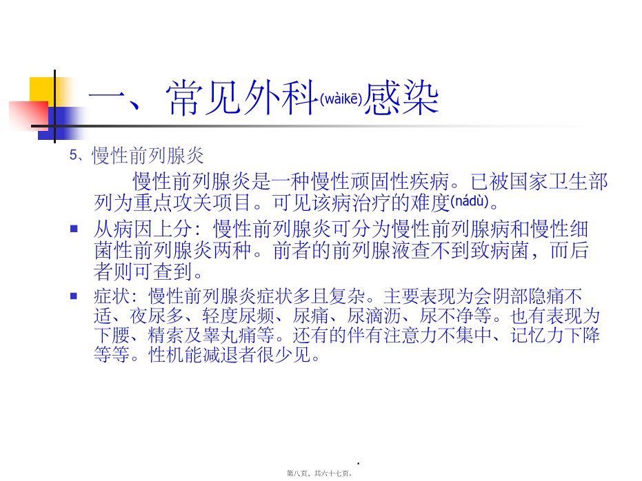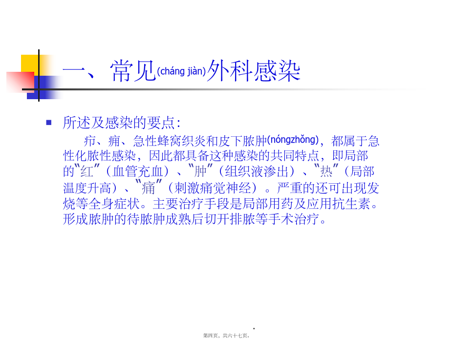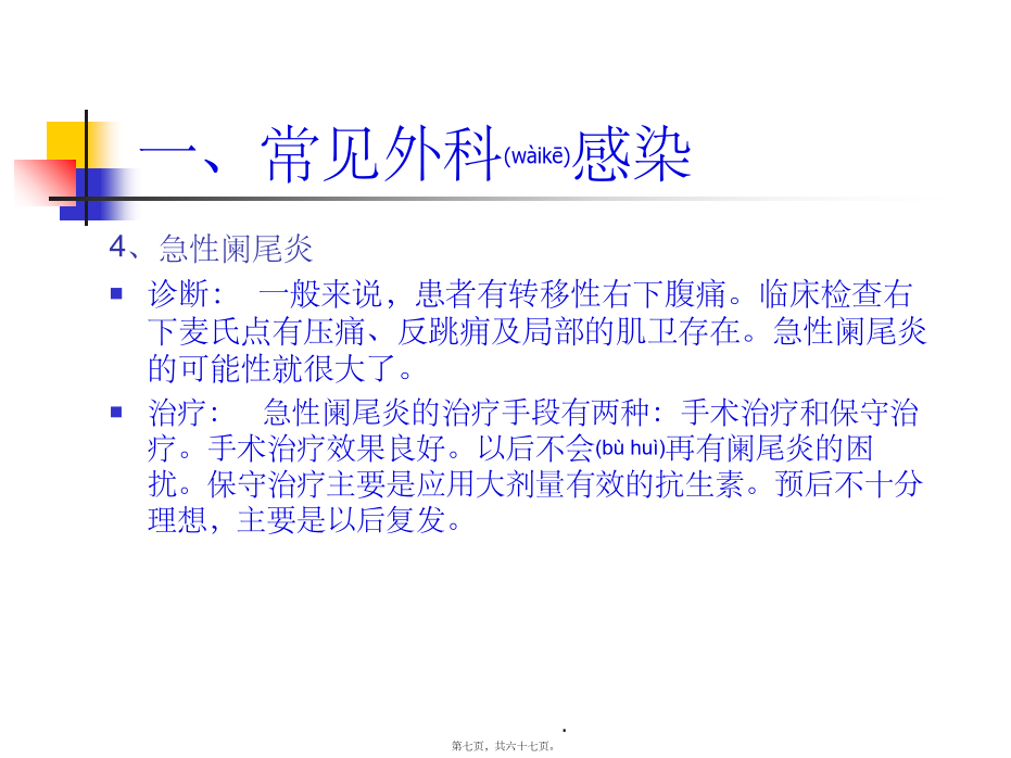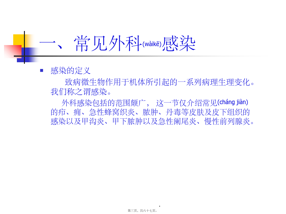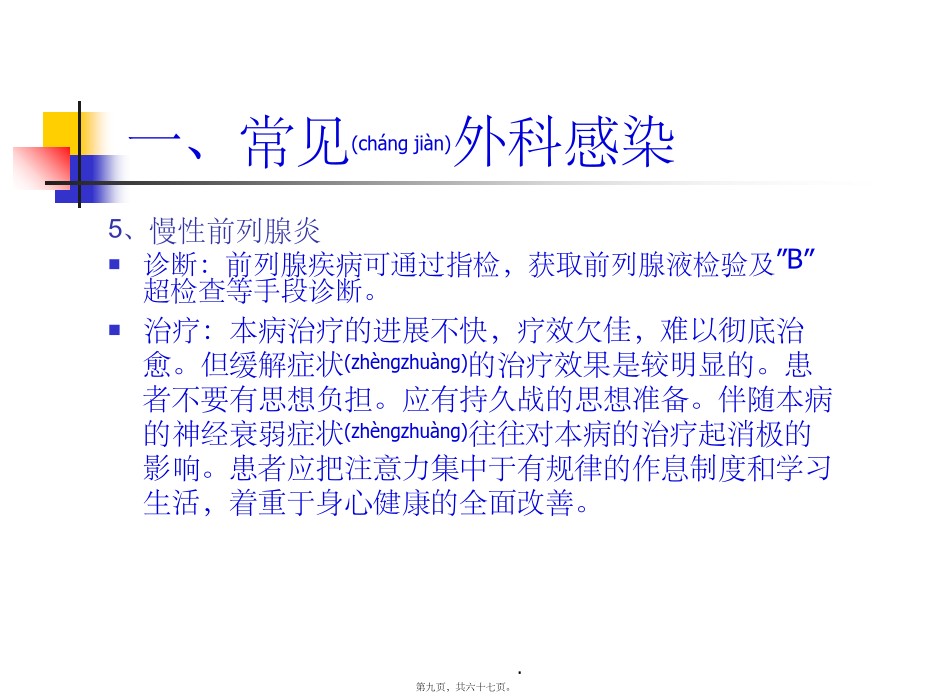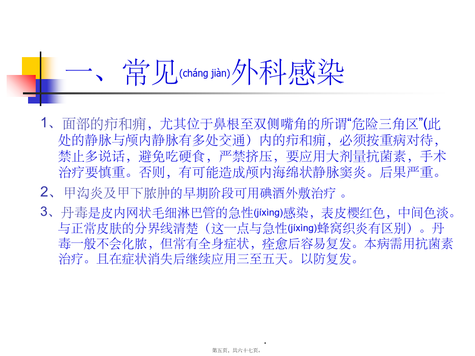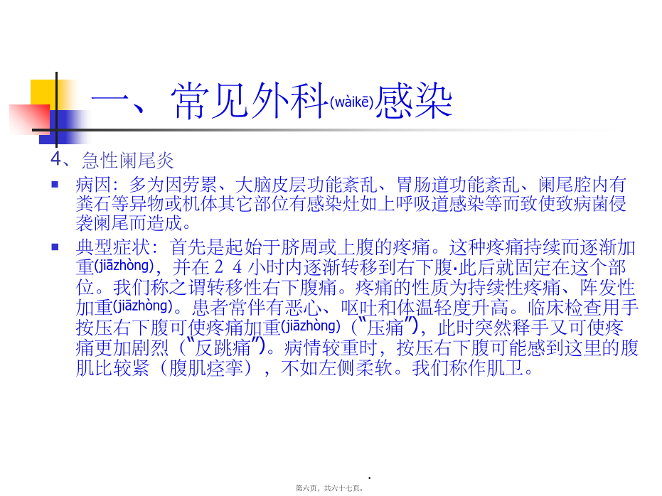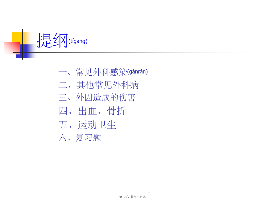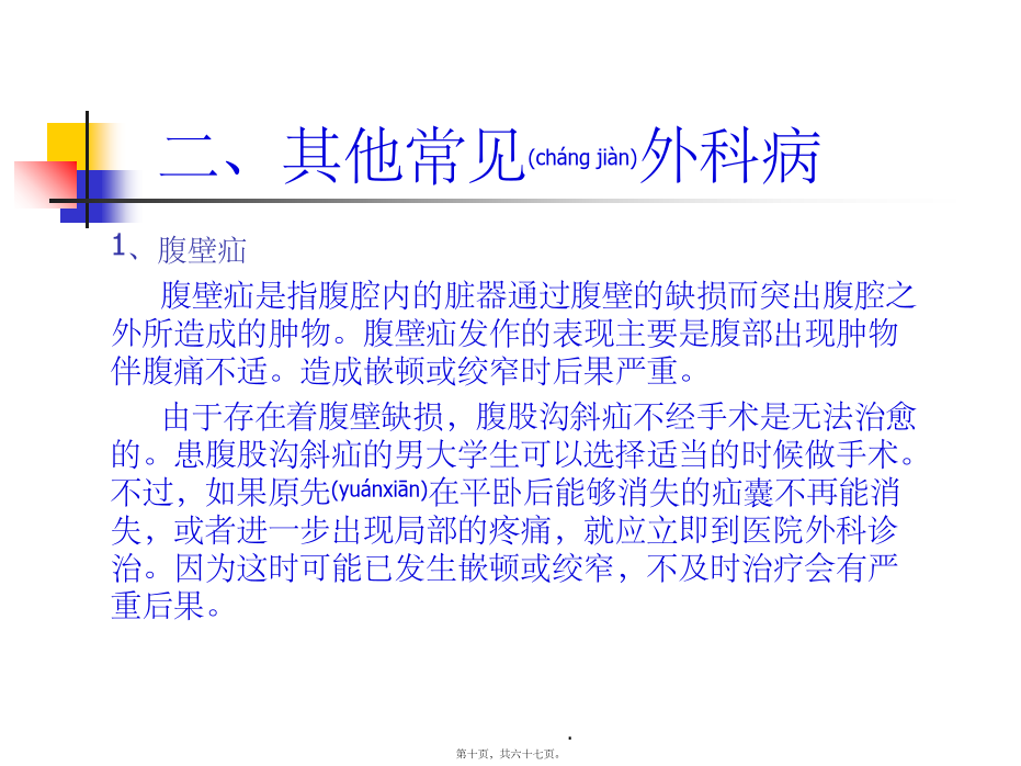 外科常见病及运动(yùndòng)卫生提纲(tígāng)一、常见外科(wàikē)感染一、常见(chánɡjiàn)外科感染一、常见(chánɡjiàn)外科感染一、常见外科(wàikē)感染一、常见外科(wàikē)感染一、常见外科(wàikē)感染一、常见(chánɡjiàn)外科感染二、其他常见(chánɡjiàn)外科病二、其他常见(chánɡjiàn)外科病二、其他(qítā)常见外科病二、其他常见(chánɡjiàn)外科病二、其他常见(chánɡjiàn)外科病二、其他(qítā)常见外科病二、其他常见(chánɡjiàn)外科病二、其他常见(chánɡjiàn)外科病二、其他(qítā)常见外科病二、其他常见(chánɡjiàn)外科病二、其他(qítā)常见外科病三、外因造成(zàochénɡ)的伤害三、外因(wàiyīn)造成的伤害三、外因造成(zàochénɡ)的伤害三、外因造成(zàochénɡ)的伤害三、外因(wàiyīn)造成的伤害三、外因(wàiyīn)造成的伤害三、外因(wàiyīn)造成的伤害四、出血(chūxiě)、骨折四、出血(chūxiě)、骨折四、出血(chūxiě)、骨折四、出血(chūxiě)、骨折四、出血(chūxiě)、骨折四、出血(chūxiě)、骨折四、出血(chūxiě)、骨折五、运动(yùndòng)卫生五、运动(yùndòng)卫生体育运动对身心(shēnxīn)的积极影响体育运动对身心的积极(jījí)影响体育运动(tǐyùyùndòng)对身心的积极影响体育运动对身心的积极(jījí)影响体育运动对身心的积极(jījí)影响体育运动对身心的积极(jījí)影响体育运动(tǐyùyùndòng)对身心的积极影响体育运动(tǐyùyùndòng)对身心的积极影响运动的类型(lèixíng)及其选择运动的类型(lèixíng)及其选择运动的类型(lèixíng)及其选择运动的类型(lèixíng)及其选择运动的类型(lèixíng)及其选择怎样(zěnyàng)掌握运动量怎样掌握(zhǎngwò)运动量-运动强度怎样掌握(zhǎngwò)运动量-运动强度怎样(zěnyàng)掌握运动量-运动强度怎样(zěnyàng)掌握运动量-运动时间怎样(zěnyàng)掌握运动量-运动时间怎样(zěnyàng)掌握运动量怎样掌握运动(yùndòng)量-运动(yùndòng)频度怎样(zěnyàng)掌握运动量体育运动(tǐyùyùndòng)必须遵循的原则循序渐进(xúnxùjiànjìn)的原则个别对待(duìdài)的原则持之以恒(chízhīyǐhéng)的原则注意安全的原则(yuánzé)注意安全的原则(yuánzé)复习题谢谢(xièxie)大家!内容(nèiróng)总结