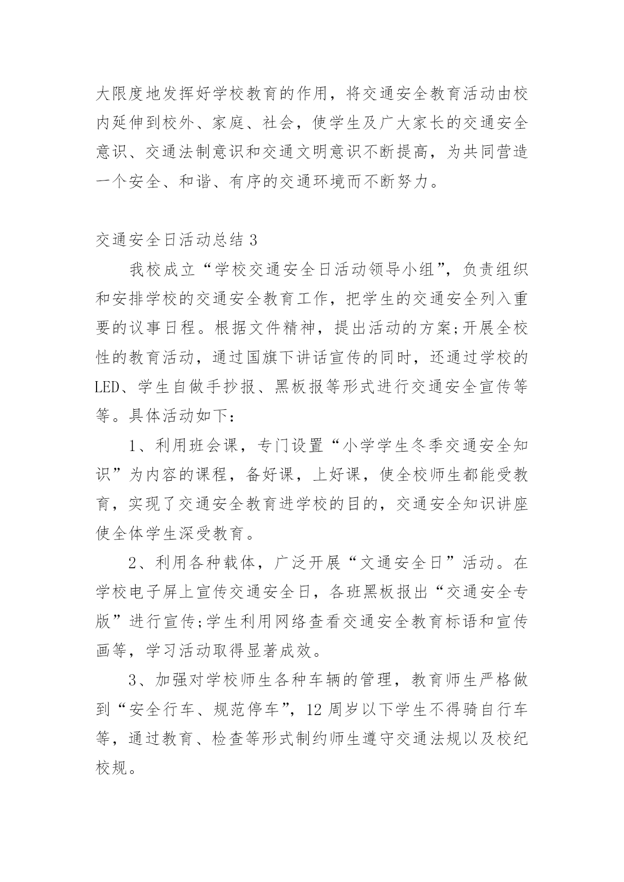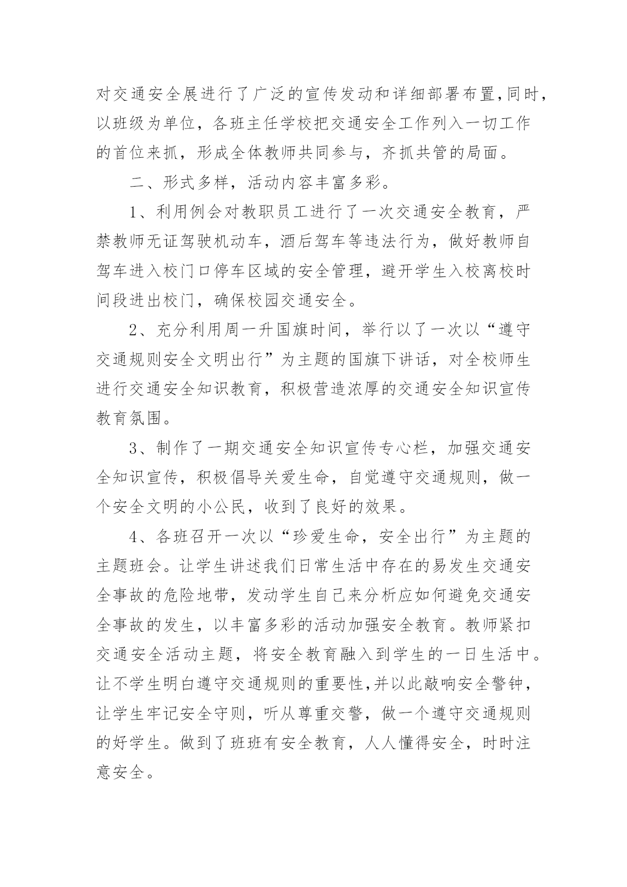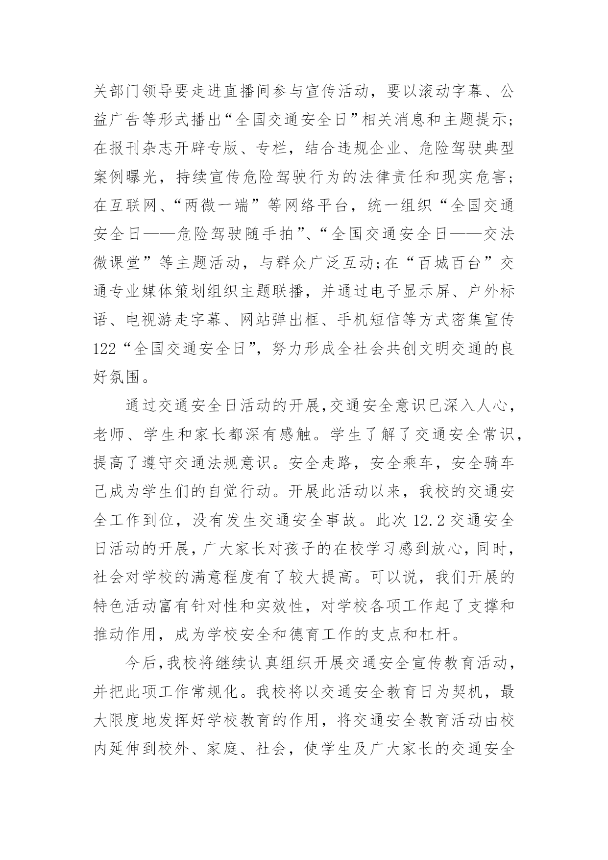 交通安全日活动总结总结是指社会团体、企业单位和个人对某一阶段的学习、工作或其完成情况加以回顾和分析,得出教训和一些规律性认识的一种书面材料,它能够使头脑更加清醒,目标更加明确,不妨坐下来好好写写总结吧。如何把总结做到重点突出呢?下面是小编精心整理的交通安全日活动总结,供大家参考借鉴,希望可以帮助到有需要的朋友。交通安全日活动总结1为认真落实《国务院关于加强道路交通安全工作的意见》,提升全民交通安全意识、法治意识和文明意识,深入推动“文明交通行动计划”实施,形成严格遵守交通法规、自觉维护良好秩序、携手治理交通环境、切实提升文明交通水平的社会氛围,公安部、中央文明办、教育部、司法部、交通运输部、国家安全监管总局等部门,今年将以“拒绝危险驾驶、安全文明出行”为主题,在全国组织开展122“全国交通安全日”主题活动。公安部提出,此次122“全国交通安全日”主题活动,各级公安交管、司法行政、教育行政等部门要开展系列宣传活动,送交通安全法律法规、安全知识进校园、进社区、进企业,让学生、家庭、企业负责人及相关从业人员知法、懂法、守法,进一步提升整个社会的法治交通意识、文明交通水平。要将涉及百姓生活、公共秩序、公共安全的《刑法修正案(九)》等法律法规宣讲纳入12月4日“国家宪法日”主题活动,着重开展“危险驾驶罪”的案例宣传,利用普法宣传阵地,利用新媒体平台开展警示教育。要对公路客运企业、旅游客运企业、校车企业、危化品运输企业进行一次全覆盖的宣讲活动。各级各部门要大量印制、发放、展示带有“122”标识的宣传品,组织重点群体参观交通安全宣传教育基地,开展体验式宣传教育。公安部要求,各级公安交管、交通运输部门要以11月1日《刑法修正案(九)》正式实施为契机,针对在道路上驾驶未取得校车使用许可的机动车从事校车业务或者校车、旅客运输车辆严重超员、严重超速,违规运输危险化学品等危险驾驶行为开展集中整治。在城市道路着重整治追逐竞驶、酒驾、闯红灯、不礼让斑马线等危险驾驶行为,在高速公路着重整治超速、货车占道行驶、占用应急车道等违法行为,在农村道路着重整治面包车超员、货车违法载人、摩托车无牌无证等突出违法行为。要加强大数据信息研判互通,并依托辑查布控系统等信息技术手段,准确掌握违法行为发生量大的重点时段、重点区域和重点企业,组织专门力量开展联合执法,加强路面管控,严查严处突出违法行为;在源头上综合运用法律、经济、行政等手段,对主体责任不落实、内部管理漏洞多、违法违规突出的运输企业,要集中约谈企业负责人,责令加强内部管理,严格落实动态监控制度、内部安全教育制度和“五不两确保”安全承诺制度;对问题严重的,要依法追究企业负责人、安全管理人员责任。各级文明办、共青团、妇联、工会等要充分动员社会各方面资源,结合地区实际,开展文明交通志愿服务引导、扶助事故受害者等公益活动,积极倡导文明出行、礼貌乘车,大力宣传文明交通新风尚,倡导文明交通好习惯。各级交通运输、公安交管部门要集中宣传、公开表彰文明驾驶先进个人、集体和示范村、学校,广泛展示“好交警”、“好司机”的故事,大力传播文明交通正能量。各地各部门要鼓励企事业单位、社会名人发挥示范作用,积极履行社会责任,抵制危险驾驶行为,参加文明交通倡议等主题活动,积极参与“降速五公里”、“系上安全带”、“送头盔下乡”等公益活动。另外,各级各有关部门要集中宣传力量、拓展宣传手段,在农村地区、客货运输企业、驾校组织开展“拒绝危险驾驶”主题宣传教育活动。排查修缮农村地区交通安全宣传设施,依托行政村出入口、村委会(村民服务中心)、国省道沿线自然村醒目位置宣传牌、农村交通安全服务站(劝导站)集中展示主题海报、宣传画和宣传标语,依托县电视台、广播站、乡村广播(大喇叭)开展集中宣传,组织交通安全宣传队深入农村地区宣讲危险驾驶行为的法律责任和现实危害,争取覆盖到全部乡、镇和行政村。各级交通运输、公安交管部门要结合驾驶考试制度改革,组织驾驶培训机构对驾校学员深入开展文明交通理念集中宣传、强化培训。各级交通运输部门要督促客货运输企业向每一位驾驶人告知刑法新规定、发送一次主题短信。并利用广播、电视、报纸、网络等媒体连续推出“全国交通安全日”特别节目,形成集中报道声势。相关部门领导要走进直播间参与宣传活动,要以滚动字幕、公益广告等形式播出“全国交通安全日”相关消息和主题提示;在报刊杂志开辟专版、专栏,结合违规企业、危险驾驶典型案例曝光,持续宣传危险驾驶行为的法律责任和现实危害;在互联网、“两微一端”等网络平台,统一组织“全国交通安全日——危险驾驶随手拍”、“全国交通安全日——交法微课堂”等主题活动,与群众广泛互动;在“百城百台”交通专业媒体策划组织主题联播,并通过电子显示屏、户外标语、电视游走字幕、网站弹出框、手机短信等方式密集宣传122“全国交通安全日”,