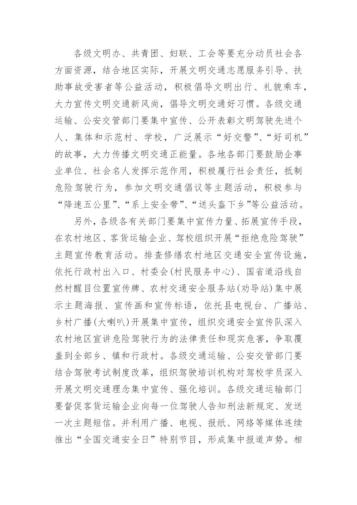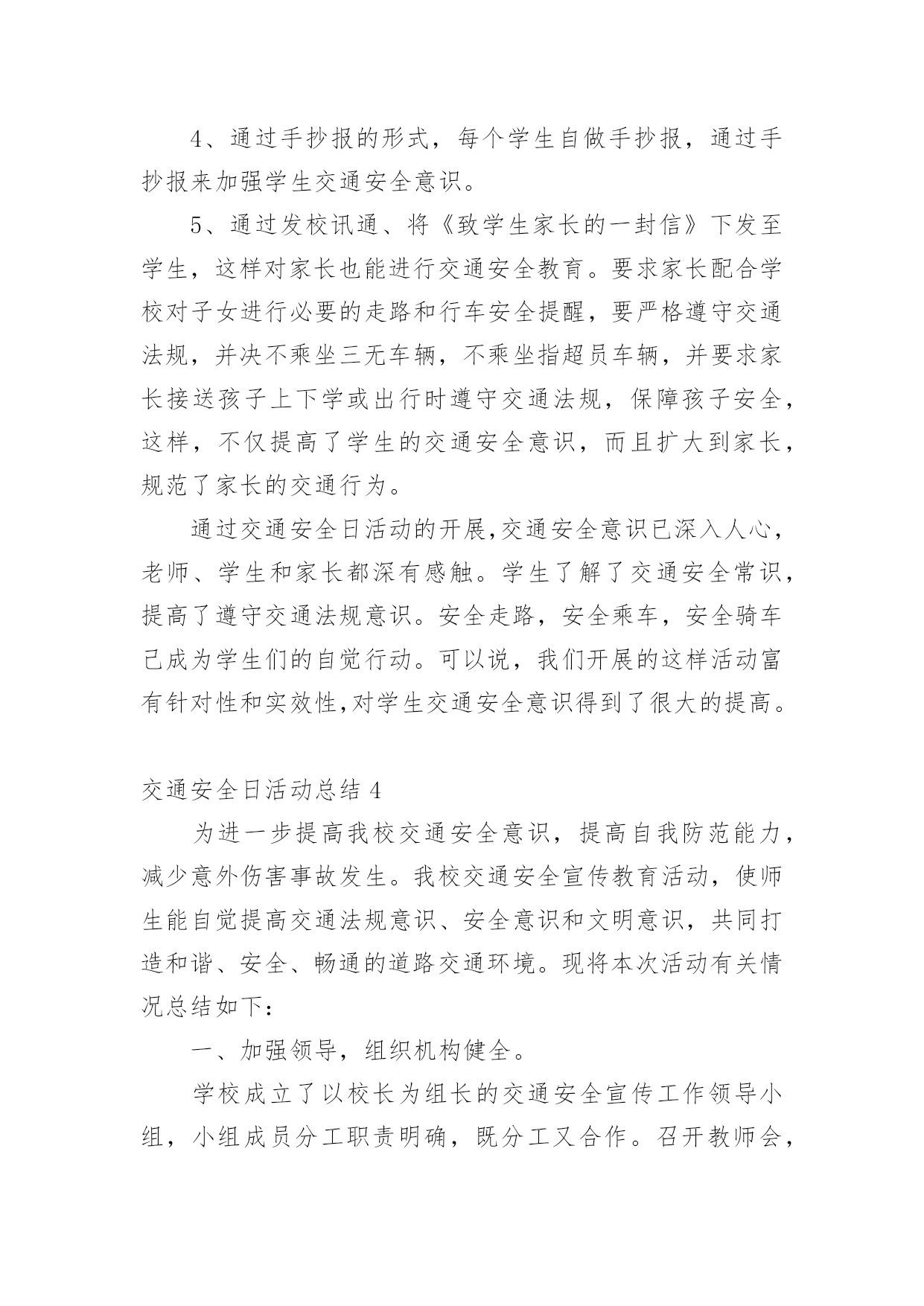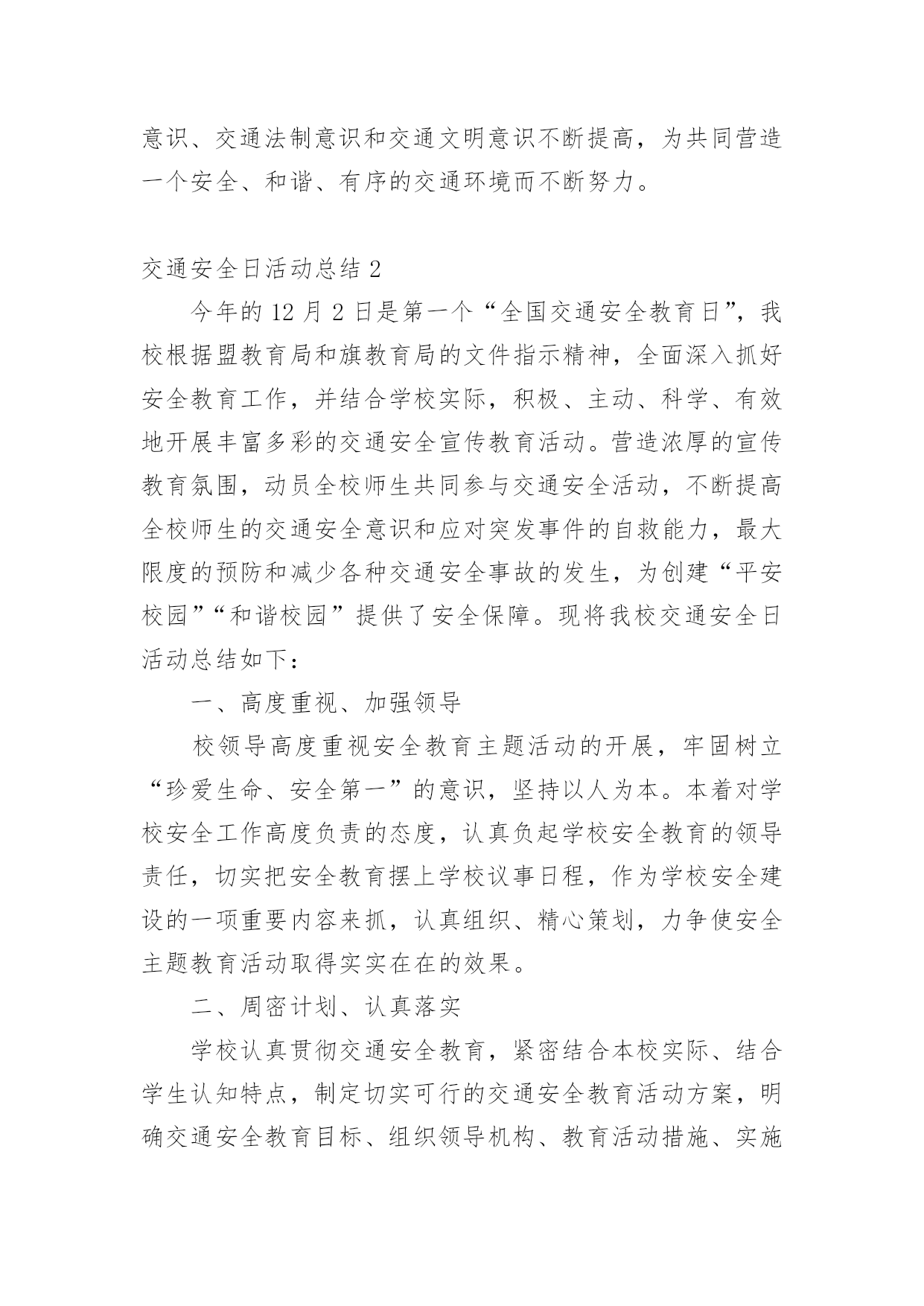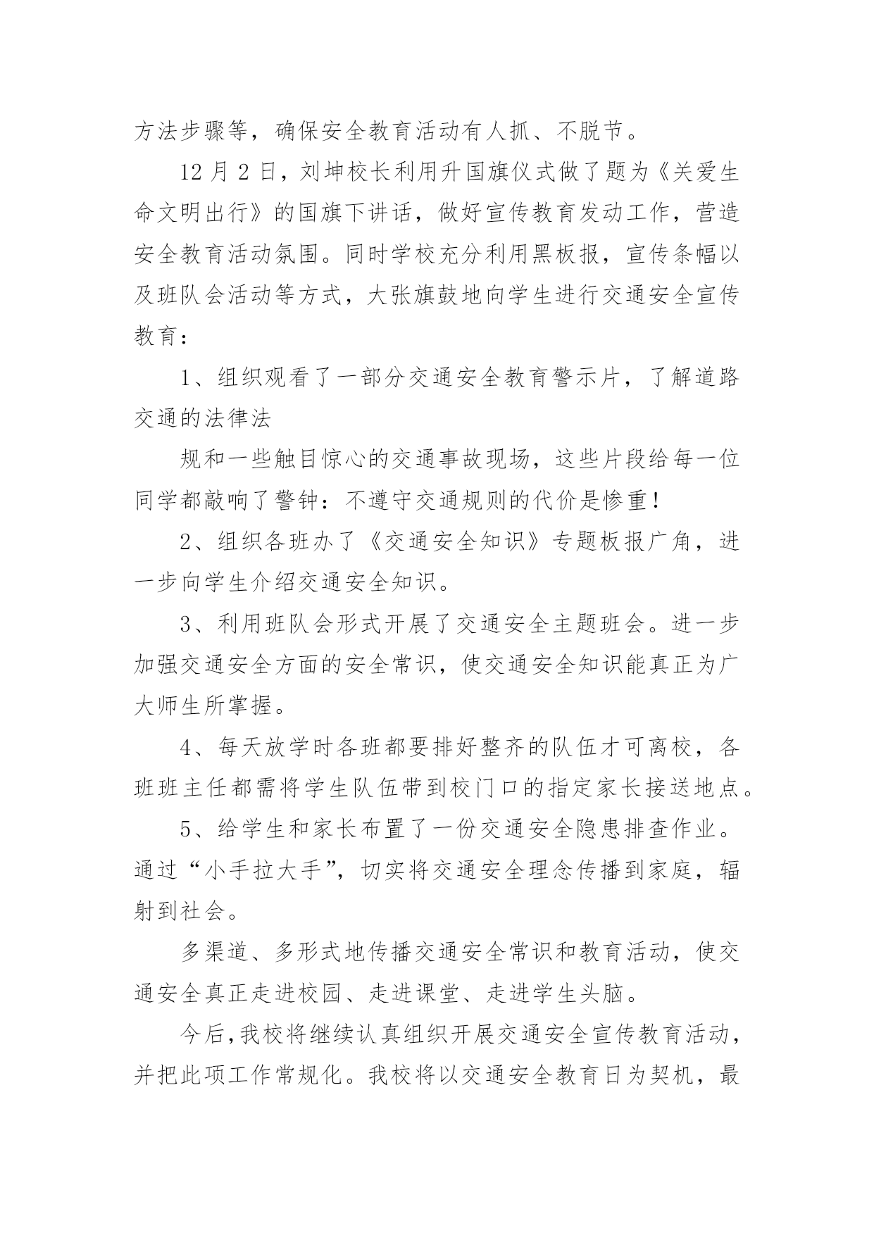 交通安全日活动总结总结是指社会团体、企业单位和个人对某一阶段的学习、工作或其完成情况加以回顾和分析,得出教训和一些规律性认识的一种书面材料,它能够使头脑更加清醒,目标更加明确,不妨坐下来好好写写总结吧。如何把总结做到重点突出呢?下面是小编精心整理的交通安全日活动总结,供大家参考借鉴,希望可以帮助到有需要的朋友。交通安全日活动总结1为认真落实《国务院关于加强道路交通安全工作的意见》,提升全民交通安全意识、法治意识和文明意识,深入推动“文明交通行动计划”实施,形成严格遵守交通法规、自觉维护良好秩序、携手治理交通环境、切实提升文明交通水平的社会氛围,公安部、中央文明办、教育部、司法部、交通运输部、国家安全监管总局等部门,今年将以“拒绝危险驾驶、安全文明出行”为主题,在全国组织开展122“全国交通安全日”主题活动。公安部提出,此次122“全国交通安全日”主题活动,各级公安交管、司法行政、教育行政等部门要开展系列宣传活动,送交通安全法律法规、安全知识进校园、进社区、进企业,让学生、家庭、企业负责人及相关从业人员知法、懂法、守法,进一步提升整个社会的法治交通意识、文明交通水平。要将涉及百姓生活、公共秩序、公共安全的《刑法修正案(九)》等法律法规宣讲纳入12月4日“国家宪法日”主题活动,着重开展“危险驾驶罪”的案例宣传,利用普法宣传阵地,利用新媒体平台开展警示教育。要对公路客运企业、旅游客运企业、校车企业、危化品运输企业进行一次全覆盖的宣讲活动。各级各部门要大量印制、发放、展示带有“122”标识的宣传品,组织重点群体参观交通安全宣传教育基地,开展体验式宣传教育。公安部要求,各级公安交管、交通运输部门要以11月1日《刑法修正案(九)》正式实施为契机,针对在道路上驾驶未取得校车使用许可的机动车从事校车业务或者校车、旅客运输车辆严重超员、严重超速,违规运输危险化学品等危险驾驶行为开展集中整治。在城市道路着重整治追逐竞驶、酒驾、闯红灯、不礼让斑马线等危险驾驶行为,在高速公路着重整治超速、货车占道行驶、占用应急车道等违法行为,在农村道路着重整治面包车超员、货车违法载人、摩托车无牌无证等突出违法行为。要加强大数据信息研判互通,并依托辑查布控系统等信息技术手段,准确掌握违法行为发生量大的重点时段、重点区域和重点企业,组织专门力量开展联合执法,加强路面管控,严查严处突出违法行为;在源头上综合运用法律、经济、行政等手段,对主体责任不落实、内部管理漏洞多、违法违规突出的运输企业,要集中约谈企业负责人,责令加强内部管理,严格落实动态监控制度、内部安全教育制度和“五不两确保”安全承诺制度;对问题严重的,要依法追究企业负责人、安全管理人员责任。各级文明办、共青团、妇联、工会等要充分动员社会各方面资源,结合地区实际,开展文明交通志愿服务引导、扶助事故受害者等公益活动,积极倡导文明出行、礼貌乘车,大力宣传文明交通新风尚,倡导文明交通好习惯。各级交通运输、公安交管部门要集中宣传、公开表彰文明驾驶先进个人、集体和示范村、学校,广泛展示“好交警”、“好司机”的故事,大力传播文明交通正能量。各地各部门要鼓励企事业单位、社会名人发挥示范作用,积极履行社会责任,抵制危险驾驶行为,参加文明交通倡议等主题活动,积极参与“降速五公里”、“系上安全带”、“送头盔下乡”等公益活动。另外,各级各有关部门要集中宣传力量、拓展宣传手段,在农村地区、客货运输企业、驾校组织开展“拒绝危险驾驶”主题宣传教育活动。排查修缮农村地区交通安全宣传设施,依托行政村出入口、村委会(村民服务中心)、国省道沿线自然村醒目位置宣传牌、农村交通安全服务站(劝导站)集中展示主题海报、宣传画和宣传标语,依托县电视台、广播站、乡村广播(大喇叭)开展集中宣传,组织交通安全宣传队深入农村地区宣讲危险驾驶行为的法律责任和现实危害,争取覆盖到全部乡、镇和行政村。各级交通运输、公安交管部门要结合驾驶考试制度改革,组织驾驶培训机构对驾校学员深入开展文明交通理念集中宣传、强化培训。各级交通运输部门要督促客货运输企业向每一位驾驶人告知刑法新规定、发送一次主题短信。并利用广播、电视、报纸、网络等媒体连续推出“全国交通安全日”特别节目,形成集中报道声势。相关部门领导要走进直播间参与宣传活动,要以滚动字幕、公益广告等形式播出“全国交通安全日”相关消息和主题提示;在报刊杂志开辟专版、专栏,结合违规企业、危险驾驶典型案例曝光,持续宣传危险驾驶行为的法律责任和现实危害;在互联网、“两微一端”等网络平台,统一组织“全国交通安全日——危险驾驶随手拍”、“全国交通安全日——交法微课堂”等主题活动,与群众广泛互动;在“百城百台”交通专业媒体策划组织主题联播,并通过电子显示屏、户外标语、电视游走字幕、网站弹出框、手机短信等方式密集宣传122“全国交通安全日”,