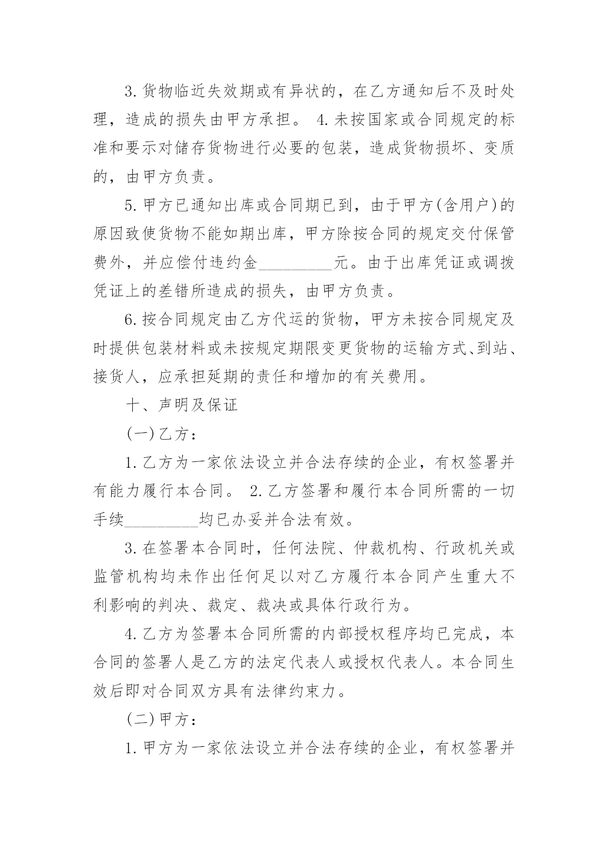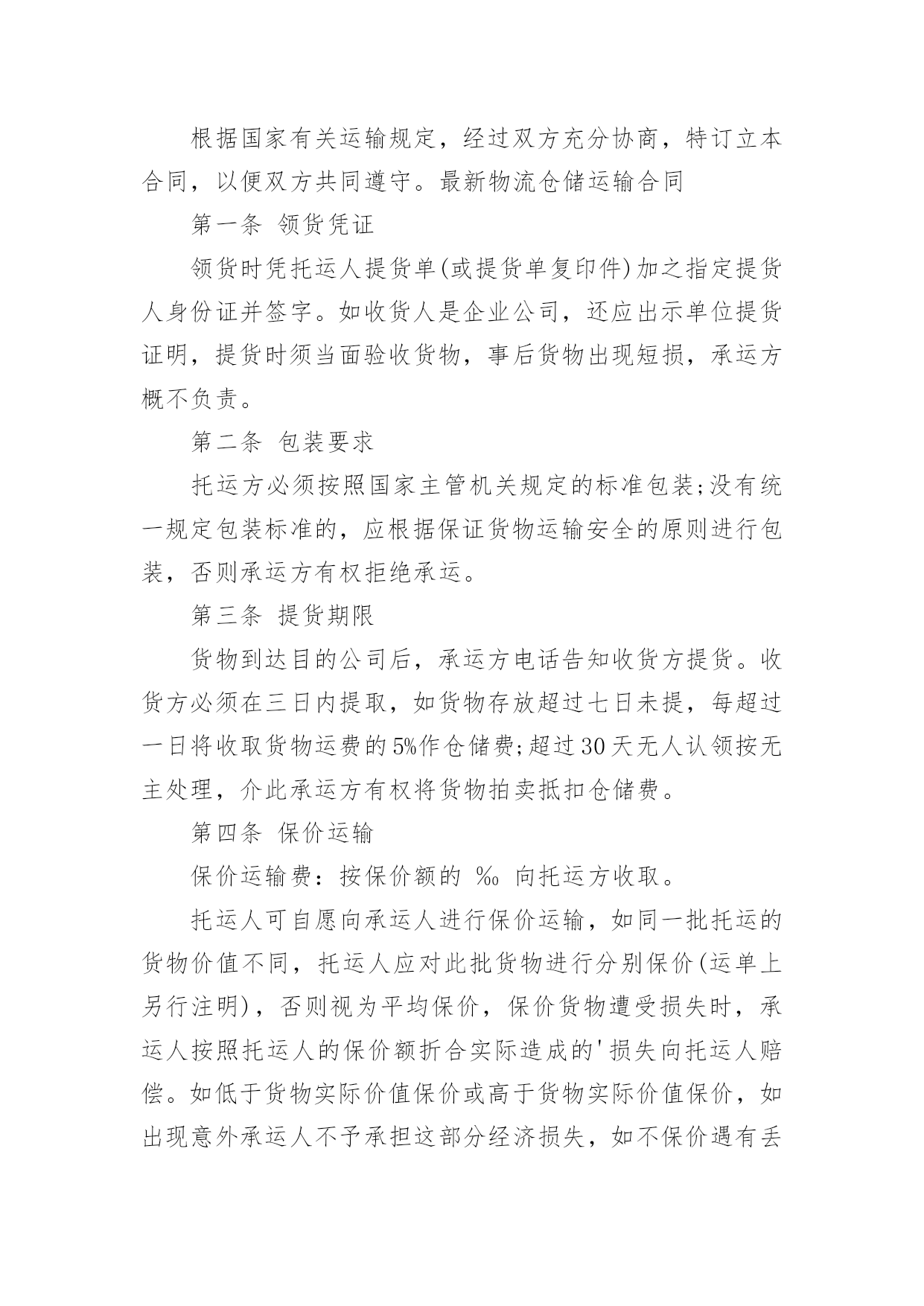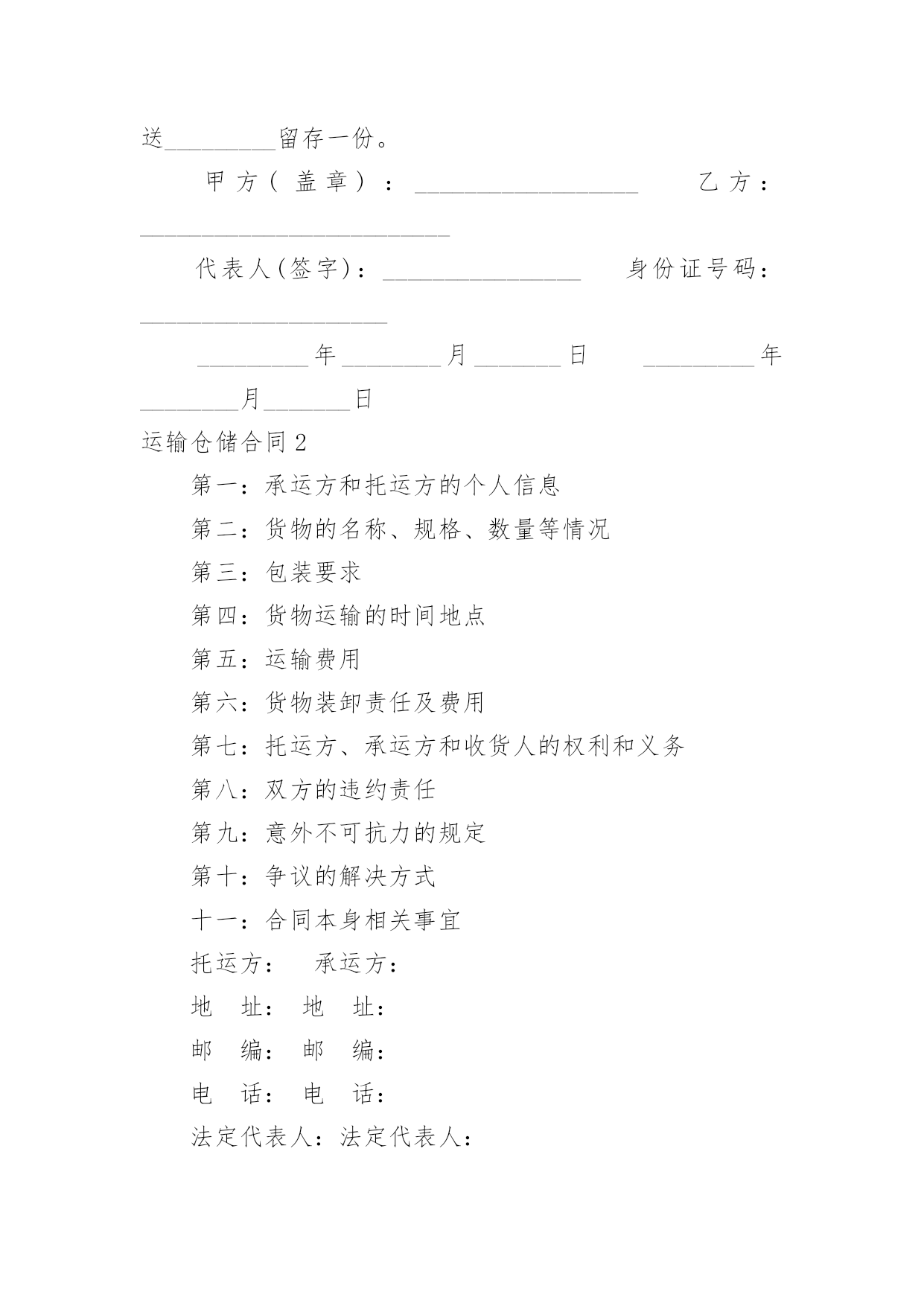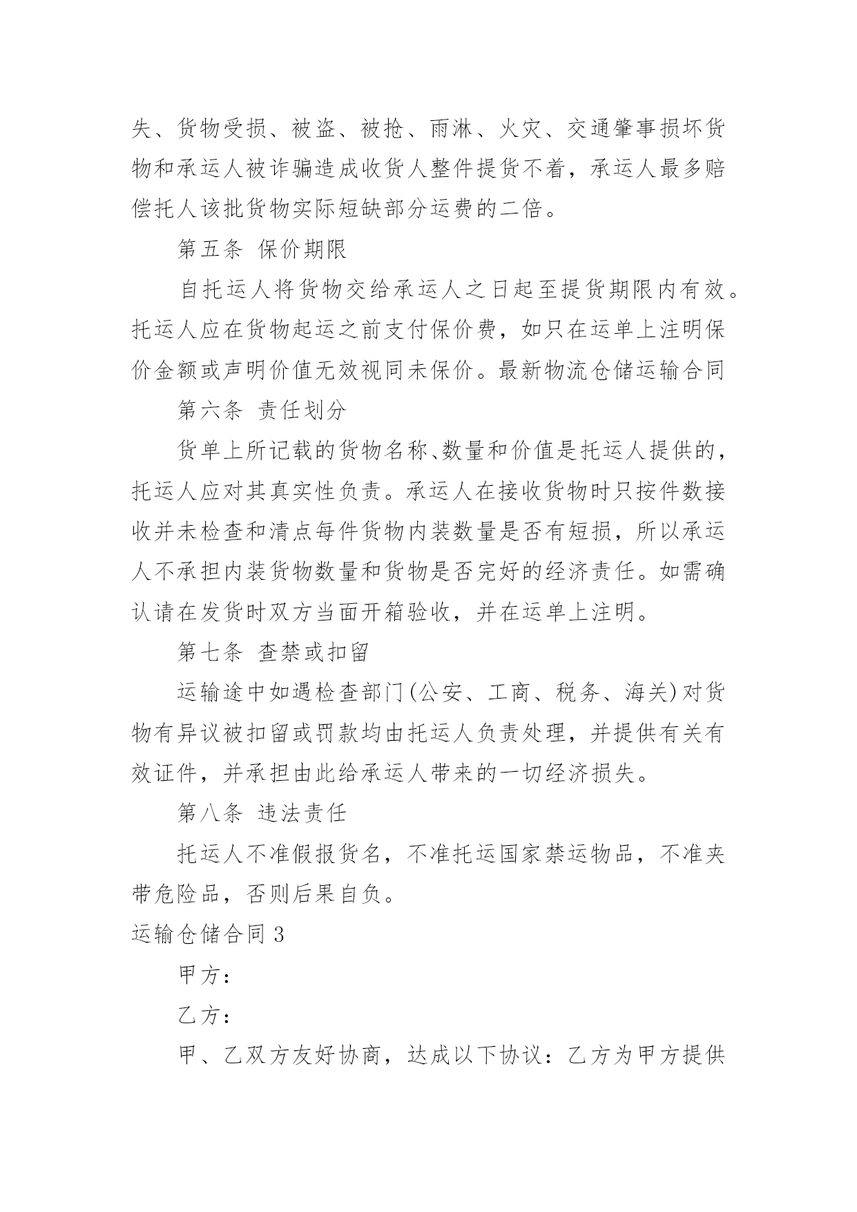 运输仓储合同运输仓储合同(通用13篇)在当今社会,人们对合同愈发重视,合同的使用频率呈上升趋势,在达成意见一致时,制定合同可以享有一定的自由。你所见过的合同是什么样的呢?以下是小编为大家整理的运输仓储合同,希望能够帮助到大家。运输仓储合同1存货方:(以下简称甲方)保管方:(以下简称乙方)_根据《中华人民共和国合同法》的有关规定,乙方和甲方根据委托储存计划和仓储能量的情况,双方协商一致,签订本合同,共同信守。一、仓储物二、仓储费用乙方提供仓库_________平方米由甲方使用,仓库租金按月包库制,每月每平方米_________元,合计月租金为_________元整。三、保管期限保管期限_________年,从_________年_________月_________日至_________年_________月_________日止。四、出入库入库和出库的手续按照有关入库、出库的规定办理,如无规定,按双方协议办理。入库和出库时,双方代表或经办人都应在场,检验后的记录要由双方代表或经办人签字。该记录应视为合同的有效组成部分,当事人双方各保存一份。五、验收1.甲方应当向乙方提供必要的货物验收资料,如未提供必要的货物验收资料或提供的资料不齐全、不及时,所造成的验收差错及贻误索赔期或者发生货物品种、数量、质量不符合合同规定时,乙方不承担赔偿责任。2.乙方应按照合同规定的包装外观、货物品种、数量和质量,对入库物进行验收,如果发现入库货物与合同规定不符,应及时通知甲方。乙方未按规定的项目、方法和期限验收,或验收不准确而造成的实际经济损失,由乙方负责。3.验收期限:_________天。超过验收期限所造成的损失由乙方负责。货物验收期限,是指货物和验收资料全部送达乙方之日起,至验收报告送出之日止。日期均以运输或邮电部门的戳记或直接送达的签收日期为准。六、货物的损耗损耗标准和损耗处理按照有关损耗标准和损耗处理的规定办理,如无规定,按双方协议办理。七、付款1.在保管物交付保管时,甲方应先行交付保管费用的_________%;2.在保管期满,甲方提取保管物时,应交付其余保管费用;3.保管费用以_________(方式)支付。八、乙方的责任1.在货物保管期间,未按合同规定的储存条件和保管要求保管货物,造成货物灭失、短少、变质、污染、损坏的,应承担赔偿责任。如属包装不符合合同规定或超过有效储存期而造成货物损坏、变质的,不负赔偿责任。2.对于危险物品和易腐物品等未按国家和合同规定的要求操作、储存,造成毁损的,应承担赔偿责任。3.由于乙方的责任,造成退仓不能入库时,应按合同规定赔偿甲方运费和支付违约金_________元。4.由乙方负责发运的货物,不能按期发货,应赔偿甲方逾期交货的`损失;错发到货地点,除按合同规定无偿运到规定的到货地点外,并赔偿甲方因此而造成的实际损失。九、甲方的责任1.由于甲方的责任造成退仓不能入库时,甲方应偿付相当于相应保管费_________%(或_________%)的违约金。超议定储存量储存的,甲方除交纳保管费外,还应向乙方偿付违约金_________元,或按双方协议办。2.易燃、易爆、易渗漏、有毒等危险货物以及易腐、超限等特殊货物,必须在合中注明,并向乙方提供必要的保管运输技术资料,否则造成的货物毁损、仓库毁损或人身伤亡,由甲方承担赔偿责任直至刑事责任。3.货物临近失效期或有异状的,在乙方通知后不及时处理,造成的损失由甲方承担。4.未按国家或合同规定的标准和要示对储存货物进行必要的包装,造成货物损坏、变质的,由甲方负责。5.甲方已通知出库或合同期已到,由于甲方(含用户)的原因致使货物不能如期出库,甲方除按合同的规定交付保管费外,并应偿付违约金_________元。由于出库凭证或调拨凭证上的差错所造成的损失,由甲方负责。6.按合同规定由乙方代运的货物,甲方未按合同规定及时提供包装材料或未按规定期限变更货物的运输方式、到站、接货人,应承担延期的责任和增加的有关费用。十、声明及保证(一)乙方:1.乙方为一家依法设立并合法存续的企业,有权签署并有能力履行本合同。2.乙方签署和履行本合同所需的一切手续_________均已办妥并合法有效。3.在签署本合同时,任何法院、仲裁机构、行政机关或监管机构均未作出任何足以对乙方履行本合同产生重大不利影响的判决、裁定、裁决或具体行政行为。4.乙方为签署本合同所需的内部授权程序均已完成,本合同的签署人是乙方的法定代表人或授权代表人。本合同生效后即对合同双方具有法律约束力。(二)甲方:1.甲方为一家依法设立并合法存续的企业,有权签署并有能力履行本合同。2.甲方签署和履行本合同所需的一切手续_________均已办妥并合法有效。3.在签署本合同时,任何法院、仲裁机构、行政机关或监管机构均未作出任何足以对甲