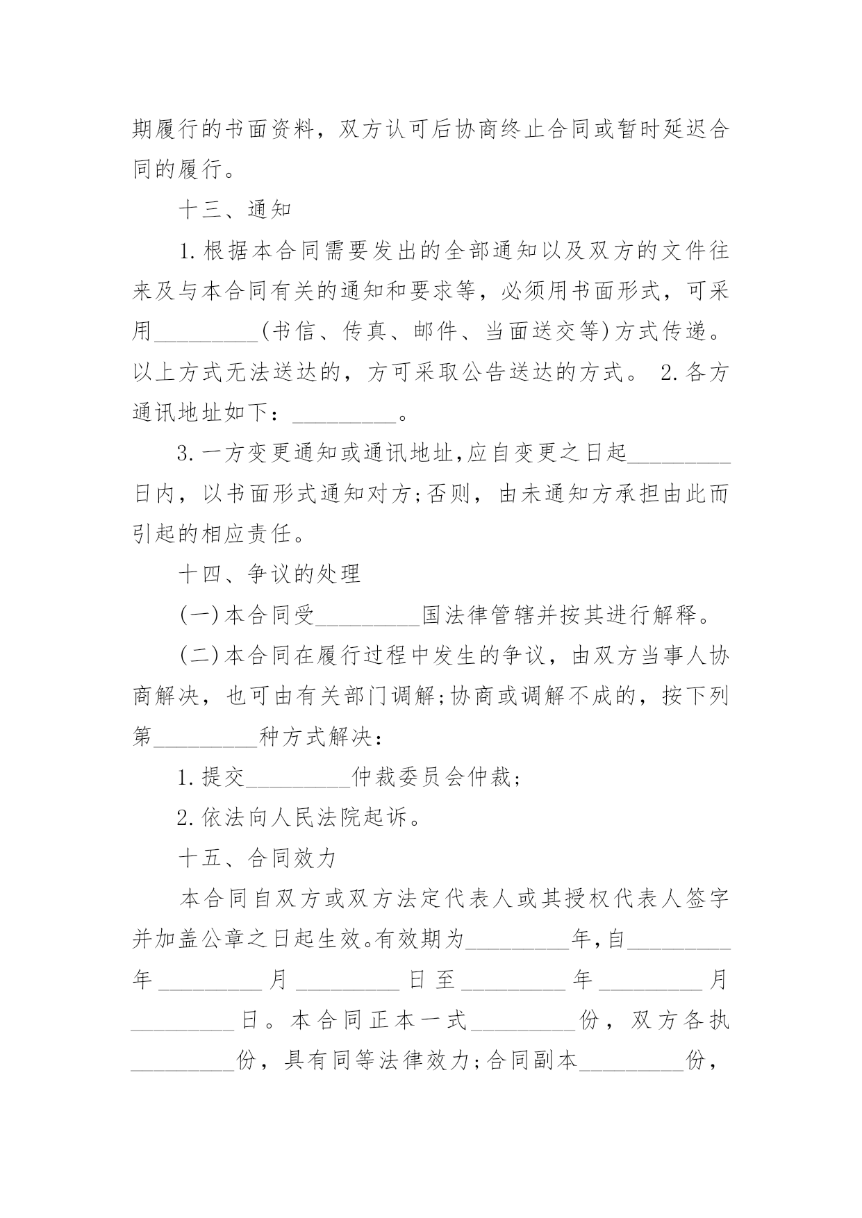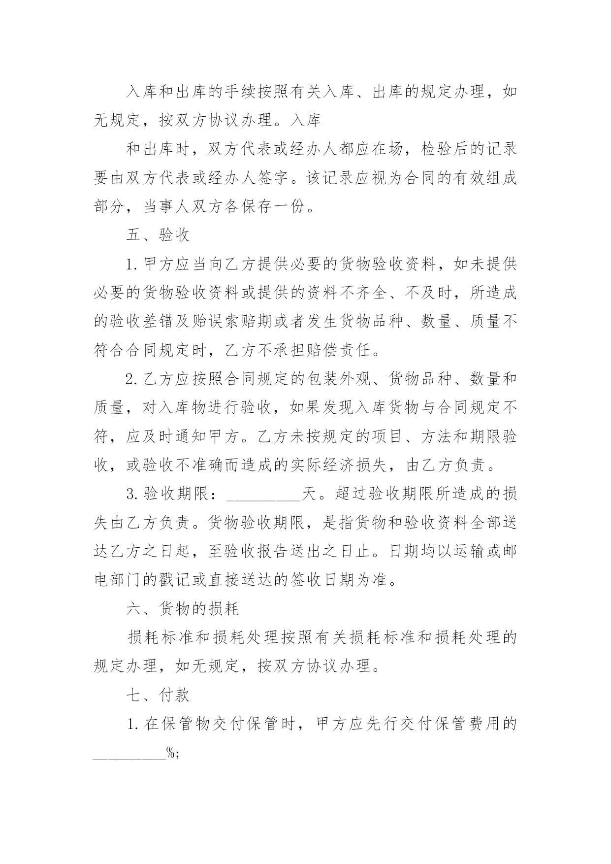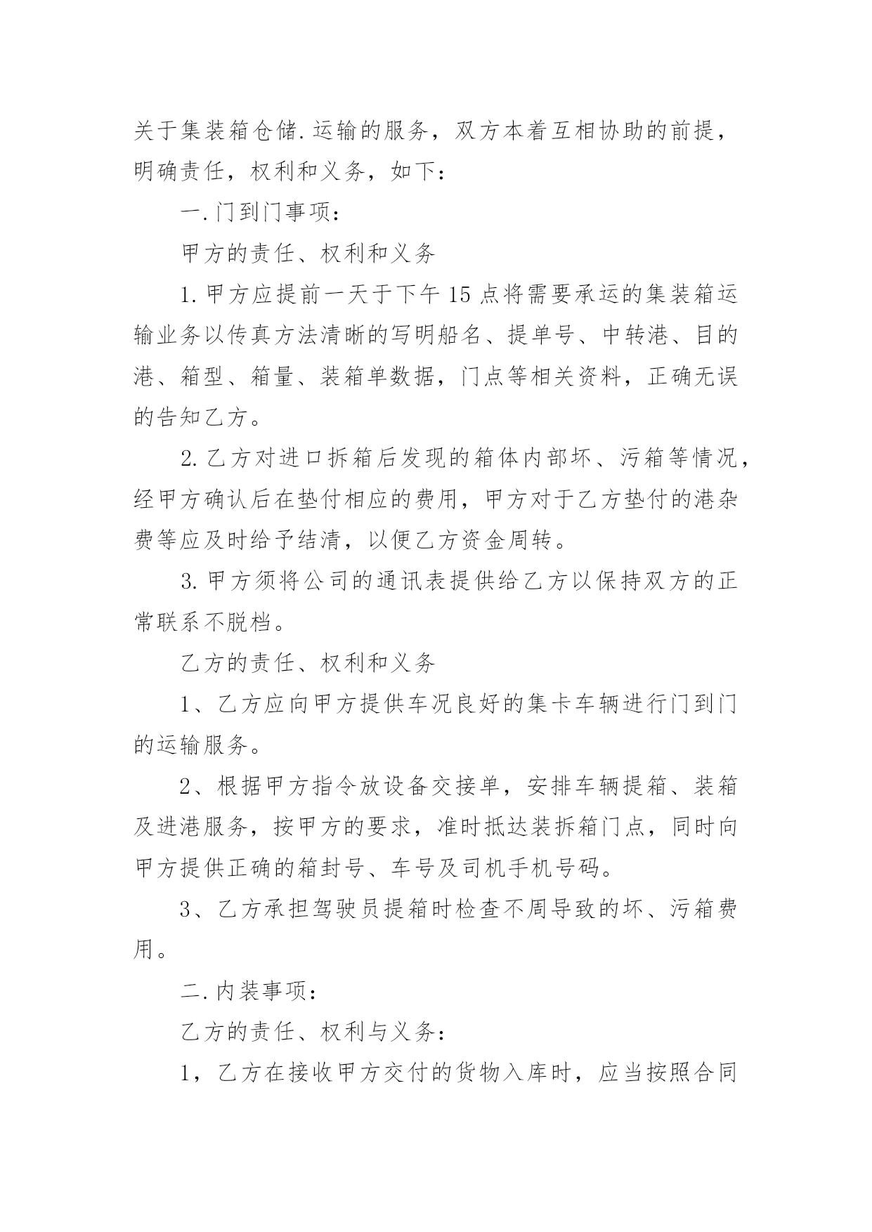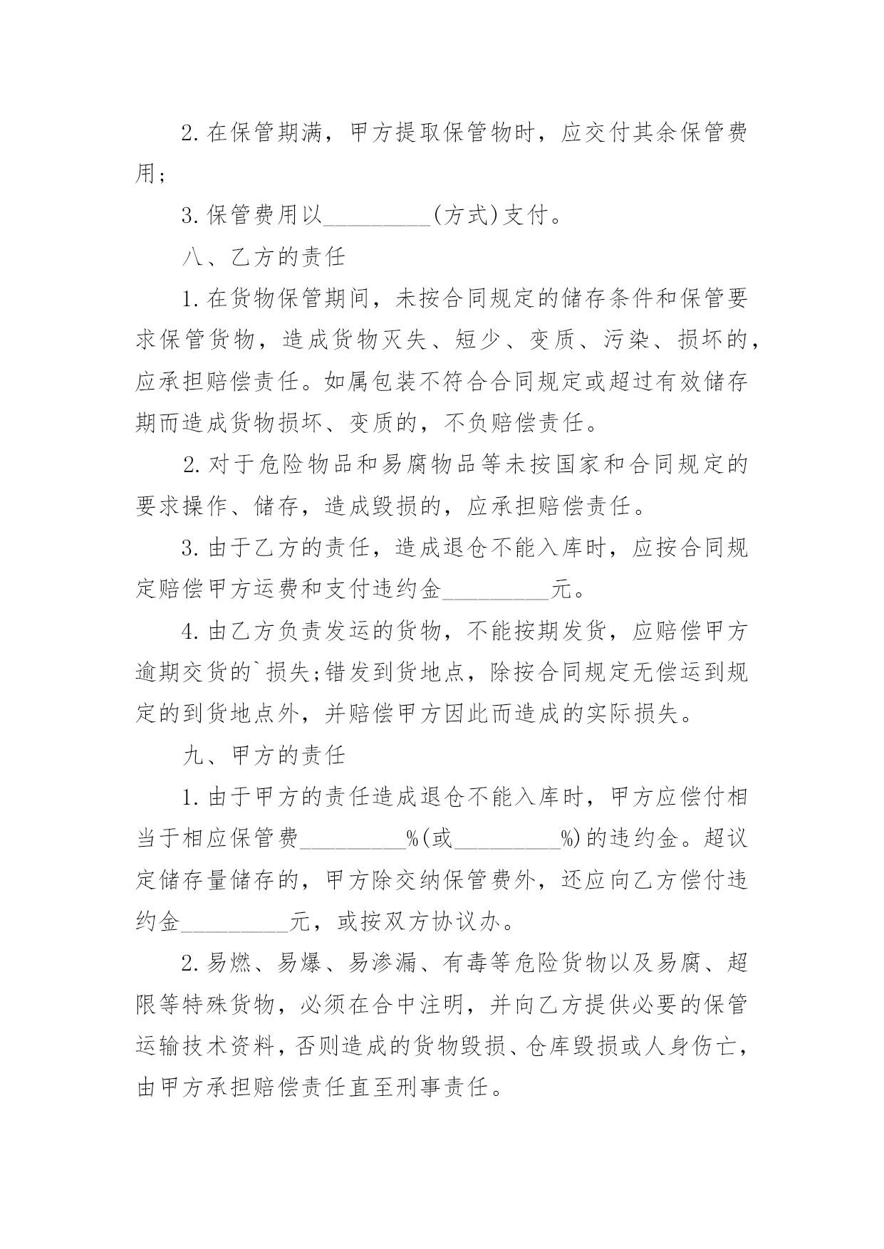 运输仓储合同运输仓储合同(通用13篇)在当今社会,人们对合同愈发重视,合同的使用频率呈上升趋势,在达成意见一致时,制定合同可以享有一定的自由。你所见过的合同是什么样的呢?以下是小编为大家整理的运输仓储合同,希望能够帮助到大家。运输仓储合同1存货方:(以下简称甲方)保管方:(以下简称乙方)_根据《中华人民共和国合同法》的有关规定,乙方和甲方根据委托储存计划和仓储能量的情况,双方协商一致,签订本合同,共同信守。一、仓储物二、仓储费用乙方提供仓库_________平方米由甲方使用,仓库租金按月包库制,每月每平方米_________元,合计月租金为_________元整。三、保管期限保管期限_________年,从_________年_________月_________日至_________年_________月_________日止。四、出入库入库和出库的手续按照有关入库、出库的规定办理,如无规定,按双方协议办理。入库和出库时,双方代表或经办人都应在场,检验后的记录要由双方代表或经办人签字。该记录应视为合同的有效组成部分,当事人双方各保存一份。五、验收1.甲方应当向乙方提供必要的货物验收资料,如未提供必要的货物验收资料或提供的资料不齐全、不及时,所造成的验收差错及贻误索赔期或者发生货物品种、数量、质量不符合合同规定时,乙方不承担赔偿责任。2.乙方应按照合同规定的包装外观、货物品种、数量和质量,对入库物进行验收,如果发现入库货物与合同规定不符,应及时通知甲方。乙方未按规定的项目、方法和期限验收,或验收不准确而造成的实际经济损失,由乙方负责。3.验收期限:_________天。超过验收期限所造成的损失由乙方负责。货物验收期限,是指货物和验收资料全部送达乙方之日起,至验收报告送出之日止。日期均以运输或邮电部门的戳记或直接送达的签收日期为准。六、货物的损耗损耗标准和损耗处理按照有关损耗标准和损耗处理的规定办理,如无规定,按双方协议办理。七、付款1.在保管物交付保管时,甲方应先行交付保管费用的_________%;2.在保管期满,甲方提取保管物时,应交付其余保管费用;3.保管费用以_________(方式)支付。八、乙方的责任1.在货物保管期间,未按合同规定的储存条件和保管要求保管货物,造成货物灭失、短少、变质、污染、损坏的,应承担赔偿责任。如属包装不符合合同规定或超过有效储存期而造成货物损坏、变质的,不负赔偿责任。2.对于危险物品和易腐物品等未按国家和合同规定的要求操作、储存,造成毁损的,应承担赔偿责任。3.由于乙方的责任,造成退仓不能入库时,应按合同规定赔偿甲方运费和支付违约金_________元。4.由乙方负责发运的货物,不能按期发货,应赔偿甲方逾期交货的`损失;错发到货地点,除按合同规定无偿运到规定的到货地点外,并赔偿甲方因此而造成的实际损失。九、甲方的责任1.由于甲方的责任造成退仓不能入库时,甲方应偿付相当于相应保管费_________%(或_________%)的违约金。超议定储存量储存的,甲方除交纳保管费外,还应向乙方偿付违约金_________元,或按双方协议办。2.易燃、易爆、易渗漏、有毒等危险货物以及易腐、超限等特殊货物,必须在合中注明,并向乙方提供必要的保管运输技术资料,否则造成的货物毁损、仓库毁损或人身伤亡,由甲方承担赔偿责任直至刑事责任。3.货物临近失效期或有异状的,在乙方通知后不及时处理,造成的损失由甲方承担。4.未按国家或合同规定的标准和要示对储存货物进行必要的包装,造成货物损坏、变质的,由甲方负责。5.甲方已通知出库或合同期已到,由于甲方(含用户)的原因致使货物不能如期出库,甲方除按合同的规定交付保管费外,并应偿付违约金_________元。由于出库凭证或调拨凭证上的差错所造成的损失,由甲方负责。6.按合同规定由乙方代运的货物,甲方未按合同规定及时提供包装材料或未按规定期限变更货物的运输方式、到站、接货人,应承担延期的责任和增加的有关费用。十、声明及保证(一)乙方:1.乙方为一家依法设立并合法存续的企业,有权签署并有能力履行本合同。2.乙方签署和履行本合同所需的一切手续_________均已办妥并合法有效。3.在签署本合同时,任何法院、仲裁机构、行政机关或监管机构均未作出任何足以对乙方履行本合同产生重大不利影响的判决、裁定、裁决或具体行政行为。4.乙方为签署本合同所需的内部授权程序均已完成,本合同的签署人是乙方的法定代表人或授权代表人。本合同生效后即对合同双方具有法律约束力。(二)甲方:1.甲方为一家依法设立并合法存续的企业,有权签署并有能力履行本合同。2.甲方签署和履行本合同所需的一切手续_________均已办妥并合法有效。3.在签署本合同时,任何法院、仲裁机构、行政机关或监管机构均未作出任何足以对甲