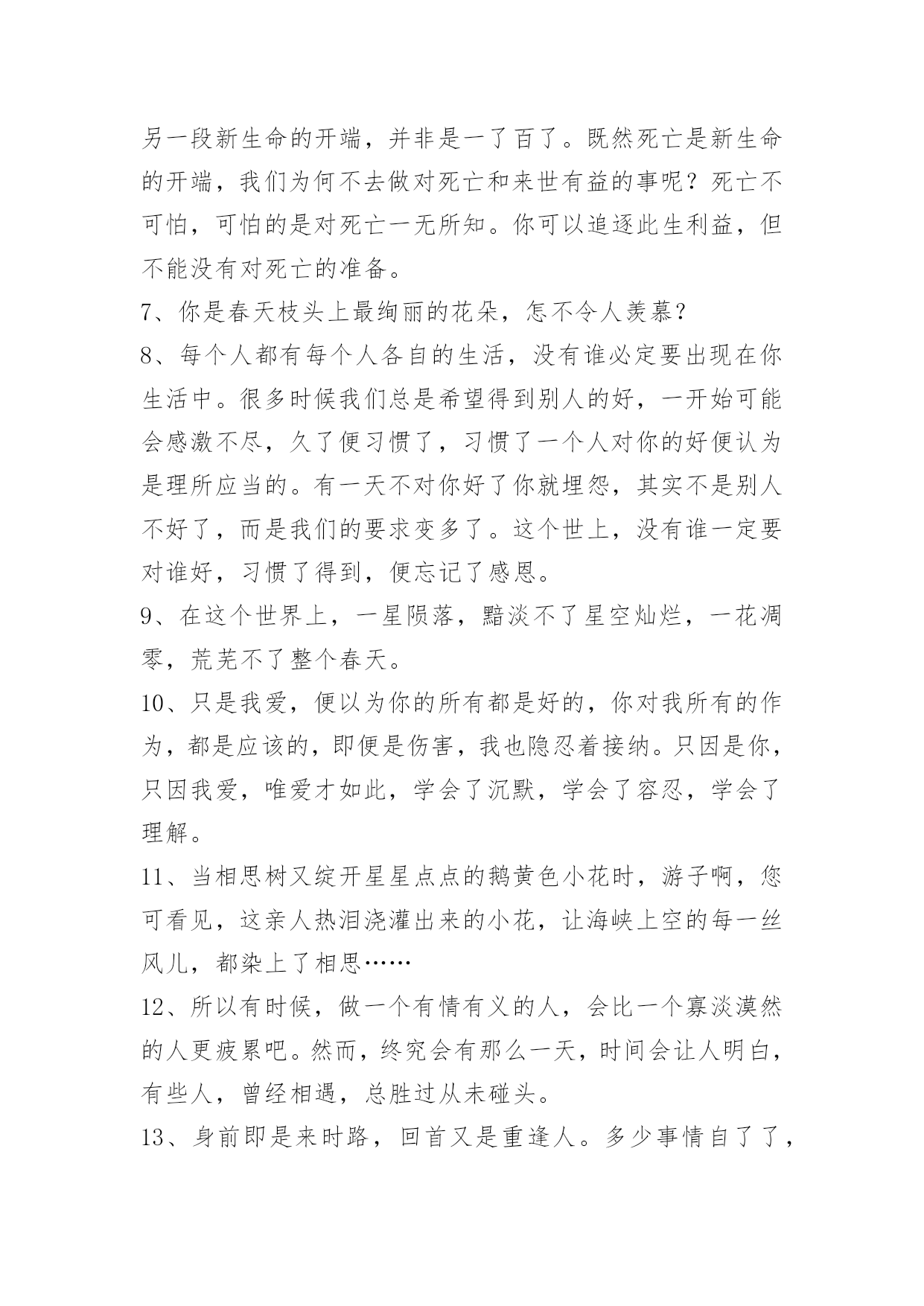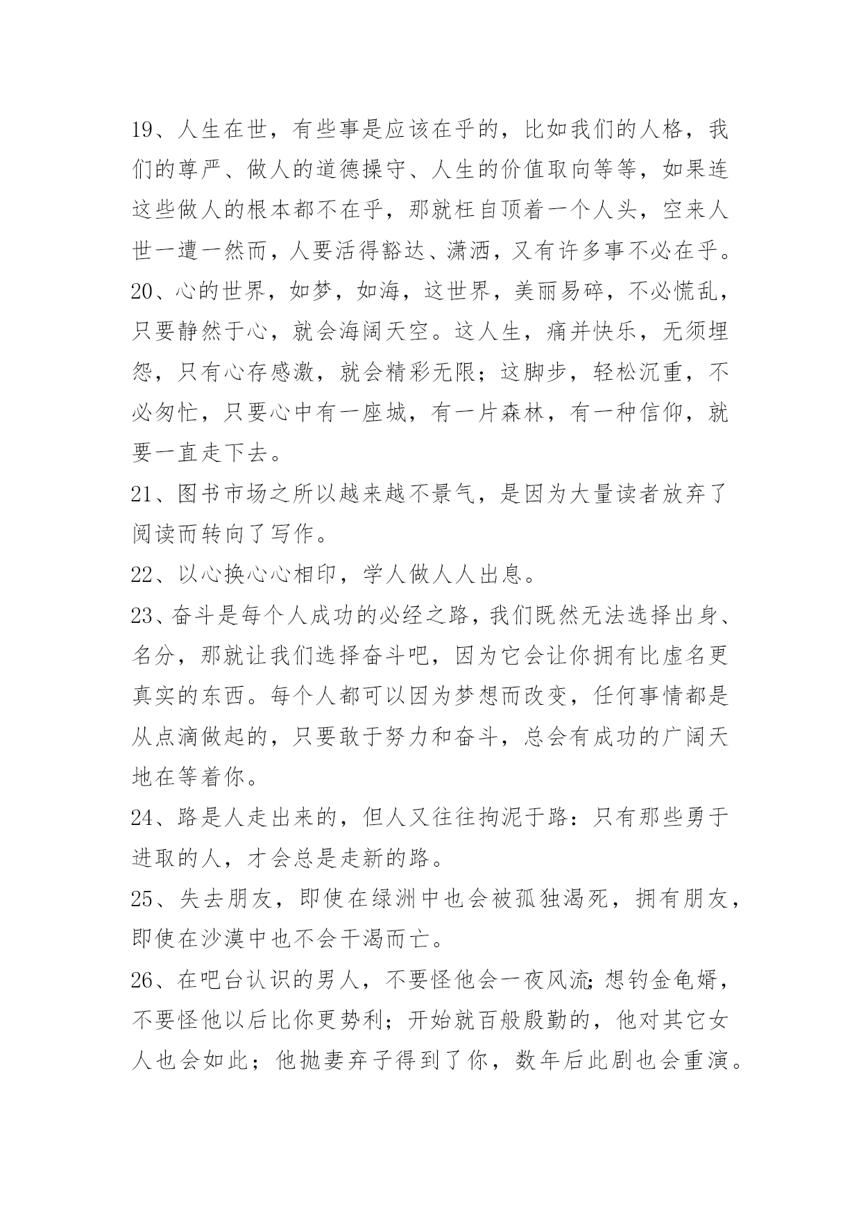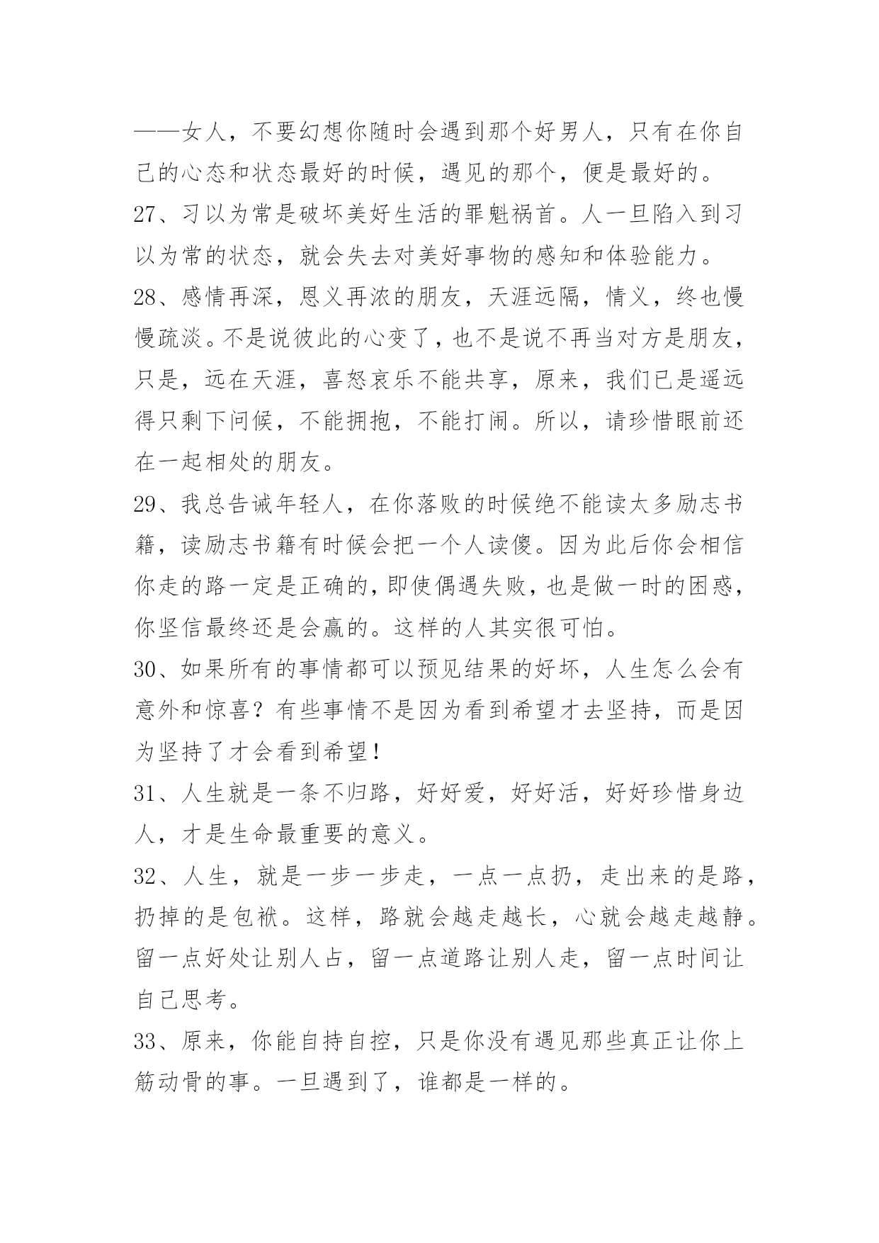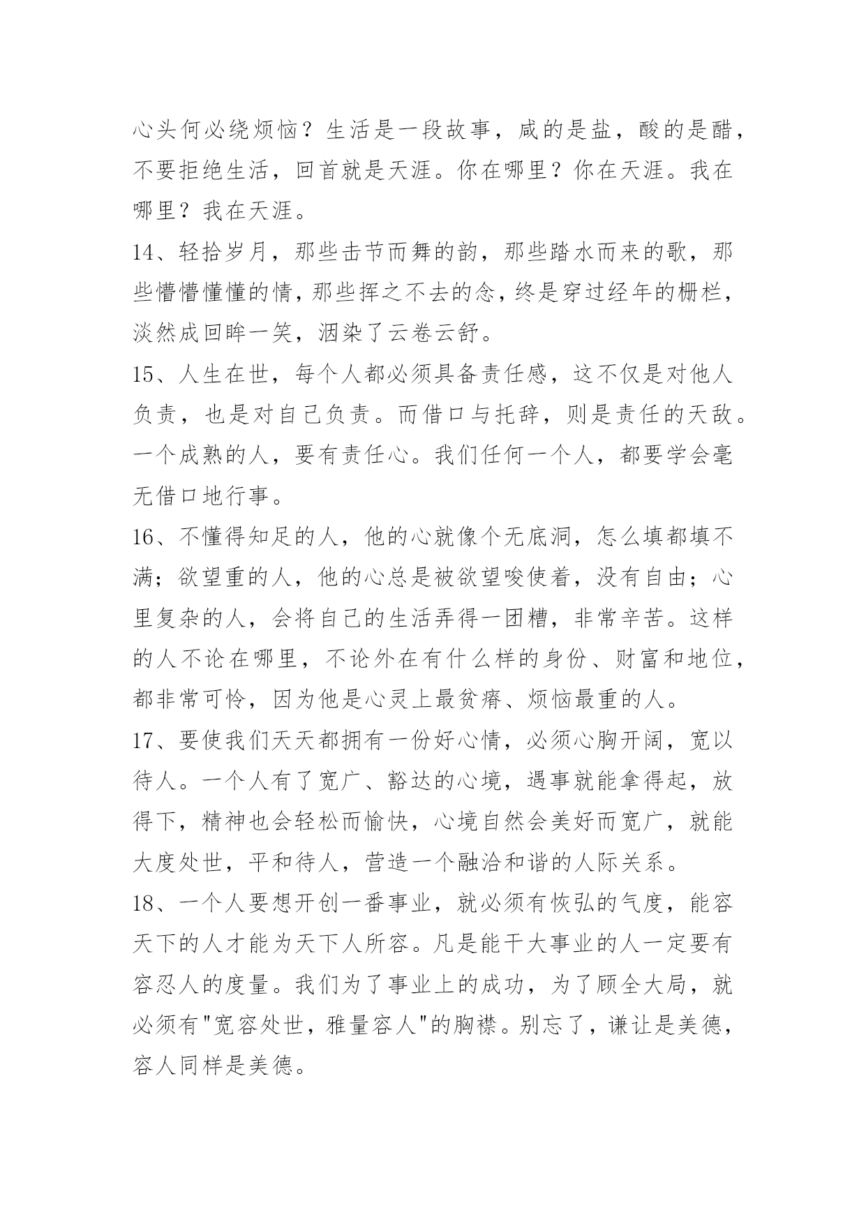 人生感悟的句子100条2022年实用的人生感悟的句子汇编100条我们不怜悯他人的愚蠢,这或许很公正,但若能设想这是他们自己的过错,将更令人愉快。下面是小编为大家提供的人生感悟的句子100条,欢迎阅读借鉴。1、年龄绝不是青春惟一的标志,只有那些充满了理想和热爱的心灵才真正懂得青春的意义。2、如果有一个地方满溢着温馨、关怀,你愿否与我携手共渡。3、生命无法用来证明爱情,就像我们无法证明自我能够不再相信爱情。在这个城市里,诚如劳力士是物质的奢侈品,爱情则是精神上的奢侈品。可是生命脆弱无比,根本没办法承受那么多的奢侈。4、不管你经历了多痛苦的事情,到最后都会渐渐遗忘,因为没有什么能敌得过时光。5、日出日落,但天穹不会成为过去;沧海桑田,但自然不会成为过去;花开花谢,但灿烂不会成为过去;朝生夕死,但精神不会成为过去;缘起缘灭,但大干不会成为过去。一切发生,一切消亡,都不会成为过去,我们忘记了,时间会记住,时间忘记了,灵魂会记住。6、只有幸福的日子是不够的,因为此生既不是开始,也不是结束,在无数流转的生命里,不过是个片段罢了。死亡是另一段新生命的开端,并非是一了百了。既然死亡是新生命的开端,我们为何不去做对死亡和来世有益的事呢?死亡不可怕,可怕的是对死亡一无所知。你可以追逐此生利益,但不能没有对死亡的准备。7、你是春天枝头上最绚丽的花朵,怎不令人羡慕?8、每个人都有每个人各自的生活,没有谁必定要出现在你生活中。很多时候我们总是希望得到别人的好,一开始可能会感激不尽,久了便习惯了,习惯了一个人对你的好便认为是理所应当的。有一天不对你好了你就埋怨,其实不是别人不好了,而是我们的要求变多了。这个世上,没有谁一定要对谁好,习惯了得到,便忘记了感恩。9、在这个世界上,一星陨落,黯淡不了星空灿烂,一花凋零,荒芜不了整个春天。10、只是我爱,便以为你的所有都是好的,你对我所有的作为,都是应该的,即便是伤害,我也隐忍着接纳。只因是你,只因我爱,唯爱才如此,学会了沉默,学会了容忍,学会了理解。11、当相思树又绽开星星点点的鹅黄色小花时,游子啊,您可看见,这亲人热泪浇灌出来的小花,让海峡上空的每一丝风儿,都染上了相思……12、所以有时候,做一个有情有义的人,会比一个寡淡漠然的人更疲累吧。然而,终究会有那么一天,时间会让人明白,有些人,曾经相遇,总胜过从未碰头。13、身前即是来时路,回首又是重逢人。多少事情自了了,心头何必绕烦恼?生活是一段故事,咸的是盐,酸的是醋,不要拒绝生活,回首就是天涯。你在哪里?你在天涯。我在哪里?我在天涯。14、轻拾岁月,那些击节而舞的韵,那些踏水而来的歌,那些懵懵懂懂的情,那些挥之不去的念,终是穿过经年的栅栏,淡然成回眸一笑,洇染了云卷云舒。15、人生在世,每个人都必须具备责任感,这不仅是对他人负责,也是对自己负责。而借口与托辞,则是责任的天敌。一个成熟的人,要有责任心。我们任何一个人,都要学会毫无借口地行事。16、不懂得知足的人,他的心就像个无底洞,怎么填都填不满;欲望重的人,他的心总是被欲望唆使着,没有自由;心里复杂的人,会将自己的生活弄得一团糟,非常辛苦。这样的人不论在哪里,不论外在有什么样的身份、财富和地位,都非常可怜,因为他是心灵上最贫瘠、烦恼最重的人。17、要使我们天天都拥有一份好心情,必须心胸开阔,宽以待人。一个人有了宽广、豁达的心境,遇事就能拿得起,放得下,精神也会轻松而愉快,心境自然会美好而宽广,就能大度处世,平和待人,营造一个融洽和谐的人际关系。18、一个人要想开创一番事业,就必须有恢弘的气度,能容天下的人才能为天下人所容。凡是能干大事业的人一定要有容忍人的度量。我们为了事业上的成功,为了顾全大局,就必须有"宽容处世,雅量容人"的胸襟。别忘了,谦让是美德,容人同样是美德。19、人生在世,有些事是应该在乎的,比如我们的人格,我们的尊严、做人的道德操守、人生的价值取向等等,如果连这些做人的根本都不在乎,那就枉自顶着一个人头,空来人世一遭一然而,人要活得豁达、潇洒,又有许多事不必在乎。20、心的世界,如梦,如海,这世界,美丽易碎,不必慌乱,只要静然于心,就会海阔天空。这人生,痛并快乐,无须埋怨,只有心存感激,就会精彩无限;这脚步,轻松沉重,不必匆忙,只要心中有一座城,有一片森林,有一种信仰,就要一直走下去。21、图书市场之所以越来越不景气,是因为大量读者放弃了阅读而转向了写作。22、以心换心心相印,学人做人人出息。23、奋斗是每个人成功的必经之路,我们既然无法选择出身、名分,那就让我们选择奋斗吧,因为它会让你拥有比虚名更真实的东西。每个人都可以因为梦想而改变,任何事情都是从点滴做起的,只要敢于努力和奋斗,总会有成功的广阔天地在等着你。24、路是人走出来的,但人又往往拘泥于路:只有那些勇于进取的人,才会总是走新的路。