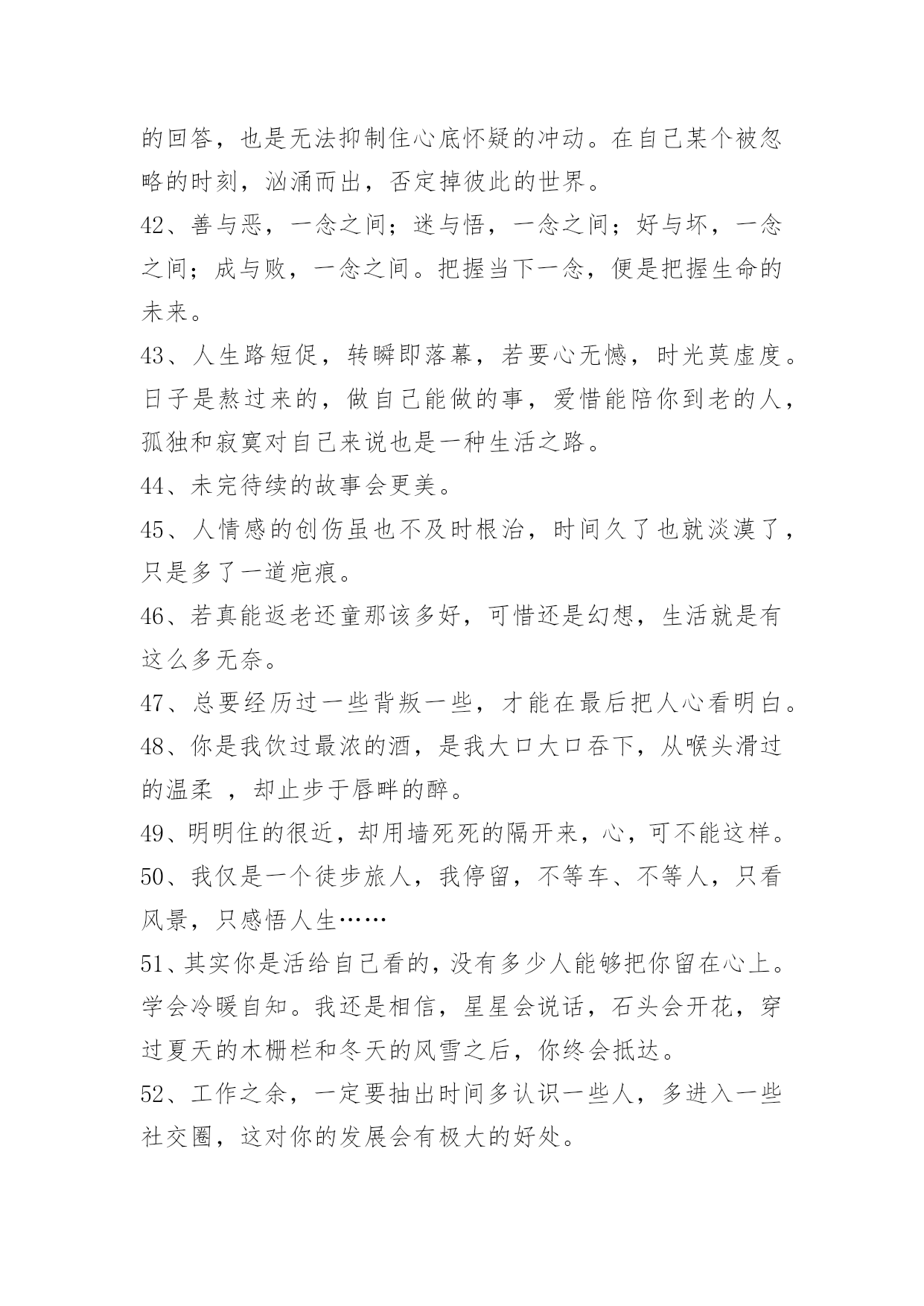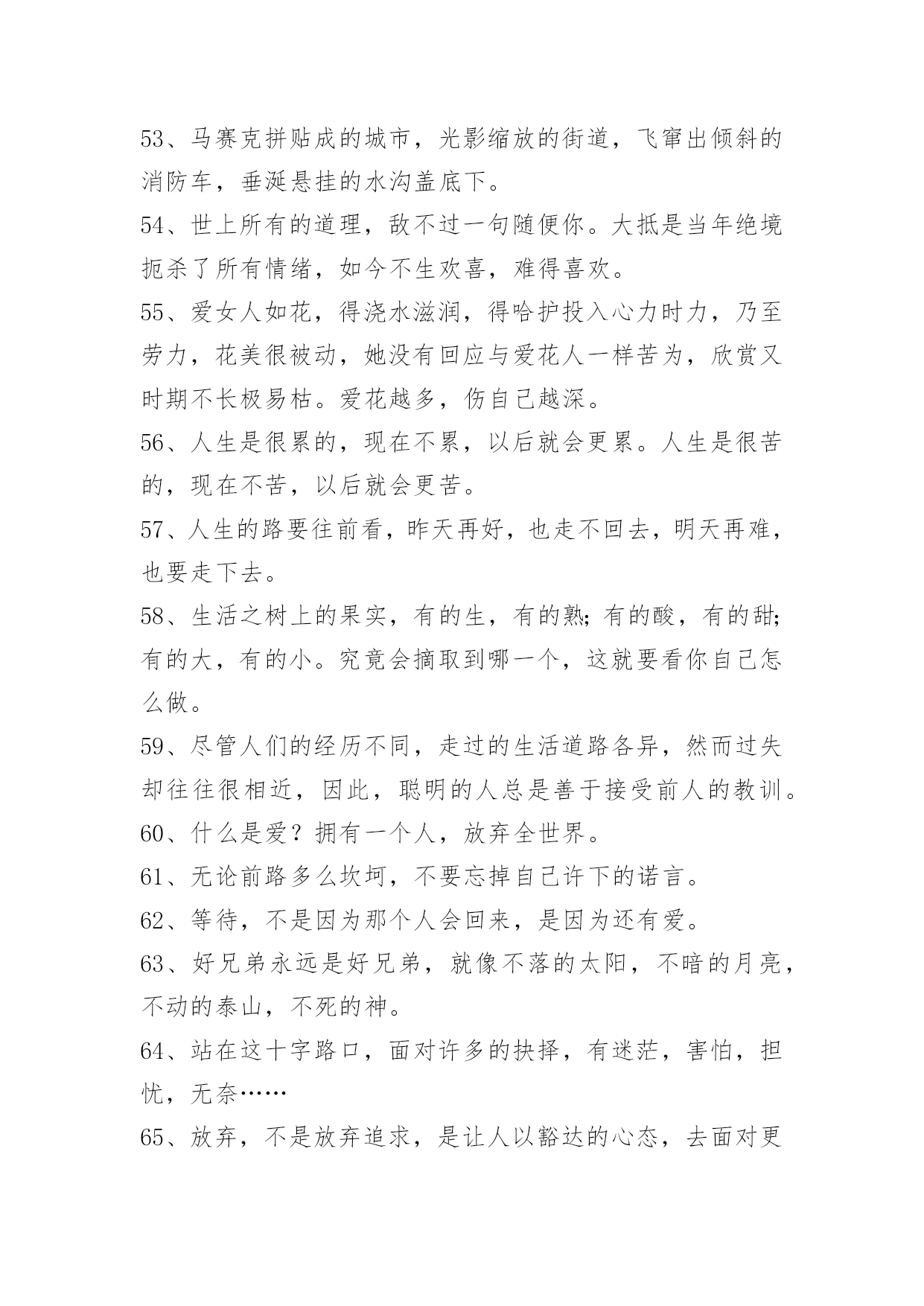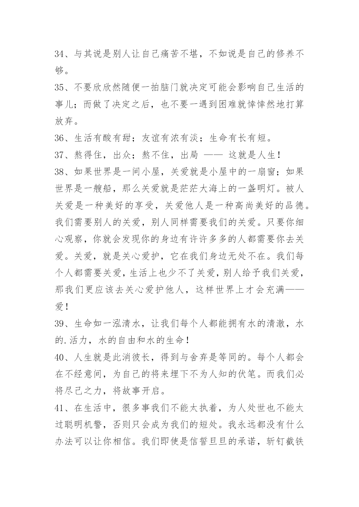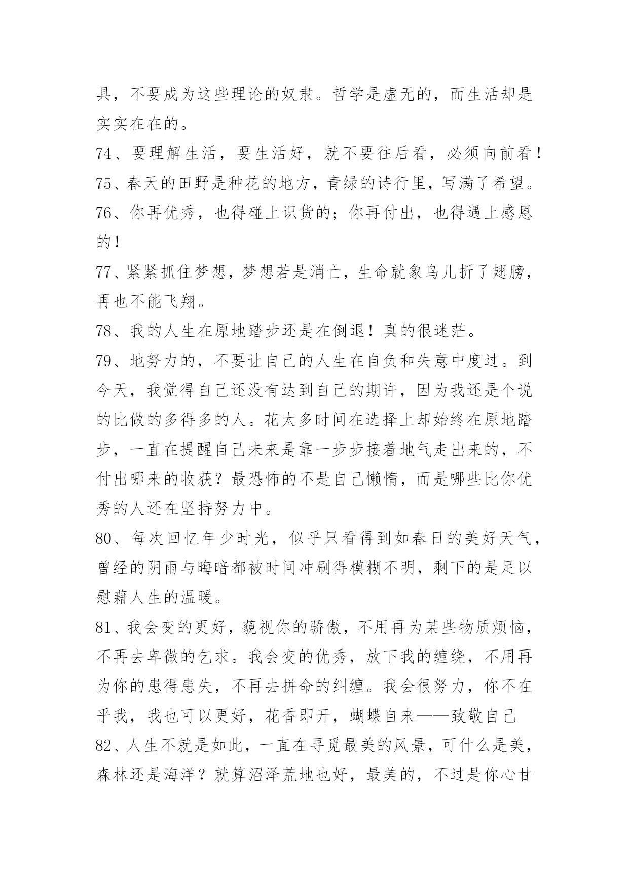 人生感悟的句子100条2022年实用的人生感悟的句子汇编100条我们不怜悯他人的愚蠢,这或许很公正,但若能设想这是他们自己的过错,将更令人愉快。下面是小编为大家提供的人生感悟的句子100条,欢迎阅读借鉴。1、年龄绝不是青春惟一的标志,只有那些充满了理想和热爱的心灵才真正懂得青春的意义。2、如果有一个地方满溢着温馨、关怀,你愿否与我携手共渡。3、生命无法用来证明爱情,就像我们无法证明自我能够不再相信爱情。在这个城市里,诚如劳力士是物质的奢侈品,爱情则是精神上的奢侈品。可是生命脆弱无比,根本没办法承受那么多的奢侈。4、不管你经历了多痛苦的事情,到最后都会渐渐遗忘,因为没有什么能敌得过时光。5、日出日落,但天穹不会成为过去;沧海桑田,但自然不会成为过去;花开花谢,但灿烂不会成为过去;朝生夕死,但精神不会成为过去;缘起缘灭,但大干不会成为过去。一切发生,一切消亡,都不会成为过去,我们忘记了,时间会记住,时间忘记了,灵魂会记住。6、只有幸福的日子是不够的,因为此生既不是开始,也不是结束,在无数流转的生命里,不过是个片段罢了。死亡是另一段新生命的开端,并非是一了百了。既然死亡是新生命的开端,我们为何不去做对死亡和来世有益的事呢?死亡不可怕,可怕的是对死亡一无所知。你可以追逐此生利益,但不能没有对死亡的准备。7、你是春天枝头上最绚丽的花朵,怎不令人羡慕?8、每个人都有每个人各自的生活,没有谁必定要出现在你生活中。很多时候我们总是希望得到别人的好,一开始可能会感激不尽,久了便习惯了,习惯了一个人对你的好便认为是理所应当的。有一天不对你好了你就埋怨,其实不是别人不好了,而是我们的要求变多了。这个世上,没有谁一定要对谁好,习惯了得到,便忘记了感恩。9、在这个世界上,一星陨落,黯淡不了星空灿烂,一花凋零,荒芜不了整个春天。10、只是我爱,便以为你的所有都是好的,你对我所有的作为,都是应该的,即便是伤害,我也隐忍着接纳。只因是你,只因我爱,唯爱才如此,学会了沉默,学会了容忍,学会了理解。11、当相思树又绽开星星点点的鹅黄色小花时,游子啊,您可看见,这亲人热泪浇灌出来的小花,让海峡上空的每一丝风儿,都染上了相思……12、所以有时候,做一个有情有义的人,会比一个寡淡漠然的人更疲累吧。然而,终究会有那么一天,时间会让人明白,有些人,曾经相遇,总胜过从未碰头。13、身前即是来时路,回首又是重逢人。多少事情自了了,心头何必绕烦恼?生活是一段故事,咸的是盐,酸的是醋,不要拒绝生活,回首就是天涯。你在哪里?你在天涯。我在哪里?我在天涯。14、轻拾岁月,那些击节而舞的韵,那些踏水而来的歌,那些懵懵懂懂的情,那些挥之不去的念,终是穿过经年的栅栏,淡然成回眸一笑,洇染了云卷云舒。15、人生在世,每个人都必须具备责任感,这不仅是对他人负责,也是对自己负责。而借口与托辞,则是责任的天敌。一个成熟的人,要有责任心。我们任何一个人,都要学会毫无借口地行事。16、不懂得知足的人,他的心就像个无底洞,怎么填都填不满;欲望重的人,他的心总是被欲望唆使着,没有自由;心里复杂的人,会将自己的生活弄得一团糟,非常辛苦。这样的人不论在哪里,不论外在有什么样的身份、财富和地位,都非常可怜,因为他是心灵上最贫瘠、烦恼最重的人。17、要使我们天天都拥有一份好心情,必须心胸开阔,宽以待人。一个人有了宽广、豁达的心境,遇事就能拿得起,放得下,精神也会轻松而愉快,心境自然会美好而宽广,就能大度处世,平和待人,营造一个融洽和谐的人际关系。18、一个人要想开创一番事业,就必须有恢弘的气度,能容天下的人才能为天下人所容。凡是能干大事业的人一定要有容忍人的度量。我们为了事业上的成功,为了顾全大局,就必须有"宽容处世,雅量容人"的胸襟。别忘了,谦让是美德,容人同样是美德。19、人生在世,有些事是应该在乎的,比如我们的人格,我们的尊严、做人的道德操守、人生的价值取向等等,如果连这些做人的根本都不在乎,那就枉自顶着一个人头,空来人世一遭一然而,人要活得豁达、潇洒,又有许多事不必在乎。20、心的世界,如梦,如海,这世界,美丽易碎,不必慌乱,只要静然于心,就会海阔天空。这人生,痛并快乐,无须埋怨,只有心存感激,就会精彩无限;这脚步,轻松沉重,不必匆忙,只要心中有一座城,有一片森林,有一种信仰,就要一直走下去。21、图书市场之所以越来越不景气,是因为大量读者放弃了阅读而转向了写作。22、以心换心心相印,学人做人人出息。23、奋斗是每个人成功的必经之路,我们既然无法选择出身、名分,那就让我们选择奋斗吧,因为它会让你拥有比虚名更真实的东西。每个人都可以因为梦想而改变,任何事情都是从点滴做起的,只要敢于努力和奋斗,总会有成功的广阔天地在等着你。24、路是人走出来的,但人又往往拘泥于路:只有那些勇于进取的人,才会总是走新的路。