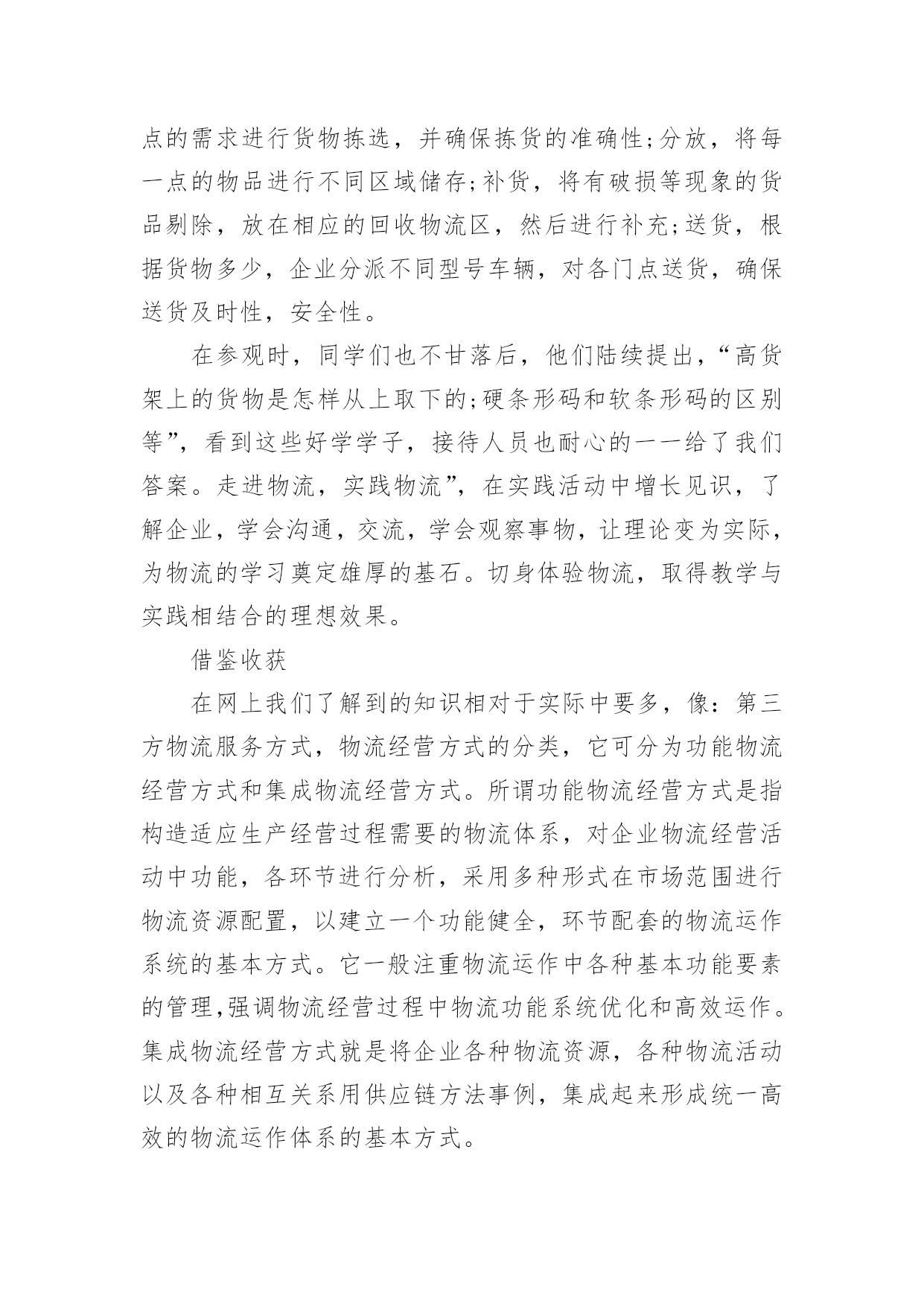 物流实习心得体会简短物流实习心得体会简短从某件事情上得到收获以后,心得体会是很好的记录方式,这么做能够提升我们的书面表达能力。相信许多人会觉得心得体会很难写吧,下面是小编帮大家整理的物流实习心得体会简短,希望对大家有所帮助。通过两个星期的实习我的收获颇丰,不仅接触和了解到了许多物流课本上所没有的东西,也学习到了许多专业的、实用的物流知识,丰富了生活阅历,这将是我们走向社会的一笔最为宝贵的财富。以下是我就本次实习的总结。实习内容在参观武汉xx物流配送中心之前,接待人员首先向我们介绍了仓库占地面积、员工人数等企业概况。当学生列队有序进入仓库时,最吸引人的是“细节决定成败”这六个大字,从这可以看出xx仓储企业员工文化,领导文化等,用细节来证明一切,实现企业与企业,企业与员工之间的共赢。在参观过程中,我们了解到,其企业的一整套系统都是按照严格的配送中心的基本作业管理流程进行,即进货,对此进行进货检查和入库作业,及清单的核对;分类,对货物的摆放区域,相互影响货物的分类等过程;储存,将货品放入相应库位号,进行库存管理;订单处理,根据各配点订货需求,对物品的数量,品种进行总和;配货,拣货员根据每一订货点的需求进行货物拣选,并确保拣货的准确性;分放,将每一点的物品进行不同区域储存;补货,将有破损等现象的货品剔除,放在相应的回收物流区,然后进行补充;送货,根据货物多少,企业分派不同型号车辆,对各门点送货,确保送货及时性,安全性。在参观时,同学们也不甘落后,他们陆续提出,“高货架上的货物是怎样从上取下的;硬条形码和软条形码的区别等”,看到这些好学学子,接待人员也耐心的一一给了我们答案。走进物流,实践物流”,在实践活动中增长见识,了解企业,学会沟通,交流,学会观察事物,让理论变为实际,为物流的学习奠定雄厚的基石。切身体验物流,取得教学与实践相结合的理想效果。借鉴收获在网上我们了解到的知识相对于实际中要多,像:第三方物流服务方式,物流经营方式的分类,它可分为功能物流经营方式和集成物流经营方式。所谓功能物流经营方式是指构造适应生产经营过程需要的物流体系,对企业物流经营活动中功能,各环节进行分析,采用多种形式在市场范围进行物流资源配置,以建立一个功能健全,环节配套的物流运作系统的基本方式。它一般注重物流运作中各种基本功能要素的管理,强调物流经营过程中物流功能系统优化和高效运作。集成物流经营方式就是将企业各种物流资源,各种物流活动以及各种相互关系用供应链方法事例,集成起来形成统一高效的物流运作体系的基本方式。经营过程物流经营方式包括连锁物流经营方式和代理物流经营方式。连锁物流经营方式就是为了更好的发挥物流服务的优势,采取连锁形式开展物流经营活动的基本方式。它需要注意连锁经营的地域范围,经营实力,服务水平以及连锁经营的规模效益等。代理物流经营方式就是为各种新兴商务活动提供代理而开展的物流经营方式。它一般应注意根据实际情况合理决定物流经营项目和市场范围,同时注意选择合理的代理方式和兼顾委托方的利益。