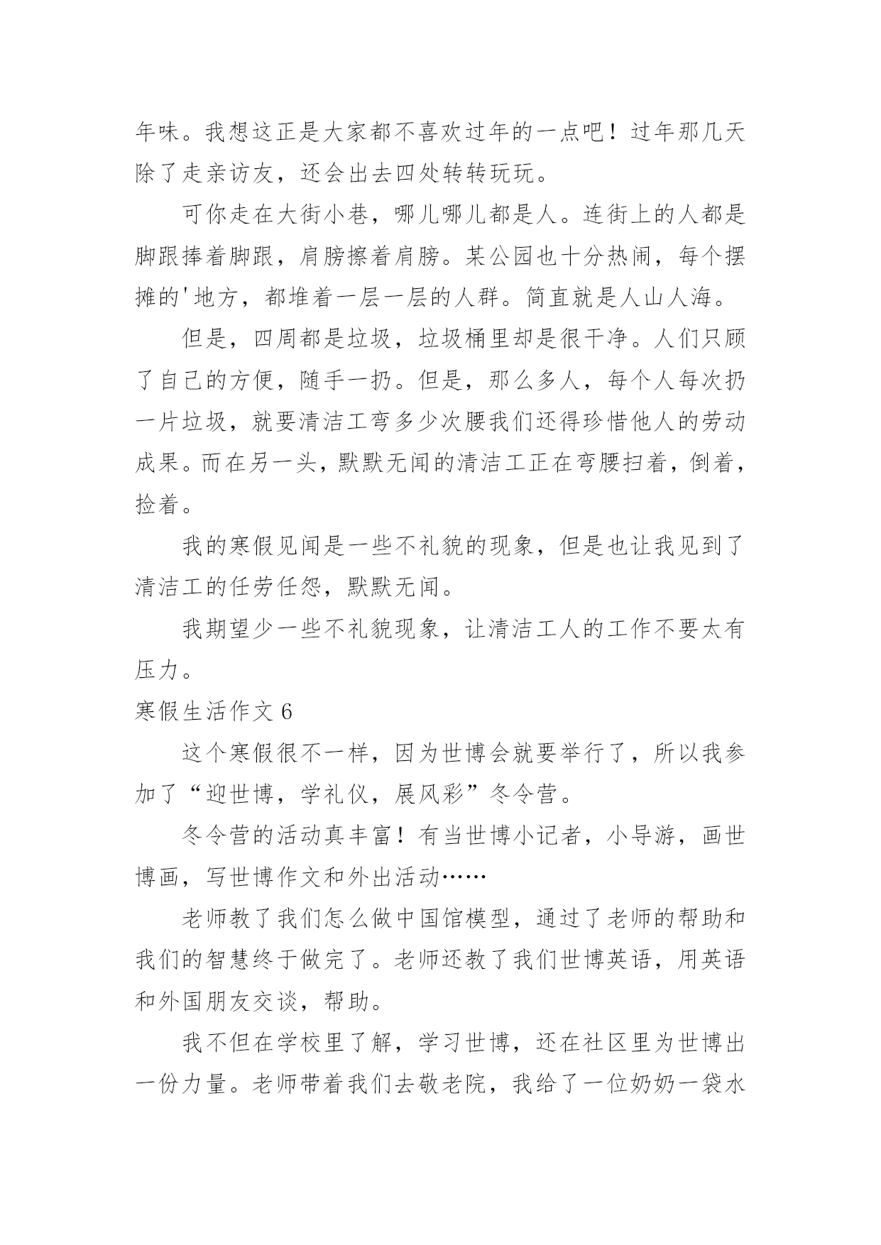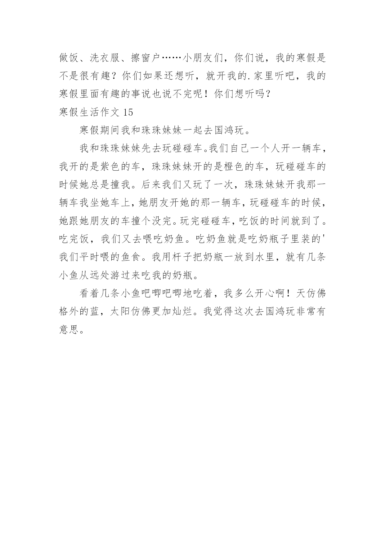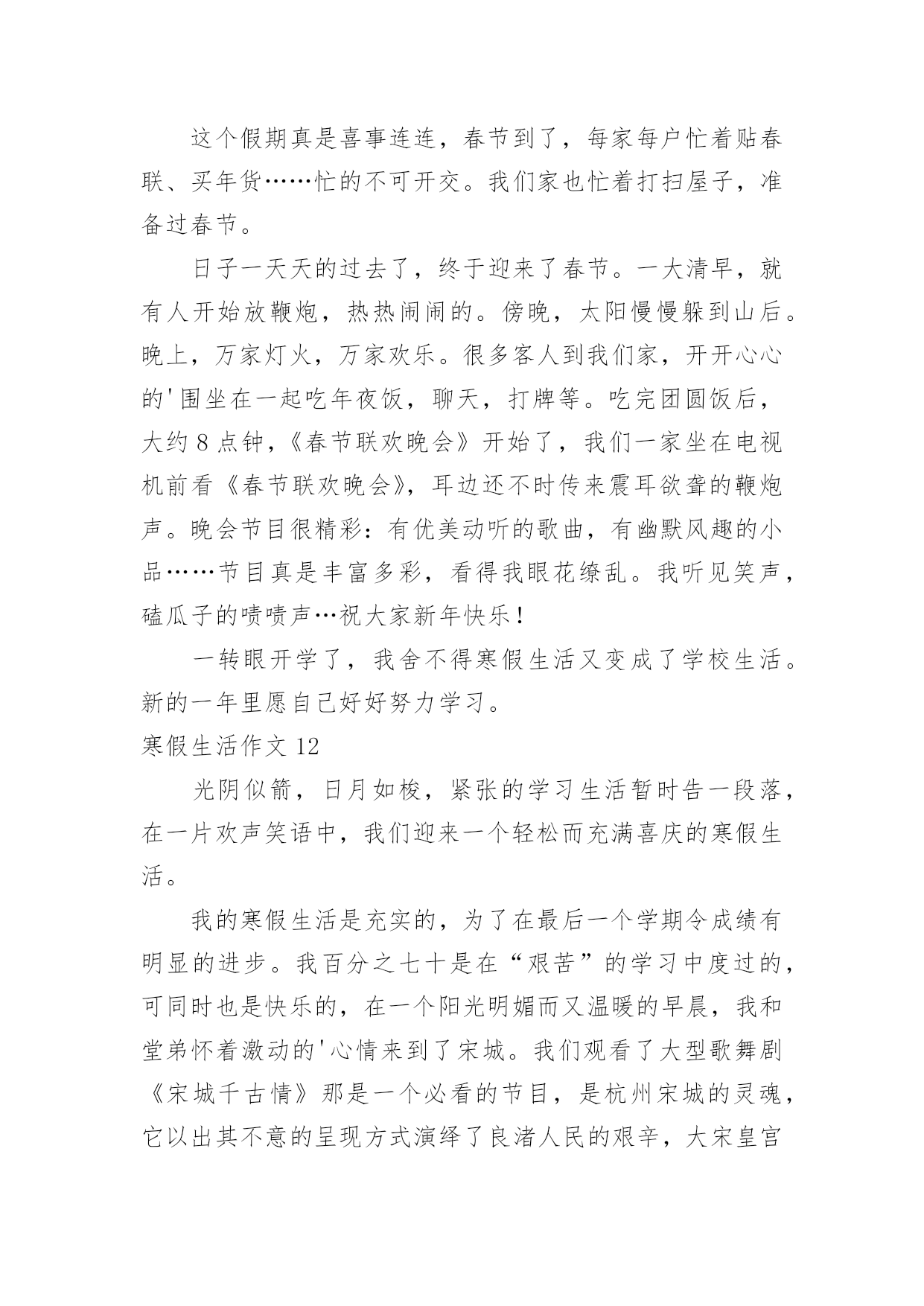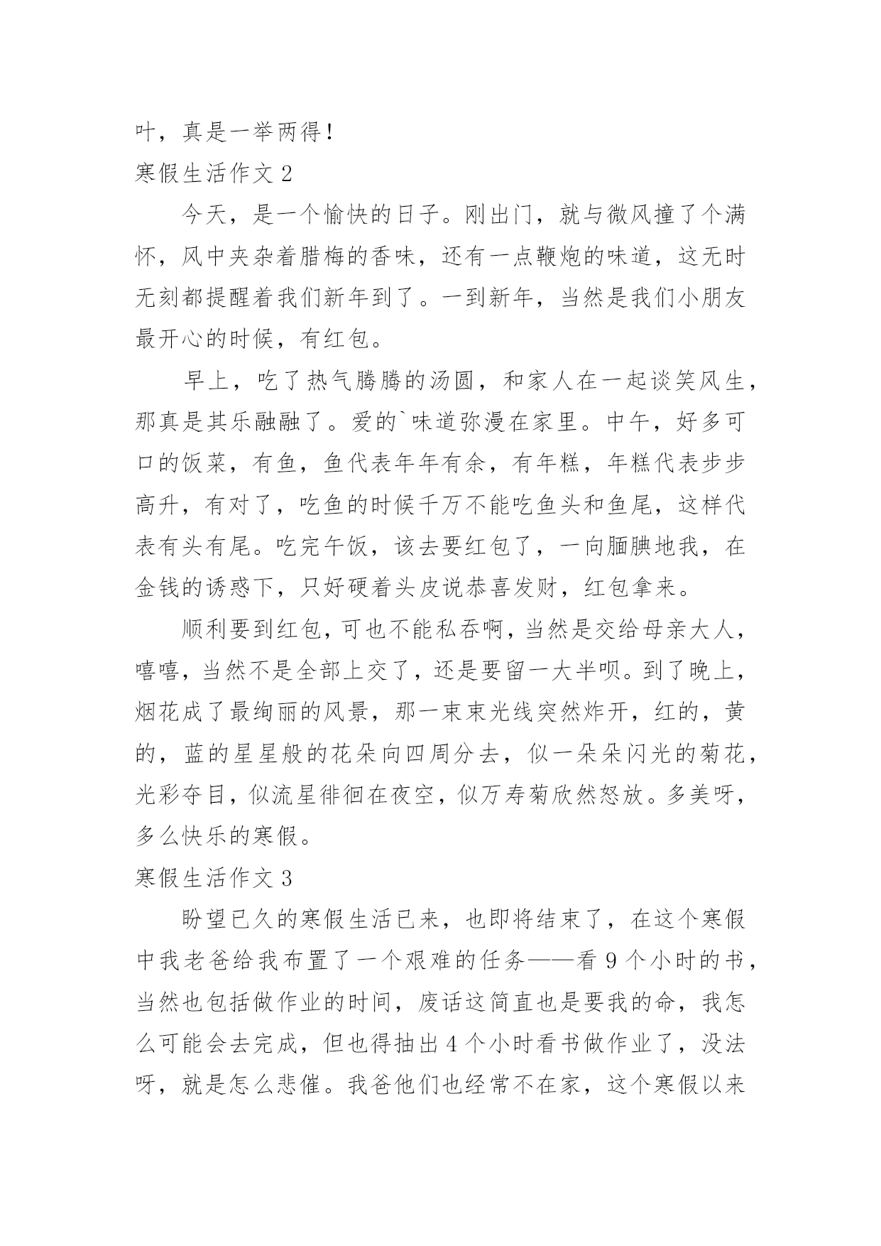 寒假生活作文寒假生活作文大全(15篇)在平日的学习、工作和生活里,大家都尝试过写作文吧,作文根据写作时限的不同可以分为限时作文和非限时作文。为了让您在写作文时更加简单方便,以下是小编为大家收集的寒假生活作文,供大家参考借鉴,希望可以帮助到有需要的朋友。寒假生活作文1寒假,我们去了沙县,吃沙县小吃早上8:00多,我们从三明出发,向东北行驶了30多分钟,就到了沙县。我们来到了一家正宗的沙县小吃,点了南瓜饼、南瓜球、板鸭、炸米粉我们吃得津津有味。小吃一盘接一盘地端了上来,突然,一盘粉红色的东西映入我眼帘,这是一盘粉丝,汤里有一条很粗的东西,我定睛一看,啊!!居然是一条没有取出内脏的泥鳅!!我这么一看,就不敢吃了。装作饱了的'样子走出了门外。过了一会儿,我们吃完了,在附近转悠。来到了一家茶叶店,我们走了进去,老板娘热情地接待了我们,她拿出一包茶叶,给我们品尝,在我们品尝了三淡香的、浓香的、清淡的绿茶,终于买了:老纵—水仙、清淡的铁观音。老板娘说:铁观音要冷藏,则会变味的,这水仙可以不冷藏。我们告别了老板娘,便又上路了。这次在沙县,我们尝到了好吃的沙县小吃,又品尝了茶叶,真是一举两得!寒假生活作文2今天,是一个愉快的日子。刚出门,就与微风撞了个满怀,风中夹杂着腊梅的香味,还有一点鞭炮的味道,这无时无刻都提醒着我们新年到了。一到新年,当然是我们小朋友最开心的时候,有红包。早上,吃了热气腾腾的汤圆,和家人在一起谈笑风生,那真是其乐融融了。爱的`味道弥漫在家里。中午,好多可口的饭菜,有鱼,鱼代表年年有余,有年糕,年糕代表步步高升,有对了,吃鱼的时候千万不能吃鱼头和鱼尾,这样代表有头有尾。吃完午饭,该去要红包了,一向腼腆地我,在金钱的诱惑下,只好硬着头皮说恭喜发财,红包拿来。顺利要到红包,可也不能私吞啊,当然是交给母亲大人,嘻嘻,当然不是全部上交了,还是要留一大半呗。到了晚上,烟花成了最绚丽的风景,那一束束光线突然炸开,红的,黄的,蓝的星星般的花朵向四周分去,似一朵朵闪光的菊花,光彩夺目,似流星徘徊在夜空,似万寿菊欣然怒放。多美呀,多么快乐的寒假。寒假生活作文3盼望已久的寒假生活已来,也即将结束了,在这个寒假中我老爸给我布置了一个艰难的任务——看9个小时的书,当然也包括做作业的时间,废话这简直也是要我的命,我怎么可能会去完成,但也得抽出4个小时看书做作业了,没法呀,就是怎么悲催。我爸他们也经常不在家,这个寒假以来差不多也是我个人在家,很是无聊,只有个人玩,看电视,玩游戏,上网聊天,虽然这个寒假有那么一点枯燥无味但也不怎么希望开学。但在这个寒假中有件事也是不可少的'!就是睡懒觉。在学校每天起的太早,回到家就得补补觉,但没有一天一天的睡,只是晚上耍的有点嗨所以早上起得有点迟,偶尔还是起的较早。这次考试考得好的就少了《寒假作业》这本作业,唉我们这些就得做了,没法呀认了,除了做作业我也干些其它的——做家务,这样也不会显得我空闲,也能使父母开心一下。寒假生活作文4我的寒假过得很充实,有时候很欢乐。有时候很悲伤。初四我和爷爷奶奶一齐去庙会玩。那里有斗鸡、抖空竹、抽陀螺……那两只威风凛凛的斗鸡像个威武的'大将军,它满头红红的,没有冠子,大概是打架打掉了吧!抖空竹也很好看,几个人在上头表演,左右摆动,看起来很自如。空竹像波浪一样一齐一伏,美丽极了。抽陀螺最吸引我的眼球了。有一个陀螺像盘子那么粗,抽它的绳子也有2、3米长。一抽起来飞速旋转,比我们玩的陀螺还厉害。这是我寒假生活中最有意义的一件事。寒假生活作文5寒假生活里重头大事就是过年,可现在的我越来越不期待过年。首先过去小时候却的是年货,而现在的过年却的是年味。我想这正是大家都不喜欢过年的一点吧!过年那几天除了走亲访友,还会出去四处转转玩玩。可你走在大街小巷,哪儿哪儿都是人。连街上的人都是脚跟捧着脚跟,肩膀擦着肩膀。某公园也十分热闹,每个摆摊的'地方,都堆着一层一层的人群。简直就是人山人海。但是,四周都是垃圾,垃圾桶里却是很干净。人们只顾了自己的方便,随手一扔。但是,那么多人,每个人每次扔一片垃圾,就要清洁工弯多少次腰我们还得珍惜他人的劳动成果。而在另一头,默默无闻的清洁工正在弯腰扫着,倒着,捡着。我的寒假见闻是一些不礼貌的现象,但是也让我见到了清洁工的任劳任怨,默默无闻。我期望少一些不礼貌现象,让清洁工人的工作不要太有压力。寒假生活作文6这个寒假很不一样,因为世博会就要举行了,所以我参加了“迎世博,学礼仪,展风彩”冬令营。冬令营的活动真丰富!有当世博小记者,小导游,画世博画,写世博作文和外出活动……老师教了我们怎么做中国馆模型,通过了老师的帮助和我们的智慧终于做完了。老师还教了我们世博英语,用英语和外国朋友交谈,帮助。我不但在学校里了解,学习世博,还在社区里为世博出一份力量。老师带着我们去敬老院,我给了一
