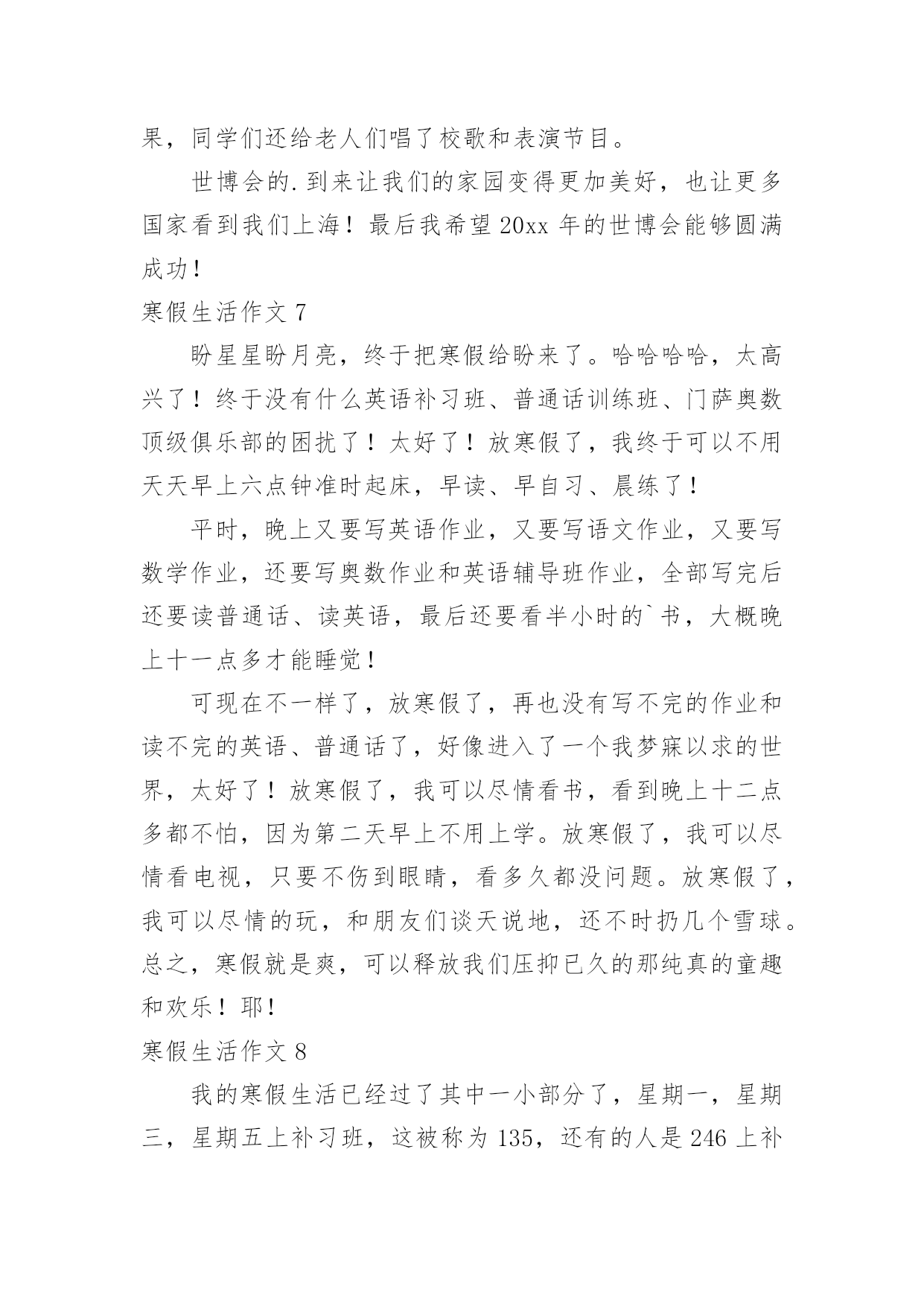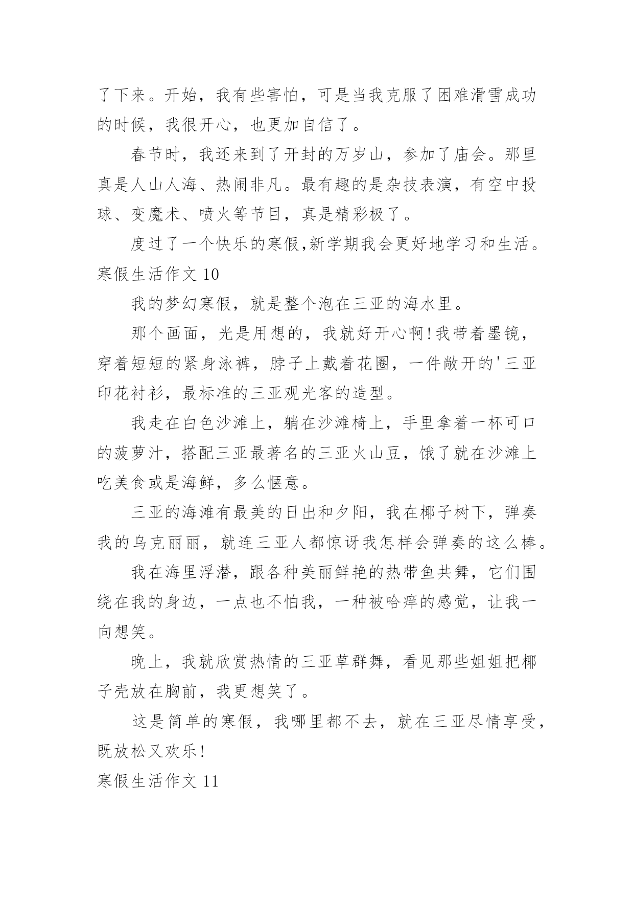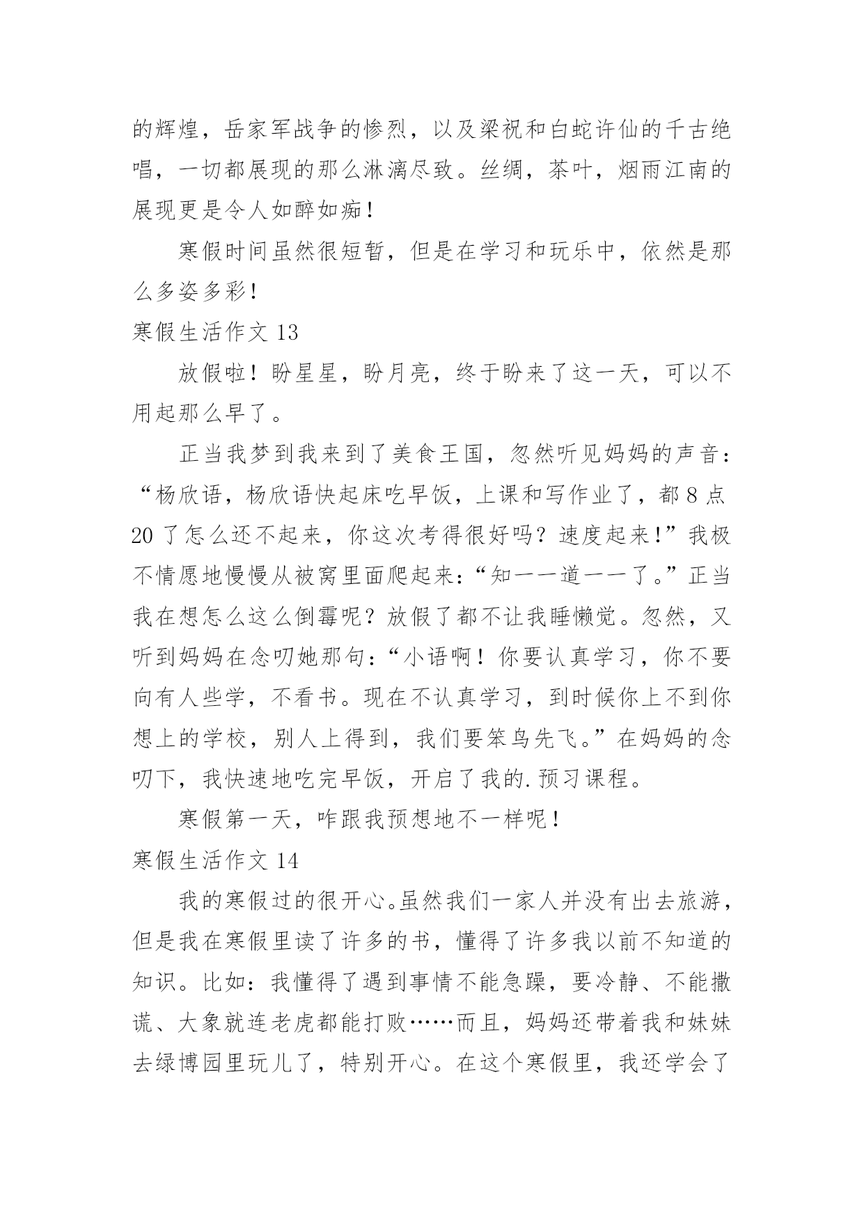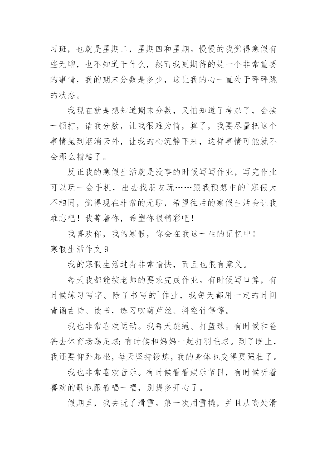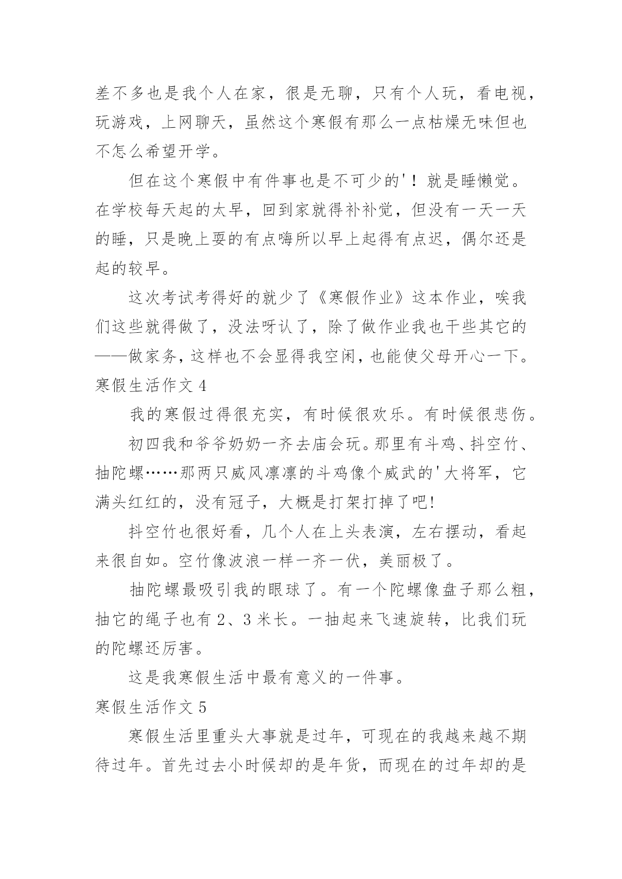 寒假生活作文寒假生活作文大全(15篇)在平日的学习、工作和生活里,大家都尝试过写作文吧,作文根据写作时限的不同可以分为限时作文和非限时作文。为了让您在写作文时更加简单方便,以下是小编为大家收集的寒假生活作文,供大家参考借鉴,希望可以帮助到有需要的朋友。寒假生活作文1寒假,我们去了沙县,吃沙县小吃早上8:00多,我们从三明出发,向东北行驶了30多分钟,就到了沙县。我们来到了一家正宗的沙县小吃,点了南瓜饼、南瓜球、板鸭、炸米粉我们吃得津津有味。小吃一盘接一盘地端了上来,突然,一盘粉红色的东西映入我眼帘,这是一盘粉丝,汤里有一条很粗的东西,我定睛一看,啊!!居然是一条没有取出内脏的泥鳅!!我这么一看,就不敢吃了。装作饱了的'样子走出了门外。过了一会儿,我们吃完了,在附近转悠。来到了一家茶叶店,我们走了进去,老板娘热情地接待了我们,她拿出一包茶叶,给我们品尝,在我们品尝了三淡香的、浓香的、清淡的绿茶,终于买了:老纵—水仙、清淡的铁观音。老板娘说:铁观音要冷藏,则会变味的,这水仙可以不冷藏。我们告别了老板娘,便又上路了。这次在沙县,我们尝到了好吃的沙县小吃,又品尝了茶叶,真是一举两得!寒假生活作文2今天,是一个愉快的日子。刚出门,就与微风撞了个满怀,风中夹杂着腊梅的香味,还有一点鞭炮的味道,这无时无刻都提醒着我们新年到了。一到新年,当然是我们小朋友最开心的时候,有红包。早上,吃了热气腾腾的汤圆,和家人在一起谈笑风生,那真是其乐融融了。爱的`味道弥漫在家里。中午,好多可口的饭菜,有鱼,鱼代表年年有余,有年糕,年糕代表步步高升,有对了,吃鱼的时候千万不能吃鱼头和鱼尾,这样代表有头有尾。吃完午饭,该去要红包了,一向腼腆地我,在金钱的诱惑下,只好硬着头皮说恭喜发财,红包拿来。顺利要到红包,可也不能私吞啊,当然是交给母亲大人,嘻嘻,当然不是全部上交了,还是要留一大半呗。到了晚上,烟花成了最绚丽的风景,那一束束光线突然炸开,红的,黄的,蓝的星星般的花朵向四周分去,似一朵朵闪光的菊花,光彩夺目,似流星徘徊在夜空,似万寿菊欣然怒放。多美呀,多么快乐的寒假。寒假生活作文3盼望已久的寒假生活已来,也即将结束了,在这个寒假中我老爸给我布置了一个艰难的任务——看9个小时的书,当然也包括做作业的时间,废话这简直也是要我的命,我怎么可能会去完成,但也得抽出4个小时看书做作业了,没法呀,就是怎么悲催。我爸他们也经常不在家,这个寒假以来差不多也是我个人在家,很是无聊,只有个人玩,看电视,玩游戏,上网聊天,虽然这个寒假有那么一点枯燥无味但也不怎么希望开学。但在这个寒假中有件事也是不可少的'!就是睡懒觉。在学校每天起的太早,回到家就得补补觉,但没有一天一天的睡,只是晚上耍的有点嗨所以早上起得有点迟,偶尔还是起的较早。这次考试考得好的就少了《寒假作业》这本作业,唉我们这些就得做了,没法呀认了,除了做作业我也干些其它的——做家务,这样也不会显得我空闲,也能使父母开心一下。寒假生活作文4我的寒假过得很充实,有时候很欢乐。有时候很悲伤。初四我和爷爷奶奶一齐去庙会玩。那里有斗鸡、抖空竹、抽陀螺……那两只威风凛凛的斗鸡像个威武的'大将军,它满头红红的,没有冠子,大概是打架打掉了吧!抖空竹也很好看,几个人在上头表演,左右摆动,看起来很自如。空竹像波浪一样一齐一伏,美丽极了。抽陀螺最吸引我的眼球了。有一个陀螺像盘子那么粗,抽它的绳子也有2、3米长。一抽起来飞速旋转,比我们玩的陀螺还厉害。这是我寒假生活中最有意义的一件事。寒假生活作文5寒假生活里重头大事就是过年,可现在的我越来越不期待过年。首先过去小时候却的是年货,而现在的过年却的是年味。我想这正是大家都不喜欢过年的一点吧!过年那几天除了走亲访友,还会出去四处转转玩玩。可你走在大街小巷,哪儿哪儿都是人。连街上的人都是脚跟捧着脚跟,肩膀擦着肩膀。某公园也十分热闹,每个摆摊的'地方,都堆着一层一层的人群。简直就是人山人海。但是,四周都是垃圾,垃圾桶里却是很干净。人们只顾了自己的方便,随手一扔。但是,那么多人,每个人每次扔一片垃圾,就要清洁工弯多少次腰我们还得珍惜他人的劳动成果。而在另一头,默默无闻的清洁工正在弯腰扫着,倒着,捡着。我的寒假见闻是一些不礼貌的现象,但是也让我见到了清洁工的任劳任怨,默默无闻。我期望少一些不礼貌现象,让清洁工人的工作不要太有压力。寒假生活作文6这个寒假很不一样,因为世博会就要举行了,所以我参加了“迎世博,学礼仪,展风彩”冬令营。冬令营的活动真丰富!有当世博小记者,小导游,画世博画,写世博作文和外出活动……老师教了我们怎么做中国馆模型,通过了老师的帮助和我们的智慧终于做完了。老师还教了我们世博英语,用英语和外国朋友交谈,帮助。我不但在学校里了解,学习世博,还在社区里为世博出一份力量。老师带着我们去敬老院,我给了一