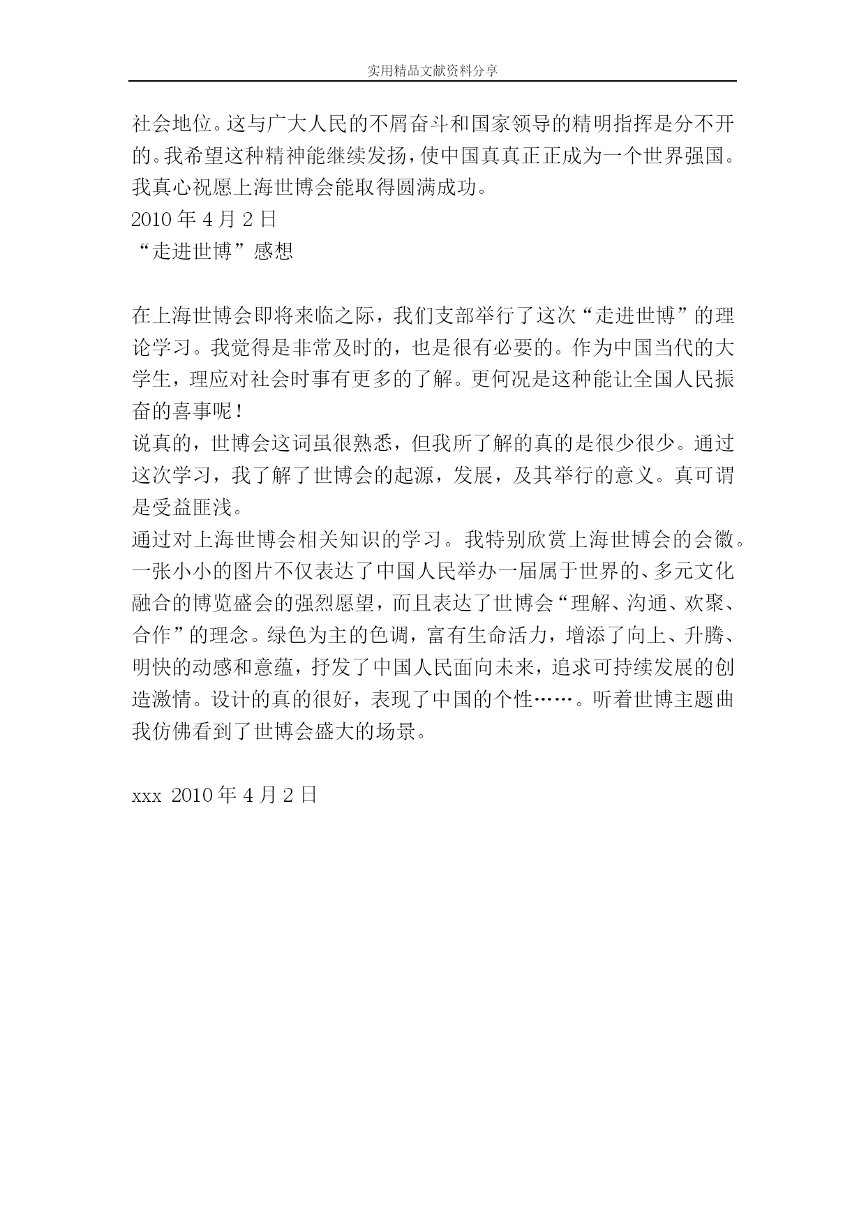 实用精品文献资料分享“走进世博”理论学习记录“走进世博”理论学习记录一、活动名称:走进世博二、活动时间:2010年4月1日三、活动目的:让同学们对世博会的相关知识和世博会的举行意义有了进一步的了解与认识,也在大家在学习之余了解时事。四、活动地点:生科院108教室五、参与对象:生科院生物科学专业生科二班团支部全体成员六、参与人数:34人七、负责人:xxx八、记录人:xxx九、活动过程:(1)由班级组织委员结合所做的PPT给大家讲解世博会的起源,发展及历届世博会的举办情况。(2)讲解有关上海世博会的相关知识。(3)向大家提问,让同学们根据上海世博会的会徽图来谈谈自己对会徽组成及象征意义的理解。(4)向大家播放上海世博会宣传片视频及展示上海世博会各国的展馆图片。(5)最后以上海世博会的主题曲结束本次理论学习。十、活动效果:此次活动让支部成员对世博会有了基本的认识,也让大家开始认真思考学业以外的社会时事,利于提升大家的综合素质。十一、学习心得“走进世博”感想本次理论学习类容丰富,形式多样,同学们在学习过程中感到很快乐。并且学到了实实在在的东西,所以觉得很有意义。让我印象最深刻,感触很深的就是上海世博会的宣传片。我看到了中国多彩的文化,高速发展的经济,和日趋完善的社会政策。作为中国人的我感到很自豪很骄傲。看视频时真的是热血沸腾。也了解到,今年在上海举行世博会的机会是很难得的。这也说明了中国正逐步强大起来,有了一定的社会地位。这与广大人民的不屑奋斗和国家领导的精明指挥是分不开的。我希望这种精神能继续发扬,使中国真真正正成为一个世界强国。我真心祝愿上海世博会能取得圆满成功。2010年4月2日“走进世博”感想在上海世博会即将来临之际,我们支部举行了这次“走进世博”的理论学习。我觉得是非常及时的,也是很有必要的。作为中国当代的大学生,理应对社会时事有更多的了解。更何况是这种能让全国人民振奋的喜事呢!说真的,世博会这词虽很熟悉,但我所了解的真的是很少很少。通过这次学习,我了解了世博会的起源,发展,及其举行的意义。真可谓是受益匪浅。通过对上海世博会相关知识的学习。我特别欣赏上海世博会的会徽。一张小小的图片不仅表达了中国人民举办一届属于世界的、多元文化融合的博览盛会的强烈愿望,而且表达了世博会“理解、沟通、欢聚、合作”的理念。绿色为主的色调,富有生命活力,增添了向上、升腾、明快的动感和意蕴,抒发了中国人民面向未来,追求可持续发展的创造激情。设计的真的很好,表现了中国的个性……。听着世博主题曲我仿佛看到了世博会盛大的场景。xxx2010年4月2日