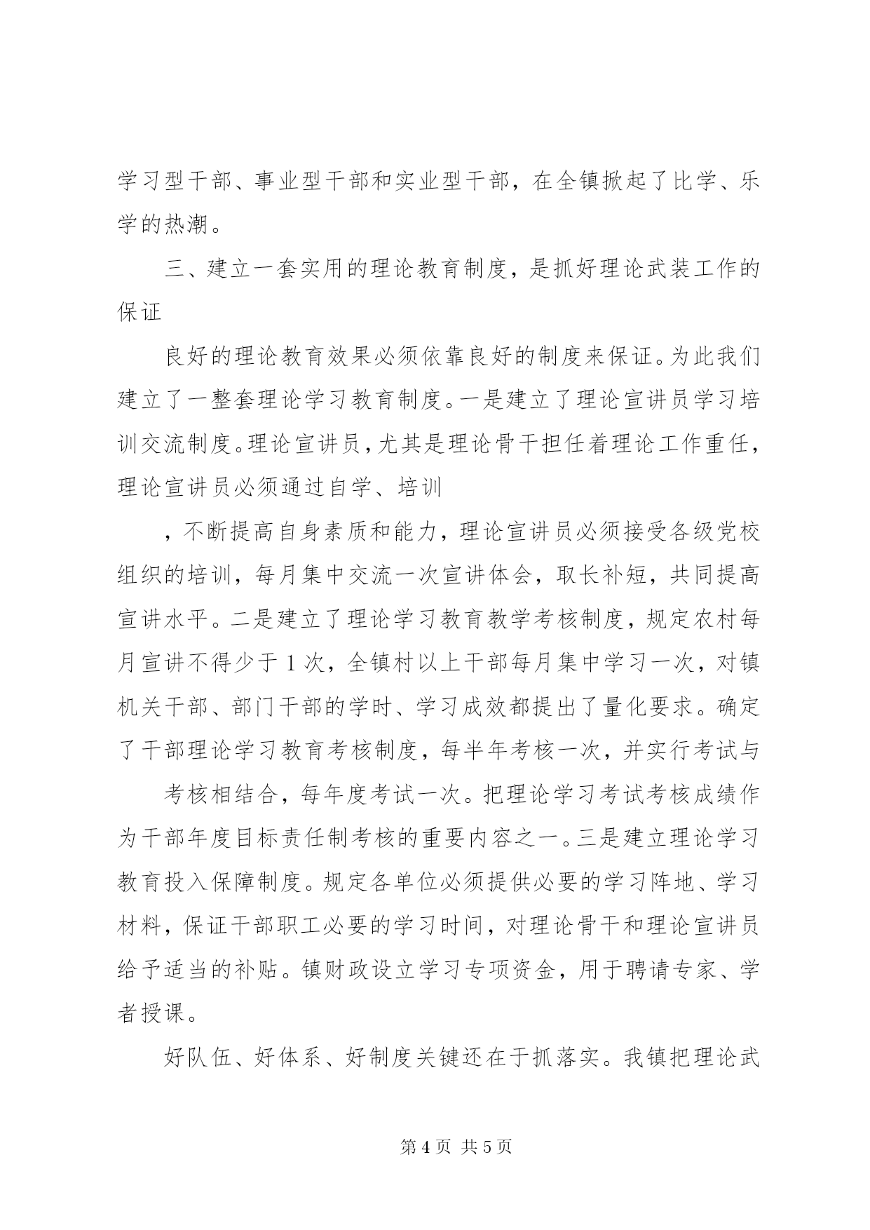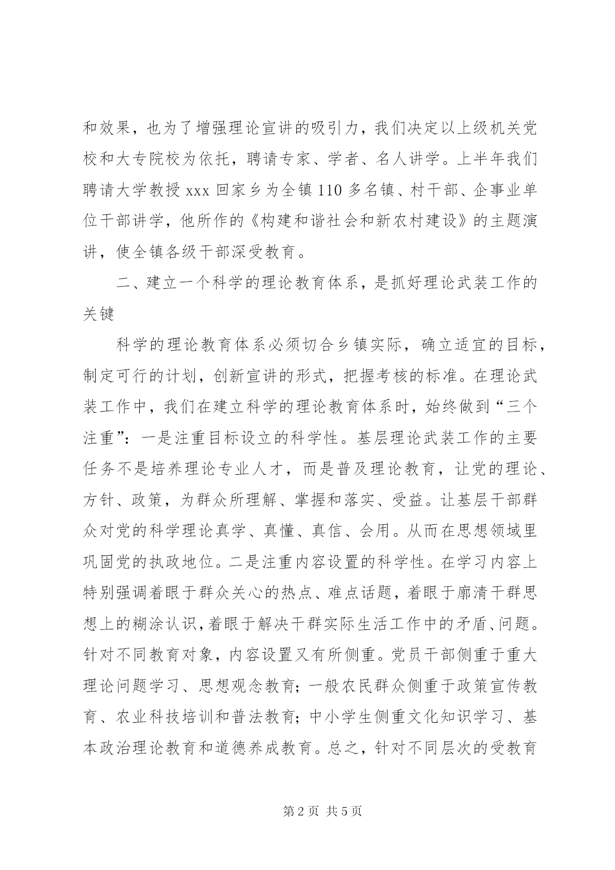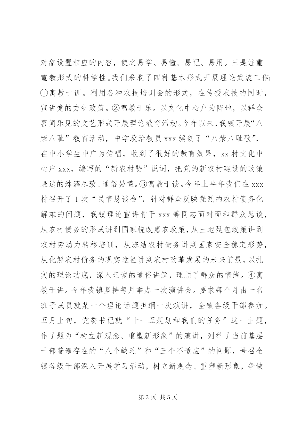 第PAGE\*Arabic\*MERGEFORMAT5页共NUMPAGES\*MERGEFORMAT5页理论武装工作总结是理论武装工作必须坚持“以人为本,创新思路,找准切入点,增强吸引力。”就是要以干群普遍关心的热点、难点话题为切入点。我们的具体做法是:一、建立一支优秀的理论宣教队伍是抓好理论武装工作的前提要增强理论武装工作的实效性,必须建立一支素质精良的理论宣教队伍,为此我们从三个层面来组建这支队伍:一是以基层政工干部为基础。我们在每个村和每个单位分别配套了2名和1名理论宣讲员,理论宣讲员由负责党务或政工的班子成员担任,在农村还从退休教师、离职村干部中聘请了一名理论宣讲员。依靠基层宣讲员开展“面对面”宣讲活动。今年以来全镇农村开展群众性理论宣讲活动50余场。四月下旬组织全镇在xx村召开了理论宣讲观摩会,年轻优秀的村支部书记,结合实际向村民讲解了党中央关于加快新农村建设的决定,使村民大受教育和鼓舞。二是以乡镇理论骨干为重点。乡镇理论骨干是理论武装工作的重点力量。我们以机关党政办主任、党校理论教员、学校政治教员为主体,吸纳部分优秀年轻村支部书记、企事业单位负责人共12人成立了理论宣教中心组,负责指导全镇理论武装工作。上半年全镇共开展理论宣讲活动6次,受教达530余人次。三是以各级党政领导干部和理论专家学者为依托。为了提高理论宣讲的质量和效果,也为了增强理论宣讲的吸引力,我们决定以上级机关党校和大专院校为依托,聘请专家、学者、名人讲学。上半年我们聘请大学教授xxx回家乡为全镇110多名镇、村干部、企事业单位干部讲学,他所作的《构建和谐社会和新农村建设》的主题演讲,使全镇各级干部深受教育。二、建立一个科学的理论教育体系,是抓好理论武装工作的关键科学的理论教育体系必须切合乡镇实际,确立适宜的目标,制定可行的计划,创新宣讲的形式,把握考核的标准。在理论武装工作中,我们在建立科学的理论教育体系时,始终做到“三个注重”:一是注重目标设立的科学性。基层理论武装工作的主要任务不是培养理论专业人才,而是普及理论教育,让党的理论、方针、政策,为群众所理解、掌握和落实、受益。让基层干部群众对党的科学理论真学、真懂、真信、会用。从而在思想领域里巩固党的执政地位。二是注重内容设置的科学性。在学习内容上特别强调着眼于群众关心的热点、难点话题,着眼于廓清干群思想上的糊涂认识,着眼于解决干群实际生活工作中的矛盾、问题。针对不同教育对象,内容设置又有所侧重。党员干部侧重于重大理论问题学习、思想观念教育;一般农民群众侧重于政策宣传教育、农业科技培训和普法教育;中小学生侧重文化知识学习、基本政治理论教育和道德养成教育。总之,针对不同层次的受教育对象设置相应的内容,使之易学、易懂、易记、易用。三是注重宣教形式的科学性。我们采取了四种基本形式开展理论武装工作:①寓教于训。利用各种农技培训会的形式,在传授农技的同时,宣讲党的方针政策。②寓教于乐。以文化中心户为阵地,以群众喜闻乐见的文艺形式开展理论教育活动。今年以来,我镇开展“八荣八耻”教育活动,中学政治教员xxx编创了“八荣八耻歌”,在中小学生中广为传唱,收到了很好的教育效果,xx村文化中心户xxx,编写的“新农村赞”说词,把党的新农村建设的政策表达的淋漓尽致、通俗易懂。③寓教于谈。今年上半年我们在xxx村召开了1次“民情恳谈会”,针对群众反映强烈的农村债务化解难的问题,我镇理论宣讲骨干xxx等同志面对面和群众恳谈,从农村债务的形成讲到国家税改惠农政策,从土地延包政策讲到农村劳动力转移培训,从冻结农村债务讲到国家安全稳定形势,从化解农村债务的现实途径讲到农村改革发展的未来前景,以扎实的理论功底,深入坦诚的通俗讲解,理顺了群众的情绪。④寓教于讲。今年我镇坚持每月举办一次演讲会。要求每个月由一名班子成员就某一个理论话题担纲一次演讲,全镇各级干部参加。五月上旬,党委书记就“十一五规划和我们的任务”这一主题,作了题为“树立新观念、重塑新形象”的演讲,列举了当前基层干部普遍存在的“八个缺乏”和“三个不适应”的问题,号召全镇各级干部深入开展学习活动,树立新观念、重塑新形象,争做学习型干部、事业型干部和实业型干部,在全镇掀起了比学、乐学的热潮。三、建立一套实用的理论教育制度,是抓好理论武装工作的保证良好的理论教育效果必须依靠良好的制度来保证。为此我们建立了一整套理论学习教育制度。一是建立了理论宣讲员学习培训交流制度。理论宣讲员,尤其是理论骨干担任着理论工作重任,理论宣讲员必须通过自学、培训,不断提高自身素质和能力,理论宣讲员必须接受各级党校组织的培训,每月集中交流一次宣讲体会,取长补短,共同提高宣讲水平。二是建立了理论学习教育教学考核制度,规定农村每月宣讲不得少于1次,全镇村以上干部每月集中学习一次,对镇机关