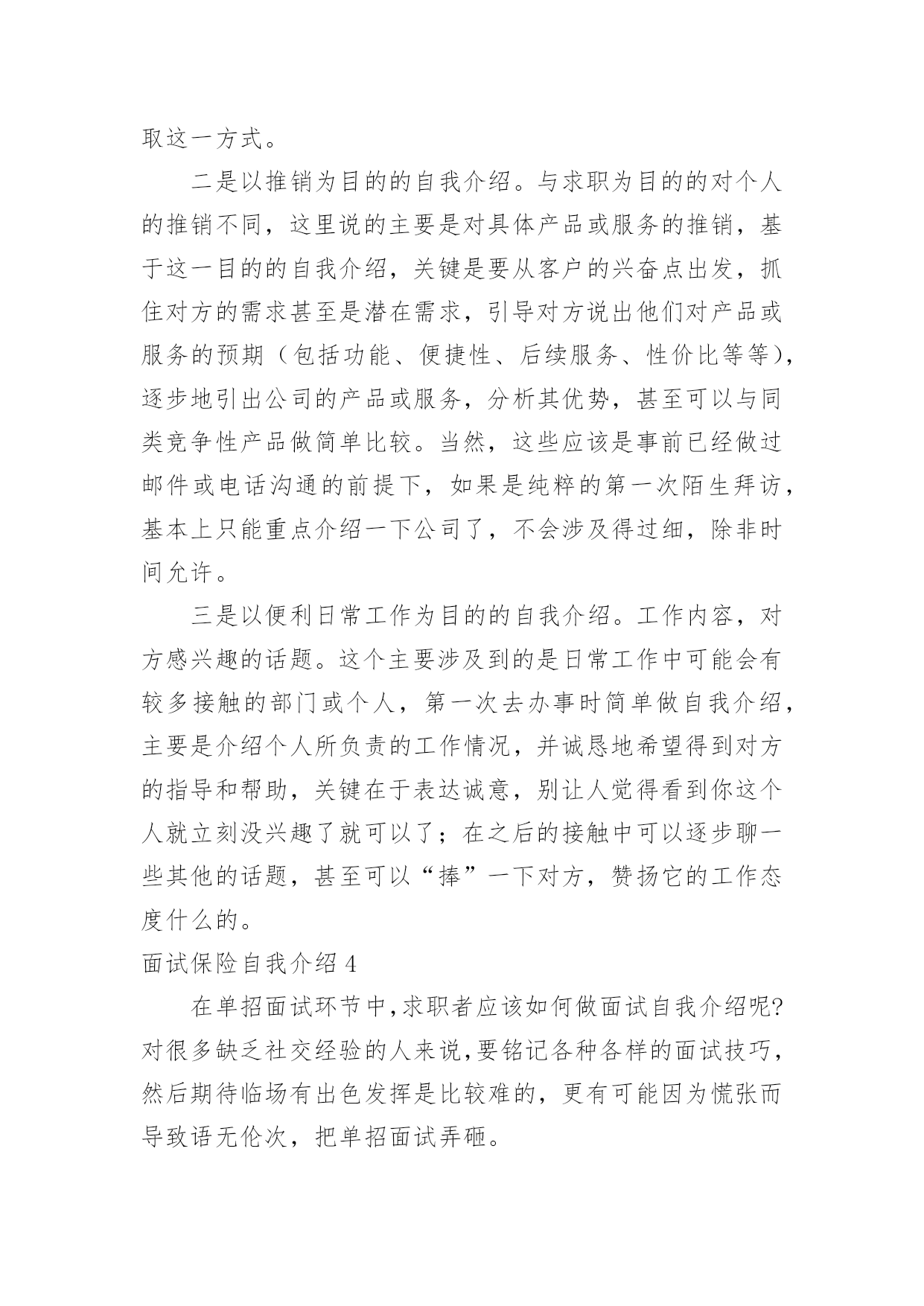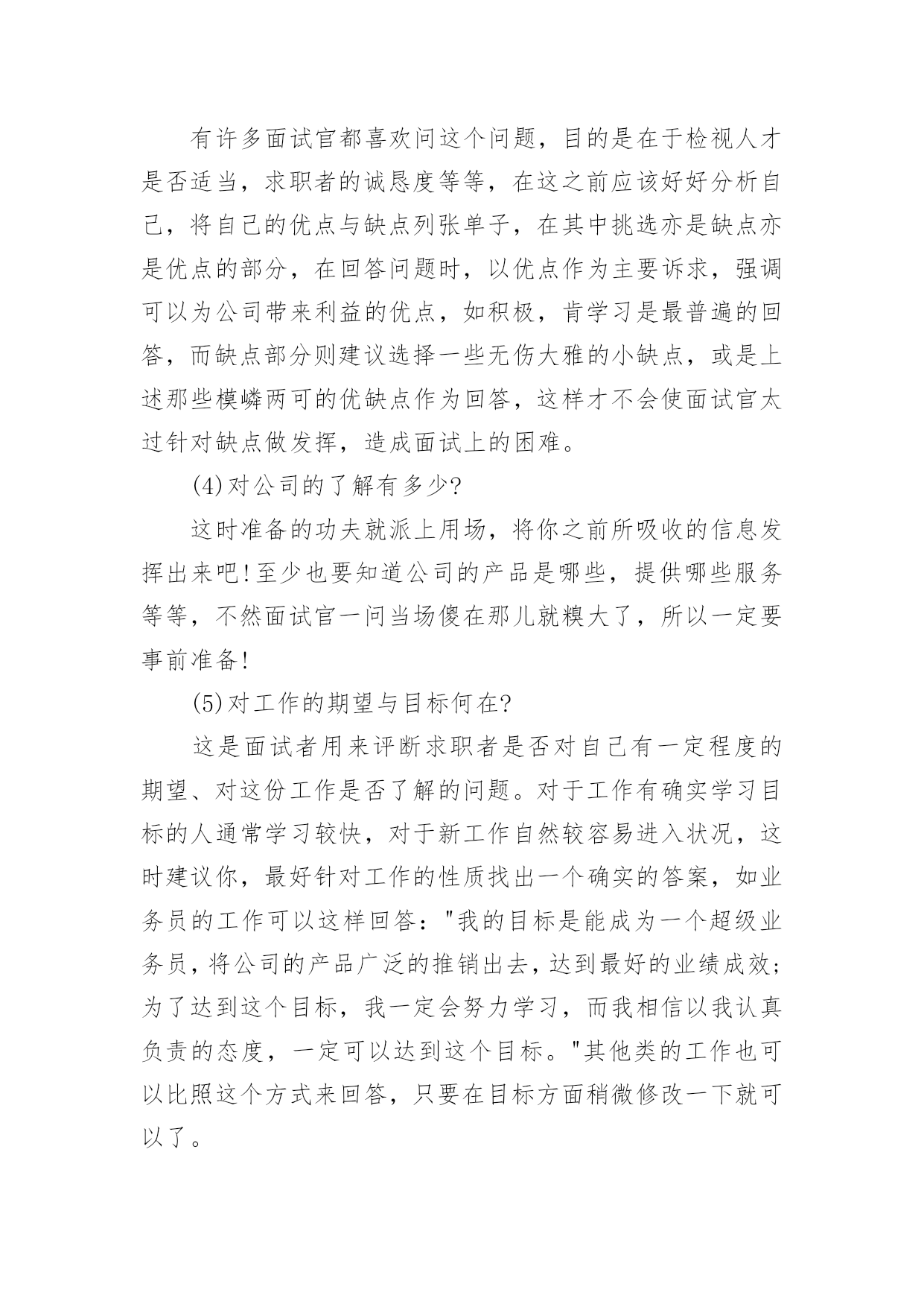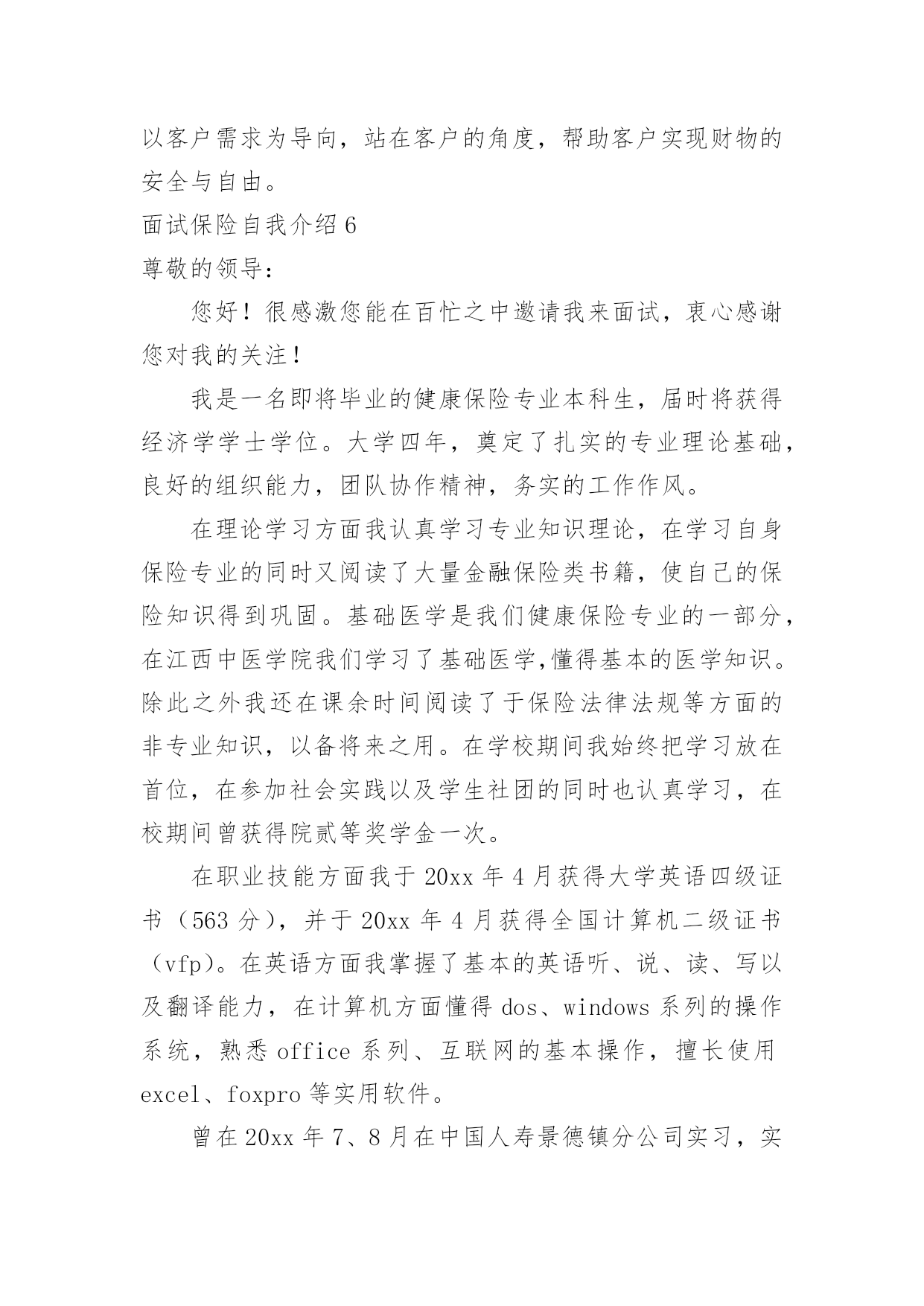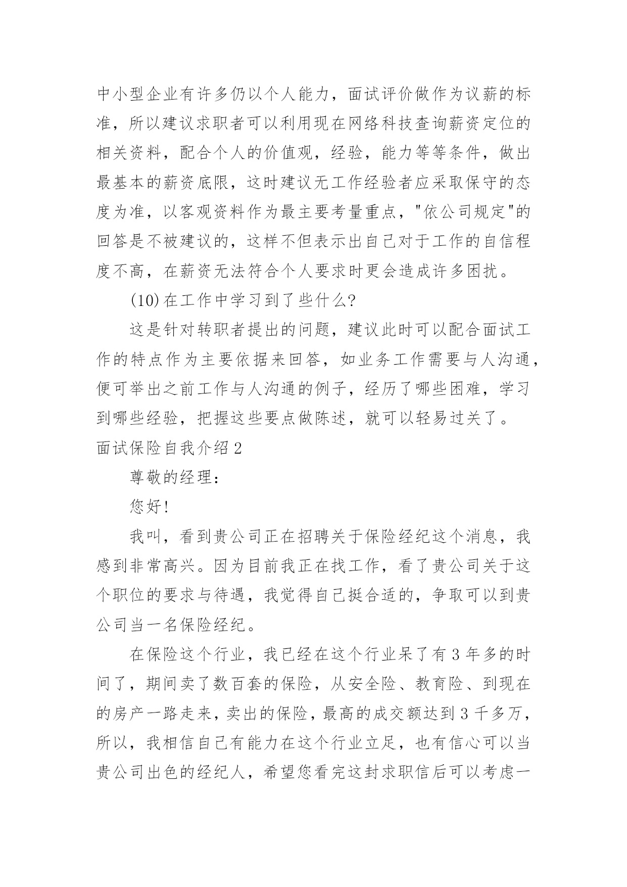 面试保险自我介绍面试保险自我介绍当来到一个新环境中,通常需要我们进行自我介绍,自我介绍是人与人进行沟通的出发点。如何写出一个与众不同的自我介绍?以下是小编帮大家整理的面试保险自我介绍,希望对大家有所帮助。面试保险自我介绍1尊敬的经理:您好!我叫xxx,看到贵公司正在招聘关于保险经纪这个消息,我感到非常高兴。因为目前我正在找工作,看了贵公司关于这个职位的要求与待遇,我觉得自己挺合适的,争取可以到贵公司当一名保险经纪。在保险这个行业,我已经在这个行业呆了有3年多的时间了,期间卖了数百套的保险,从安全险、教育险、到现在的房产一路走来,卖出的保险,最高的成交额达到3千多万,所以,我相信自己有能力在这个行业立足,也有信心可以当贵公司出色的经纪人,希望您看完这封求职信后可以考虑一下我。另外,本人拥有优秀的人际交往能力,优秀的客户服务技巧,以及习惯了快节奏高压力的工作与思考的能力,成功地完成公司的任务。综合这些条件,我相信自己将会是贵公司保险经纪的最佳人选。平安保险内勤面试问题及答案(1)为什么想进本公司?这通常是面试官最先问到的问题。此时面试官就开始评断录用与否了,建议大家先判断自己去应征的工作性质,是专业能力导向呢,或是需要沟通能力,其实现在市场多以服务为方向,所以口才被视为基本能力之一,所以在此时就要好好表现自己的口才,而口才较差者就务必表现出自己的专业能力即诚意,弥补口才不足的部分。回答这个问题时,一定要积极正面,如想要使自己能有更好的发展空间,希望能在相关领域中有所发展,希望能在公司多多学习等等;此时可以稍稍夸一下面试公司,但切记一定要诚恳,不然可是会画蛇添足,得不偿失哦!对于社会新鲜人的建议则是,由于之前没有工作经验,所以建议你可以坦承的说出自己的动机,不过用语还是要思考一下。(2)喜欢这份工作的哪一点?相信其实大家心中一定都有答案了吧!每个人的价值观不同,自然评断的标准也会不同,但是,在回答面试官这个问题时可不能太直接就把自己心理的话说出来,尤其是薪资方面的问题,不过一些无伤大雅的回答是不错的考虑,如交通方便,工作性质及内容颇能符合自己的兴趣等等都是不错的答案,不过如果这时自己能仔细思考出这份工作的与众不同之处,相信在面试上会大大加分。(3)自己的优缺点为何?有许多面试官都喜欢问这个问题,目的是在于检视人才是否适当,求职者的诚恳度等等,在这之前应该好好分析自己,将自己的优点与缺点列张单子,在其中挑选亦是缺点亦是优点的部分,在回答问题时,以优点作为主要诉求,强调可以为公司带来利益的优点,如积极,肯学习是最普遍的回答,而缺点部分则建议选择一些无伤大雅的小缺点,或是上述那些模嶙两可的优缺点作为回答,这样才不会使面试官太过针对缺点做发挥,造成面试上的困难。(4)对公司的了解有多少?这时准备的功夫就派上用场,将你之前所吸收的信息发挥出来吧!至少也要知道公司的产品是哪些,提供哪些服务等等,不然面试官一问当场傻在那儿就糗大了,所以一定要事前准备!(5)对工作的期望与目标何在?这是面试者用来评断求职者是否对自己有一定程度的期望、对这份工作是否了解的问题。对于工作有确实学习目标的人通常学习较快,对于新工作自然较容易进入状况,这时建议你,最好针对工作的性质找出一个确实的答案,如业务员的工作可以这样回答:"我的目标是能成为一个超级业务员,将公司的产品广泛的推销出去,达到最好的业绩成效;为了达到这个目标,我一定会努力学习,而我相信以我认真负责的态度,一定可以达到这个目标。"其他类的工作也可以比照这个方式来回答,只要在目标方面稍微修改一下就可以了。(6)为什么要离职?回答这个问题时一定要小心,就算在前一个工作受到在大的委屈,对公司有多少的怨言,都千万不要表现出来,尤其要避免对公司本身主管的批评,避免面试官的负面情绪及印象;建议此时最好的回答方式是将问题归咎在自己身上,例如觉得工作没有学习发展的空间,自己想在面试工作的相关产业中多加学习,或是前一份工作与自己的生涯规划不合等等,回答的答案最好是积极正面的。(7)选择这份工作的原因为何?这是面试官用来测试应聘者对工作理解度的问题,藉以了解求职者只是基于对工作的憧憬或是确实的兴趣来应征这份工作,此时之前所强调的事先研究功夫又再度派上用场,建议你的回答应以个人的兴趣配合工作内容特质,表现出高度的诚意,这样才可以为自己铺下迈向成功之路。(8)你认为相关产业的发展为何?这也是事前准备的功夫,多阅读一些相关的报章杂志,做一些思考,表现出自己对此相关产业的的认识,如果是同业转职者,可强调以自己的经验为基础所做的个人见解,但若是初次接触此一行业,建议采取较为保守的方式,以目前资讯所提供的资料为主作答,表现出高度兴趣及诚意为最高指导原则。(9)你希望的待遇为多少?这是一个非常敏感的问题,其实在目前,一般大型企业在招聘时