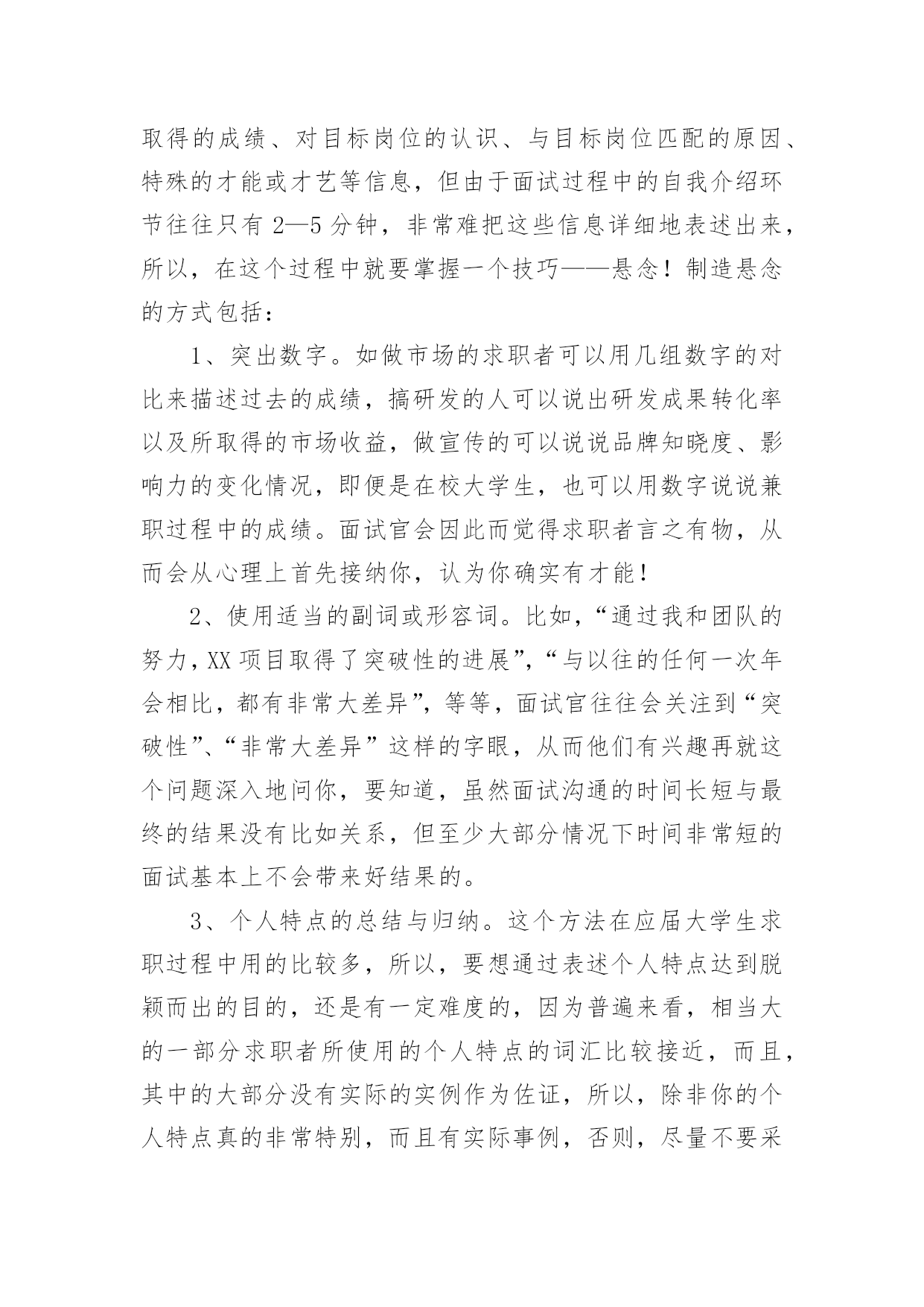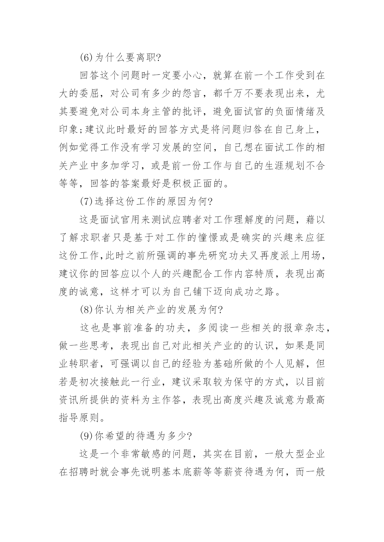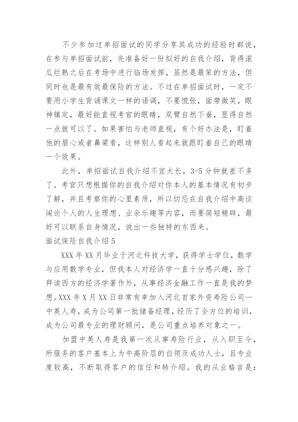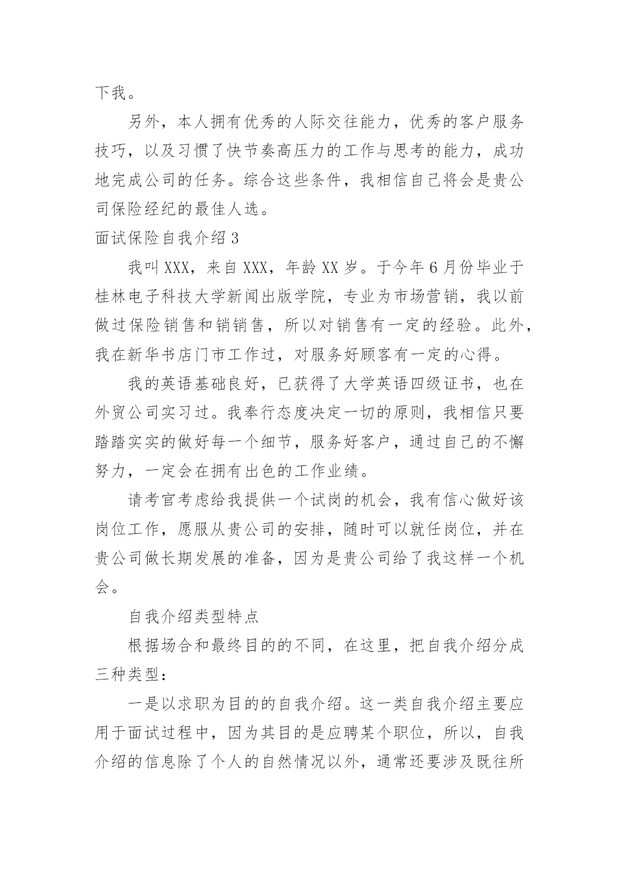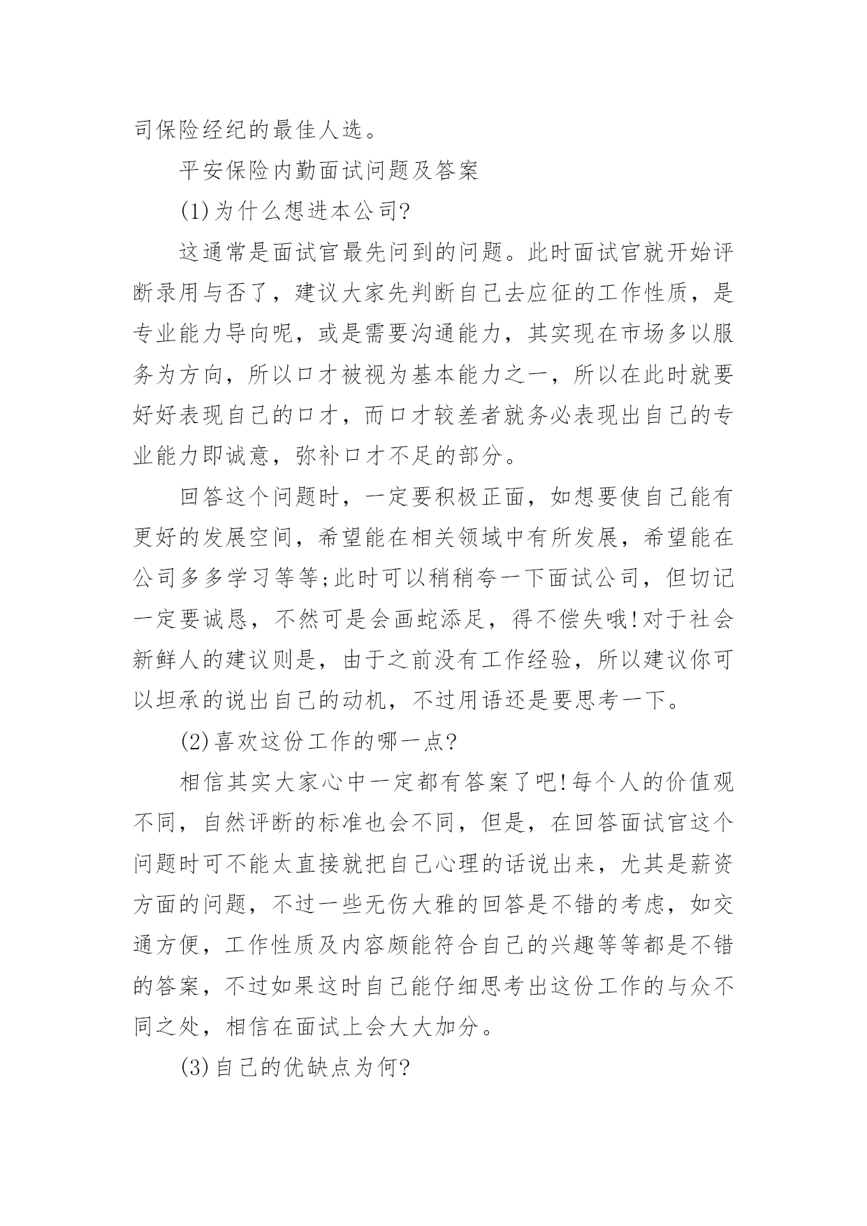 面试保险自我介绍面试保险自我介绍当来到一个新环境中,通常需要我们进行自我介绍,自我介绍是人与人进行沟通的出发点。如何写出一个与众不同的自我介绍?以下是小编帮大家整理的面试保险自我介绍,希望对大家有所帮助。面试保险自我介绍1尊敬的经理:您好!我叫xxx,看到贵公司正在招聘关于保险经纪这个消息,我感到非常高兴。因为目前我正在找工作,看了贵公司关于这个职位的要求与待遇,我觉得自己挺合适的,争取可以到贵公司当一名保险经纪。在保险这个行业,我已经在这个行业呆了有3年多的时间了,期间卖了数百套的保险,从安全险、教育险、到现在的房产一路走来,卖出的保险,最高的成交额达到3千多万,所以,我相信自己有能力在这个行业立足,也有信心可以当贵公司出色的经纪人,希望您看完这封求职信后可以考虑一下我。另外,本人拥有优秀的人际交往能力,优秀的客户服务技巧,以及习惯了快节奏高压力的工作与思考的能力,成功地完成公司的任务。综合这些条件,我相信自己将会是贵公司保险经纪的最佳人选。平安保险内勤面试问题及答案(1)为什么想进本公司?这通常是面试官最先问到的问题。此时面试官就开始评断录用与否了,建议大家先判断自己去应征的工作性质,是专业能力导向呢,或是需要沟通能力,其实现在市场多以服务为方向,所以口才被视为基本能力之一,所以在此时就要好好表现自己的口才,而口才较差者就务必表现出自己的专业能力即诚意,弥补口才不足的部分。回答这个问题时,一定要积极正面,如想要使自己能有更好的发展空间,希望能在相关领域中有所发展,希望能在公司多多学习等等;此时可以稍稍夸一下面试公司,但切记一定要诚恳,不然可是会画蛇添足,得不偿失哦!对于社会新鲜人的建议则是,由于之前没有工作经验,所以建议你可以坦承的说出自己的动机,不过用语还是要思考一下。(2)喜欢这份工作的哪一点?相信其实大家心中一定都有答案了吧!每个人的价值观不同,自然评断的标准也会不同,但是,在回答面试官这个问题时可不能太直接就把自己心理的话说出来,尤其是薪资方面的问题,不过一些无伤大雅的回答是不错的考虑,如交通方便,工作性质及内容颇能符合自己的兴趣等等都是不错的答案,不过如果这时自己能仔细思考出这份工作的与众不同之处,相信在面试上会大大加分。(3)自己的优缺点为何?有许多面试官都喜欢问这个问题,目的是在于检视人才是否适当,求职者的诚恳度等等,在这之前应该好好分析自己,将自己的优点与缺点列张单子,在其中挑选亦是缺点亦是优点的部分,在回答问题时,以优点作为主要诉求,强调可以为公司带来利益的优点,如积极,肯学习是最普遍的回答,而缺点部分则建议选择一些无伤大雅的小缺点,或是上述那些模嶙两可的优缺点作为回答,这样才不会使面试官太过针对缺点做发挥,造成面试上的困难。(4)对公司的了解有多少?这时准备的功夫就派上用场,将你之前所吸收的信息发挥出来吧!至少也要知道公司的产品是哪些,提供哪些服务等等,不然面试官一问当场傻在那儿就糗大了,所以一定要事前准备!(5)对工作的期望与目标何在?这是面试者用来评断求职者是否对自己有一定程度的期望、对这份工作是否了解的问题。对于工作有确实学习目标的人通常学习较快,对于新工作自然较容易进入状况,这时建议你,最好针对工作的性质找出一个确实的答案,如业务员的工作可以这样回答:"我的目标是能成为一个超级业务员,将公司的产品广泛的推销出去,达到最好的业绩成效;为了达到这个目标,我一定会努力学习,而我相信以我认真负责的态度,一定可以达到这个目标。"其他类的工作也可以比照这个方式来回答,只要在目标方面稍微修改一下就可以了。(6)为什么要离职?回答这个问题时一定要小心,就算在前一个工作受到在大的委屈,对公司有多少的怨言,都千万不要表现出来,尤其要避免对公司本身主管的批评,避免面试官的负面情绪及印象;建议此时最好的回答方式是将问题归咎在自己身上,例如觉得工作没有学习发展的空间,自己想在面试工作的相关产业中多加学习,或是前一份工作与自己的生涯规划不合等等,回答的答案最好是积极正面的。(7)选择这份工作的原因为何?这是面试官用来测试应聘者对工作理解度的问题,藉以了解求职者只是基于对工作的憧憬或是确实的兴趣来应征这份工作,此时之前所强调的事先研究功夫又再度派上用场,建议你的回答应以个人的兴趣配合工作内容特质,表现出高度的诚意,这样才可以为自己铺下迈向成功之路。(8)你认为相关产业的发展为何?这也是事前准备的功夫,多阅读一些相关的报章杂志,做一些思考,表现出自己对此相关产业的的认识,如果是同业转职者,可强调以自己的经验为基础所做的个人见解,但若是初次接触此一行业,建议采取较为保守的方式,以目前资讯所提供的资料为主作答,表现出高度兴趣及诚意为最高指导原则。(9)你希望的待遇为多少?这是一个非常敏感的问题,其实在目前,一般大型企业在招聘时