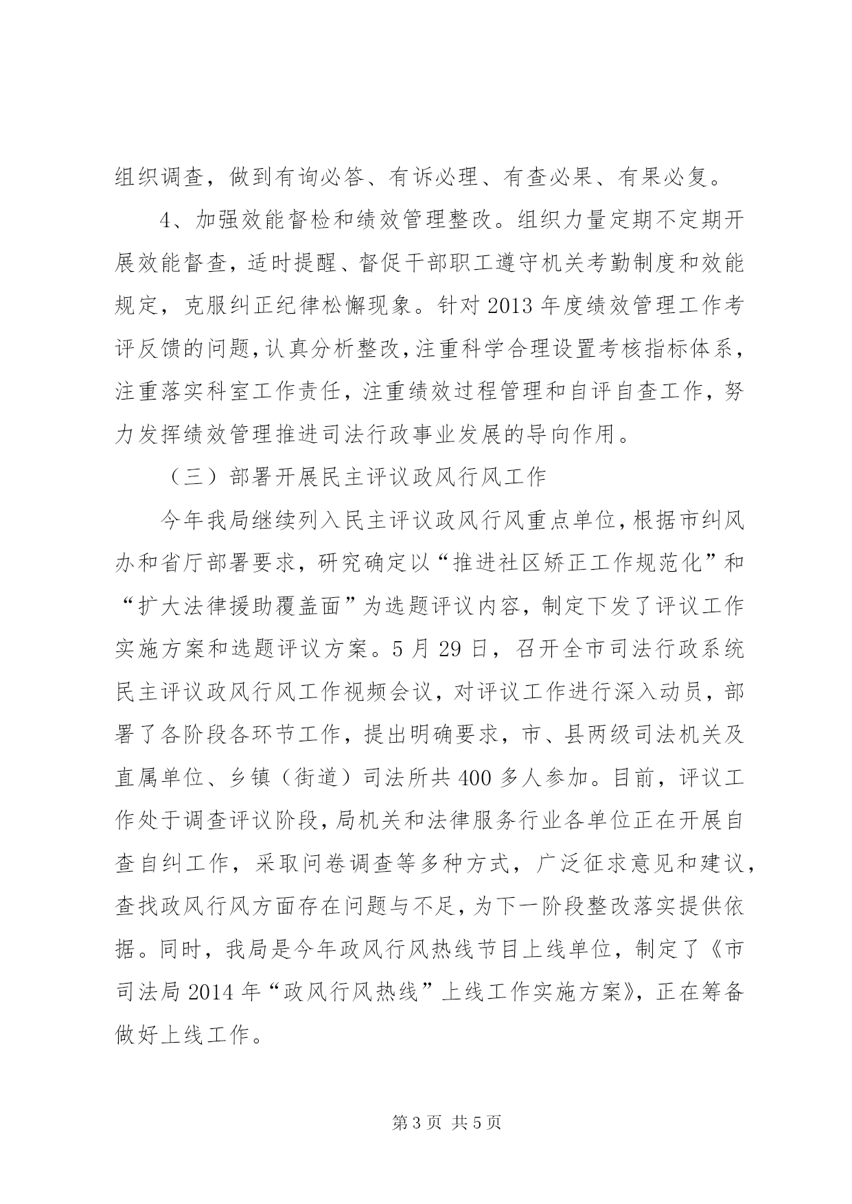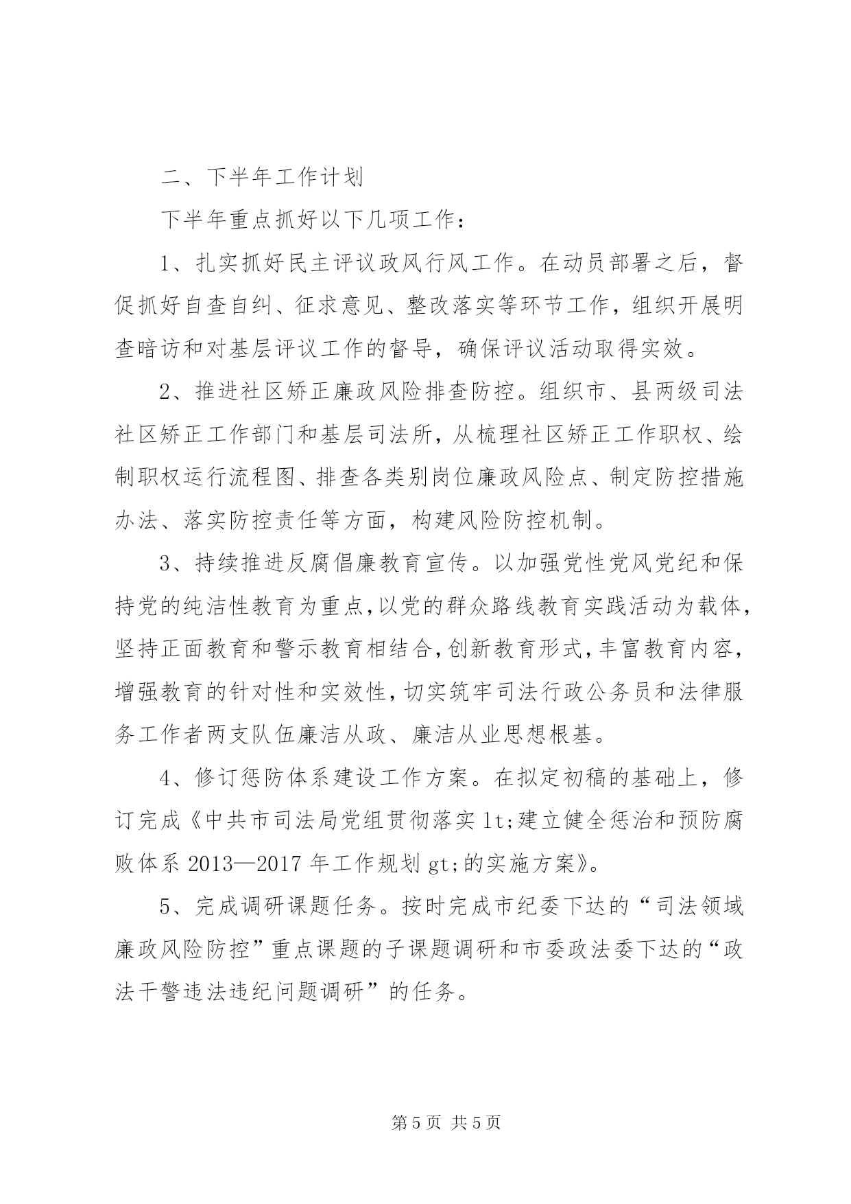 第PAGE\*Arabic\*MERGEFORMAT5页共NUMPAGES\*MERGEFORMAT5页司法局纪检监察半年工作总结一、上半年工作情况年初,局党组制定下发《全市司法行政系统2014年度党风廉政建设和反腐败工作主要任务分解抓落实方案》,分解下达18项工作任务。围绕落实工作任务,加强协调组织,上半年主要抓了以下几个方面:(一)抓学习教育传达学习中央和省市纪委全会精神,学习胡锦涛总书记在中央纪委十八届二次全会上的重要讲话精神,领会把握党的十八大和十八大以来中央领导对党风廉政建设和反腐败工作的新论述、新部署、新要求,清醒认识当前反腐倡廉面临的形势。在市局机关内部电子显示屏上滚动播放党政纪主要条款、廉政格言警句,加深全体干部职工对廉政法规和党纪条规的理解,增强法纪意识和廉政意识。年初,局领导班子成员在全市司法行政工作会议上作出廉政承诺,接受全系统干部职工监督。(二)抓作风效能建设1、持续贯彻“八项”规定。按照市纪委和市委办、市政府部署要求,把巩固“八项”规定贯彻落实成果作为改进作风的重中之重来抓,每季度开展贯彻落实情况自查工作,每季度详细公开“三公”经费。上半年,会议经费、公务接待费、车辆运行费比去年同期有所下降,没有发生私客公请、公款旅游、公车私用等违规行为。2、学习贯彻效能《条例》。以省人大颁布实施《省机关效能建设工作条例》为契机,采取在局机关电子显示屏滚动播放条例相关条款、发放《条例》及《效能建设制度解释》等学习资料、以科室为单位开展讨论、组织知识测试等多种方式,在全局上下营造学习氛围,增进干部职工对《条例》内容与规定的了解把握,增强贯彻执行《条例》、遵守效能规定的自觉性。组织各业务科室和直属单位,对照《条例》要求,对有关效能建设和工作制度进行梳理,局机关新修订了《发文管理实施办法》和《印章管理使用制度》2项制度。三都澳公证处启动上下班指纹签到签退制度,进一步规范考勤管理,继续实行办证绩效计分考核办法,奖优罚劣、奖勤罚懒,调动工作人员积极性、主动性和创造性。3、推行“马上就办”。结合司法行政职能职责,以法律服务行政许可审查为重点,全面梳理“马上就办”事项,梳理律师、司法鉴定执业申请审核、法律援助申请等12项“马上就办”事项,对外公开“马上就办”事项一览表,明确承办科室、承办人,公布联系电话。各承办科室按照办理时限要求,认真办理公开事项,没有发生拖延办理、被投诉的情况。同时,公证、法律援助窗口单位积极推行“上门服务”、“预约服务”、“绿色通道”等便民利民措施,履行办结时限承诺,为群众提供优质高效服务。及时做好司法行政系统投诉处理工作,第一时间反应,第一时间组织调查,做到有询必答、有诉必理、有查必果、有果必复。4、加强效能督检和绩效管理整改。组织力量定期不定期开展效能督查,适时提醒、督促干部职工遵守机关考勤制度和效能规定,克服纠正纪律松懈现象。针对2013年度绩效管理工作考评反馈的问题,认真分析整改,注重科学合理设置考核指标体系,注重落实科室工作责任,注重绩效过程管理和自评自查工作,努力发挥绩效管理推进司法行政事业发展的导向作用。(三)部署开展民主评议政风行风工作今年我局继续列入民主评议政风行风重点单位,根据市纠风办和省厅部署要求,研究确定以“推进社区矫正工作规范化”和“扩大法律援助覆盖面”为选题评议内容,制定下发了评议工作实施方案和选题评议方案。5月29日,召开全市司法行政系统民主评议政风行风工作视频会议,对评议工作进行深入动员,部署了各阶段各环节工作,提出明确要求,市、县两级司法机关及直属单位、乡镇(街道)司法所共400多人参加。目前,评议工作处于调查评议阶段,局机关和法律服务行业各单位正在开展自查自纠工作,采取问卷调查等多种方式,广泛征求意见和建议,查找政风行风方面存在问题与不足,为下一阶段整改落实提供依据。同时,我局是今年政风行风热线节目上线单位,制定了《市司法局2014年“政风行风热线”上线工作实施方案》,正在筹备做好上线工作。(四)抓好自身建设1、研究制定惩防体系实施方案。贯彻落实中央《建立健全惩治与预防腐败体系2013—2017年工作规划》及市委、省厅党委的实施意见,结合本系统实际,拟定了《中共市司法局党组贯彻落实lt;建立健全惩治和预防腐败体系2013—2017年工作规划gt;的实施方案》初稿。2、认真办理信访事项。组织对2002年以来信访反映的问题线索进行清理上报,处置了结1件问题线索,从今年开始每月上报问题线索处置情况。积极配合市纪委党风室核查反映我局业务用房超面积建设问题。3、落实“三转”要求。驻局纪检组、监察室认真学习领会纪检监察机关“转职能、转方式、转作风”工作要求,进一步明确职能定位和工作站位。争取局党组重视支持,调整纪检组工作分工,纪检组长不再协管法律援助、绩效管理