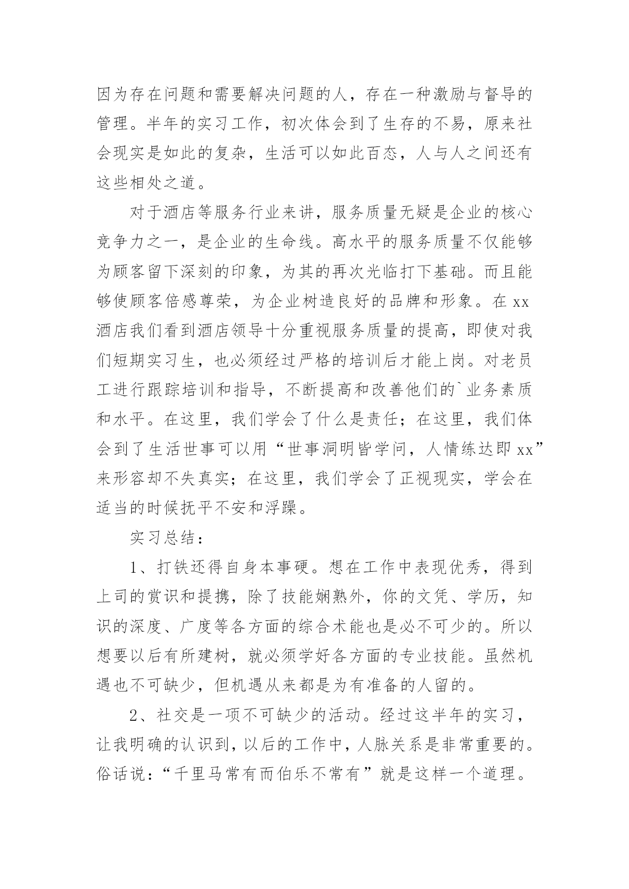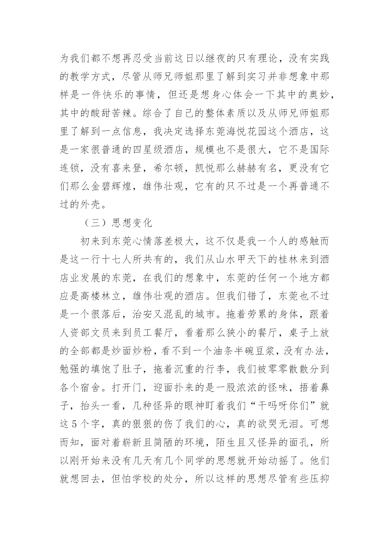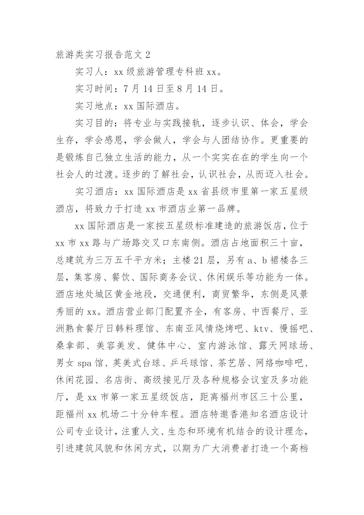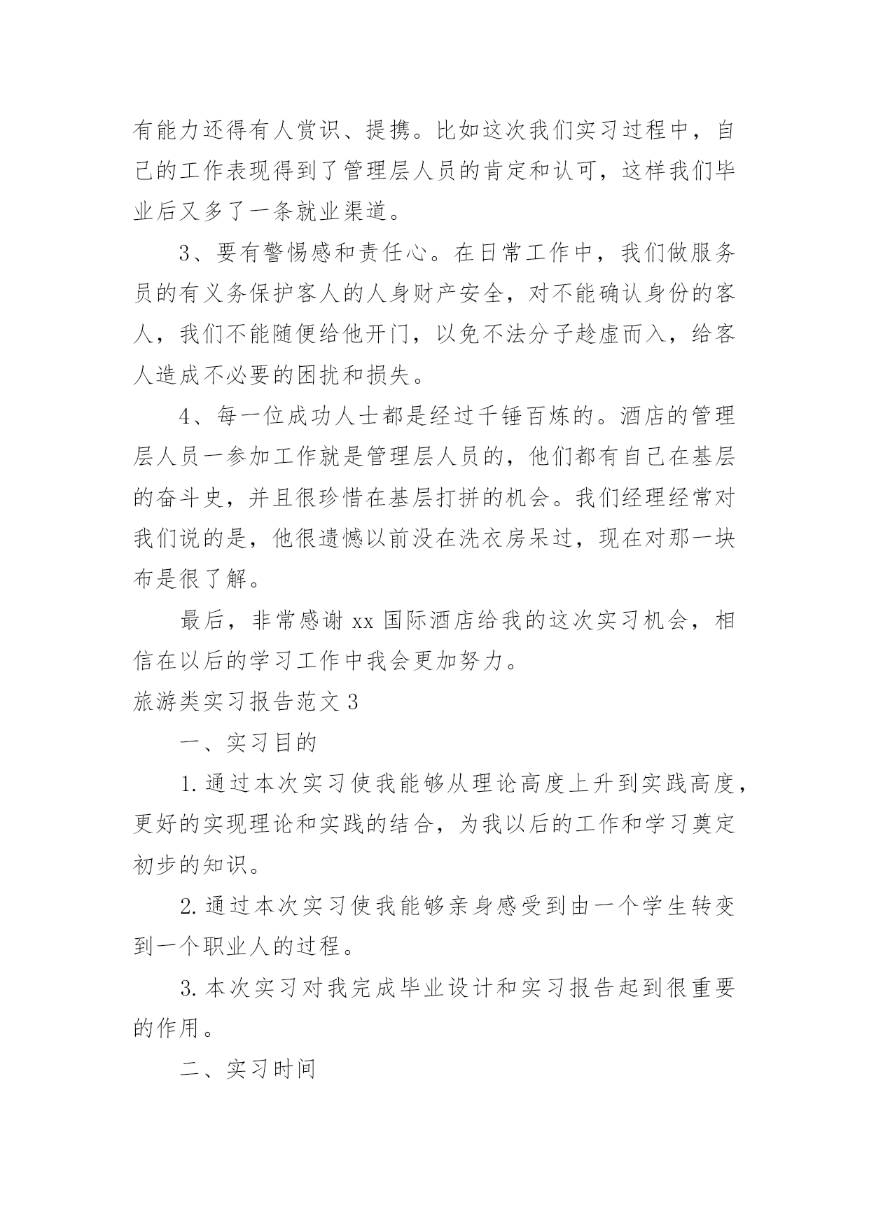 旅游类实习报告旅游类实习报告范文在现在社会,报告的用途越来越大,报告中提到的所有信息应该是准确无误的。一听到写报告就拖延症懒癌齐复发?以下是小编精心整理的旅游类实习报告范文,希望能够帮助到大家。旅游类实习报告范文1(一)酒店概况:海悦花园大酒店成立于5月20日,座落广东省东莞市,具有“家具之都”之称的厚街镇,位于厚街镇行政,商业,娱乐中心地带,紧邻107国道及广深高速公路,距东莞市区仅十分钟车程,距香港车程2小时,深圳约35分钟,广州1个小时,每天多班豪华穿梭巴士直达香港,水陆方面从福永码头或虎门码头至香港国际机场约1小时,交通十分便捷。酒店现拥有320间客房,酒店本着“以客为尊,以大为本“的经营理念,努力打造海悦特色的企业文化,并以此作为酒店生命之所在,该酒店的目标是成为东莞及至广东省最出色,最受欢迎的国际五星级商务精品酒店之一。(二)实习序言很早以前就从老师,师兄师姐那里听到我们将有半年的实习时间,而我们的实习时间被安排到大二下半学期,终于等到实习的时候了,可以说是急切盼望着这一天的到来,因为我们都不想再忍受当前这日以继夜的只有理论,没有实践的教学方式,尽管从师兄师姐那里了解到实习并非想象中那样是一件快乐的事情,但还是想身心体会一下其中的奥妙,其中的酸甜苦辣。综合了自己的整体素质以及从师兄师姐那里了解到一点信息,我决定选择东莞海悦花园这个酒店,这是一家很普通的四星级酒店,规模也不是很大,它不是国际连锁,没有喜来登,希尔顿,凯悦那么赫赫有名,更没有它们那么金碧辉煌,雄伟壮观,它有的只不过是一个再普通不过的外壳。(三)思想变化初来到东莞心情落差极大,这不仅是我一个人的感触而是这一行十七人所共有的,我们从山水甲天下的桂林来到酒店业发展的东莞,在我们的想象中,东莞的任何一个地方都应是高楼林立,雄伟壮观的酒店。但我们错了,东莞也不过是一个很落后,治安又混乱的城市。拖着劳累的身体,跟着人资部文员来到员工餐厅,看着那么狭小的餐厅,桌子上放的全部都是炒面炒粉,看不到一个油条半碗豆浆,没有办法,勉强的填饱了肚子,拖着沉重的行李,我们被零零散散分到各个宿舍。打开门,迎面扑来的是一股浓浓的怪味,捂着鼻子,抬头一看,几种怪异的眼神盯着我们“干吗呀你们”就这5个字,真的狠狠的伤了我们的心,真的欲哭无泪。可想而知,面对着崭新且简陋的环境,陌生且又怪异的面孔,所以刚开始来没有几天有几个同学的思想就开始动摇了。他们就想回去,但怕学校的处分,所以这样的思想尽管有些压抑但一旦爆发出来后果将不堪设想,那时学校将无法面对酒店。其实我的内心深处也有极度的失落感,在当时的那么多酒店来招实习生,我连面试的机会都放弃了,至今选择了这一家,本来是想到这个酒店业发展的城市来感受一下高效率、快节奏的生活方式,学习一下发达地方的经营理念,以便为今后的发展打下坚实的基础,万万没有想到会是这样的结局。虽然我的思想跟同学们一样动荡很大,但我不敢表露出来,因为我是个领队,如果我先爆发出来后果将不堪设想,我压抑着自己并暗暗的告诫一定要坚持下来做好模范带头作用,向学校和单位交一份满意的答卷。所幸在这里的一个星期内(包括培训中),这里的领导在开始的时候给我们极大的关怀和支持,对我们又是盛情款待百般呵护,不论在生活上还是感情都给予极大的投资,这种思想也暂时缓了一下,但根本无法从根本上消除这种极度失落的情绪也为以后事件的爆发埋下隐患。(四)分配部门一、部门分配好了,真是有人欢喜有人忧。我的烦恼又多了,有几个同学又在因为分配不到自己所想去的部门耍脾气,又哭又闹的`,逃跑的欲望越来越强烈了,我担心这种动荡的思想会一直存在着,担心它们的扩散会影响到整个团队,甚至会影响到学校的声誉。我努力的在与她们做好思想工作,人资部副理也在努力的给她们讲道理,最终目的还是希望大家不要给学校丢脸,不要给酒店带来麻烦,通过一连串的劝阻与开导,同学们终于平静下来了……二、“前厅部“一个多么让人羡慕,一个让人向往的部门,而我却很幸运又很无奈的分配到这个部门,面对着前厅经理的百般要求甚至可以说是请求,我没有办法,无奈的答应了去当门女,虽然我知道现在门女真的很缺,我也知道我们必须服从酒店的安排,我知道我是一个领队,不能带头起反抗作用,但是我还是觉得心理特别委屈,特别的难受,我好想好想哭泣一场,但我始终不敢掉眼泪,即使掉眼泪我想也没有人去同情我。因为在同学们的眼中,我也许是最幸运的,门女也是一个特别不错的岗位,当我想到这一些,我不想再说什么,我知道我的痛苦只要我知道心里面知道。当我一想到明天就要以一个大学生的身份去站在大堂里为无数个客人拉门,我就很难受,甚至很愚蠢的想到对不起我的父母,那时,我真想忘掉一切,抛弃一切,不顾一切的拖着行李回家算了,但一想到既然当初选择了这里就不该后悔,选择了酒店这个行业,就应该从基层做起,要以这些