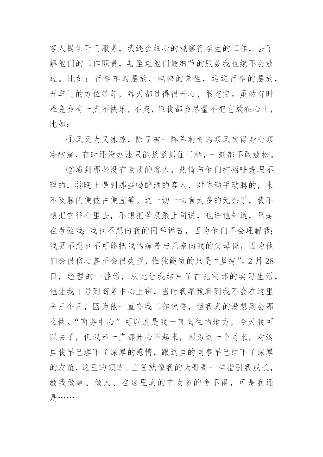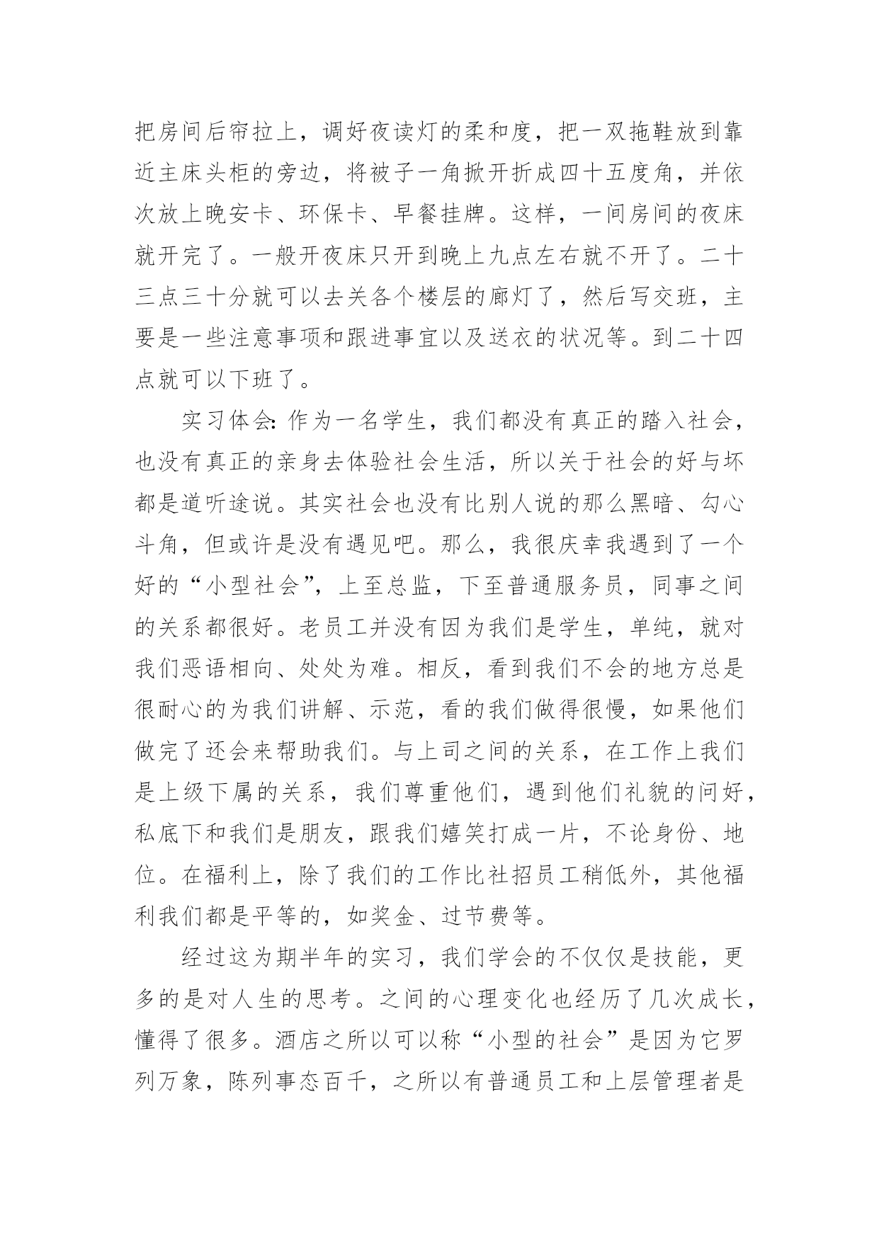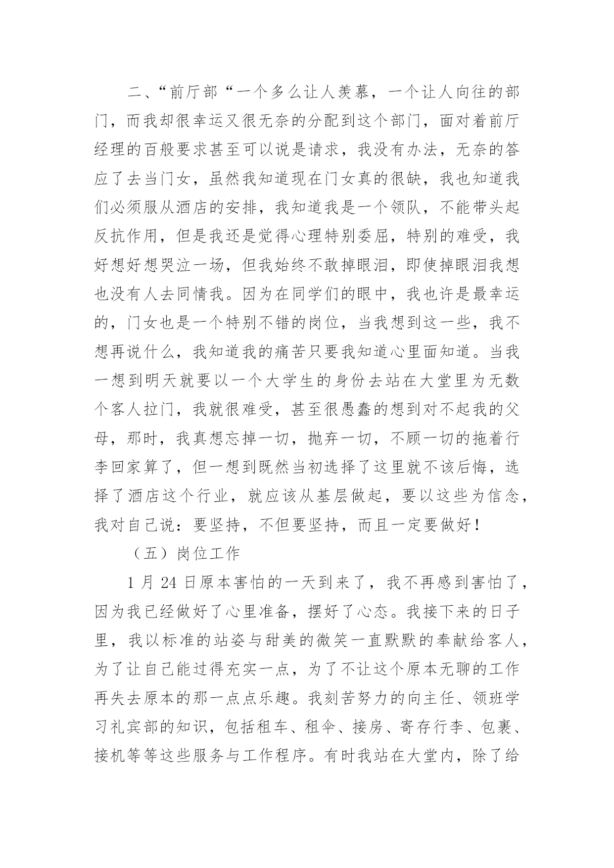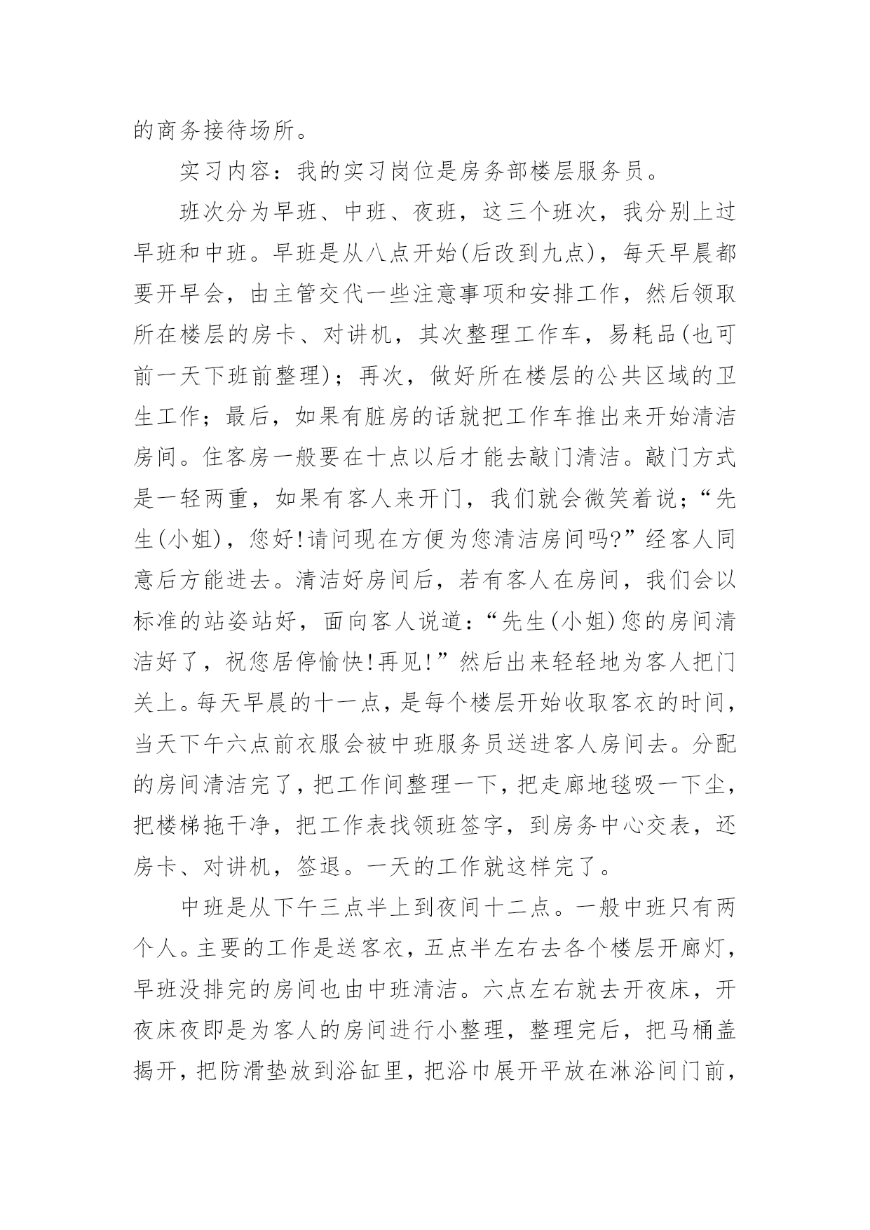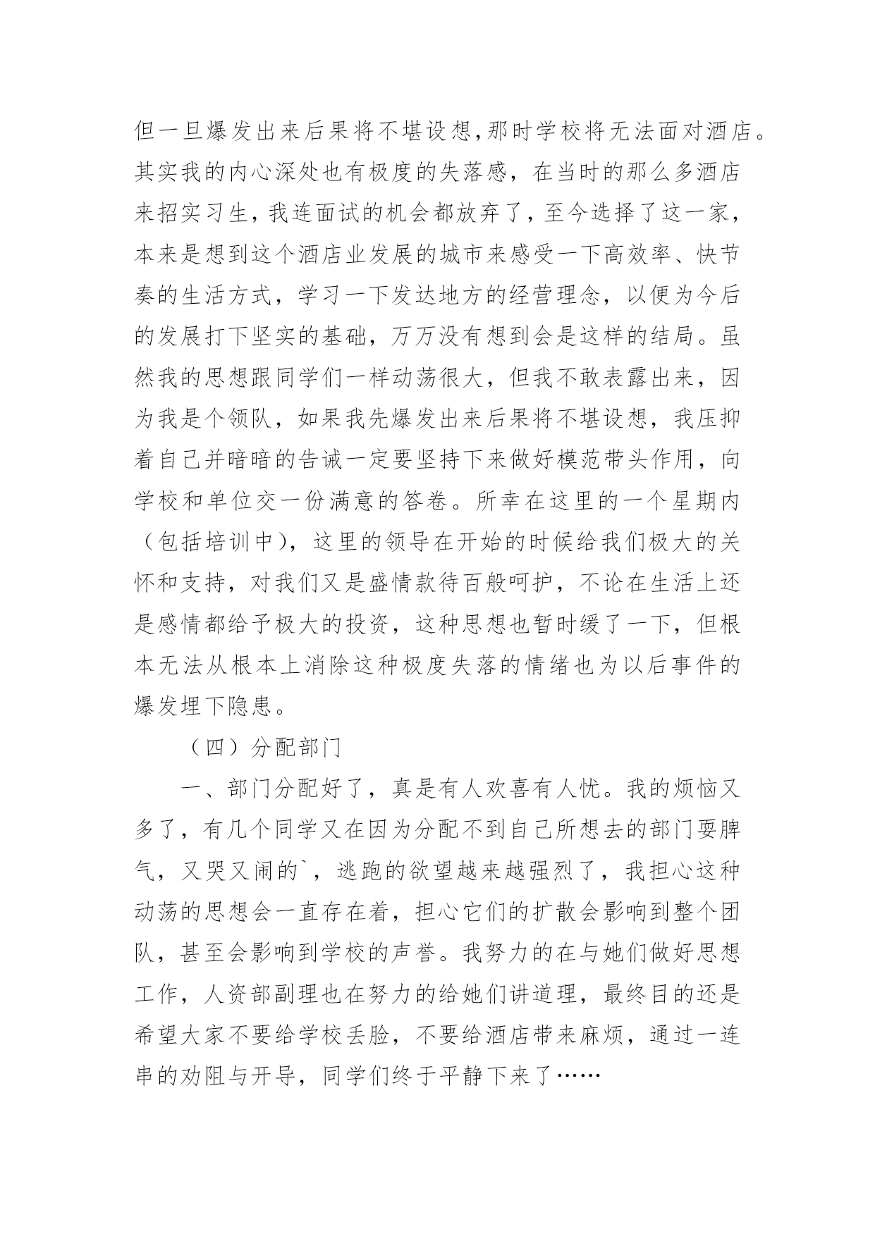 旅游类实习报告旅游类实习报告范文在现在社会,报告的用途越来越大,报告中提到的所有信息应该是准确无误的。一听到写报告就拖延症懒癌齐复发?以下是小编精心整理的旅游类实习报告范文,希望能够帮助到大家。旅游类实习报告范文1(一)酒店概况:海悦花园大酒店成立于5月20日,座落广东省东莞市,具有“家具之都”之称的厚街镇,位于厚街镇行政,商业,娱乐中心地带,紧邻107国道及广深高速公路,距东莞市区仅十分钟车程,距香港车程2小时,深圳约35分钟,广州1个小时,每天多班豪华穿梭巴士直达香港,水陆方面从福永码头或虎门码头至香港国际机场约1小时,交通十分便捷。酒店现拥有320间客房,酒店本着“以客为尊,以大为本“的经营理念,努力打造海悦特色的企业文化,并以此作为酒店生命之所在,该酒店的目标是成为东莞及至广东省最出色,最受欢迎的国际五星级商务精品酒店之一。(二)实习序言很早以前就从老师,师兄师姐那里听到我们将有半年的实习时间,而我们的实习时间被安排到大二下半学期,终于等到实习的时候了,可以说是急切盼望着这一天的到来,因为我们都不想再忍受当前这日以继夜的只有理论,没有实践的教学方式,尽管从师兄师姐那里了解到实习并非想象中那样是一件快乐的事情,但还是想身心体会一下其中的奥妙,其中的酸甜苦辣。综合了自己的整体素质以及从师兄师姐那里了解到一点信息,我决定选择东莞海悦花园这个酒店,这是一家很普通的四星级酒店,规模也不是很大,它不是国际连锁,没有喜来登,希尔顿,凯悦那么赫赫有名,更没有它们那么金碧辉煌,雄伟壮观,它有的只不过是一个再普通不过的外壳。(三)思想变化初来到东莞心情落差极大,这不仅是我一个人的感触而是这一行十七人所共有的,我们从山水甲天下的桂林来到酒店业发展的东莞,在我们的想象中,东莞的任何一个地方都应是高楼林立,雄伟壮观的酒店。但我们错了,东莞也不过是一个很落后,治安又混乱的城市。拖着劳累的身体,跟着人资部文员来到员工餐厅,看着那么狭小的餐厅,桌子上放的全部都是炒面炒粉,看不到一个油条半碗豆浆,没有办法,勉强的填饱了肚子,拖着沉重的行李,我们被零零散散分到各个宿舍。打开门,迎面扑来的是一股浓浓的怪味,捂着鼻子,抬头一看,几种怪异的眼神盯着我们“干吗呀你们”就这5个字,真的狠狠的伤了我们的心,真的欲哭无泪。可想而知,面对着崭新且简陋的环境,陌生且又怪异的面孔,所以刚开始来没有几天有几个同学的思想就开始动摇了。他们就想回去,但怕学校的处分,所以这样的思想尽管有些压抑但一旦爆发出来后果将不堪设想,那时学校将无法面对酒店。其实我的内心深处也有极度的失落感,在当时的那么多酒店来招实习生,我连面试的机会都放弃了,至今选择了这一家,本来是想到这个酒店业发展的城市来感受一下高效率、快节奏的生活方式,学习一下发达地方的经营理念,以便为今后的发展打下坚实的基础,万万没有想到会是这样的结局。虽然我的思想跟同学们一样动荡很大,但我不敢表露出来,因为我是个领队,如果我先爆发出来后果将不堪设想,我压抑着自己并暗暗的告诫一定要坚持下来做好模范带头作用,向学校和单位交一份满意的答卷。所幸在这里的一个星期内(包括培训中),这里的领导在开始的时候给我们极大的关怀和支持,对我们又是盛情款待百般呵护,不论在生活上还是感情都给予极大的投资,这种思想也暂时缓了一下,但根本无法从根本上消除这种极度失落的情绪也为以后事件的爆发埋下隐患。(四)分配部门一、部门分配好了,真是有人欢喜有人忧。我的烦恼又多了,有几个同学又在因为分配不到自己所想去的部门耍脾气,又哭又闹的`,逃跑的欲望越来越强烈了,我担心这种动荡的思想会一直存在着,担心它们的扩散会影响到整个团队,甚至会影响到学校的声誉。我努力的在与她们做好思想工作,人资部副理也在努力的给她们讲道理,最终目的还是希望大家不要给学校丢脸,不要给酒店带来麻烦,通过一连串的劝阻与开导,同学们终于平静下来了……二、“前厅部“一个多么让人羡慕,一个让人向往的部门,而我却很幸运又很无奈的分配到这个部门,面对着前厅经理的百般要求甚至可以说是请求,我没有办法,无奈的答应了去当门女,虽然我知道现在门女真的很缺,我也知道我们必须服从酒店的安排,我知道我是一个领队,不能带头起反抗作用,但是我还是觉得心理特别委屈,特别的难受,我好想好想哭泣一场,但我始终不敢掉眼泪,即使掉眼泪我想也没有人去同情我。因为在同学们的眼中,我也许是最幸运的,门女也是一个特别不错的岗位,当我想到这一些,我不想再说什么,我知道我的痛苦只要我知道心里面知道。当我一想到明天就要以一个大学生的身份去站在大堂里为无数个客人拉门,我就很难受,甚至很愚蠢的想到对不起我的父母,那时,我真想忘掉一切,抛弃一切,不顾一切的拖着行李回家算了,但一想到既然当初选择了这里就不该后悔,选择了酒店这个行业,就应该从基层做起,要以这些