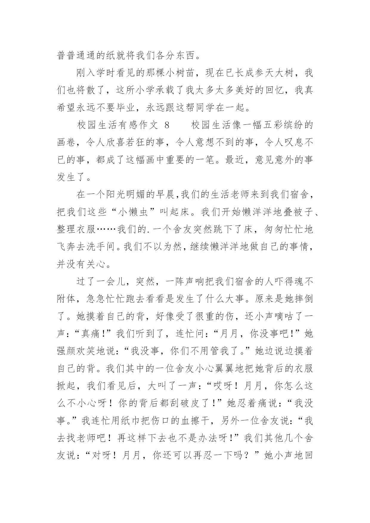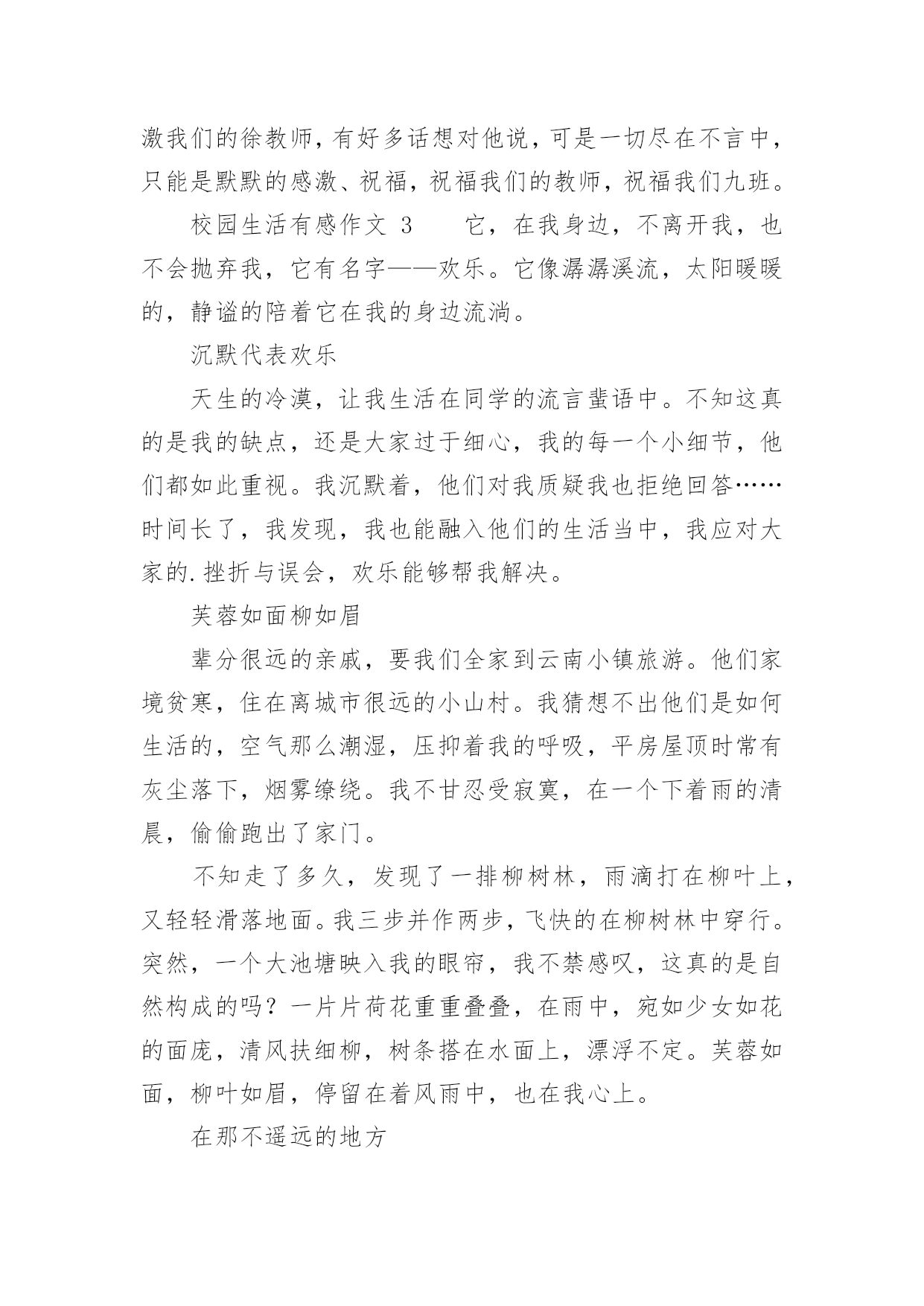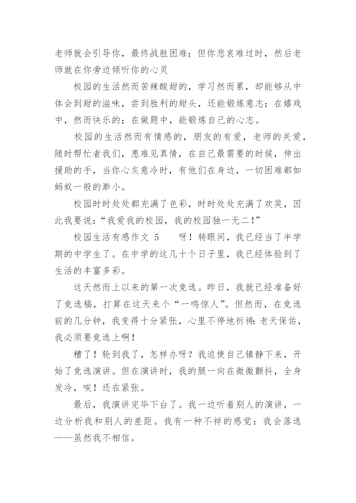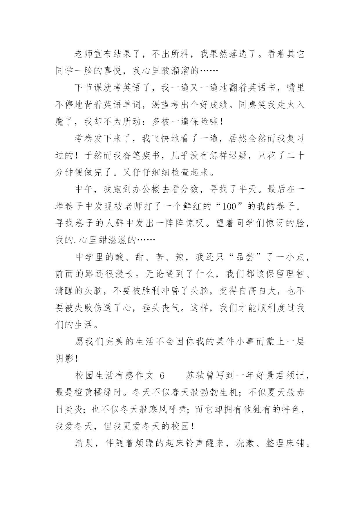 校园生活有感作文校园生活有感作文(通用38篇)在平平淡淡的日常中,大家对作文都再熟悉不过了吧,写作文可以锻炼我们的独处习惯,让自己的心静下来,思考自己未来的方向。还是对作文一筹莫展吗?以下是小编收集整理的校园生活有感作文,欢迎大家借鉴与参考,希望对大家有所帮助。校园生活有感作文1就这样,经历小升初,再经历了中考,我们步入了高中的校园,开始了我们崭新的生活。中考之后,我的心情一直是坎坷不安的。听别人说,高中的生活忙碌不已,你必须抓紧每一分每一秒来学习;听别人说,高中学习的竞争是非常激烈的,你一定要有一个良好的心理状态才行;还有人说,高考是你人生中的第一个转折点,一个特别重要的转折点,你一定要好好把握高中的学习!听到这一切,我的心里充满了怀疑和不安。直到我真正走进了高中的校园,才真正地体会到:有些事情还是需要自己来体验的。高中的学习是忙碌的:新增了几门课程,各个学科的难度提高了很多,需要自己自主的学习、积极地探索。但当这一切的事情有了老师的.帮助,情况就会好了许多。高中的学学习竞争的确是非常激烈的,但同学之间不仅仅是竞争对手,更是在一起学习、玩耍的伙伴,我们互帮互助,共同进步。高考是我们人生中的一个重要的转折点,需要看重,但也正因为如此,我们就要用一个正确的眼光来看待它,不要单纯的把它看成一个负担,它应当是激励我们奋进的目标,梦想实现的方式。我们的校园生活是充实的,是忙碌的,但是也是快乐的。人生只有一次,高中的校园生活也只有一次,好好珍惜,不要错过!校园生活有感作文2到了挥手说再见的时候,转眼间,三年的初中生活也快画上一个句号。想起以往与同学教师们相处的那些时光,是那么的不舍,与同学的嘻嘻哈哈打打闹闹已成为我人生中的一道美丽的风景。在各种活动中都获得了不错的成绩,比如在参加运动会、拔河比赛、文艺活动……这都离不开九班每个人的共同努力。特别是那次拔河比赛,我也亲身参加过,当我看到同学们都鼓足干劲,用尽力量拉绳子时,我才真正的感觉到九班是一个多么强大团结的班团体。努力的九班虽然我们班上的成绩在全年级不是最好,可是同学们也都努力过,相信努力总是会有收获的'!只要一进我们教室,就会被那一排齐刷刷金灿灿的奖状给吓一跳,可别小看我们哟,这可是我们的努力换来的。可爱的九班一个班团体总会有一些“不听话”的人,可是正因为有了他们,我们的学习才不会过于枯燥,也给大家都带来了欢乐,有时也显得蛮可爱的。这就是我的“一家”,一个团结,努力,可爱的大家庭。就快中考了,真期望同学们都能考出好成绩。我真的是很感激我们的徐教师,有好多话想对他说,可是一切尽在不言中,只能是默默的感激、祝福,祝福我们的教师,祝福我们九班。校园生活有感作文3它,在我身边,不离开我,也不会抛弃我,它有名字——欢乐。它像潺潺溪流,太阳暖暖的,静谧的陪着它在我的身边流淌。沉默代表欢乐天生的冷漠,让我生活在同学的流言蜚语中。不知这真的是我的缺点,还是大家过于细心,我的每一个小细节,他们都如此重视。我沉默着,他们对我质疑我也拒绝回答……时间长了,我发现,我也能融入他们的生活当中,我应对大家的.挫折与误会,欢乐能够帮我解决。芙蓉如面柳如眉辈分很远的亲戚,要我们全家到云南小镇旅游。他们家境贫寒,住在离城市很远的小山村。我猜想不出他们是如何生活的,空气那么潮湿,压抑着我的呼吸,平房屋顶时常有灰尘落下,烟雾缭绕。我不甘忍受寂寞,在一个下着雨的清晨,偷偷跑出了家门。不知走了多久,发现了一排柳树林,雨滴打在柳叶上,又轻轻滑落地面。我三步并作两步,飞快的在柳树林中穿行。突然,一个大池塘映入我的眼帘,我不禁感叹,这真的是自然构成的吗?一片片荷花重重叠叠,在雨中,宛如少女如花的面庞,清风扶细柳,树条搭在水面上,漂浮不定。芙蓉如面,柳叶如眉,停留在着风雨中,也在我心上。在那不遥远的地方“哪里会有小桥流水……在那不遥远的地方……瞄准属于你的土壤,放开手去追逐期望,心中的某个地方……”欢乐带给我期望,伴随我成长,我追随着他的脚步,抵达心中那美丽的地方。欢乐这条小溪,依旧在我身边哗啦哗啦的流淌,而我依偎在溪旁的树下,欢乐成长……校园生活有感作文4五中的校园,充满快乐的笑声,读书的热情,和一股积极向上的信念,我就然而这校园中的一份子。早晨,刚进入校园的学生,他们的生活开始充满斗志;午时,他们学习热情的火光,在无限的燃烧着;傍晚,他们学业结束了,看到了一天中胜利的光芒。校园的生活然而充实的,上课铃响,学生都将饱满的学习热情释放出来,迎接新的挑战。下课铃响,同学们在操场间活动,如那新生的鸟儿,仿佛他就然而下一个刘翔,姚明。有些同学还在温习这堂课所学的知识,仿佛他就然而下一个爱因斯坦与爱丁顿。校园内的学生的每一天的生活都充满了乐趣和斗志,让外来人都认为那里的学生都不愿服输,不愿比任何人差。校园的生活然而精彩的,那婀娜的'舞姿