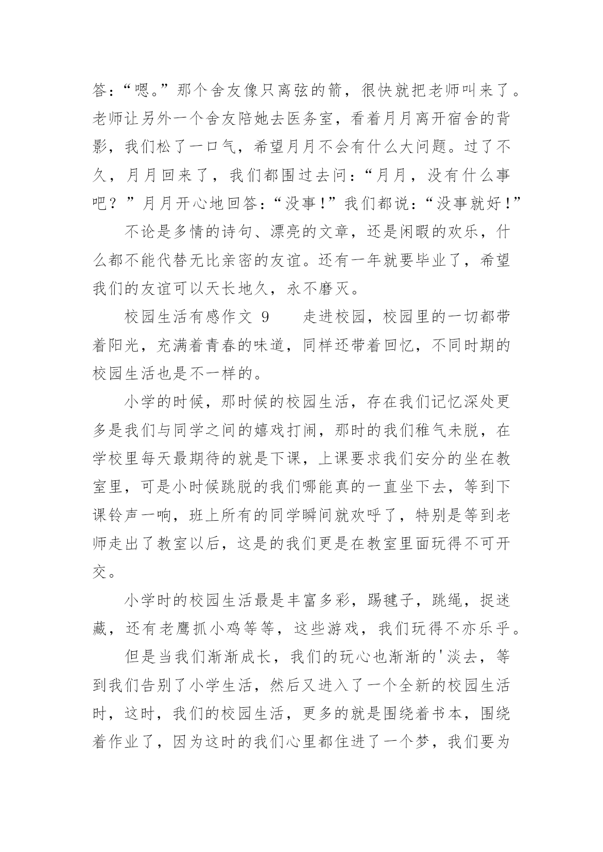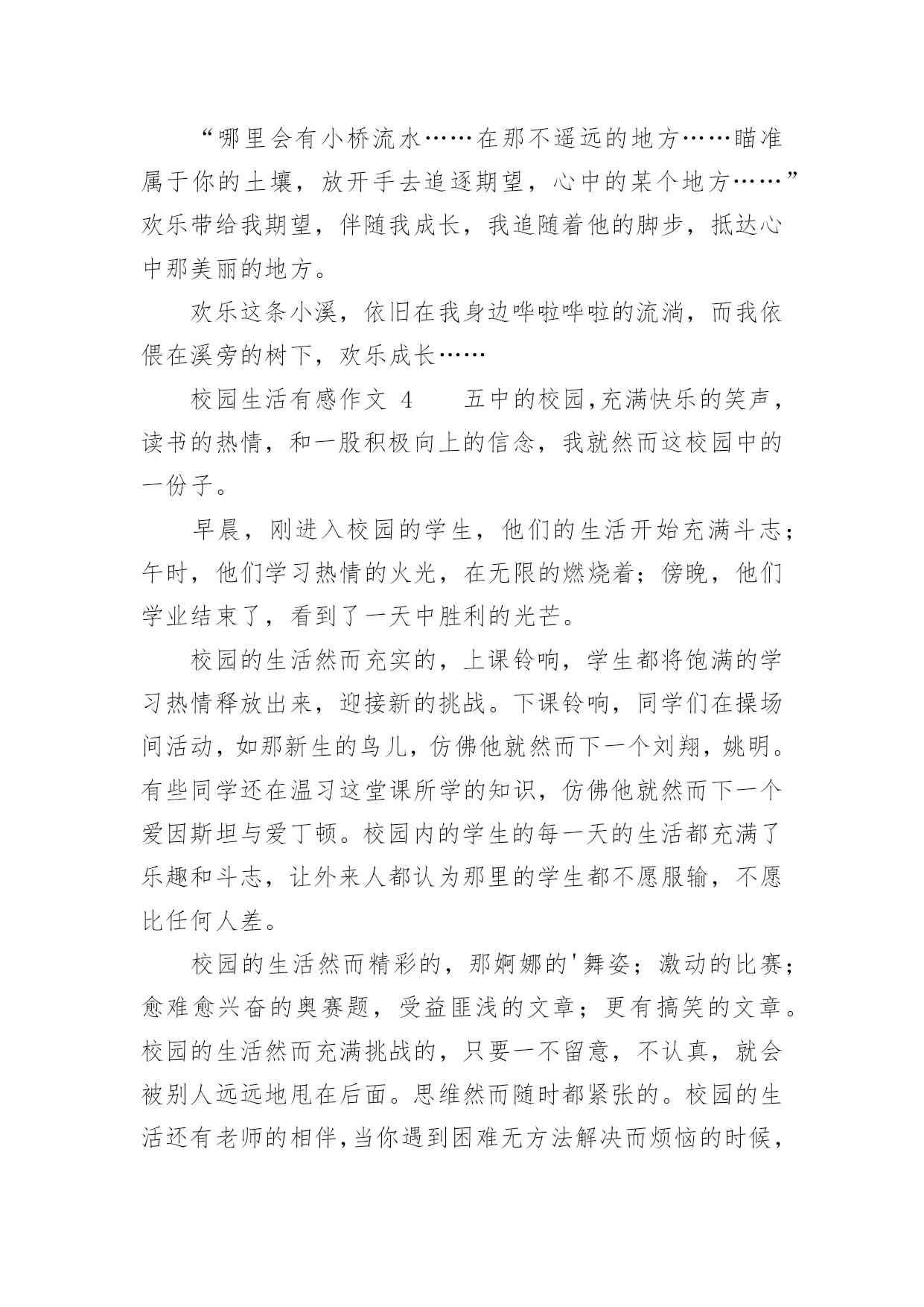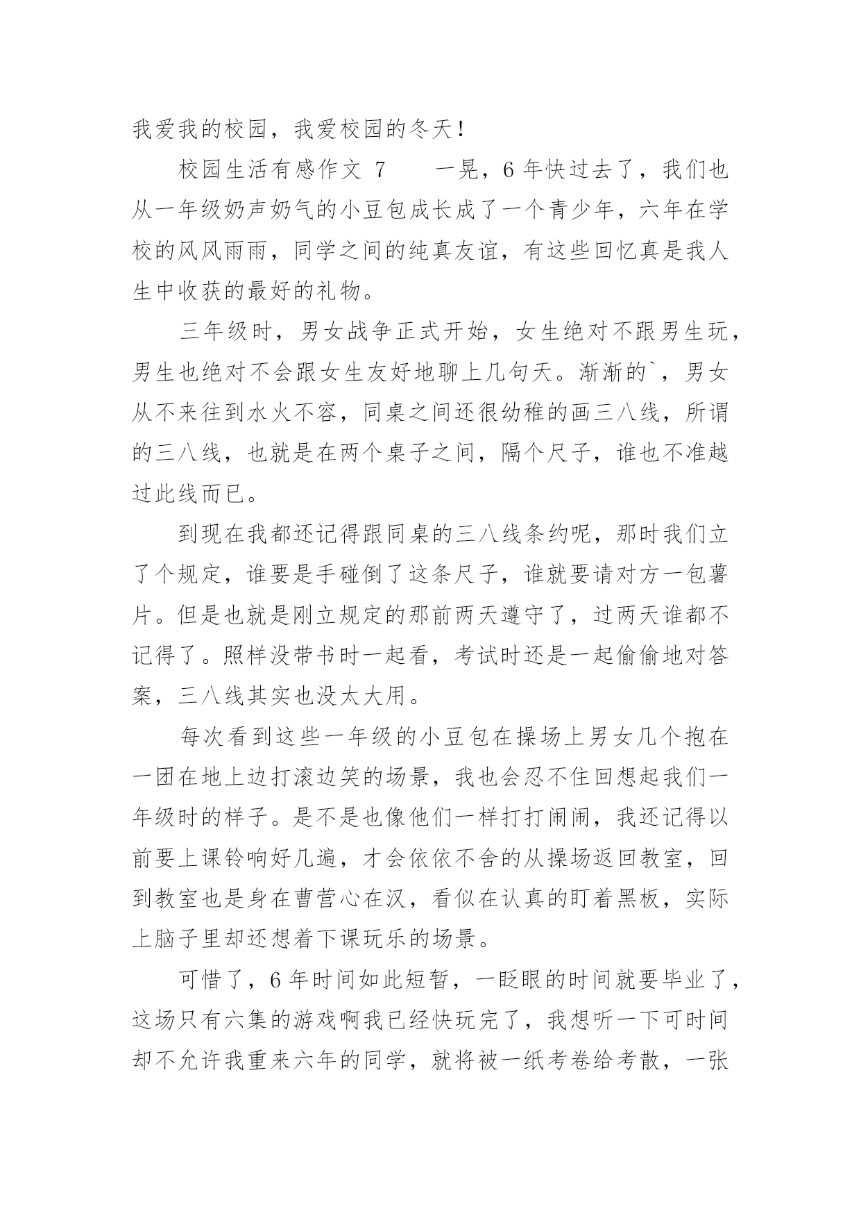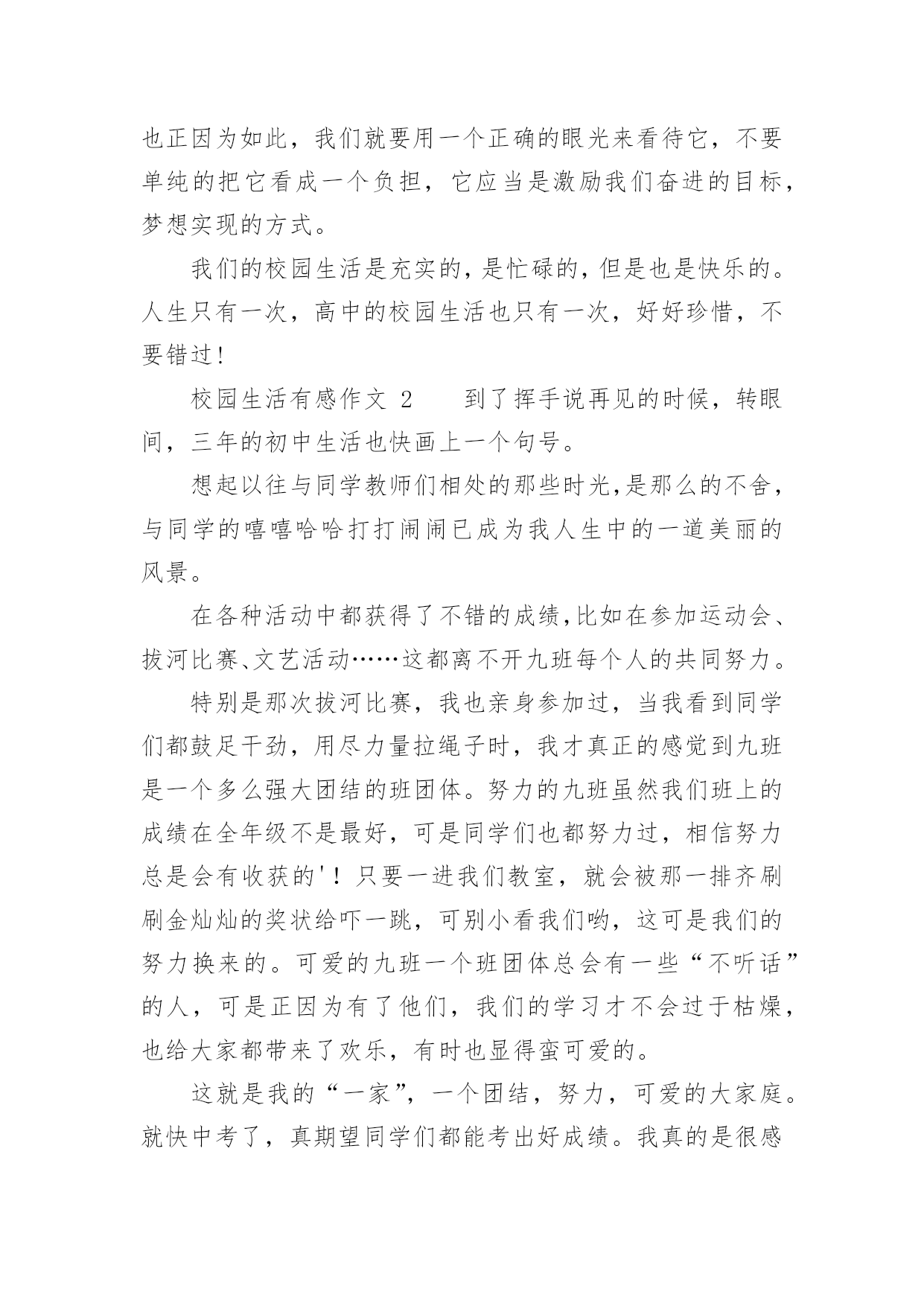 校园生活有感作文校园生活有感作文(通用38篇)在平平淡淡的日常中,大家对作文都再熟悉不过了吧,写作文可以锻炼我们的独处习惯,让自己的心静下来,思考自己未来的方向。还是对作文一筹莫展吗?以下是小编收集整理的校园生活有感作文,欢迎大家借鉴与参考,希望对大家有所帮助。校园生活有感作文1就这样,经历小升初,再经历了中考,我们步入了高中的校园,开始了我们崭新的生活。中考之后,我的心情一直是坎坷不安的。听别人说,高中的生活忙碌不已,你必须抓紧每一分每一秒来学习;听别人说,高中学习的竞争是非常激烈的,你一定要有一个良好的心理状态才行;还有人说,高考是你人生中的第一个转折点,一个特别重要的转折点,你一定要好好把握高中的学习!听到这一切,我的心里充满了怀疑和不安。直到我真正走进了高中的校园,才真正地体会到:有些事情还是需要自己来体验的。高中的学习是忙碌的:新增了几门课程,各个学科的难度提高了很多,需要自己自主的学习、积极地探索。但当这一切的事情有了老师的.帮助,情况就会好了许多。高中的学学习竞争的确是非常激烈的,但同学之间不仅仅是竞争对手,更是在一起学习、玩耍的伙伴,我们互帮互助,共同进步。高考是我们人生中的一个重要的转折点,需要看重,但也正因为如此,我们就要用一个正确的眼光来看待它,不要单纯的把它看成一个负担,它应当是激励我们奋进的目标,梦想实现的方式。我们的校园生活是充实的,是忙碌的,但是也是快乐的。人生只有一次,高中的校园生活也只有一次,好好珍惜,不要错过!校园生活有感作文2到了挥手说再见的时候,转眼间,三年的初中生活也快画上一个句号。想起以往与同学教师们相处的那些时光,是那么的不舍,与同学的嘻嘻哈哈打打闹闹已成为我人生中的一道美丽的风景。在各种活动中都获得了不错的成绩,比如在参加运动会、拔河比赛、文艺活动……这都离不开九班每个人的共同努力。特别是那次拔河比赛,我也亲身参加过,当我看到同学们都鼓足干劲,用尽力量拉绳子时,我才真正的感觉到九班是一个多么强大团结的班团体。努力的九班虽然我们班上的成绩在全年级不是最好,可是同学们也都努力过,相信努力总是会有收获的'!只要一进我们教室,就会被那一排齐刷刷金灿灿的奖状给吓一跳,可别小看我们哟,这可是我们的努力换来的。可爱的九班一个班团体总会有一些“不听话”的人,可是正因为有了他们,我们的学习才不会过于枯燥,也给大家都带来了欢乐,有时也显得蛮可爱的。这就是我的“一家”,一个团结,努力,可爱的大家庭。就快中考了,真期望同学们都能考出好成绩。我真的是很感激我们的徐教师,有好多话想对他说,可是一切尽在不言中,只能是默默的感激、祝福,祝福我们的教师,祝福我们九班。校园生活有感作文3它,在我身边,不离开我,也不会抛弃我,它有名字——欢乐。它像潺潺溪流,太阳暖暖的,静谧的陪着它在我的身边流淌。沉默代表欢乐天生的冷漠,让我生活在同学的流言蜚语中。不知这真的是我的缺点,还是大家过于细心,我的每一个小细节,他们都如此重视。我沉默着,他们对我质疑我也拒绝回答……时间长了,我发现,我也能融入他们的生活当中,我应对大家的.挫折与误会,欢乐能够帮我解决。芙蓉如面柳如眉辈分很远的亲戚,要我们全家到云南小镇旅游。他们家境贫寒,住在离城市很远的小山村。我猜想不出他们是如何生活的,空气那么潮湿,压抑着我的呼吸,平房屋顶时常有灰尘落下,烟雾缭绕。我不甘忍受寂寞,在一个下着雨的清晨,偷偷跑出了家门。不知走了多久,发现了一排柳树林,雨滴打在柳叶上,又轻轻滑落地面。我三步并作两步,飞快的在柳树林中穿行。突然,一个大池塘映入我的眼帘,我不禁感叹,这真的是自然构成的吗?一片片荷花重重叠叠,在雨中,宛如少女如花的面庞,清风扶细柳,树条搭在水面上,漂浮不定。芙蓉如面,柳叶如眉,停留在着风雨中,也在我心上。在那不遥远的地方“哪里会有小桥流水……在那不遥远的地方……瞄准属于你的土壤,放开手去追逐期望,心中的某个地方……”欢乐带给我期望,伴随我成长,我追随着他的脚步,抵达心中那美丽的地方。欢乐这条小溪,依旧在我身边哗啦哗啦的流淌,而我依偎在溪旁的树下,欢乐成长……校园生活有感作文4五中的校园,充满快乐的笑声,读书的热情,和一股积极向上的信念,我就然而这校园中的一份子。早晨,刚进入校园的学生,他们的生活开始充满斗志;午时,他们学习热情的火光,在无限的燃烧着;傍晚,他们学业结束了,看到了一天中胜利的光芒。校园的生活然而充实的,上课铃响,学生都将饱满的学习热情释放出来,迎接新的挑战。下课铃响,同学们在操场间活动,如那新生的鸟儿,仿佛他就然而下一个刘翔,姚明。有些同学还在温习这堂课所学的知识,仿佛他就然而下一个爱因斯坦与爱丁顿。校园内的学生的每一天的生活都充满了乐趣和斗志,让外来人都认为那里的学生都不愿服输,不愿比任何人差。校园的生活然而精彩的,那婀娜的'舞姿