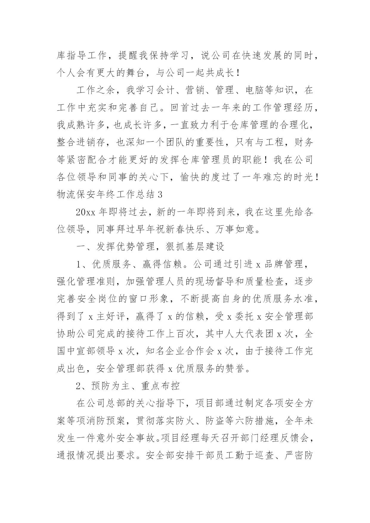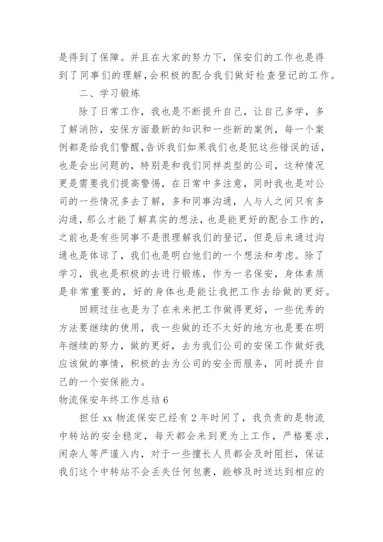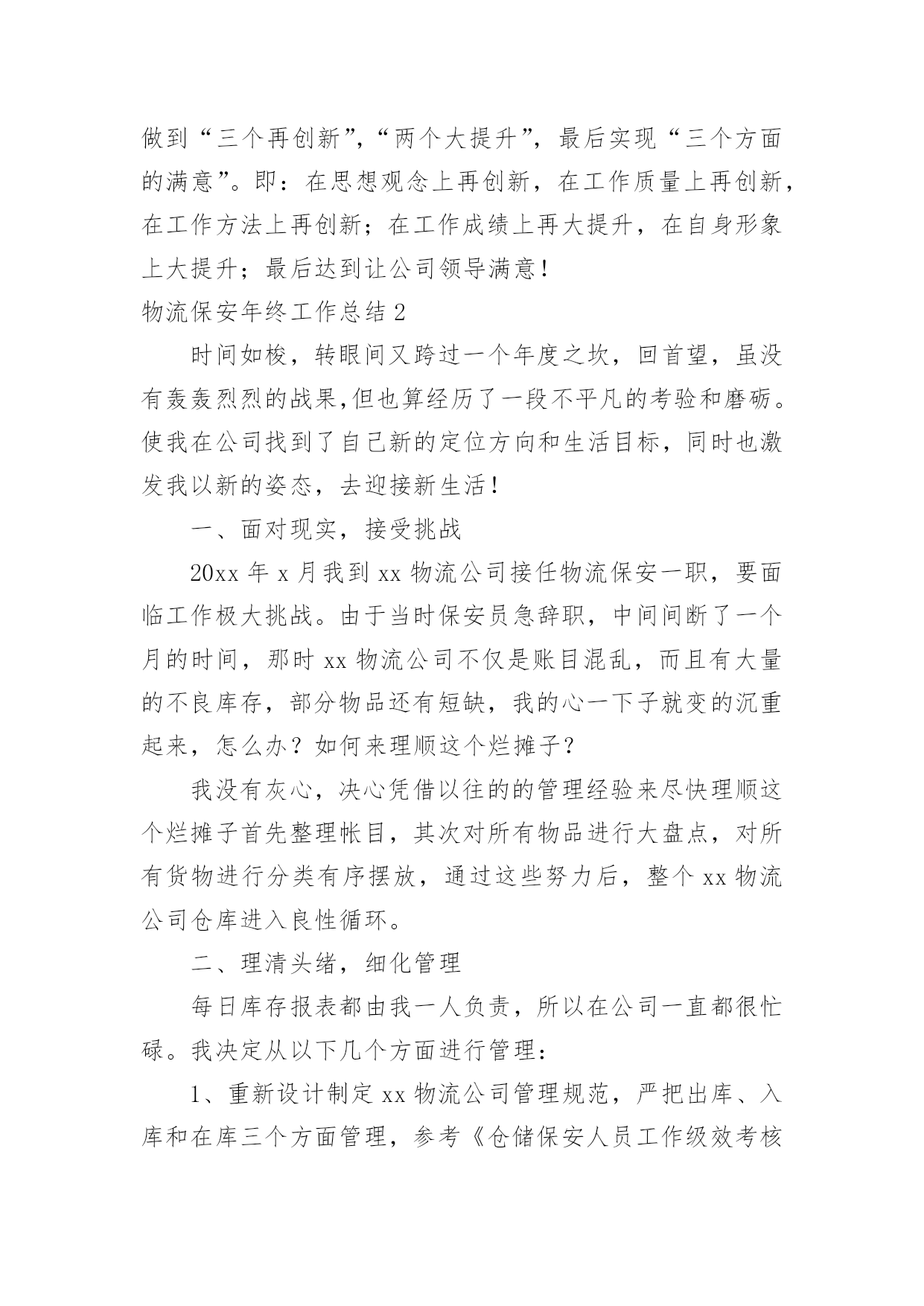 物流保安年终工作总结物流保安年终工作总结总结是对某一特定时间段内的学习和工作生活等表现情况加以回顾和分析的一种书面材料,它可以给我们下一阶段的学习和工作生活做指导,因此十分有必须要写一份总结哦。总结一般是怎么写的呢?以下是小编帮大家整理的物流保安年终工作总结,仅供参考,欢迎大家阅读。物流保安年终工作总结1光阴似箭,日月如梭,转眼间20xx年已经过去,在领导的带领下,我学到了不少知识和社会经验,让我在工作中基本上能独立完成各项工作,首先感谢领导对我的指导和栽培,在以后的工作中我会刻苦学习、不畏困难,以更好的工作来回报上级。20xx年在领导的带领下,围绕xx的总体目标,认真贯彻“安全第一、预防为主”和“内紧外松”的工作方针,始终坚持“群防群治”和“人防技防相结合”的工作路线,积极做好xx的消防安全防范工作,维护商xx的治安秩序,工作总结:一、工作的职责疏导后院进出货物的车辆,保持后院消防通道的畅通等,登记工作:登记外来人员进入x施工的检查;巡视工作:白天巡视x内有无可疑人员;消防通道是否畅通;消防设施是否被占用等;晚上巡视施工区域是否有消防器材,施工证件,施工安全隐患是否存在等等。二、消防知识x月份消防局举行了关于消防安全知识宣传教育四个能力演讲活动,我们去听了别的x的演讲深受感动,在此之前我们还是“三个能力”“三懂、三会”从那以后实行贯彻消防局的意见,从“三个能力”“三懂、三会”发展到“四个能力,四懂,四会”让我们又学到了好多,紧接着每天的出操、消防演习,从中又学了好多知识和问题,在一次消防局的领导来检查我们的工作,我们在__消防演习了,演习分两组:一组是组织灭火另一组是组织疏散逃生,消防局的领导看了之后很赞同认可!三、存在的不足和今后的努力方向回顾20xx年来的工作,在取得成绩的同时,我们也清楚地看到自身存在的差距和不足。突出表现在:1、由于队员来自四面八方,综合素质参差不齐。2、我们的工作方法还有待进一步的创新和改进。3、工作上还存在一些不如人意的地方。所有这些,我们将在今后的工作中痛下决心,加以克服和改进,全力以赴把今后的工作做得更好、更出色。今后的工作要求将会更高,难度将会更大,这就对我们的工作提出了新的更高的要求。我们一定正视现实,承认困难,但不畏困难。我们将迎难而上,做好工作。具体讲,要做到“三个再创新”,“两个大提升”,最后实现“三个方面的满意”。即:在思想观念上再创新,在工作质量上再创新,在工作方法上再创新;在工作成绩上再大提升,在自身形象上大提升;最后达到让公司领导满意!物流保安年终工作总结2时间如梭,转眼间又跨过一个年度之坎,回首望,虽没有轰轰烈烈的战果,但也算经历了一段不平凡的考验和磨砺。使我在公司找到了自己新的定位方向和生活目标,同时也激发我以新的姿态,去迎接新生活!一、面对现实,接受挑战20xx年x月我到xx物流公司接任物流保安一职,要面临工作极大挑战。由于当时保安员急辞职,中间间断了一个月的时间,那时xx物流公司不仅是账目混乱,而且有大量的不良库存,部分物品还有短缺,我的心一下子就变的沉重起来,怎么办?如何来理顺这个烂摊子?我没有灰心,决心凭借以往的的管理经验来尽快理顺这个烂摊子首先整理帐目,其次对所有物品进行大盘点,对所有货物进行分类有序摆放,通过这些努力后,整个xx物流公司仓库进入良性循环。二、理清头绪,细化管理每日库存报表都由我一人负责,所以在公司一直都很忙碌。我决定从以下几个方面进行管理:1、重新设计制定xx物流公司管理规范,严把出库、入库和在库三个方面管理,参考《仓储保安人员工作级效考核表》进行量化管理,每天抽盘,每周小盘点,每月配合财务大盘点,作到账目清晰,账实相符。经手货款无一差错,体现了一名财务人员的严谨和细致,近段时间来,账实相符基本达到100%,实现无库损!2、与公司同事紧密配合,做到库存的结构合理。紧盯各物品流动,认认真真做好每月的月报表,且每月准时向财务部发库存月报表,并结合自身岗位,先后做出《进销存明细帐》、固定资产表格、物品物资表格、物资申购汇总表格等,有力的配合了财务!3、对在库物品进行分类管理,对工程类、办公类、清洁类、固定资产类等主要品项实施重点管理,在做申购汇总表时减小在库物品的再申购,努力降低其库存量,对小品项等实行简单控制,改方案实施做到了重点与一般的结合,降低了库存,加速了库存周转率。三、进行信息化随着公司业务的连年增长,工程部需求物资够大,日发货收货量也进一步扩大,在xx物流公司领导的重视下,实现了对仓库的实时管理。我每天只要把出入库情况及库存报表输入电脑,可以准时看到库存明细。该举措大大方便公司领导和员工的查询,加强与各部门之间的信息交流,整个20xx年不良库存下降基本至零。四、坚持学习,与公司共成长在仓库的这段期间我更加明白了公司领导给我讲的仓库管理
