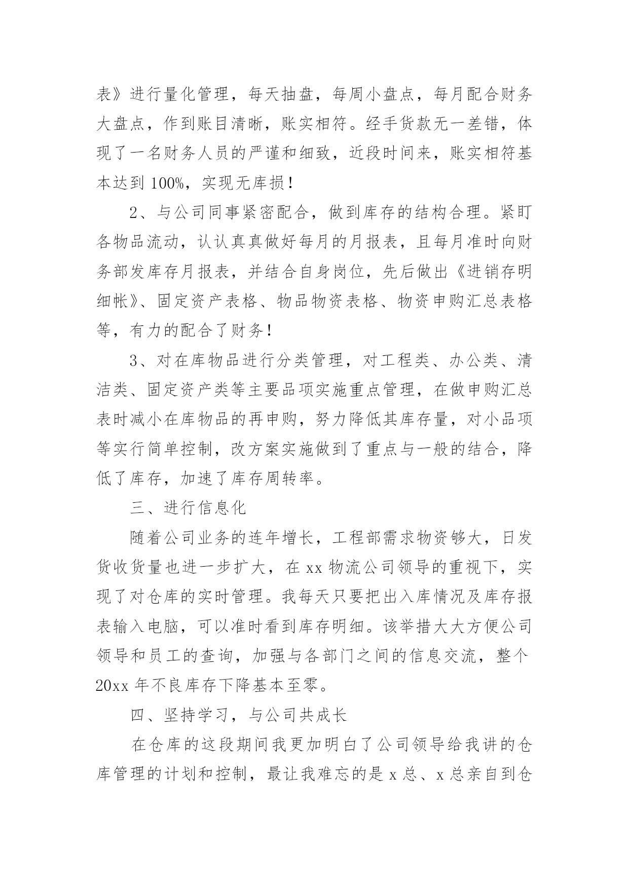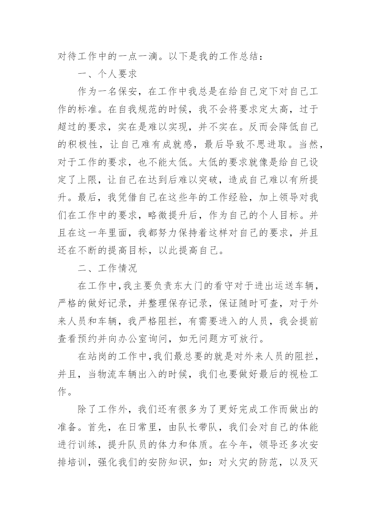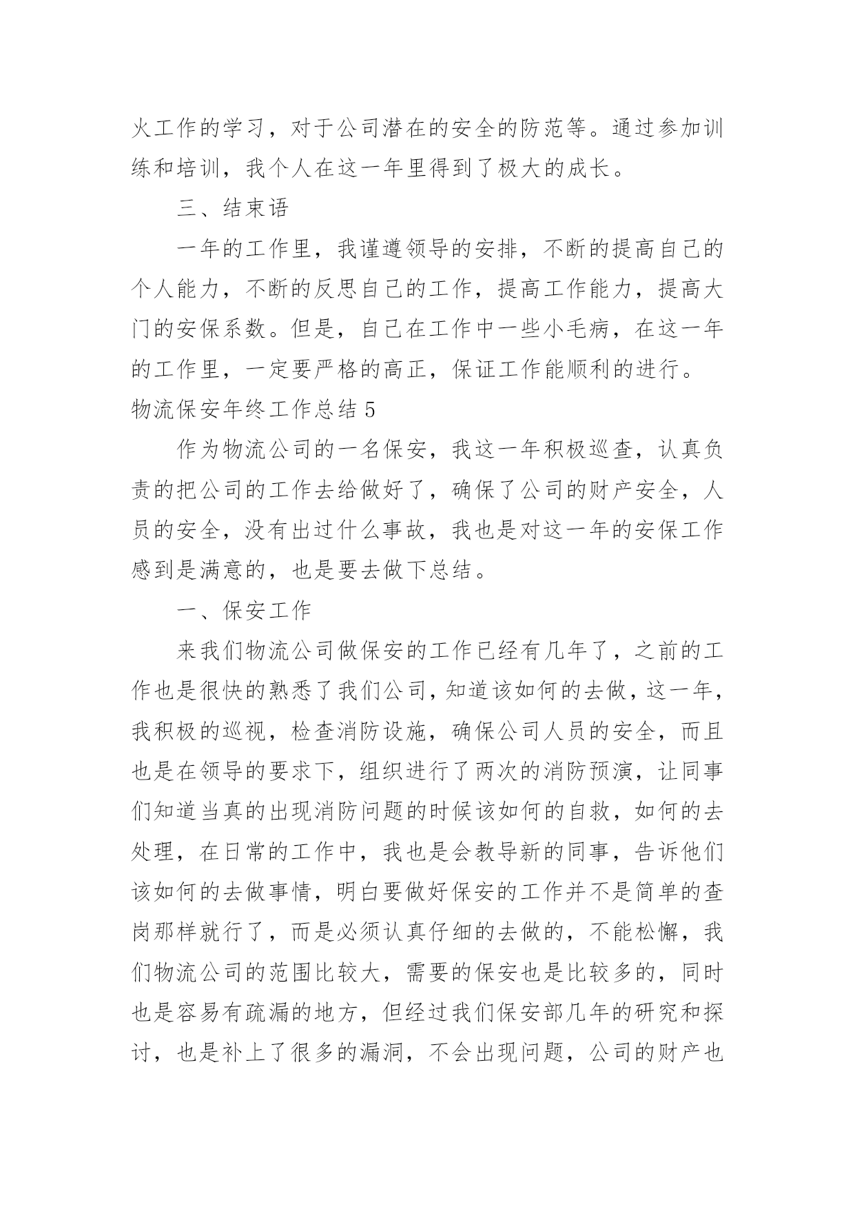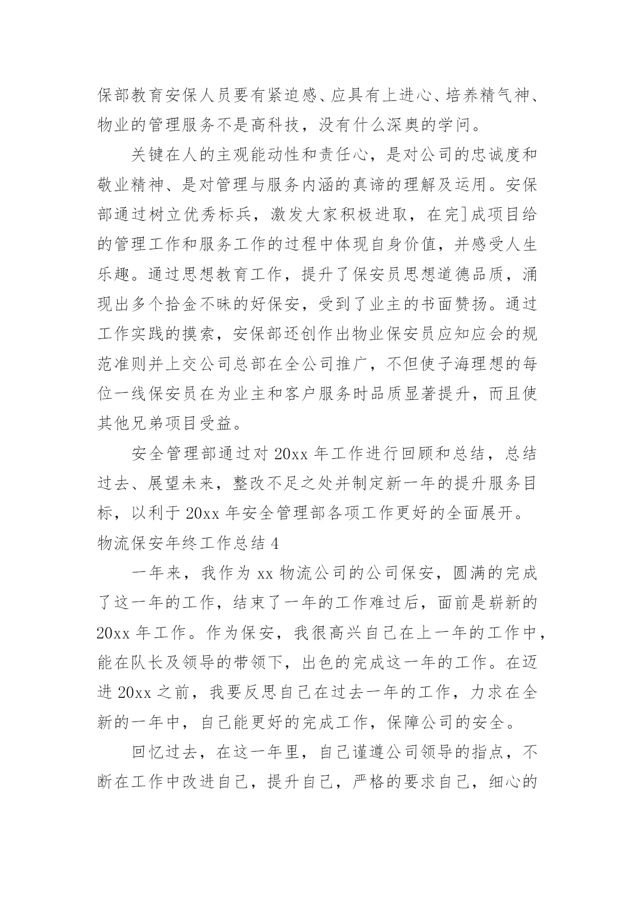 物流保安年终工作总结物流保安年终工作总结总结是对某一特定时间段内的学习和工作生活等表现情况加以回顾和分析的一种书面材料,它可以给我们下一阶段的学习和工作生活做指导,因此十分有必须要写一份总结哦。总结一般是怎么写的呢?以下是小编帮大家整理的物流保安年终工作总结,仅供参考,欢迎大家阅读。物流保安年终工作总结1光阴似箭,日月如梭,转眼间20xx年已经过去,在领导的带领下,我学到了不少知识和社会经验,让我在工作中基本上能独立完成各项工作,首先感谢领导对我的指导和栽培,在以后的工作中我会刻苦学习、不畏困难,以更好的工作来回报上级。20xx年在领导的带领下,围绕xx的总体目标,认真贯彻“安全第一、预防为主”和“内紧外松”的工作方针,始终坚持“群防群治”和“人防技防相结合”的工作路线,积极做好xx的消防安全防范工作,维护商xx的治安秩序,工作总结:一、工作的职责疏导后院进出货物的车辆,保持后院消防通道的畅通等,登记工作:登记外来人员进入x施工的检查;巡视工作:白天巡视x内有无可疑人员;消防通道是否畅通;消防设施是否被占用等;晚上巡视施工区域是否有消防器材,施工证件,施工安全隐患是否存在等等。二、消防知识x月份消防局举行了关于消防安全知识宣传教育四个能力演讲活动,我们去听了别的x的演讲深受感动,在此之前我们还是“三个能力”“三懂、三会”从那以后实行贯彻消防局的意见,从“三个能力”“三懂、三会”发展到“四个能力,四懂,四会”让我们又学到了好多,紧接着每天的出操、消防演习,从中又学了好多知识和问题,在一次消防局的领导来检查我们的工作,我们在__消防演习了,演习分两组:一组是组织灭火另一组是组织疏散逃生,消防局的领导看了之后很赞同认可!三、存在的不足和今后的努力方向回顾20xx年来的工作,在取得成绩的同时,我们也清楚地看到自身存在的差距和不足。突出表现在:1、由于队员来自四面八方,综合素质参差不齐。2、我们的工作方法还有待进一步的创新和改进。3、工作上还存在一些不如人意的地方。所有这些,我们将在今后的工作中痛下决心,加以克服和改进,全力以赴把今后的工作做得更好、更出色。今后的工作要求将会更高,难度将会更大,这就对我们的工作提出了新的更高的要求。我们一定正视现实,承认困难,但不畏困难。我们将迎难而上,做好工作。具体讲,要做到“三个再创新”,“两个大提升”,最后实现“三个方面的满意”。即:在思想观念上再创新,在工作质量上再创新,在工作方法上再创新;在工作成绩上再大提升,在自身形象上大提升;最后达到让公司领导满意!物流保安年终工作总结2时间如梭,转眼间又跨过一个年度之坎,回首望,虽没有轰轰烈烈的战果,但也算经历了一段不平凡的考验和磨砺。使我在公司找到了自己新的定位方向和生活目标,同时也激发我以新的姿态,去迎接新生活!一、面对现实,接受挑战20xx年x月我到xx物流公司接任物流保安一职,要面临工作极大挑战。由于当时保安员急辞职,中间间断了一个月的时间,那时xx物流公司不仅是账目混乱,而且有大量的不良库存,部分物品还有短缺,我的心一下子就变的沉重起来,怎么办?如何来理顺这个烂摊子?我没有灰心,决心凭借以往的的管理经验来尽快理顺这个烂摊子首先整理帐目,其次对所有物品进行大盘点,对所有货物进行分类有序摆放,通过这些努力后,整个xx物流公司仓库进入良性循环。二、理清头绪,细化管理每日库存报表都由我一人负责,所以在公司一直都很忙碌。我决定从以下几个方面进行管理:1、重新设计制定xx物流公司管理规范,严把出库、入库和在库三个方面管理,参考《仓储保安人员工作级效考核表》进行量化管理,每天抽盘,每周小盘点,每月配合财务大盘点,作到账目清晰,账实相符。经手货款无一差错,体现了一名财务人员的严谨和细致,近段时间来,账实相符基本达到100%,实现无库损!2、与公司同事紧密配合,做到库存的结构合理。紧盯各物品流动,认认真真做好每月的月报表,且每月准时向财务部发库存月报表,并结合自身岗位,先后做出《进销存明细帐》、固定资产表格、物品物资表格、物资申购汇总表格等,有力的配合了财务!3、对在库物品进行分类管理,对工程类、办公类、清洁类、固定资产类等主要品项实施重点管理,在做申购汇总表时减小在库物品的再申购,努力降低其库存量,对小品项等实行简单控制,改方案实施做到了重点与一般的结合,降低了库存,加速了库存周转率。三、进行信息化随着公司业务的连年增长,工程部需求物资够大,日发货收货量也进一步扩大,在xx物流公司领导的重视下,实现了对仓库的实时管理。我每天只要把出入库情况及库存报表输入电脑,可以准时看到库存明细。该举措大大方便公司领导和员工的查询,加强与各部门之间的信息交流,整个20xx年不良库存下降基本至零。四、坚持学习,与公司共成长在仓库的这段期间我更加明白了公司领导给我讲的仓库管理