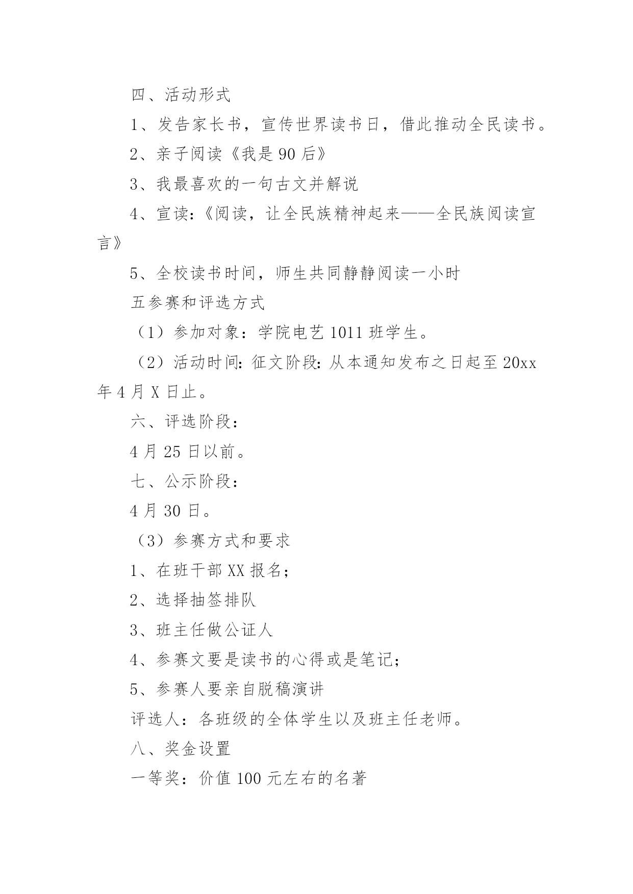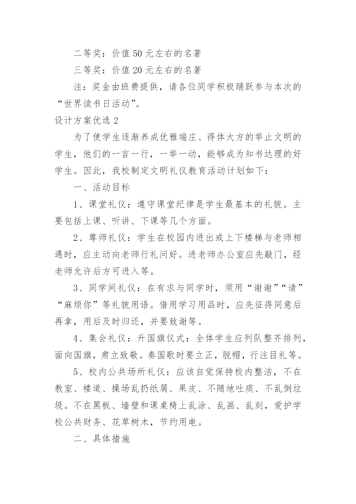 设计方案优选设计方案优选为了确保事情或工作有效开展,常常需要预先制定方案,方案的内容多是上级对下级或涉及面比较大的工作,一般都用带“文件头”形式下发。那要怎么制定科学的方案呢?以下是小编整理的设计方案优选,希望对大家有所帮助。设计方案优选1一、活动主旨4月23日是世界文学的象征日,塞万提斯、莎士比亚、维加等许多著名的作家都在这一天出生或逝世。联合国教科文组织于1995年将每年的这一天定为“世界读书日”,鼓励人们发现读书的乐趣。几年来,“世界读书日”已成为许多国家读者的一个节日。4月23日正值我校"唱读讲传"活动期间。为此,我们借助世界读书日的东风,再次推动我校师生读书新高潮。通过“4.23”世界读书日系列活动,弘扬尊重知识、崇尚文明的阅读理念,培养读者良好的.阅读习惯,营造文明的学习氛围。二、活动主题“我读书,我快乐”三、活动时间:4月23日上午四、活动形式1、发告家长书,宣传世界读书日,借此推动全民读书。2、亲子阅读《我是90后》3、我最喜欢的一句古文并解说4、宣读:《阅读,让全民族精神起来——全民族阅读宣言》5、全校读书时间,师生共同静静阅读一小时五参赛和评选方式(1)参加对象:学院电艺1011班学生。(2)活动时间:征文阶段:从本通知发布之日起至20xx年4月X日止。六、评选阶段:4月25日以前。七、公示阶段:4月30日。(3)参赛方式和要求1、在班干部XX报名;2、选择抽签排队3、班主任做公证人4、参赛文要是读书的心得或是笔记;5、参赛人要亲自脱稿演讲评选人:各班级的全体学生以及班主任老师。八、奖金设置一等奖:价值100元左右的名著二等奖:价值50元左右的名著三等奖:价值20元左右的名著注:奖金由班费提供,请各位同学积极踊跃参与本次的“世界读书日活动”。设计方案优选2为了使学生逐渐养成优雅端庄、得体大方的举止文明的学生,他们的一言一行,一举一动,能够成为知书达理的好学生。因此,我校制定文明礼仪教育活动计划如下:一、活动目标1、课堂礼仪:遵守课堂纪律是学生最基本的礼貌。主要包括上课、听讲、下课等几个方面。2、尊师礼仪:学生在校园内进出或上下楼梯与老师相遇时,应主动向老师行礼问好。进老师办公室应先敲门,经老师允许后方可进入等。3、同学间礼仪:在有求与同学时,须用“谢谢”“请”“麻烦你”等礼貌用语。借用学习用品时,应先征得同意后再拿,用后及时归还,并要致谢等。4、集会礼仪:升国旗仪式:全体学生应列队整齐排列,面向国旗,肃立致敬。奏国歌时要立正,脱帽,行注目礼等。5、校内公共场所礼仪:应该自觉保持校内整洁,不在教室、楼道、操场乱扔纸屑、果皮、不随地吐痰、不乱倒垃圾。不在黑板、墙壁和课桌椅上乱涂、乱画、乱刻,爱护学校公共财务、花草树木,节约用电。二、具体措施1、创设文明礼仪良好环境氛围。根据每月工作重点布置文明礼仪行队礼。2、寓规范训练于学生日常生活管理之中。在常规教育工作中,坚持把培养学生文明礼仪行为习惯和为标准放在首要位置,关注学生的学习生活、以平时仪表、言语为切入点,通过强化训练,把《文明礼仪行为规范》文明礼仪教育落实到学生的日常学习和生活中去,养成习惯,从而提高。每周一班会上一节文明礼仪课。3、寓规范训练于各领域教学之中在教学活动中,老师要有目的、有计划地利用教材切合实际地把《规范》细则渗透到教学中去。使学生在开无意识的'学习中强化记忆,受到教育。4、开展文明礼仪教育主题活动根据每月主题每周有计划地组织一节专门的文明礼仪活动,丰富教育教学形式,使学生在丰富多彩的活动中,可以全身心地投入,通过比一比、看一看、议一议、想一想、做一做,使学生的文明礼仪行为在不知不觉中趋于规范化。5、与家庭教育、社会教育结合。通过家长会和平时与家长的交流,要家长了解学生文明礼仪教育的重要性,以身作则,并积极配合教师,培养学生的文明礼仪行为规范。