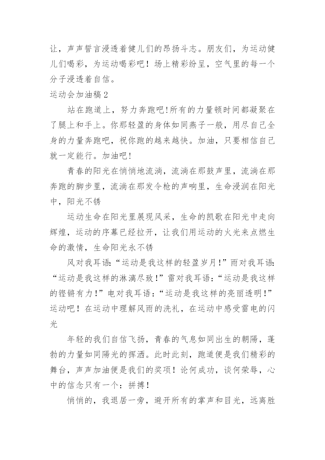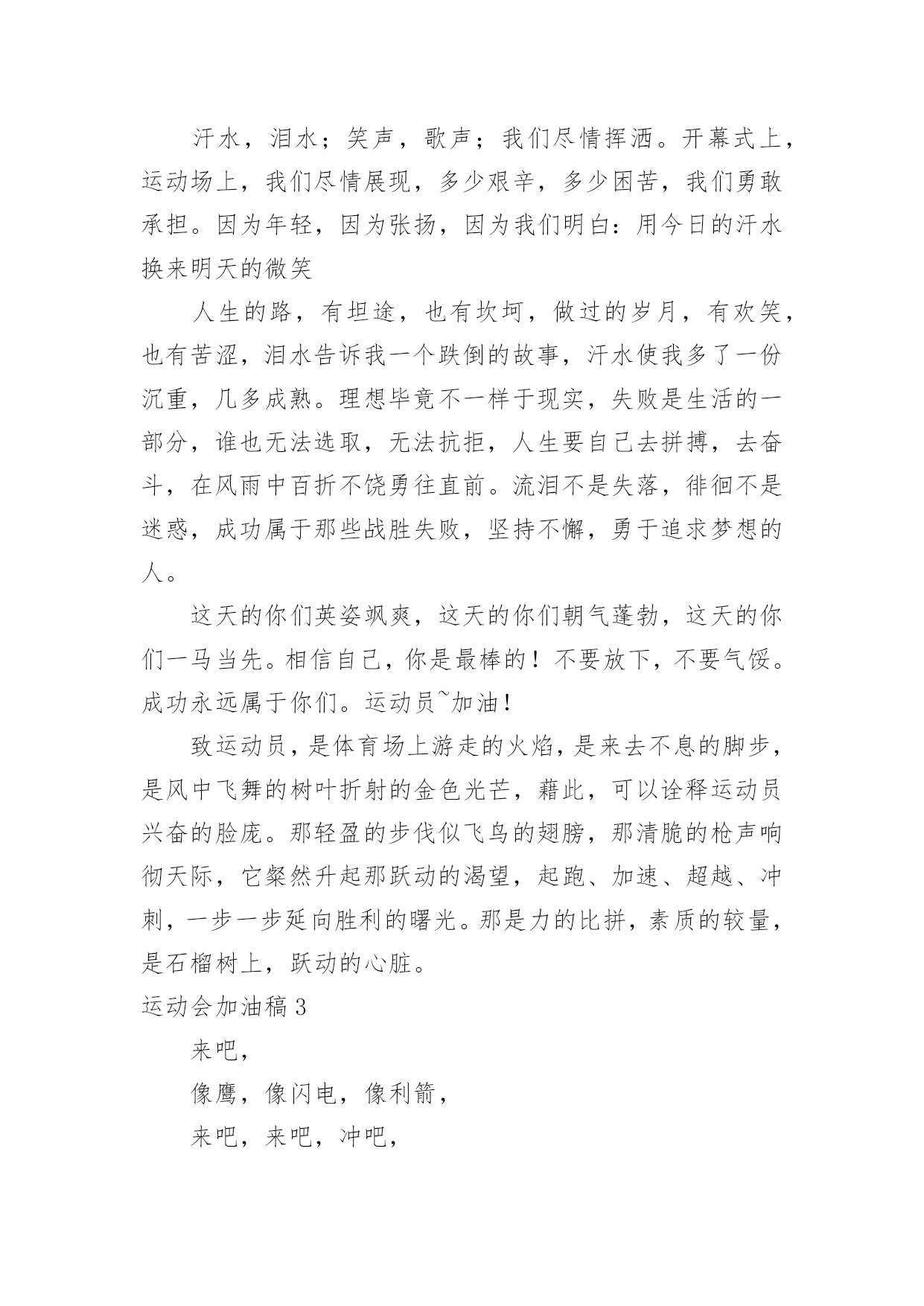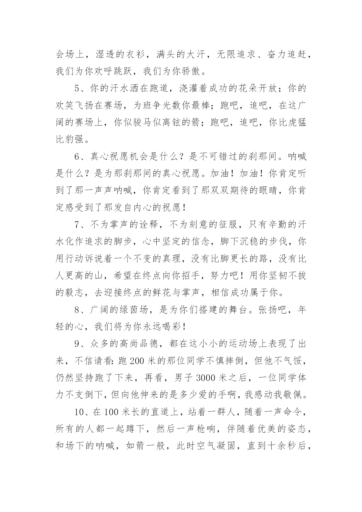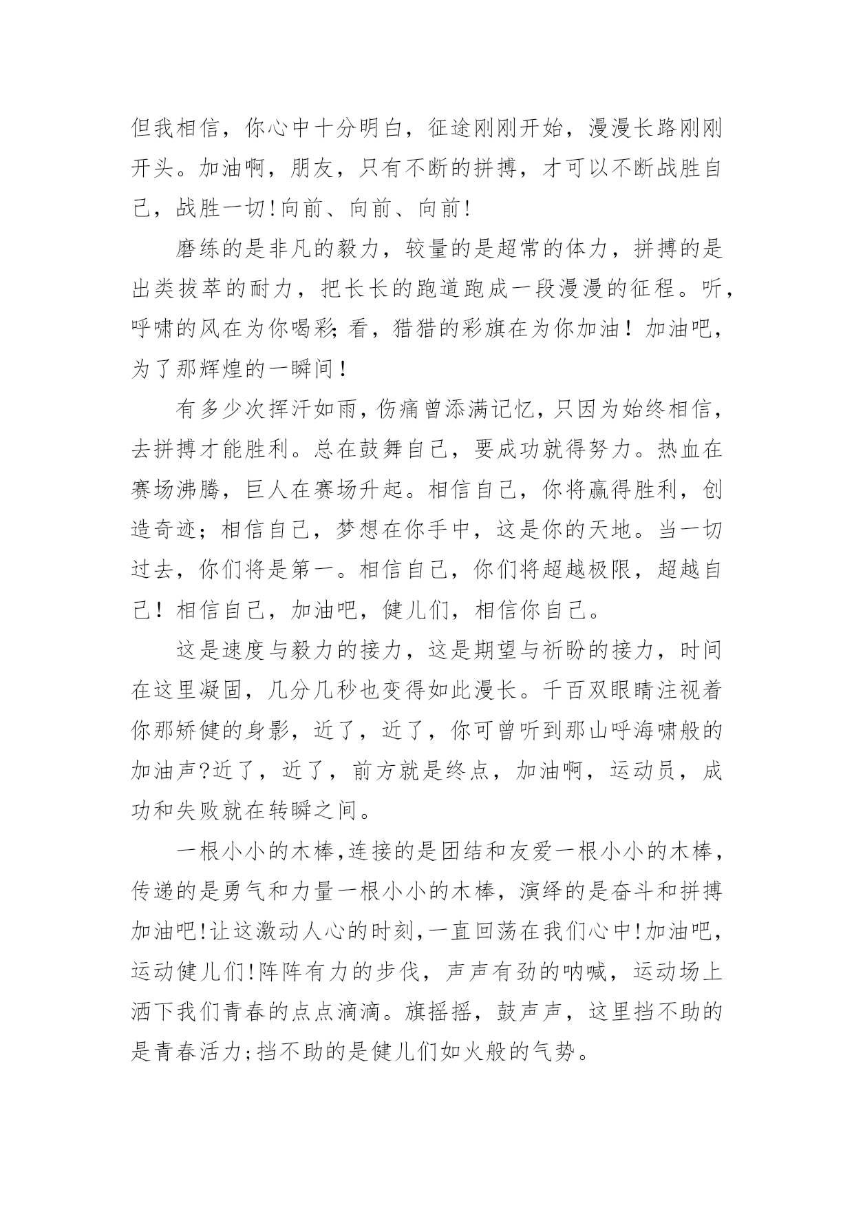 运动会加油稿运动会加油稿(精选)在现在的社会生活中,很多地方都会使用到加油稿,借助加油稿可以点燃对方的激情,激发对方的斗志。写加油稿的注意事项有许多,你确定会写吗?以下是小编精心整理的运动会加油稿,供大家参考借鉴,希望可以帮助到有需要的朋友。运动会加油稿11、每一份辛劳都有一份收获,每一次的痛苦都是快乐的开始,没一声呐喊都是力量的呼唤。我们有着大浪拍岸的豪迈,所以你不必在乎小荷初露的恬静,我们有着春日的阳光明媚,所以不用去羡慕冬日乱玉碎琼,我们是雨天的一把伞,是寒冷冬日里的一盆碳火,温暖的不只是你我,而是大家的心。运动场上的健儿,掌声属于你们,鲜花属于你们,成功也是属于你们!2、不为掌声的诠释,不为刻意的征服,只有辛勤的汗水化作追求的脚步,心中坚定的信念,脚下你的汗水洒在跑道,浇灌着成功的花朵开放。你的欢笑飞扬在赛场,为班争光数你最棒。跑吧,追吧在这广阔的赛场上,你似骏马似离弦的箭。跑吧,追吧你比虎猛比豹强。3、去做就这么简单,只要我们努力,我们一定会有所收获。云水悠悠,风雨悠悠,艰难困境伴随左右。但我们并不要管,去做,就这么简单,不管它的后果会是什么。天地悠悠,岁月悠悠,我们的运动健儿们,只要你们去做,我们永远支持你们。努力!4、广阔的绿茵场,是为你们搭建的舞台。张扬吧,年轻的心,我们将为你永远喝彩!泰戈尔在诗中说,天空没有翅膀的影子,但我已飞过;艾青对朋友说,也许有人到达不了彼岸,但我们共同拥有大海。也许你们没有显赫的成绩,但运动场上留下了你们的足迹。也许你们没有奖品,但我们心中留下了你们拼搏的身影。所有的努力都是为了迎接这一刹那,所有的拼搏都是为了这一声令下。5、青春是不老的誓言,飞扬是年轻的梦想,金色的.十月,让我们在这长长的跑道上青春飞扬,现出飒爽的风姿,亮出真我的风采,带上同学们的热情,载着同伴们的期望,背负老师的嘱托,在这活力四射的校园里,放飞你的青春活力和运动激情。6、就像花儿准备了春、秋、冬,就是为了红透整个盛夏。就像雪花经历了春、夏、秋就是为了洁白整个严冬。蹲下,昂首,出发……轻轻的一抬脚,便牵动了全场的目光潇洒的迫挥挥手,便满足了那一份无言的等待。迎着朝阳,你们踏歌而去,背着希望,我们等待你们的归来。7、加油吧,运动健儿们!阵阵有力的步伐,声声有劲的呐喊,运动场上洒下我们青春的点点滴滴。旗摇摇,鼓声声,这里挡不助的是青春活力;英雄舍我其谁,胜利当仁不让,声声誓言浸透着健儿们的昂扬斗志。朋友们,为运动健儿们喝彩,为运动喝彩吧!场上精彩纷呈,空气里的每一个分子浸透着自信。运动会加油稿2站在跑道上,努力奔跑吧!所有的力量顿时间都凝聚在了腿上和手上。你那轻盈的身体如同燕子一般,用尽自己全身的力量奔跑吧,祝你跑的越来越快。加油,只要相信自己就一定能行。加油吧!青春的阳光在悄悄地流淌,流淌在那鼓声里,流淌在那奔跑的脚步里,流淌在那发令枪的声响里,生命浸润在阳光中,阳光不锈运动生命在阳光里展现风采,生命的凯歌在阳光中走向辉煌,运动的序幕已经拉开,让我们用运动的火光来点燃生命的激情,生命阳光永不锈风对我耳语:“运动是我这样的轻盈岁月!”雨对我耳语:“运动是我这样的淋漓尽致!”雷对我耳语:“运动是我这样的铿锵有力!”电对我耳语:“运动是我这样的亮丽透明!”运动吧!在运动中理解风雨的洗礼,在运动中感受雷电的闪光年轻的我们自信飞扬,青春的气息如同出生的朝陽,蓬勃的力量如同陽光的挥洒。此时此刻,跑道便是我们精彩的舞台,声声加油便是我们的奖项!论何成功,谈何荣辱,心中的信念只有一个:拼搏!悄悄的,我退居一旁,避开所有的掌声和目光,远离胜利者的灿烂和辉煌。如果说生命是一场竞争,我参与,也把滋味品尝。那么,让我也抬起头,甩掉心中的压抑,下次运动会我仍会与你较量!天和地的融合,是什么力量,让你在百米上飞翔是什么力量,让你用力量点燃着期望的操场在绿茵的操场上,天地赋予你力量,让你无忧无虑挥洒梦想和期望。加油吧,运动健儿们!阵阵有力的步伐,声声有劲的呐喊,运动场上洒下我们青春的点点滴滴。旗摇摇,鼓声声,那里挡不助的是青春活力;枪声响起,“预备起跑”,挡不助的是健儿们如火般的气势。英雄舍我其谁,胜利当仁不让,声声誓言浸透着健儿们的昂扬斗志。朋友们,为运动健儿们喝彩,为运动喝彩吧!场上精彩纷呈,空气里的每一个分子浸透着自信。高二班的'我要高喊一声:“那里无限精彩!汗水,泪水;笑声,歌声;我们尽情挥洒。开幕式上,运动场上,我们尽情展现,多少艰辛,多少困苦,我们勇敢承担。因为年轻,因为张扬,因为我们知道:用今天的汗水换来明天的微笑。人生的路,有坦途,也有坎坷,做过的岁月,有欢笑,也有苦涩,泪水告诉我一个跌倒的故事,汗水使我多了一份沉重,几多成熟。理想毕竟不同于现实,失败是生活的一部分,谁也无法选择,无法抗拒,人生要自己去拼搏,去奋斗,在风雨中百