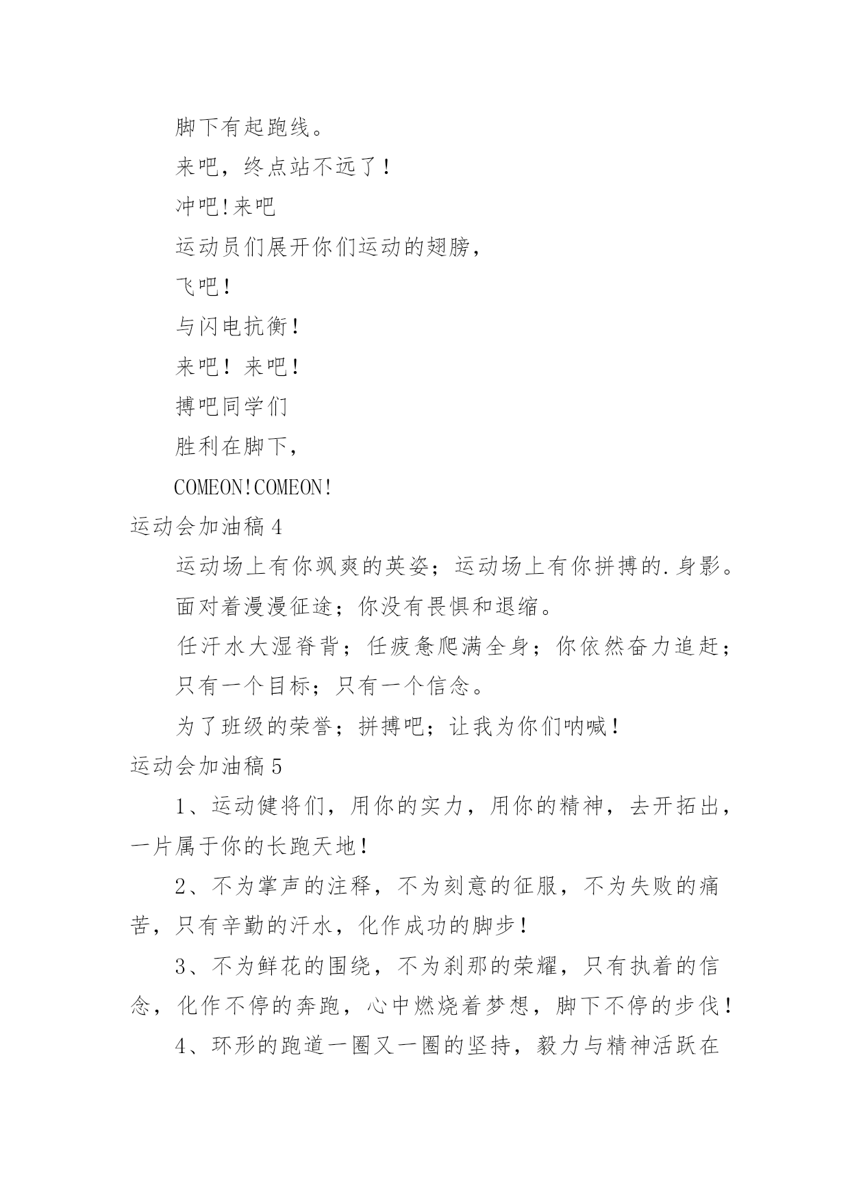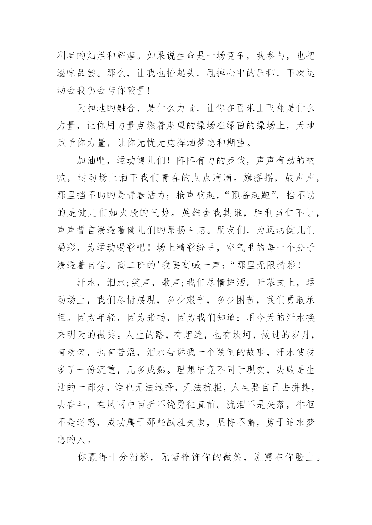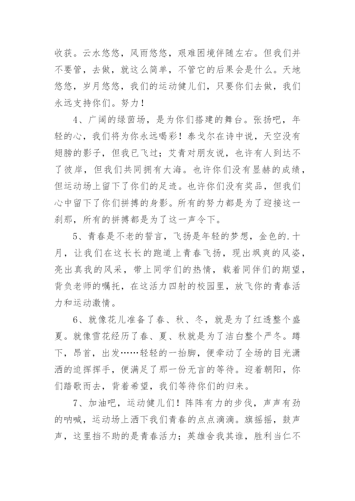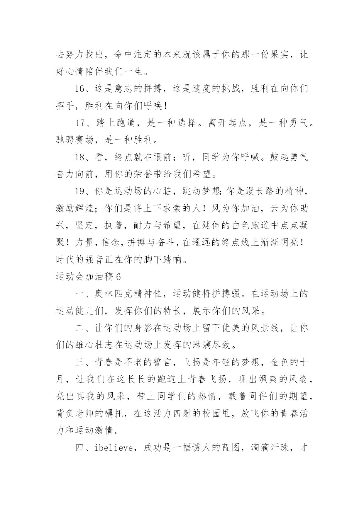 运动会加油稿运动会加油稿(精选)在现在的社会生活中,很多地方都会使用到加油稿,借助加油稿可以点燃对方的激情,激发对方的斗志。写加油稿的注意事项有许多,你确定会写吗?以下是小编精心整理的运动会加油稿,供大家参考借鉴,希望可以帮助到有需要的朋友。运动会加油稿11、每一份辛劳都有一份收获,每一次的痛苦都是快乐的开始,没一声呐喊都是力量的呼唤。我们有着大浪拍岸的豪迈,所以你不必在乎小荷初露的恬静,我们有着春日的阳光明媚,所以不用去羡慕冬日乱玉碎琼,我们是雨天的一把伞,是寒冷冬日里的一盆碳火,温暖的不只是你我,而是大家的心。运动场上的健儿,掌声属于你们,鲜花属于你们,成功也是属于你们!2、不为掌声的诠释,不为刻意的征服,只有辛勤的汗水化作追求的脚步,心中坚定的信念,脚下你的汗水洒在跑道,浇灌着成功的花朵开放。你的欢笑飞扬在赛场,为班争光数你最棒。跑吧,追吧在这广阔的赛场上,你似骏马似离弦的箭。跑吧,追吧你比虎猛比豹强。3、去做就这么简单,只要我们努力,我们一定会有所收获。云水悠悠,风雨悠悠,艰难困境伴随左右。但我们并不要管,去做,就这么简单,不管它的后果会是什么。天地悠悠,岁月悠悠,我们的运动健儿们,只要你们去做,我们永远支持你们。努力!4、广阔的绿茵场,是为你们搭建的舞台。张扬吧,年轻的心,我们将为你永远喝彩!泰戈尔在诗中说,天空没有翅膀的影子,但我已飞过;艾青对朋友说,也许有人到达不了彼岸,但我们共同拥有大海。也许你们没有显赫的成绩,但运动场上留下了你们的足迹。也许你们没有奖品,但我们心中留下了你们拼搏的身影。所有的努力都是为了迎接这一刹那,所有的拼搏都是为了这一声令下。5、青春是不老的誓言,飞扬是年轻的梦想,金色的.十月,让我们在这长长的跑道上青春飞扬,现出飒爽的风姿,亮出真我的风采,带上同学们的热情,载着同伴们的期望,背负老师的嘱托,在这活力四射的校园里,放飞你的青春活力和运动激情。6、就像花儿准备了春、秋、冬,就是为了红透整个盛夏。就像雪花经历了春、夏、秋就是为了洁白整个严冬。蹲下,昂首,出发……轻轻的一抬脚,便牵动了全场的目光潇洒的迫挥挥手,便满足了那一份无言的等待。迎着朝阳,你们踏歌而去,背着希望,我们等待你们的归来。7、加油吧,运动健儿们!阵阵有力的步伐,声声有劲的呐喊,运动场上洒下我们青春的点点滴滴。旗摇摇,鼓声声,这里挡不助的是青春活力;英雄舍我其谁,胜利当仁不让,声声誓言浸透着健儿们的昂扬斗志。朋友们,为运动健儿们喝彩,为运动喝彩吧!场上精彩纷呈,空气里的每一个分子浸透着自信。运动会加油稿2站在跑道上,努力奔跑吧!所有的力量顿时间都凝聚在了腿上和手上。你那轻盈的身体如同燕子一般,用尽自己全身的力量奔跑吧,祝你跑的越来越快。加油,只要相信自己就一定能行。加油吧!青春的阳光在悄悄地流淌,流淌在那鼓声里,流淌在那奔跑的脚步里,流淌在那发令枪的声响里,生命浸润在阳光中,阳光不锈运动生命在阳光里展现风采,生命的凯歌在阳光中走向辉煌,运动的序幕已经拉开,让我们用运动的火光来点燃生命的激情,生命阳光永不锈风对我耳语:“运动是我这样的轻盈岁月!”雨对我耳语:“运动是我这样的淋漓尽致!”雷对我耳语:“运动是我这样的铿锵有力!”电对我耳语:“运动是我这样的亮丽透明!”运动吧!在运动中理解风雨的洗礼,在运动中感受雷电的闪光年轻的我们自信飞扬,青春的气息如同出生的朝陽,蓬勃的力量如同陽光的挥洒。此时此刻,跑道便是我们精彩的舞台,声声加油便是我们的奖项!论何成功,谈何荣辱,心中的信念只有一个:拼搏!悄悄的,我退居一旁,避开所有的掌声和目光,远离胜利者的灿烂和辉煌。如果说生命是一场竞争,我参与,也把滋味品尝。那么,让我也抬起头,甩掉心中的压抑,下次运动会我仍会与你较量!天和地的融合,是什么力量,让你在百米上飞翔是什么力量,让你用力量点燃着期望的操场在绿茵的操场上,天地赋予你力量,让你无忧无虑挥洒梦想和期望。加油吧,运动健儿们!阵阵有力的步伐,声声有劲的呐喊,运动场上洒下我们青春的点点滴滴。旗摇摇,鼓声声,那里挡不助的是青春活力;枪声响起,“预备起跑”,挡不助的是健儿们如火般的气势。英雄舍我其谁,胜利当仁不让,声声誓言浸透着健儿们的昂扬斗志。朋友们,为运动健儿们喝彩,为运动喝彩吧!场上精彩纷呈,空气里的每一个分子浸透着自信。高二班的'我要高喊一声:“那里无限精彩!汗水,泪水;笑声,歌声;我们尽情挥洒。开幕式上,运动场上,我们尽情展现,多少艰辛,多少困苦,我们勇敢承担。因为年轻,因为张扬,因为我们知道:用今天的汗水换来明天的微笑。人生的路,有坦途,也有坎坷,做过的岁月,有欢笑,也有苦涩,泪水告诉我一个跌倒的故事,汗水使我多了一份沉重,几多成熟。理想毕竟不同于现实,失败是生活的一部分,谁也无法选择,无法抗拒,人生要自己去拼搏,去奋斗,在风雨中百