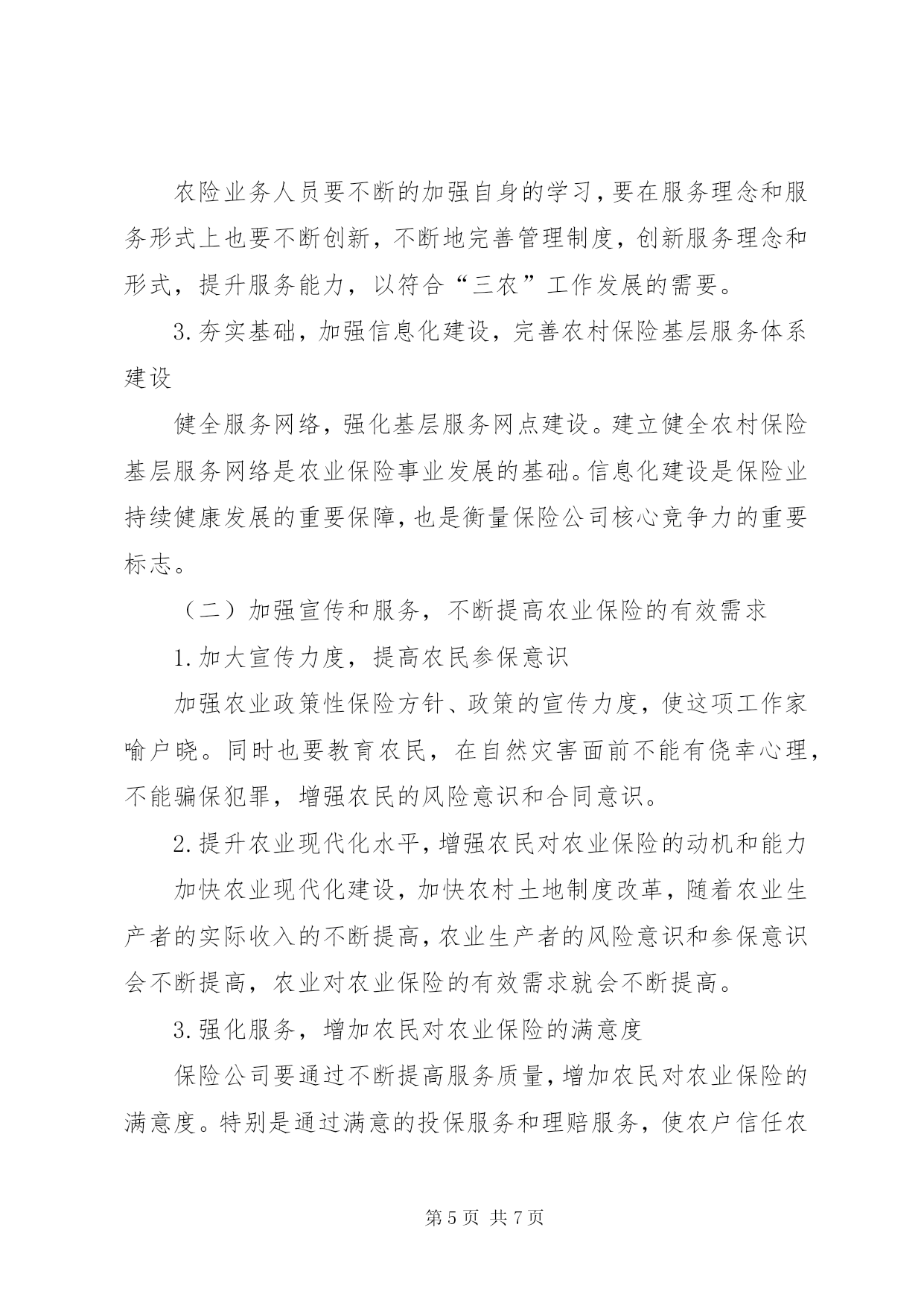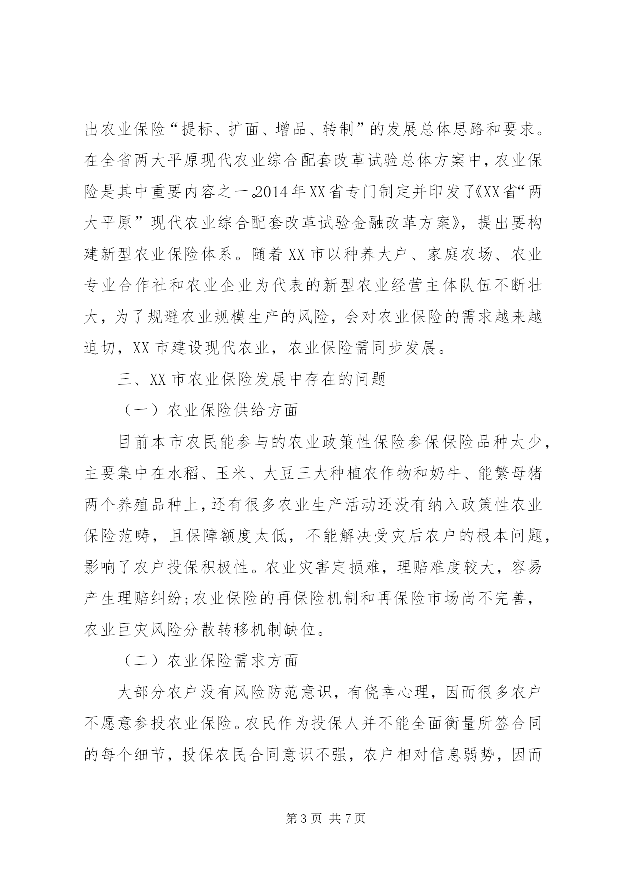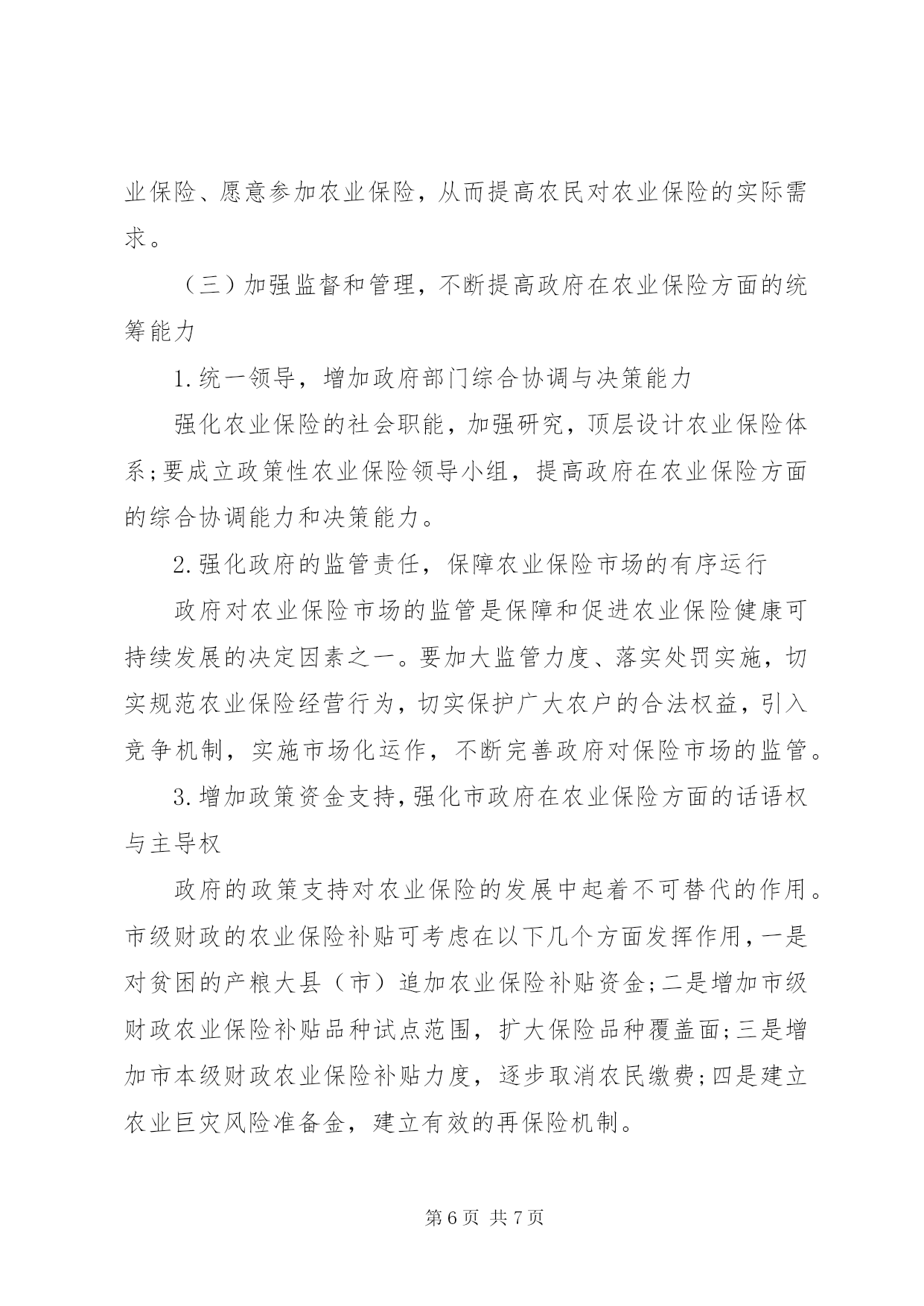 第PAGE\*Arabic\*MERGEFORMAT7页共NUMPAGES\*MERGEFORMAT7页加快农业保险发展的对策建议摘要。本课题对当前XX市农业保险的基本情况进行了认真调研,分析了农业保险发展面临的新形势,并结合XX市实际,从农业保险的供给、需求和外部环境等三个方面分析农业保险存在的问题,进而在强化管理和创新,不断完善农业保险供给体系;加强宣传和服务,不断提高农业保险的有效需求;加强监督和管理,不断提高政府在农业保险方面的统筹能力等三个层面提出了加快XX市农业保险发展的对策建议。关键词:农业保险;发展;建议;XX市哈尔滨是农业大市,影响农业生产的自然灾害时有发生,其危害程度呈不断加大趋势,危害农业生产的主要农业气象灾害是低温、干旱和洪涝。事实表明,随着生产水平的提高,农业气象灾害的困扰日益上升,影响着农民增收和农业生产的可持续发展。农业保险是促进现代农业发展的三大支柱之一,是应对农业灾害的根本措施。农业保险是农业社会化服务的重要组成部分,是推进现代化农业可持续发展的重要保障,更是党中央、国务院部署的一项重要的强农惠农政策。发展农业保险,对于减轻农业灾害损失,转移分散农业风险,保护和提高农业生产能力,促进农民增收农业增效,建设现代农业,保障农业经营主体切身利益,维护农村经济社会稳定等方面,都具有十分重要的意义。一、当前XX市农业保险的基本情况为了解政策性农业保险在XX市这个农业大市的实施情况,近日笔者对XX市的阿城、XX县区等部分县(市)开展了专题调研,调查结果显示本市农业政策性保险覆盖面不足30%,农业保险作用初步显现,农民对政策性农业保险认知程度有所增强。XX市现有耕地面积3000多万亩,2014年农业种植业作物保险面积约772.7万亩,占耕地面积的27.6%,远低于全省62%的平均水平。2014年农业保险保费收入为1.4亿元,比上年减少33.3%。养殖业承保能繁母猪1.4万头、奶牛1.75万头。目前,国家对XX省15个品种享受政策性农业保险补贴,全省对指定的4种种植业和2种养殖业农业保险险种享受保费补贴。种植业主要对水稻、小麦、玉米、大豆四种作物保险,养殖业主要是对能繁母猪和奶牛保险,其它养殖业、林业、烟叶等地方特色农业保险品种都没有开展有政策性补贴的保险业务。近年来XX市农业政策性保险工作虽有所成效,但存在的问题也同样不容小视。在农业保险实施过程中,仍存在着覆盖面低、收费难、赔付标准低和理赔难等诸多问题。二、XX市农业保险发展面临的新形势近年来,国家和地方对农业保险工作的重视程度不断提升,2013年3月,我国《农业保险条例》正式实施,明确了农业保险的政策性,规范了农业保险的发展方向。2014年XX省政府出台了《关于促进农业保险发展的若干意见》,省委省政府明确提出农业保险“提标、扩面、增品、转制”的发展总体思路和要求。在全省两大平原现代农业综合配套改革试验总体方案中,农业保险是其中重要内容之一。2014年XX省专门制定并印发了《XX省“两大平原”现代农业综合配套改革试验金融改革方案》,提出要构建新型农业保险体系。随着XX市以种养大户、家庭农场、农业专业合作社和农业企业为代表的新型农业经营主体队伍不断壮大,为了规避农业规模生产的风险,会对农业保险的需求越来越迫切,XX市建设现代农业,农业保险需同步发展。三、XX市农业保险发展中存在的问题(一)农业保险供给方面目前本市农民能参与的农业政策性保险参保保险品种太少,主要集中在水稻、玉米、大豆三大种植农作物和奶牛、能繁母猪两个养殖品种上,还有很多农业生产活动还没有纳入政策性农业保险范畴,且保障额度太低,不能解决受灾后农户的根本问题,影响了农户投保积极性。农业灾害定损难,理赔难度较大,容易产生理赔纠纷;农业保险的再保险机制和再保险市场尚不完善,农业巨灾风险分散转移机制缺位。(二)农业保险需求方面大部分农户没有风险防范意识,有侥幸心理,因而很多农户不愿意参投农业保险。农民作为投保人并不能全面衡量所签合同的每个细节,投保农民合同意识不强,农户相对信息弱势,因而在发生理赔纠纷时处于理赔劣势,影响农户投保积极性。农业灾害损失中的道德风险因素难以分辨,很容易出现造假、滥报和虚报等情况;农户对于政策性农业保险有效需求不足是影响农业保险发展的基本原因。(三)农业保险外部环境方面农业保险在本市还相对是一个新生事物,需要进一步确定农业保险的发展思路,需要完善相关的法律法规和具体的实施意见。同时政府对农业保险的监管不够,XX市级财政也没有安排专门的农业保险补贴资金,无法在农业保险工作上做到对上对下的有效衔接。四、加快推进XX市农业保险发展的对策建议农业灾害时有发生,发展农业这一弱势产业,建设XX市现代农业,亟须系上农业保险这条“保险带”。(一)强化管理和创新,不断完