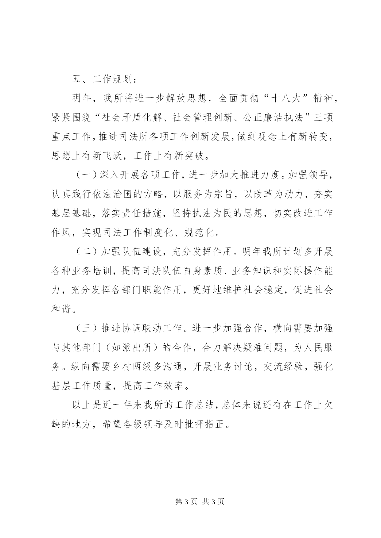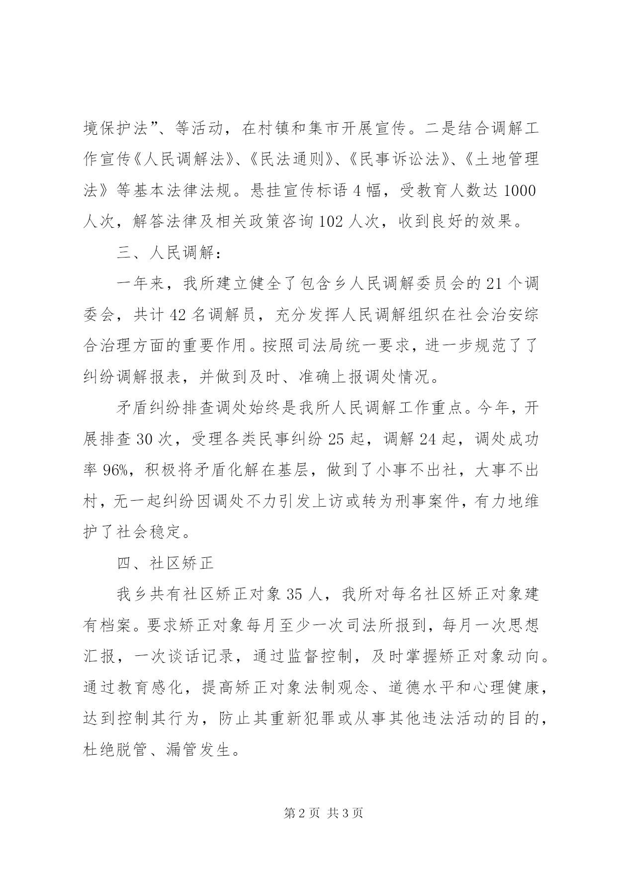 第PAGE\*Arabic\*MERGEFORMAT3页共NUMPAGES\*MERGEFORMAT3页司法所XX年年终工作总结2014年,司法所在乡党委、政府的正确领导XX县区司法局的精心指导下,以创新务实的工作姿态,创新普法依法治理工作,拓展和规范法律服务,充分发挥法制宣传、人民调解、社区矫正、安置帮教等各项工作职能,为乡经济社会发展营造良好的法制环境,更好地为地方发展和社会稳定服务。回顾一年来的工作,我们主要做了以下努力:一、司法所建设:司法所现有工作人员5人,村调解人员共计42人。乡司法所配备了专门的调解室、办公室,电脑、打印机、摄录机等,工作基础设施比较完善。为了逐步实现司法所的规范化管理,我们制定了下列规章制度:1、司法所工作职责;2、司法所工作制度;3、司法所长的工作职责;4、社区矫正、安置帮教管理规定;5、人民调解工作相关管理办法。二、普法宣传:今年我所在总结普法工作经验的基础上,多管齐下,不断加大普法宣传工作力度。一是突出抓好宪法和与人民群众生产生活密切相关的常用法律法规的宣传学习,结合“普法宣传月”、“环境保护法”、等活动,在村镇和集市开展宣传。二是结合调解工作宣传《人民调解法》、《民法通则》、《民事诉讼法》、《土地管理法》等基本法律法规。悬挂宣传标语4幅,受教育人数达1000人次,解答法律及相关政策咨询102人次,收到良好的效果。三、人民调解:一年来,我所建立健全了包含乡人民调解委员会的21个调委会,共计42名调解员,充分发挥人民调解组织在社会治安综合治理方面的重要作用。按照司法局统一要求,进一步规范了了纠纷调解报表,并做到及时、准确上报调处情况。矛盾纠纷排查调处始终是我所人民调解工作重点。今年,开展排查30次,受理各类民事纠纷25起,调解24起,调处成功率96%,积极将矛盾化解在基层,做到了小事不出社,大事不出村,无一起纠纷因调处不力引发上访或转为刑事案件,有力地维护了社会稳定。四、社区矫正我乡共有社区矫正对象35人,我所对每名社区矫正对象建有档案。要求矫正对象每月至少一次司法所报到,每月一次思想汇报,一次谈话记录,通过监督控制,及时掌握矫正对象动向。通过教育感化,提高矫正对象法制观念、道德水平和心理健康,达到控制其行为,防止其重新犯罪或从事其他违法活动的目的,杜绝脱管、漏管发生。五、工作规划:明年,我所将进一步解放思想,全面贯彻“十八大”精神,紧紧围绕“社会矛盾化解、社会管理创新、公正廉洁执法”三项重点工作,推进司法所各项工作创新发展,做到观念上有新转变,思想上有新飞跃,工作上有新突破。(一)深入开展各项工作,进一步加大推进力度。加强领导,认真践行依法治国的方略,以服务为宗旨,以改革为动力,夯实基层基础,落实责任措施,坚持执法为民的思想,切实改进工作作风,实现司法工作制度化、规范化。(二)加强队伍建设,充分发挥作用。明年我所计划多开展各种业务培训,提高司法队伍自身素质、业务知识和实际操作能力,充分发挥各部门职能作用,更好地维护社会稳定,促进社会和谐。(三)推进协调联动工作。进一步加强合作,横向需要加强与其他部门(如派出所)的合作,合力解决疑难问题,为人民服务。纵向需要乡村两级多沟通,开展业务讨论,交流经验,强化基层工作质量,提高工作效率。以上是近一年来我所的工作总结,总体来说还有在工作上欠缺的地方,希望各级领导及时批抨指正。