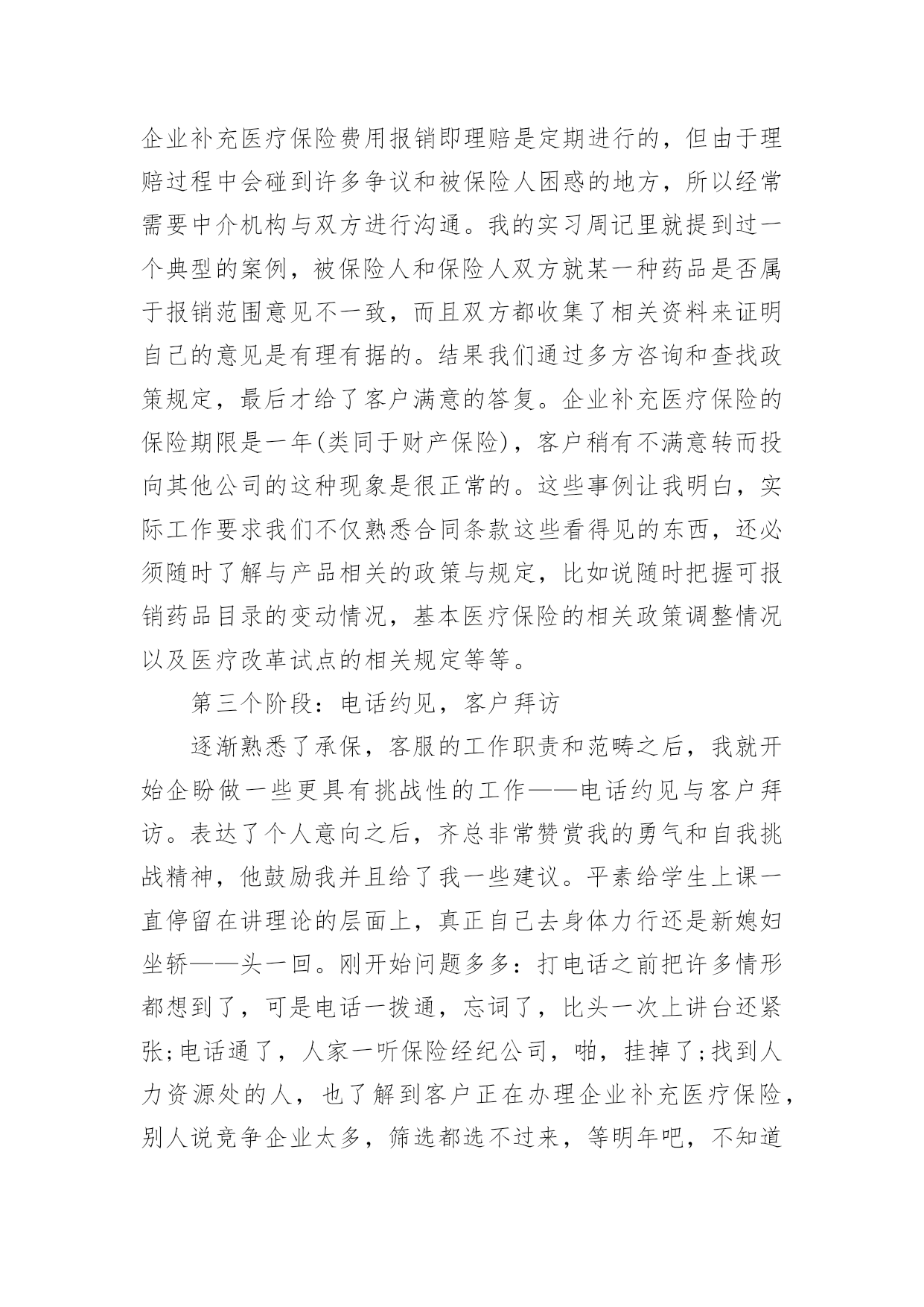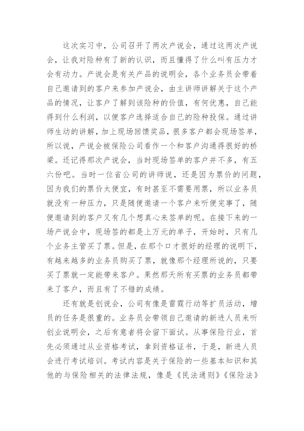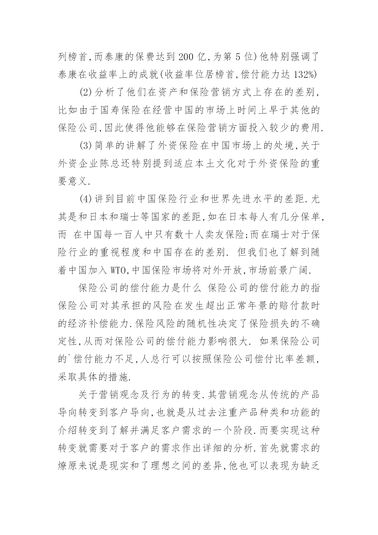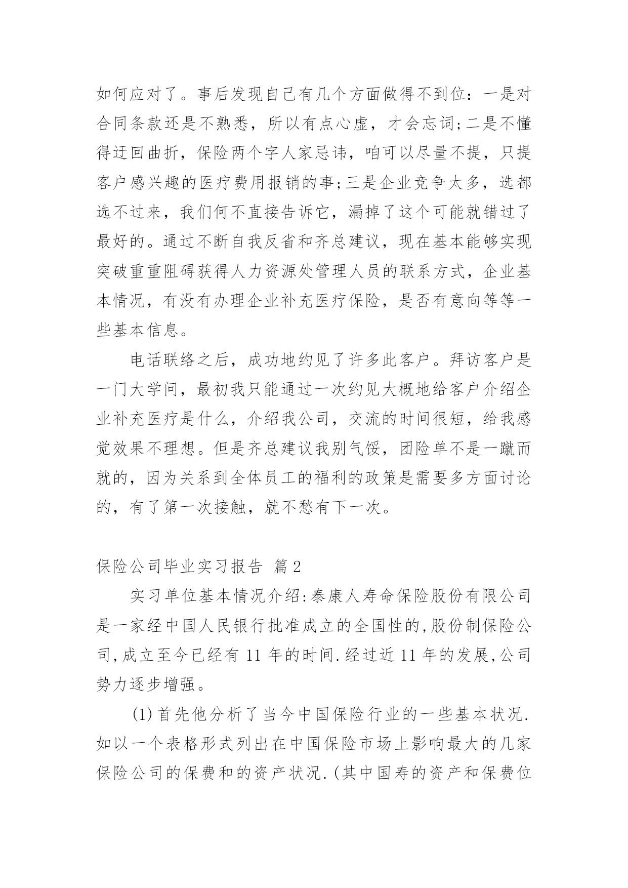 保险公司毕业实习报告关于保险公司毕业实习报告四篇在经济发展迅速的今天,报告十分的重要,不同的报告内容同样也是不同的。那么什么样的报告才是有效的呢?以下是小编收集整理的保险公司毕业实习报告4篇,希望能够帮助到大家。保险公司毕业实习报告篇1第一个阶段:熟悉公司运作,管理流程和合同条款天和是于20xx年成立的保险经纪机构,公司董事长和产寿险部总经理都是保险营销精英出身,目前在上海有一家分公司。产险方面以与中石化合作为基础不断拓展新业务,寿险以企业补充医疗保险为主逐步推广企业年金,客户有北京市卷烟厂等一些大型企业。公司规模不大,人事结构简单,内勤人员每个人既负责承保也负责客服,各自按客户划分工作范围和职责。秘书,出纳,人事由助理一肩挑。外勤人员负责业务联系,底薪加提成,激励机制简单易行。我选择天和实习,因为它小而员工分工不细,我可以在两个半月的时间里接触参与到每一个工作环节而不会因为是实习生受到排斥。承保,客服也好,外勤业务洽谈也好,都需要了解险种和合同条款。所以我首先是学习企业补充医疗保险的合同条款。通过一段时间的学习,我感觉各个公司的合同条款相差无几,都是直接在基本医疗保险的基础上确定费用保险项目和费用保险层次,只是需要被保险共同分担的部分可以通过企业补充医疗保险让保险人分摊一部分,这样能够再次降低被保险人的费用负担。比如说,保险公司可报销的药品和诊疗项目完全与基本医疗一致,都是以《北京市基本医疗保险和工伤保险药品目录》为准。保险人只需根据客户想要报销的比例来厘算费率。所以产品差异化不明显,那么保险公司或中介机构只能靠客户关系和售后服务取胜。第二个阶段:承保和客服在熟悉了险种和合同条款之后,接下来我的实习工作就是承保与客服。因为企业补充医疗保险是团体险,而且参加了基本医疗的在职和退休职工都能参与(有些将被保险扩展到职工子女),所以没有核保,没有体检,保险经纪公司需要做的就是统计被保险人的性别,年龄和人数,根据企业保障程度需要和保险公司协商起草保险合同条款。协商合同内容是一项艰巨的任务,作为经纪公司代表客户,在合同里应尽量考虑到客户利益,尽量争取更有利的承保条件,所以必须字斟句酌。比如说新增被保险人的条件,离职被保险人的退费,索赔的期限,保险责任,除外责任等项目。事实证明,每一条每一款双方都要沟通许多个来回,最终达成一致意见需要一段时间的磨合。而我们在磨合中逐渐熟悉了专业术语,学会了思虑周全。当然工作往往是交叉的`和相互渗透的,在和保险公司就新的协议进行协商的同时,客服是不断穿插其中的。尽管企业补充医疗保险费用报销即理赔是定期进行的,但由于理赔过程中会碰到许多争议和被保险人困惑的地方,所以经常需要中介机构与双方进行沟通。我的实习周记里就提到过一个典型的案例,被保险人和保险人双方就某一种药品是否属于报销范围意见不一致,而且双方都收集了相关资料来证明自己的意见是有理有据的。结果我们通过多方咨询和查找政策规定,最后才给了客户满意的答复。企业补充医疗保险的保险期限是一年(类同于财产保险),客户稍有不满意转而投向其他公司的这种现象是很正常的。这些事例让我明白,实际工作要求我们不仅熟悉合同条款这些看得见的东西,还必须随时了解与产品相关的政策与规定,比如说随时把握可报销药品目录的变动情况,基本医疗保险的相关政策调整情况以及医疗改革试点的相关规定等等。第三个阶段:电话约见,客户拜访逐渐熟悉了承保,客服的工作职责和范畴之后,我就开始企盼做一些更具有挑战性的工作——电话约见与客户拜访。表达了个人意向之后,齐总非常赞赏我的勇气和自我挑战精神,他鼓励我并且给了我一些建议。平素给学生上课一直停留在讲理论的层面上,真正自己去身体力行还是新媳妇坐轿——头一回。刚开始问题多多:打电话之前把许多情形都想到了,可是电话一拨通,忘词了,比头一次上讲台还紧张;电话通了,人家一听保险经纪公司,啪,挂掉了;找到人力资源处的人,也了解到客户正在办理企业补充医疗保险,别人说竞争企业太多,筛选都选不过来,等明年吧,不知道如何应对了。事后发现自己有几个方面做得不到位:一是对合同条款还是不熟悉,所以有点心虚,才会忘词;二是不懂得迂回曲折,保险两个字人家忌讳,咱可以尽量不提,只提客户感兴趣的医疗费用报销的事;三是企业竞争太多,选都选不过来,我们何不直接告诉它,漏掉了这个可能就错过了最好的。通过不断自我反省和齐总建议,现在基本能够实现突破重重阻碍获得人力资源处管理人员的联系方式,企业基本情况,有没有办理企业补充医疗保险,是否有意向等等一些基本信息。电话联络之后,成功地约见了许多此客户。拜访客户是一门大学问,最初我只能通过一次约见大概地给客户介绍企业补充医疗是什么,介绍我公司,交流的时间很短,给我感觉效果不理想。但是齐总建议我别气馁,团险单不是一蹴而就的,因为关系到全体员工的福利的政策是