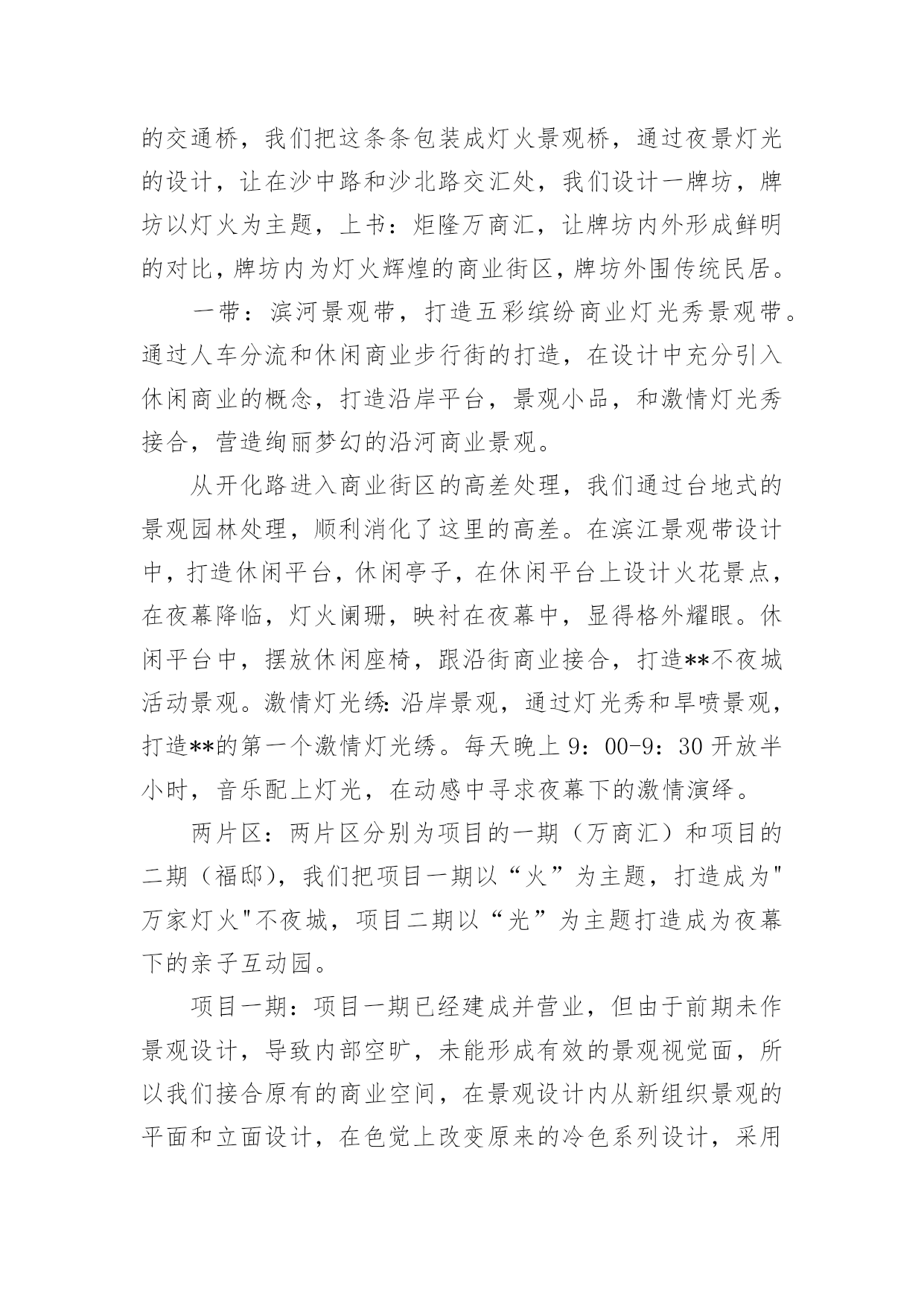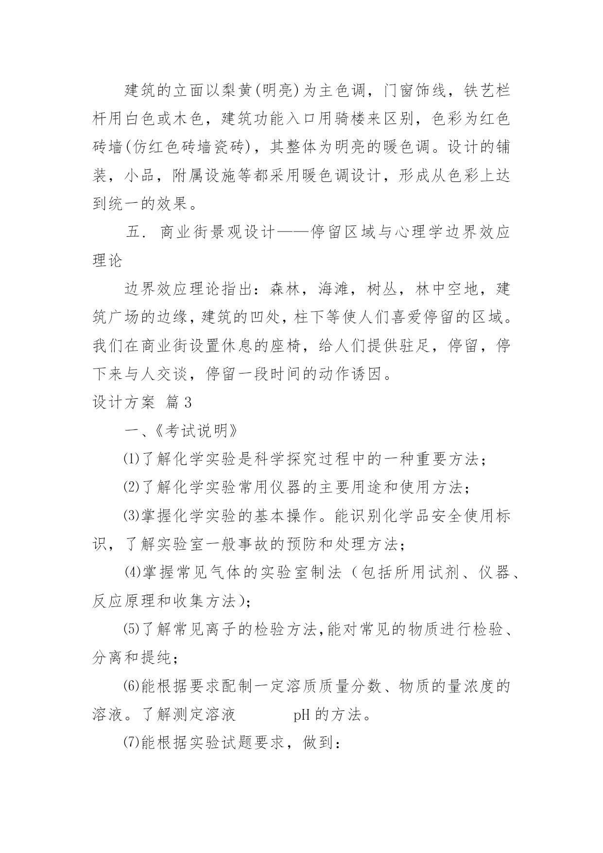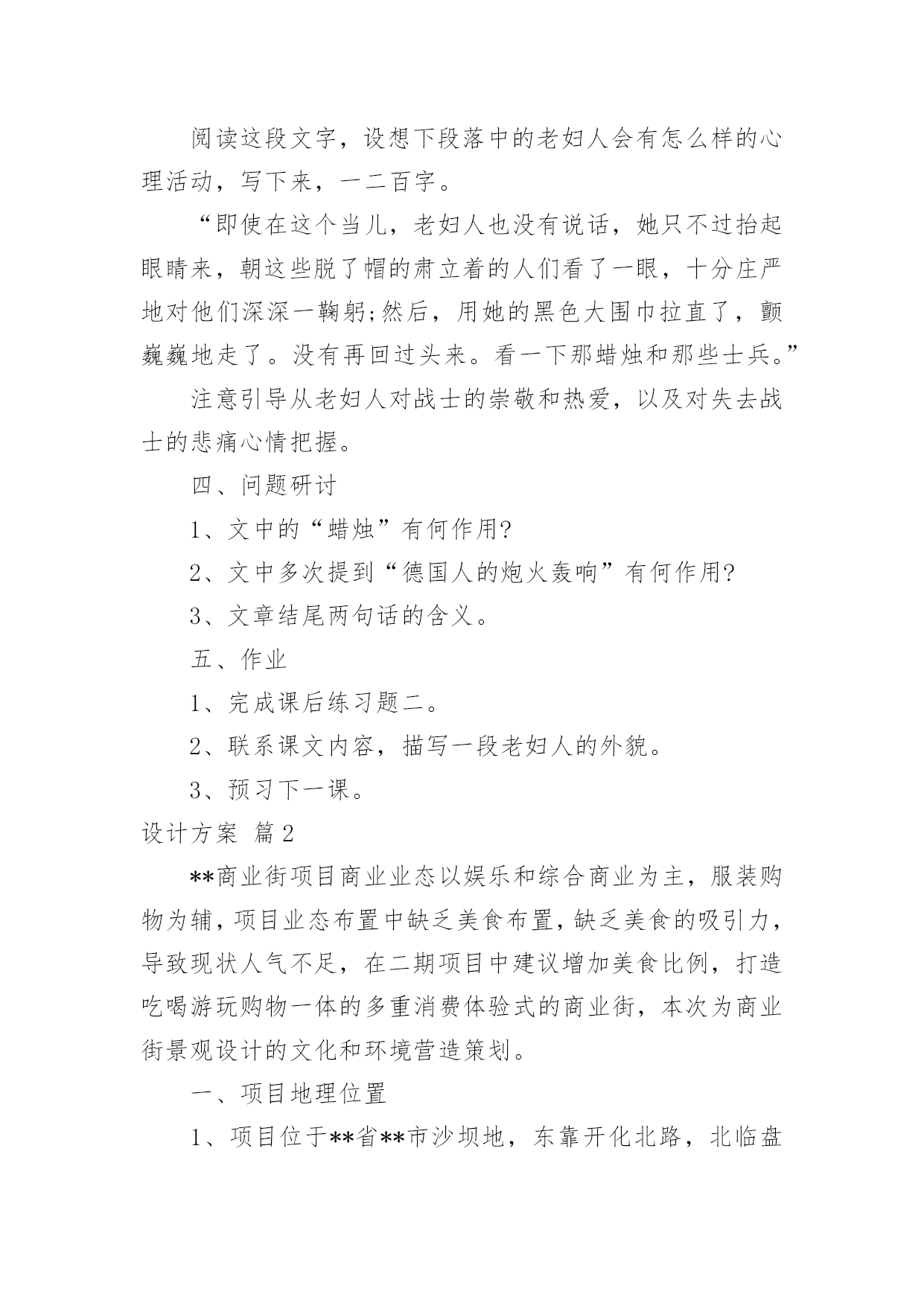 设计方案设计方案常用8篇为了确保我们的努力取得实效,常常需要提前制定一份优秀的方案,方案是阐明行动的时间,地点,目的,预期效果,预算及方法等的书面计划。那么方案应该怎么制定才合适呢?下面是小编收集整理的设计方案8篇,欢迎阅读与收藏。设计方案篇1【教学目的】1、探究作品中人物的心理活动,感受人物的内心世界。2、学习作者通过细腻的动作描写刻画人物性格的方法。3、体会作品中所表现的各国人民在战争所凝结的友谊。【教学重点和难点】学习用心理活动刻画人物性格的方法。【教学时间】一课时。【教学方法】讨论法。【教学准备】1、学生查找有关第二次世界大战的资料,了解在这次战争中侵略者犯下的罪行,弄清课文所牵涉的历史背景。2、预习课文。【教学过程】一、检查预习,听写词语拂晓瓦砾地窖鞠躬烧灼偷袭间歇耸立匍匐颤巍巍僵硬舀水腋窝揣在屏障肃穆精疲力竭二、导入1、学生介绍搜集的有关第二次世界大战的知识。2、作者:西蒙诺夫(1915~1979),苏联作家。三、阅读课文,整体把握1、学生朗读课文,把握文章的记叙要素。时间:第二次世界大战期间,1944年9月19日地点:贝尔格莱德的撒伐河岸人物:老妇人玛利·育乞西、苏联红军士兵柯拉耶夫事件:一位苏联红军战士在南斯拉夫国土上牺牲了,南斯拉夫母亲不顾枪林弹雨,以惊人的毅力安葬了烈士,拿出自己唯一珍爱的结婚时的花烛点在烈士的坟头。2、默读课文,找出令你感动的一个片段进行交流,并且说出为什么。注意:人物的动作和心理。这个南斯拉夫母亲在战争中饱受苦难,她把苏联红军战士当作自己的`亲人,她的爱和恨是鲜明、深沉的。作品刻画老妇人没有语言,只有动作,作者通过细腻的动作描写展现了老妇人美好的心灵,表达了这位南斯拉夫母亲对红军战士的爱,让读者感知到这位母亲伟大的内心世界。3、揣摩人物心理练笔:阅读这段文字,设想下段落中的老妇人会有怎么样的心理活动,写下来,一二百字。“即使在这个当儿,老妇人也没有说话,她只不过抬起眼睛来,朝这些脱了帽的肃立着的人们看了一眼,十分庄严地对他们深深一鞠躬;然后,用她的黑色大围巾拉直了,颤巍巍地走了。没有再回过头来。看一下那蜡烛和那些士兵。”注意引导从老妇人对战士的崇敬和热爱,以及对失去战士的悲痛心情把握。四、问题研讨1、文中的“蜡烛”有何作用?2、文中多次提到“德国人的炮火轰响”有何作用?3、文章结尾两句话的含义。五、作业1、完成课后练习题二。2、联系课文内容,描写一段老妇人的外貌。3、预习下一课。设计方案篇2**商业街项目商业业态以娱乐和综合商业为主,服装购物为辅,项目业态布置中缺乏美食布置,缺乏美食的吸引力,导致现状人气不足,在二期项目中建议增加美食比例,打造吃喝游玩购物一体的多重消费体验式的商业街,本次为商业街景观设计的文化和环境营造策划。一、项目地理位置1、项目位于**省**市沙坝地,东靠开化北路,北临盘龙河,南到沙北路,总用地面积为6万平方米,分两期建设,其中一期(万商会)面积3万平方米,二期(福邸)面积3万平方米,均为底层商业,高层公寓或者住宅的建筑布局。2、**概况:**市是多民族聚居市,世居**的各民族在悠悠漫长的历史长河中,创造了极其丰富的独具特色文化,形成了“壮族能歌、苗族能跳、彝族善舞”的独特民族文化体系;此外还有各少数民族的婚俗、葬礼、歌舞、服饰、食品、习俗等,更是风趣奇异,形成独特的民族文化旅游资源。**年**市域总人口规模在62万人左右,城镇化率为55.2%左右。**年市域总人口规模在73万人左右,城镇化率为70%左右。**年域总人口规模在100万人左右,城镇人口规模在605万人左右,城镇化率为81%左右。**年中心城区城镇人口规模为70万人。二、项目分析1、项目的优势(1)项目位于**城的传统商业区心,地理位置优越,其中**市城市总体规划(20xx-2030年)把包括项目所在地范围内(**老城区,包括以普阳路、东风路为载体的商业中心、**军分区及周边居住区及结合盘龙河)的**城市中部建设成为商贸的空间载体。(2)项目紧依盘龙河——景观优越。**中心城区是典型的“两山夹一河”的城市格局,盘龙河九曲十八弯穿城而过。**应因地制宜,全力打造“水在城中、城在绿中”的绿色家园。形成以盘龙河沿河绿化为重点,广场公园绿化为节点,道路绿化为纽带,小区绿化为补充,面山绿化为屏障的生态绿网。(3)项目紧依开化路,交通便捷:开化路为**城南北主要通道,人流车流繁忙,项目东侧紧靠开化路。沙中路和沙北路都紧靠项目地,为项目的交通便捷性提供了方便。2、项目不足(1)项目周边环境杂乱,特别是沙北路以南,还有大量传统民居,居住人群参差不齐。盘龙河河水浑浊,河岸脏乱,特别是烤鸡商业街一侧,垃圾遍野,岸边还有垃圾房和公测。(2)在项目地周边未形成有效的商业景观,城市高端消费水平总体不高。(3)项目内部环境未进