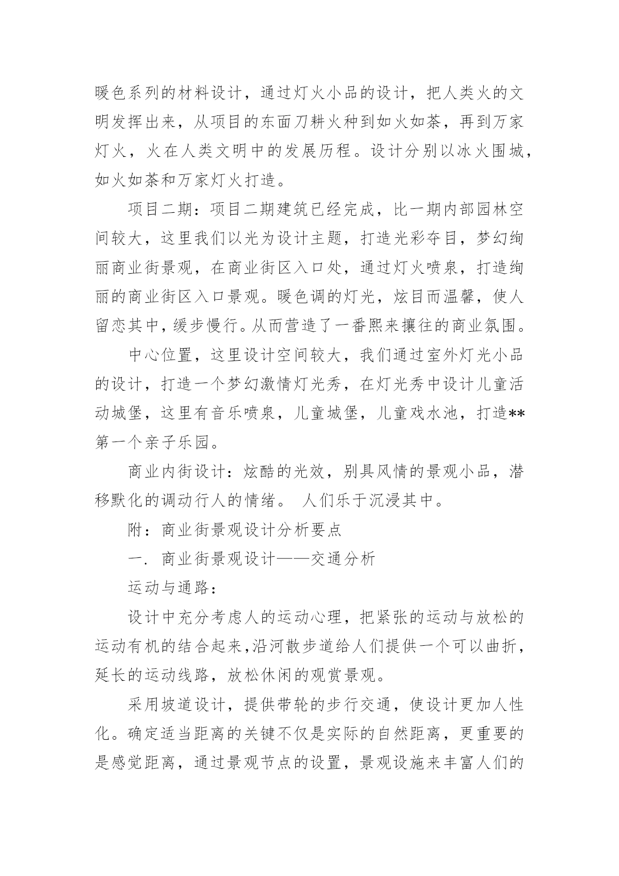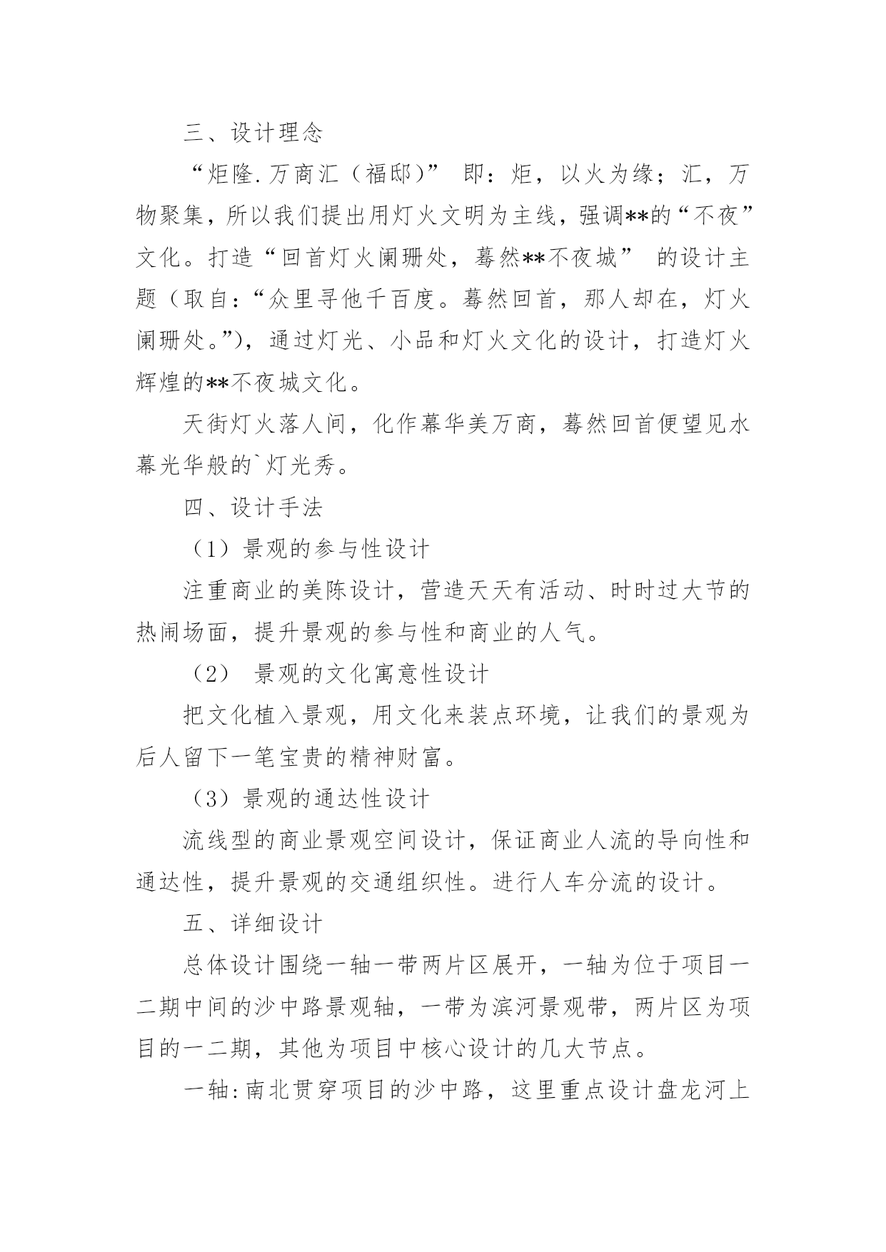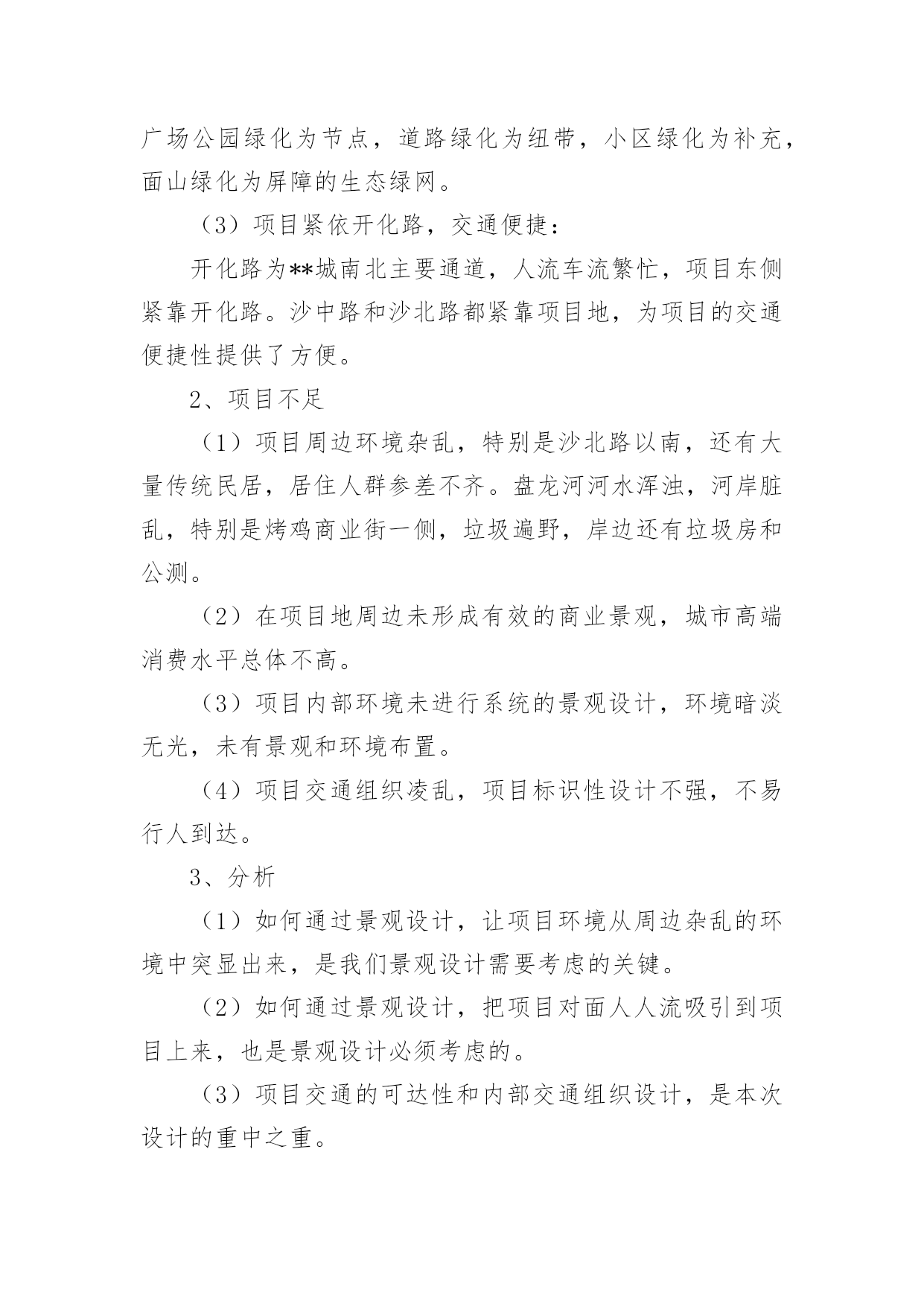 设计方案设计方案常用8篇为了确保我们的努力取得实效,常常需要提前制定一份优秀的方案,方案是阐明行动的时间,地点,目的,预期效果,预算及方法等的书面计划。那么方案应该怎么制定才合适呢?下面是小编收集整理的设计方案8篇,欢迎阅读与收藏。设计方案篇1【教学目的】1、探究作品中人物的心理活动,感受人物的内心世界。2、学习作者通过细腻的动作描写刻画人物性格的方法。3、体会作品中所表现的各国人民在战争所凝结的友谊。【教学重点和难点】学习用心理活动刻画人物性格的方法。【教学时间】一课时。【教学方法】讨论法。【教学准备】1、学生查找有关第二次世界大战的资料,了解在这次战争中侵略者犯下的罪行,弄清课文所牵涉的历史背景。2、预习课文。【教学过程】一、检查预习,听写词语拂晓瓦砾地窖鞠躬烧灼偷袭间歇耸立匍匐颤巍巍僵硬舀水腋窝揣在屏障肃穆精疲力竭二、导入1、学生介绍搜集的有关第二次世界大战的知识。2、作者:西蒙诺夫(1915~1979),苏联作家。三、阅读课文,整体把握1、学生朗读课文,把握文章的记叙要素。时间:第二次世界大战期间,1944年9月19日地点:贝尔格莱德的撒伐河岸人物:老妇人玛利·育乞西、苏联红军士兵柯拉耶夫事件:一位苏联红军战士在南斯拉夫国土上牺牲了,南斯拉夫母亲不顾枪林弹雨,以惊人的毅力安葬了烈士,拿出自己唯一珍爱的结婚时的花烛点在烈士的坟头。2、默读课文,找出令你感动的一个片段进行交流,并且说出为什么。注意:人物的动作和心理。这个南斯拉夫母亲在战争中饱受苦难,她把苏联红军战士当作自己的`亲人,她的爱和恨是鲜明、深沉的。作品刻画老妇人没有语言,只有动作,作者通过细腻的动作描写展现了老妇人美好的心灵,表达了这位南斯拉夫母亲对红军战士的爱,让读者感知到这位母亲伟大的内心世界。3、揣摩人物心理练笔:阅读这段文字,设想下段落中的老妇人会有怎么样的心理活动,写下来,一二百字。“即使在这个当儿,老妇人也没有说话,她只不过抬起眼睛来,朝这些脱了帽的肃立着的人们看了一眼,十分庄严地对他们深深一鞠躬;然后,用她的黑色大围巾拉直了,颤巍巍地走了。没有再回过头来。看一下那蜡烛和那些士兵。”注意引导从老妇人对战士的崇敬和热爱,以及对失去战士的悲痛心情把握。四、问题研讨1、文中的“蜡烛”有何作用?2、文中多次提到“德国人的炮火轰响”有何作用?3、文章结尾两句话的含义。五、作业1、完成课后练习题二。2、联系课文内容,描写一段老妇人的外貌。3、预习下一课。设计方案篇2**商业街项目商业业态以娱乐和综合商业为主,服装购物为辅,项目业态布置中缺乏美食布置,缺乏美食的吸引力,导致现状人气不足,在二期项目中建议增加美食比例,打造吃喝游玩购物一体的多重消费体验式的商业街,本次为商业街景观设计的文化和环境营造策划。一、项目地理位置1、项目位于**省**市沙坝地,东靠开化北路,北临盘龙河,南到沙北路,总用地面积为6万平方米,分两期建设,其中一期(万商会)面积3万平方米,二期(福邸)面积3万平方米,均为底层商业,高层公寓或者住宅的建筑布局。2、**概况:**市是多民族聚居市,世居**的各民族在悠悠漫长的历史长河中,创造了极其丰富的独具特色文化,形成了“壮族能歌、苗族能跳、彝族善舞”的独特民族文化体系;此外还有各少数民族的婚俗、葬礼、歌舞、服饰、食品、习俗等,更是风趣奇异,形成独特的民族文化旅游资源。**年**市域总人口规模在62万人左右,城镇化率为55.2%左右。**年市域总人口规模在73万人左右,城镇化率为70%左右。**年域总人口规模在100万人左右,城镇人口规模在605万人左右,城镇化率为81%左右。**年中心城区城镇人口规模为70万人。二、项目分析1、项目的优势(1)项目位于**城的传统商业区心,地理位置优越,其中**市城市总体规划(20xx-2030年)把包括项目所在地范围内(**老城区,包括以普阳路、东风路为载体的商业中心、**军分区及周边居住区及结合盘龙河)的**城市中部建设成为商贸的空间载体。(2)项目紧依盘龙河——景观优越。**中心城区是典型的“两山夹一河”的城市格局,盘龙河九曲十八弯穿城而过。**应因地制宜,全力打造“水在城中、城在绿中”的绿色家园。形成以盘龙河沿河绿化为重点,广场公园绿化为节点,道路绿化为纽带,小区绿化为补充,面山绿化为屏障的生态绿网。(3)项目紧依开化路,交通便捷:开化路为**城南北主要通道,人流车流繁忙,项目东侧紧靠开化路。沙中路和沙北路都紧靠项目地,为项目的交通便捷性提供了方便。2、项目不足(1)项目周边环境杂乱,特别是沙北路以南,还有大量传统民居,居住人群参差不齐。盘龙河河水浑浊,河岸脏乱,特别是烤鸡商业街一侧,垃圾遍野,岸边还有垃圾房和公测。(2)在项目地周边未形成有效的商业景观,城市高端消费水平总体不高。(3)项目内部环境未进