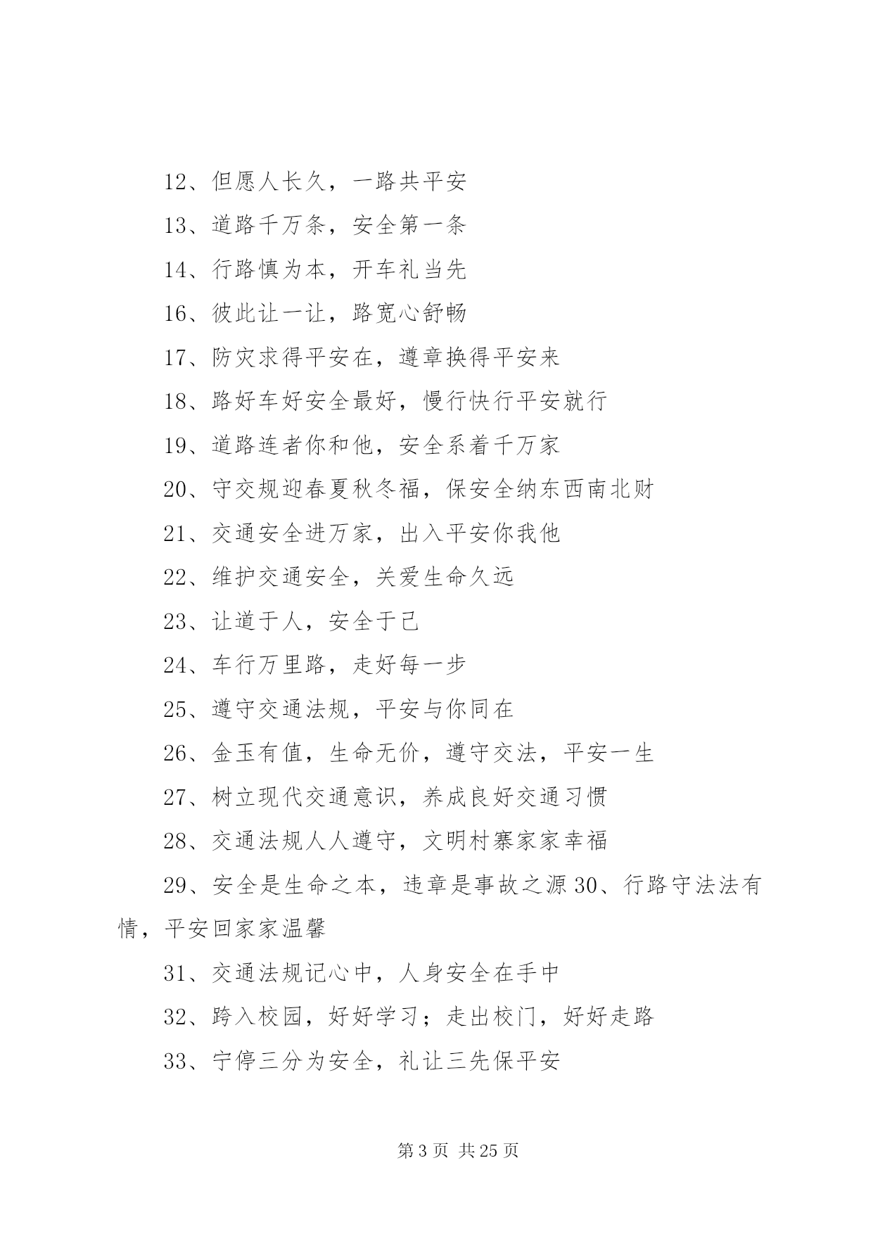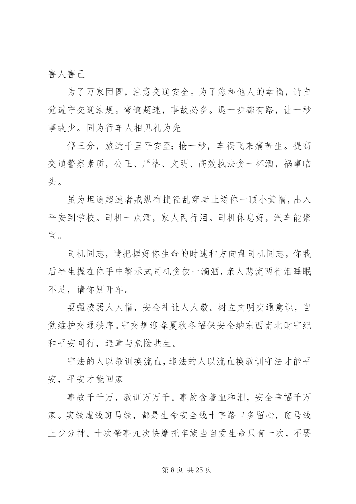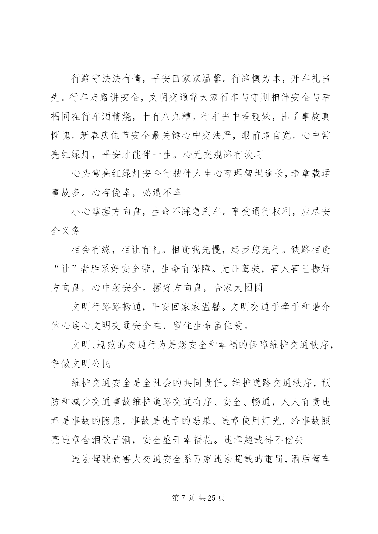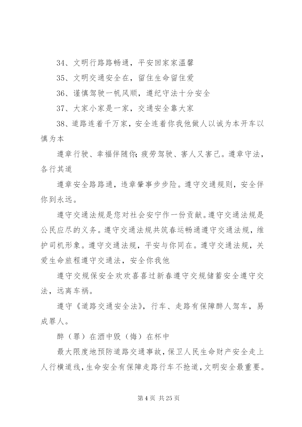第PAGE\*Arabic\*MERGEFORMAT25页共NUMPAGES\*MERGEFORMAT25页道路交通安全标语急弯、坡陡、路窄,谨慎驾驶。关爱生命,不坐超员车,不坐报废车,不坐低速载货汽车和拖拉机不超速,不超员,不酒后驾驶,不疲劳驾驶。坡亲。过村路、咱慢点呦。”第二篇:道路交通安全标语道路交通安全宣传1、决战100天,确保“反违章、反违纪、强管理、保安全”专项道路交通安全整治活动取得实效。2、铭记交规,珍爱生命。3、人人不违章,安全有保障。4、恪守交规,法律为您生命护航。5、遵守交通法规,是对您自己负责。6、醉(罪)在酒中、毁(悔)在杯中。7、出行时,切记系上交通法规这条安全带。8、开违章车,流事故泪。9、红灯短暂,生命无限。10、贪一时之快,悔一生之恨。第三篇:道路交通安全宣传标语良药苦口利于病,交通法规利于行金玉有值,生命无价,遵守交法,平安一生安全是生命之本,违章是事故之源文明交通安全在,留住生命留住爱谨慎驾驶一帆风顺,遵纪守法十分安全道路连着千万家,安全连着你我他宁停三分为安全,礼让三分保平安人在路中守交规,法在心中路畅通交通法规记心中,人身安全在手中交通法规人人遵守,文明城市处处安全第四篇:道路交通安全宣传标语道路交通安全宣传标语今日上午九时,碧痕镇交管站、安监站利用赶碧痕之机,在碧痕中学路口设置临时劝返点,对过往赶集车辆进行排查,并发放题为“”的宣传资料,受教育人次达210人。同时对过往车辆进行登记。1、遵守交通法规,关隘生命旅程2、以人为本,关爱生命3、铭记法规,善待生命4、享受通行权利,应尽安全义务5、维护交通秩序,争做文明公民6、道路交通安全法,伴您平安万里行7、守法才能平安,平安才能回家8、良药苦口利于病,交通法规利于行9、安全与守法同在,事故与违法相随10、法规在心中,平安在手中11、树立交通文明意识,自觉维护交通秩序12、但愿人长久,一路共平安13、道路千万条,安全第一条14、行路慎为本,开车礼当先16、彼此让一让,路宽心舒畅17、防灾求得平安在,遵章换得平安来18、路好车好安全最好,慢行快行平安就行19、道路连者你和他,安全系着千万家20、守交规迎春夏秋冬福,保安全纳东西南北财21、交通安全进万家,出入平安你我他22、维护交通安全,关爱生命久远23、让道于人,安全于己24、车行万里路,走好每一步25、遵守交通法规,平安与你同在26、金玉有值,生命无价,遵守交法,平安一生27、树立现代交通意识,养成良好交通习惯28、交通法规人人遵守,文明村寨家家幸福29、安全是生命之本,违章是事故之源30、行路守法法有情,平安回家家温馨31、交通法规记心中,人身安全在手中32、跨入校园,好好学习;走出校门,好好走路33、宁停三分为安全,礼让三先保平安34、文明行路路畅通,平安回家家温馨35、文明交通安全在,留住生命留住爱36、谨慎驾驶一帆风顺,遵纪守法十分安全37、大家小家是一家,交通安全靠大家38、道路连着千万家,安全连着你我他做人以诚为本开车以慎为本遵章行驶、幸福伴随你;疲劳驾驶、害人又害己。遵章守法,各行其道遵章安全路路通,违章肇事步步险。遵守交通规则,安全伴你到永远。遵守交通法规是您对社会安宁作一份贡献。遵守交通法规是公民应尽的义务。遵守交通法规共筑春运畅通遵守交通法规,维护司机形象。遵守交通法规,平安与你同在。遵守交通法规,关爱生命旅程遵守交通法,安全你我他遵守交规保安全欢欢喜喜过新春遵守交规储蓄安全遵守交法,远离车祸。遵守《道路交通安全法》,行车、走路有保障醉人驾车,易成罪人。醉(罪)在酒中毁(悔)在杯中最大限度地预防道路交通事故,保卫人民生命财产安全走上人行横道线,生命安全有保障走路行车不抢道,文明安全最重要。自觉遵守道路交通法律,确保春运安全出行自觉维护交通秩序,确保春运交通安全。专心行车车开稳,停放要讲公德心。祝南来北往的乘客旅途愉快一路平安重视交通安全、维护交通秩序。整夜不睡觉、事故逃不掉。挣金山挣银山交通安全是靠山争让一闪念,生死一瞬间。争抢——抢出飞来横祸珍惜生命拒绝违章珍爱生命严守交规肇事逃逸将终生禁止驾车肇事逃逸犯法,缉拿归案重罚肇事莫逃逸,逃逸违天理。肇事别逃逸,逃逸必被捉。占道摆摊设点,害人害己危险。占道摆摊设点,妨碍交通安全增强公民守法意识,保障道路交通有序、安全、畅通在交通安全辞典里,永远没有“侥幸”二字。运输单位有消除机动车安全隐患的责任雨雾天气须谨慎,减速慢行保安全。与其在肇事后流泪,不如在出祸前防备。有酒即无舵早晚要闯祸油门踩脚下,亲人常牵挂。饮酒如饮血,祸从杯中出。以人为本,关爱生命依法管理,方便群众一身安危系全家,全家幸福系一人一人出车全家念,一人平安全家福一人安危系全家,全家幸福系一人。一秒钟车祸一辈子痛苦夜行霸王灯,谁都看不清。夜