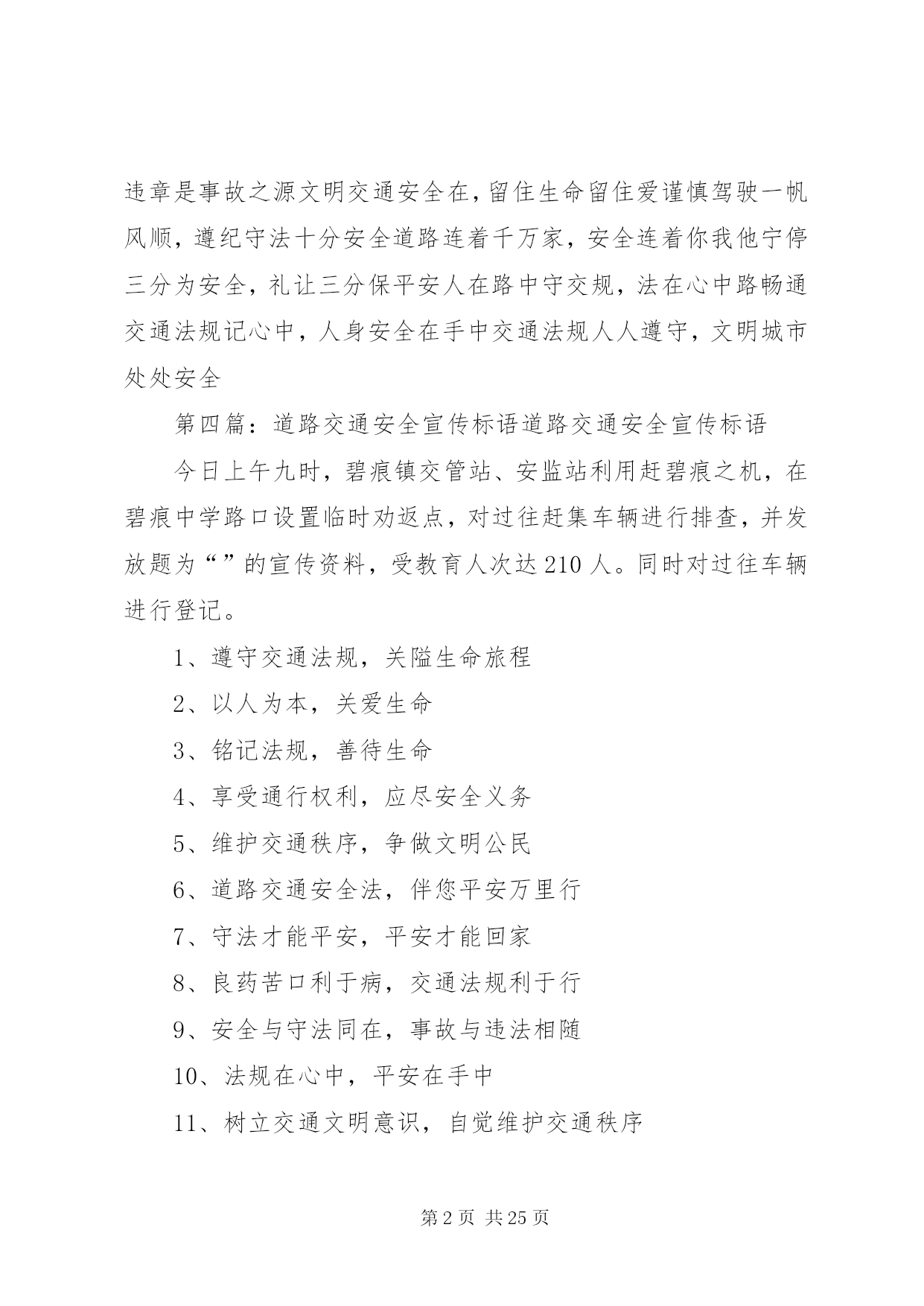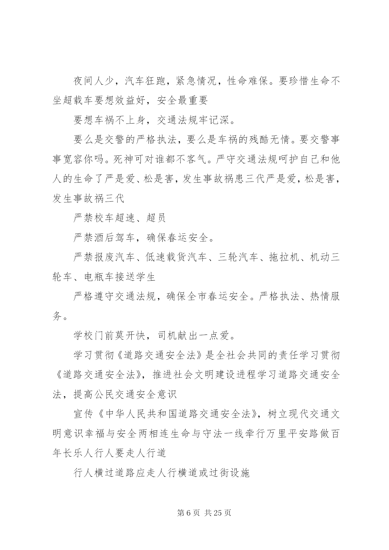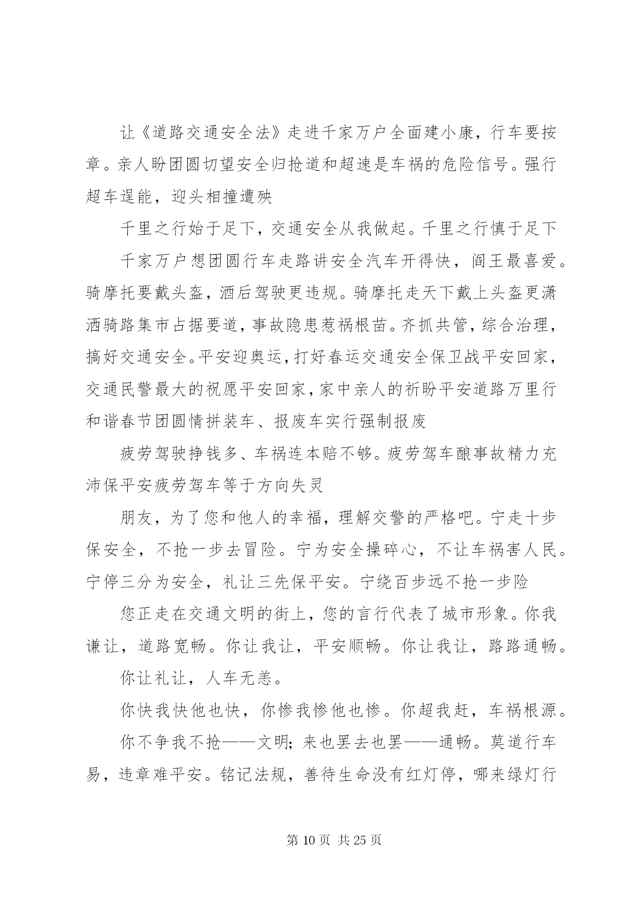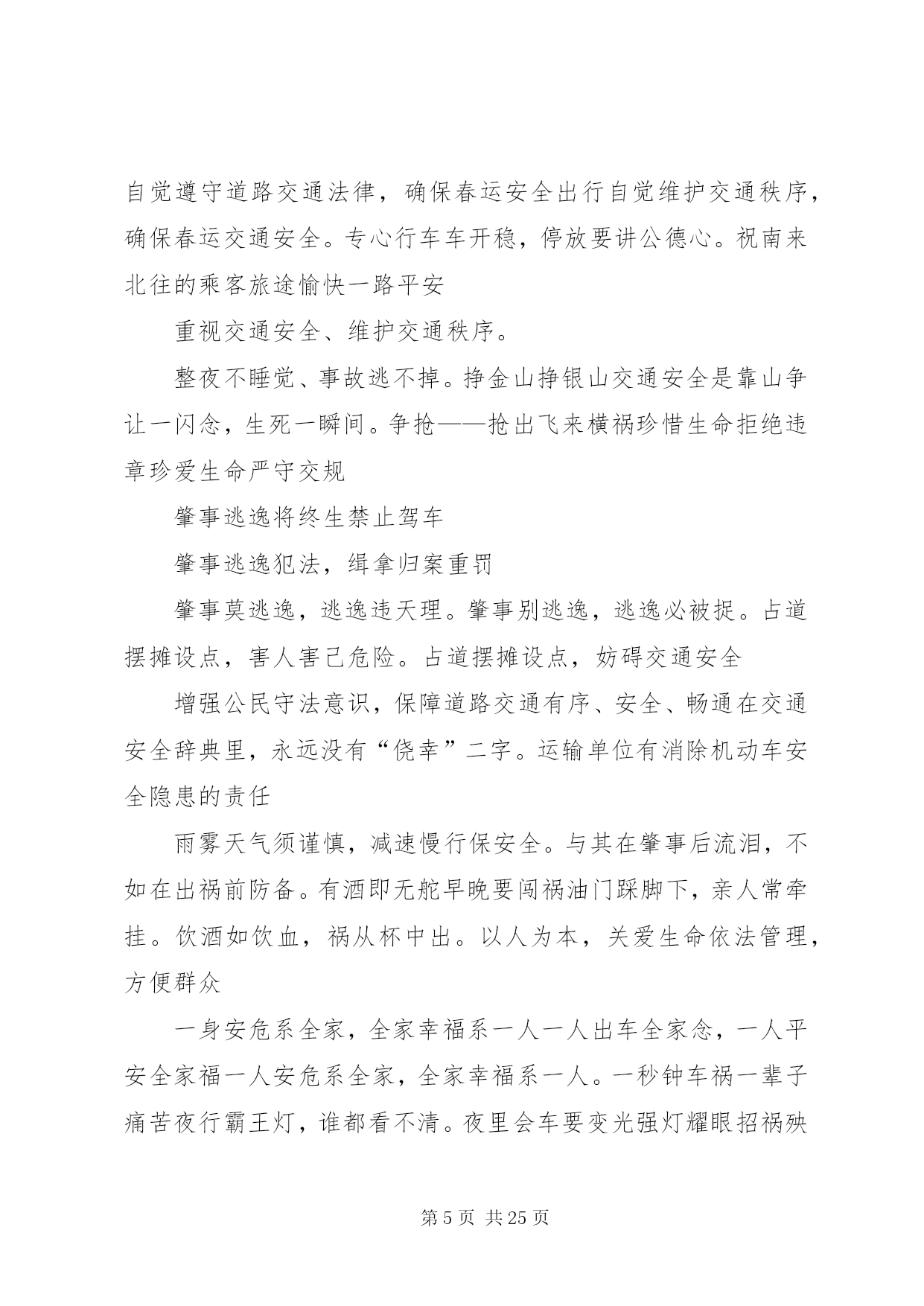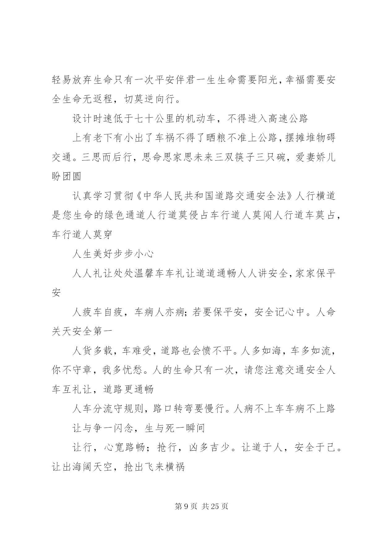 第PAGE\*Arabic\*MERGEFORMAT25页共NUMPAGES\*MERGEFORMAT25页道路交通安全标语急弯、坡陡、路窄,谨慎驾驶。关爱生命,不坐超员车,不坐报废车,不坐低速载货汽车和拖拉机不超速,不超员,不酒后驾驶,不疲劳驾驶。坡亲。过村路、咱慢点呦。”第二篇:道路交通安全标语道路交通安全宣传1、决战100天,确保“反违章、反违纪、强管理、保安全”专项道路交通安全整治活动取得实效。2、铭记交规,珍爱生命。3、人人不违章,安全有保障。4、恪守交规,法律为您生命护航。5、遵守交通法规,是对您自己负责。6、醉(罪)在酒中、毁(悔)在杯中。7、出行时,切记系上交通法规这条安全带。8、开违章车,流事故泪。9、红灯短暂,生命无限。10、贪一时之快,悔一生之恨。第三篇:道路交通安全宣传标语良药苦口利于病,交通法规利于行金玉有值,生命无价,遵守交法,平安一生安全是生命之本,违章是事故之源文明交通安全在,留住生命留住爱谨慎驾驶一帆风顺,遵纪守法十分安全道路连着千万家,安全连着你我他宁停三分为安全,礼让三分保平安人在路中守交规,法在心中路畅通交通法规记心中,人身安全在手中交通法规人人遵守,文明城市处处安全第四篇:道路交通安全宣传标语道路交通安全宣传标语今日上午九时,碧痕镇交管站、安监站利用赶碧痕之机,在碧痕中学路口设置临时劝返点,对过往赶集车辆进行排查,并发放题为“”的宣传资料,受教育人次达210人。同时对过往车辆进行登记。1、遵守交通法规,关隘生命旅程2、以人为本,关爱生命3、铭记法规,善待生命4、享受通行权利,应尽安全义务5、维护交通秩序,争做文明公民6、道路交通安全法,伴您平安万里行7、守法才能平安,平安才能回家8、良药苦口利于病,交通法规利于行9、安全与守法同在,事故与违法相随10、法规在心中,平安在手中11、树立交通文明意识,自觉维护交通秩序12、但愿人长久,一路共平安13、道路千万条,安全第一条14、行路慎为本,开车礼当先16、彼此让一让,路宽心舒畅17、防灾求得平安在,遵章换得平安来18、路好车好安全最好,慢行快行平安就行19、道路连者你和他,安全系着千万家20、守交规迎春夏秋冬福,保安全纳东西南北财21、交通安全进万家,出入平安你我他22、维护交通安全,关爱生命久远23、让道于人,安全于己24、车行万里路,走好每一步25、遵守交通法规,平安与你同在26、金玉有值,生命无价,遵守交法,平安一生27、树立现代交通意识,养成良好交通习惯28、交通法规人人遵守,文明村寨家家幸福29、安全是生命之本,违章是事故之源30、行路守法法有情,平安回家家温馨31、交通法规记心中,人身安全在手中32、跨入校园,好好学习;走出校门,好好走路33、宁停三分为安全,礼让三先保平安34、文明行路路畅通,平安回家家温馨35、文明交通安全在,留住生命留住爱36、谨慎驾驶一帆风顺,遵纪守法十分安全37、大家小家是一家,交通安全靠大家38、道路连着千万家,安全连着你我他做人以诚为本开车以慎为本遵章行驶、幸福伴随你;疲劳驾驶、害人又害己。遵章守法,各行其道遵章安全路路通,违章肇事步步险。遵守交通规则,安全伴你到永远。遵守交通法规是您对社会安宁作一份贡献。遵守交通法规是公民应尽的义务。遵守交通法规共筑春运畅通遵守交通法规,维护司机形象。遵守交通法规,平安与你同在。遵守交通法规,关爱生命旅程遵守交通法,安全你我他遵守交规保安全欢欢喜喜过新春遵守交规储蓄安全遵守交法,远离车祸。遵守《道路交通安全法》,行车、走路有保障醉人驾车,易成罪人。醉(罪)在酒中毁(悔)在杯中最大限度地预防道路交通事故,保卫人民生命财产安全走上人行横道线,生命安全有保障走路行车不抢道,文明安全最重要。自觉遵守道路交通法律,确保春运安全出行自觉维护交通秩序,确保春运交通安全。专心行车车开稳,停放要讲公德心。祝南来北往的乘客旅途愉快一路平安重视交通安全、维护交通秩序。整夜不睡觉、事故逃不掉。挣金山挣银山交通安全是靠山争让一闪念,生死一瞬间。争抢——抢出飞来横祸珍惜生命拒绝违章珍爱生命严守交规肇事逃逸将终生禁止驾车肇事逃逸犯法,缉拿归案重罚肇事莫逃逸,逃逸违天理。肇事别逃逸,逃逸必被捉。占道摆摊设点,害人害己危险。占道摆摊设点,妨碍交通安全增强公民守法意识,保障道路交通有序、安全、畅通在交通安全辞典里,永远没有“侥幸”二字。运输单位有消除机动车安全隐患的责任雨雾天气须谨慎,减速慢行保安全。与其在肇事后流泪,不如在出祸前防备。有酒即无舵早晚要闯祸油门踩脚下,亲人常牵挂。饮酒如饮血,祸从杯中出。以人为本,关爱生命依法管理,方便群众一身安危系全家,全家幸福系一人一人出车全家念,一人平安全家福一人安危系全家,全家幸福系一人。一秒钟车祸一辈子痛苦夜行霸王灯,谁都看不清。夜
