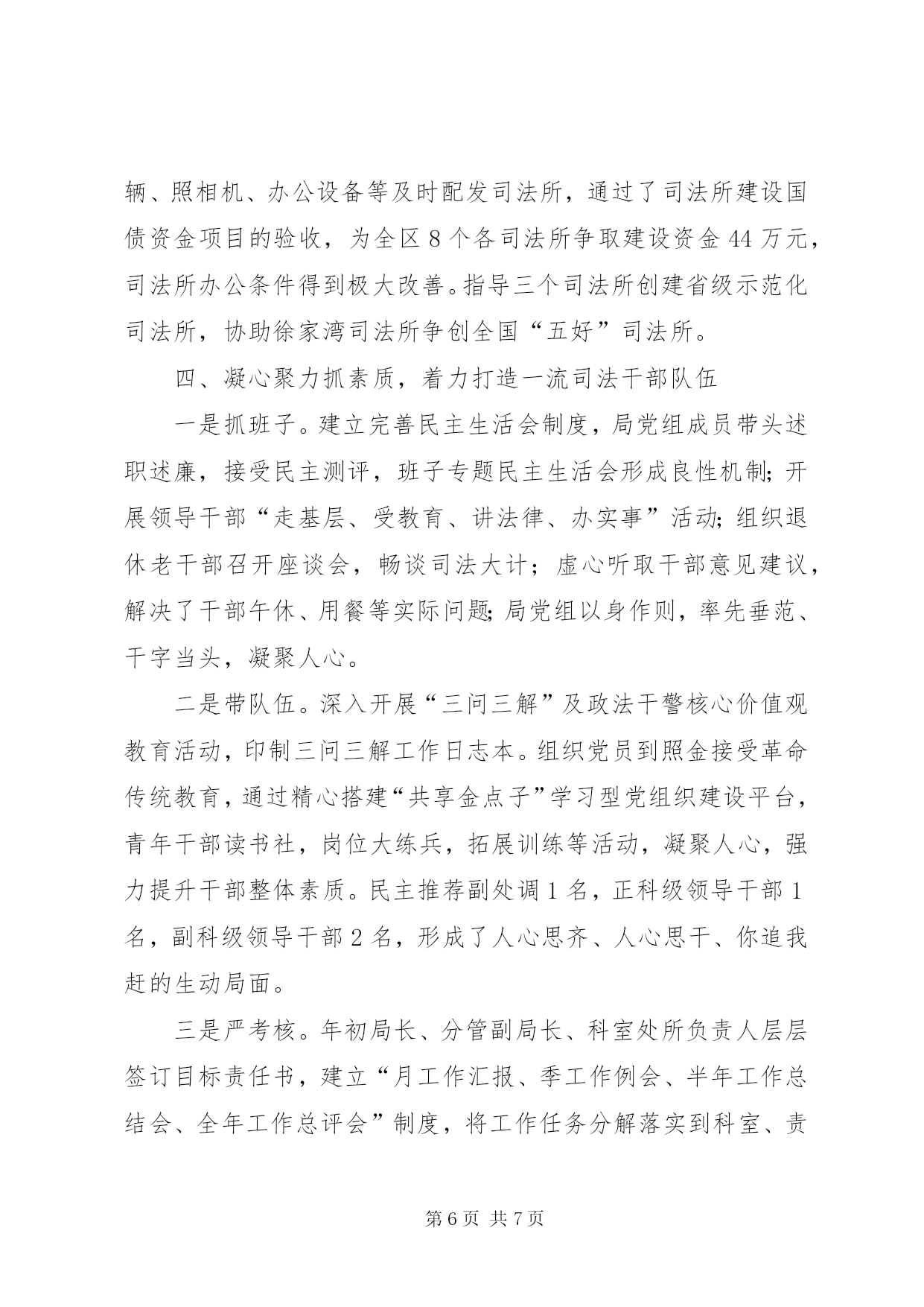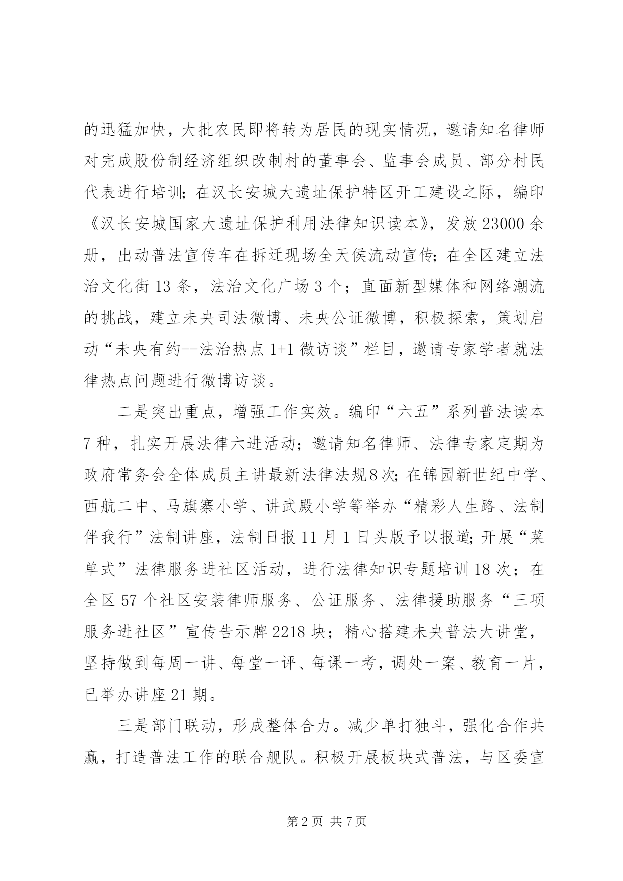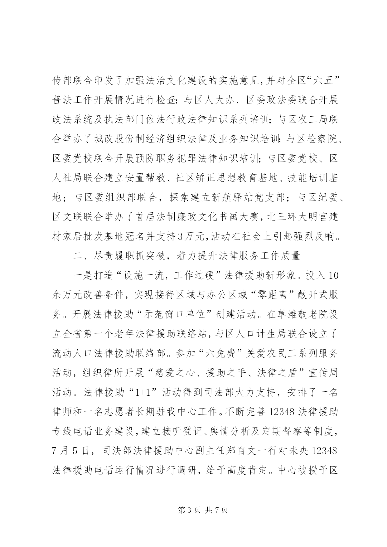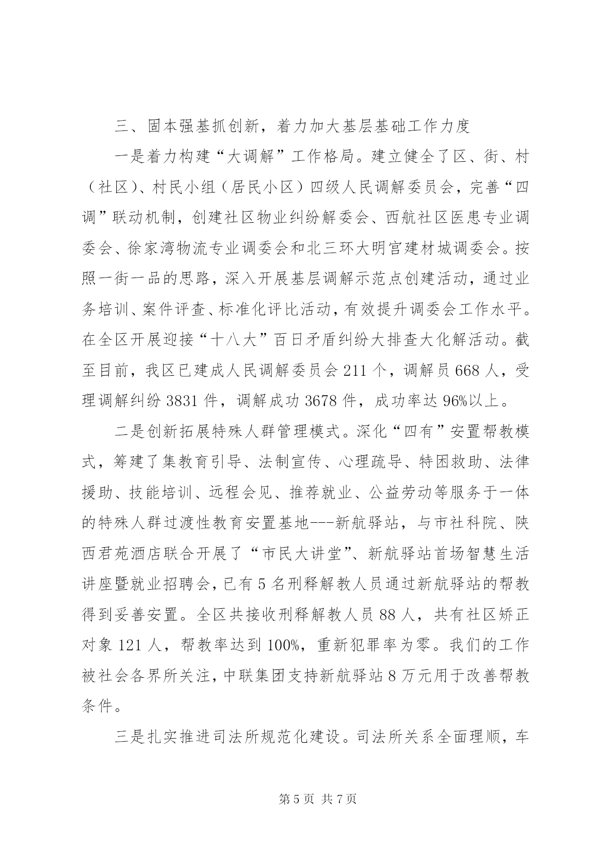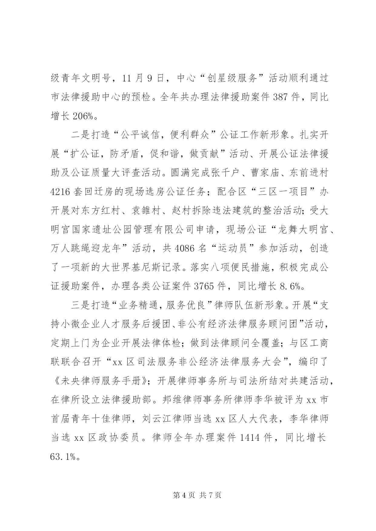 第PAGE\*Arabic\*MERGEFORMAT7页共NUMPAGES\*MERGEFORMAT7页区司法局年度工作报告20xx年,在区委、区政府的正确领导和市局的精心指导下,我局以“普法促发展、调解建和谐、安置保稳定”三大基础建设为抓手,紧紧围绕全区中心工作,树立务实的作风、建设一流的硬件、创新实用的模式、激活基层的活力、打造过硬的队伍,凝心聚力,主动作为,圆满完成了全年目标任务,为十八大的顺利召开创造了和谐稳定的社会环境。有33个集体,31人(次)荣获先进,我区被司法部确定为全国“六五”普法依法治理工作联系点(全省唯一区县),被省司法厅推荐为全国法治区,全国法律援助示范窗口创建活动先进单位,档案工作高分通过省级3a认证,司法业务用房项目取得突破性进展,走在全省前列。司法部党组成员、政治部主任张彦珍,司法部法律援助中心副主任郑自文,省委常委、政法委书记安东,省司法厅厅长路志强,市委常委、常务副市长岳华峰,原市委常委、政法委书记杜航伟,市司法局局长郭秦林等领导先后多次莅临视察指导工作。《法制日报》、《华商报》、《法制之窗》、《xx日报》、《xx日报》、《西部法制报》、陕西普法网、西安电视台先后报道区司法局工作46次,区委每日情况全年刊登司法局工作动态61条。现将全年工作汇报如下。一、围绕中心抓重点,着力增强普法依法治理工作效果一是紧跟热点,服务地区发展。面对xx区城中村改造速度的迅猛加快,大批农民即将转为居民的现实情况,邀请知名律师对完成股份制经济组织改制村的董事会、监事会成员、部分村民代表进行培训;在汉长安城大遗址保护特区开工建设之际,编印《汉长安城国家大遗址保护利用法律知识读本》,发放23000余册,出动普法宣传车在拆迁现场全天侯流动宣传;在全区建立法治文化街13条,法治文化广场3个;直面新型媒体和网络潮流的挑战,建立未央司法微博、未央公证微博,积极探索,策划启动“未央有约--法治热点1+1微访谈”栏目,邀请专家学者就法律热点问题进行微博访谈。二是突出重点,增强工作实效。编印“六五”系列普法读本7种,扎实开展法律六进活动;邀请知名律师、法律专家定期为政府常务会全体成员主讲最新法律法规8次;在锦园新世纪中学、西航二中、马旗寨小学、讲武殿小学等举办“精彩人生路、法制伴我行”法制讲座,法制日报11月1日头版予以报道;开展“菜单式”法律服务进社区活动,进行法律知识专题培训18次;在全区57个社区安装律师服务、公证服务、法律援助服务“三项服务进社区”宣传告示牌2218块;精心搭建未央普法大讲堂,坚持做到每周一讲、每堂一评、每课一考,调处一案、教育一片,已举办讲座21期。三是部门联动,形成整体合力。减少单打独斗,强化合作共赢,打造普法工作的联合舰队。积极开展板块式普法,与区委宣传部联合印发了加强法治文化建设的实施意见,并对全区“六五”普法工作开展情况进行检查;与区人大办、区委政法委联合开展政法系统及执法部门依法行政法律知识系列培训;与区农工局联合举办了城改股份制经济组织法律及业务知识培训;与区检察院、区委党校联合开展预防职务犯罪法律知识培训;与区委党校、区人社局联合建立安置帮教、社区矫正思想教育基地、技能培训基地;与区委组织部联合,探索建立新航驿站党支部;与区纪委、区文联联合举办了首届法制廉政文化书画大赛,北三环大明宫建材家居批发基地冠名并支持3万元,活动在社会上引起强烈反响。二、尽责履职抓突破,着力提升法律服务工作质量一是打造“设施一流,工作过硬”法律援助新形象。投入10余万元改善条件,实现接待区域与办公区域“零距离”敞开式服务。开展法律援助“示范窗口单位”创建活动。在草滩敬老院设立全省第一个老年法律援助联络站,与区人口计生局联合设立了流动人口法律援助联络部。参加“六免费”关爱农民工系列服务活动,组织律所开展“慈爱之心、援助之手、法律之盾”宣传周活动。法律援助“1+1”活动得到司法部大力支持,安排了一名律师和一名志愿者长期驻我中心工作。不断完善12348法律援助专线电话业务建设,建立接听登记、舆情分析及定期督察等制度,7月5日,司法部法律援助中心副主任郑自文一行对未央12348法律援助电话运行情况进行调研,给予高度肯定。中心被授予区级青年文明号,11月9日,中心“创星级服务”活动顺利通过市法律援助中心的预检。全年共办理法律援助案件387件,同比增长206%。二是打造“公平诚信,便利群众”公证工作新形象。扎实开展“扩公证,防矛盾,促和谐,做贡献”活动、开展公证法律援助及公证质量大评查活动。圆满完成张千户、曹家庙、东前进村4216套回迁房的现场选房公证任务;配合区“三区一项目”办开展对东方红村、袁雒村、赵村拆除违法建筑的整治活动;受大明宫国家遗址公园管理有限公司申请,现场公证“龙舞大明宫、万人跳绳迎龙年”活