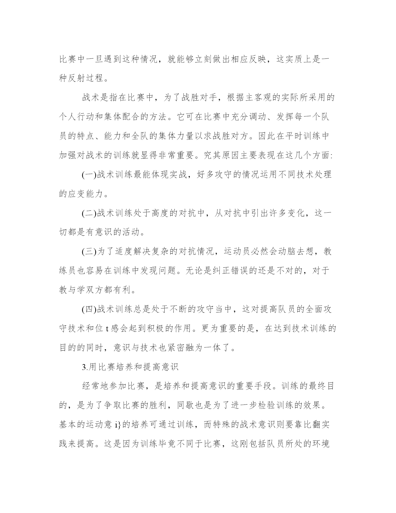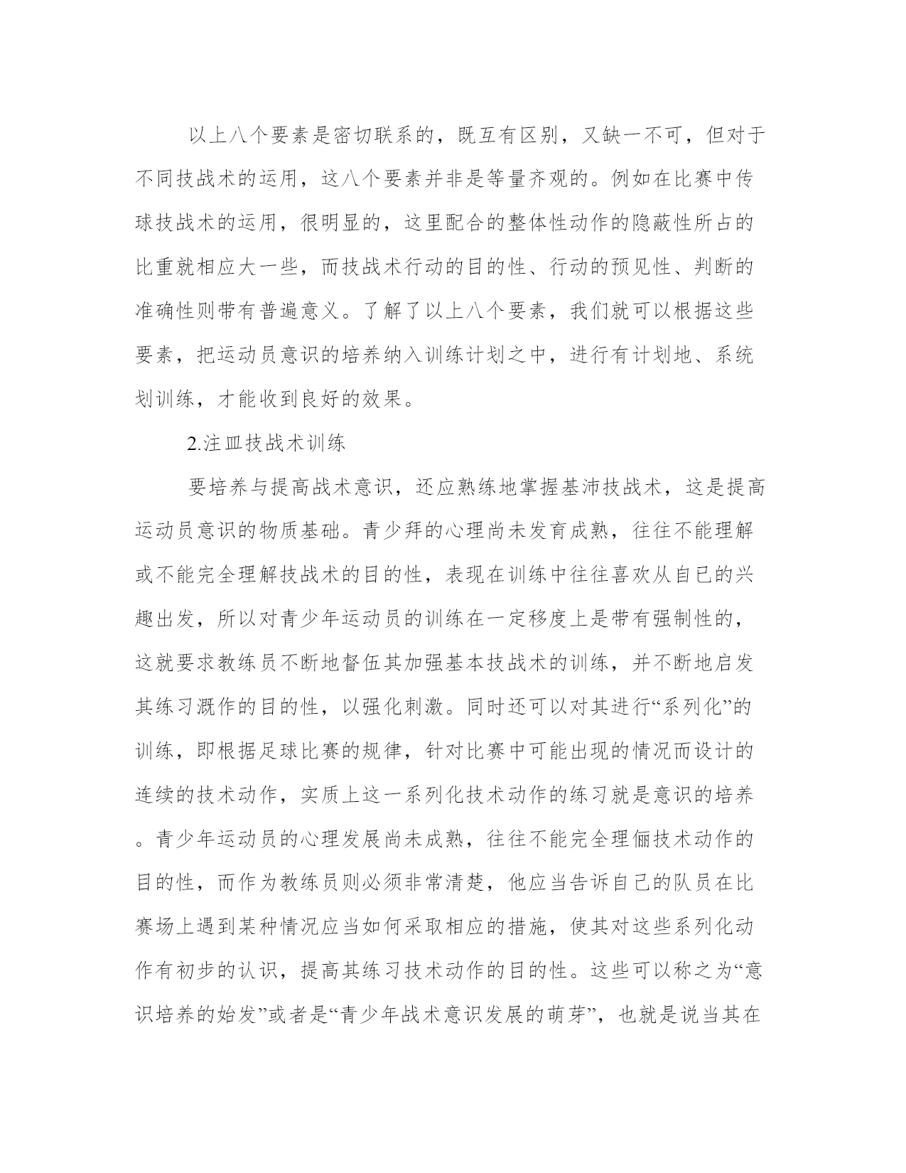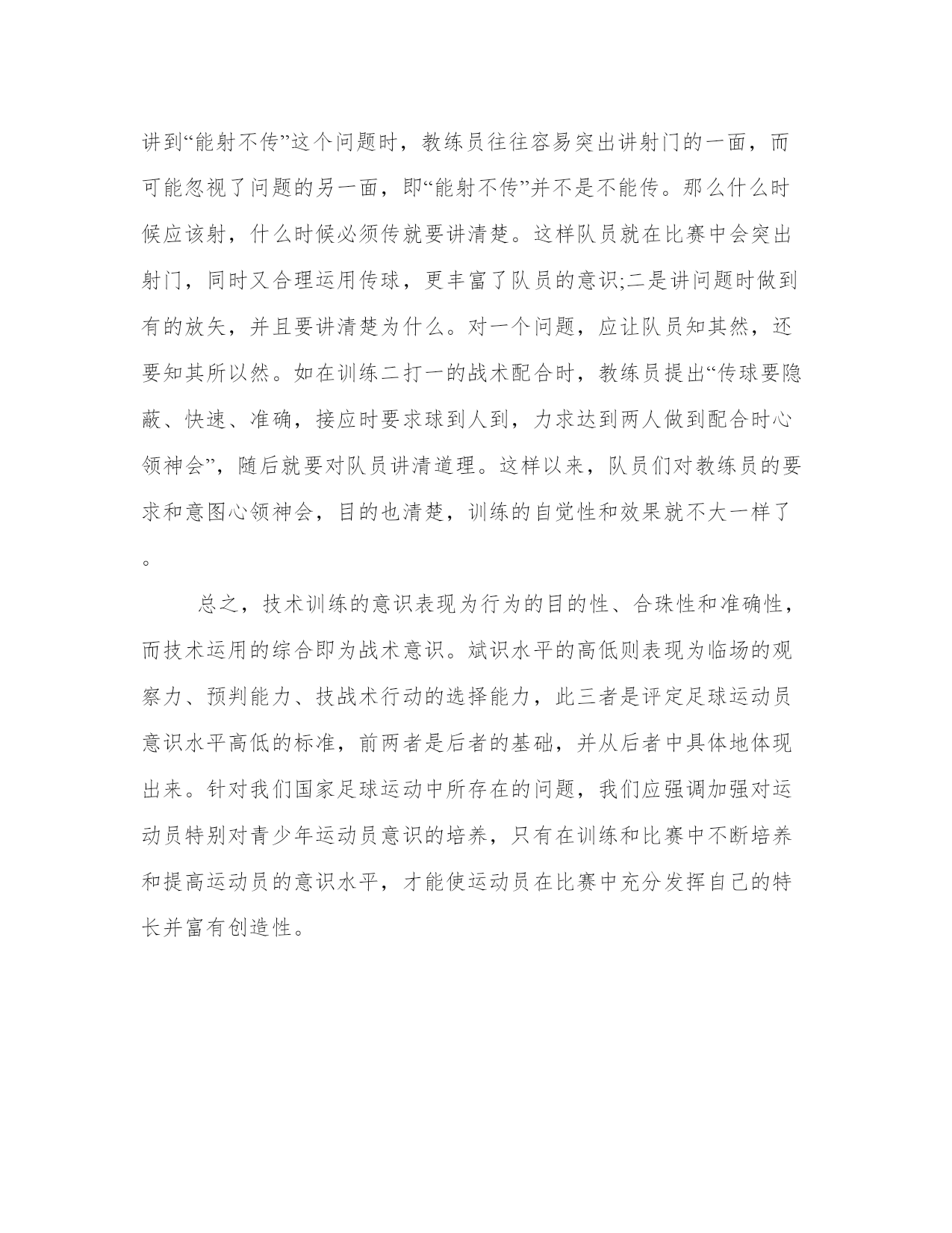青少年运动员足球意识的培养与训练论文【论文摘要】意识对一个足球运动员来说非常重要,是衡量一名运动员水平高低的重要因素之一。足球意识的培养需要长期的训练、比赛的积累。青少年正是培养足球意识的黄金时期,但目前少年运动,尤其是学校业余运动员的初级训练,往往是重技术、轻意识;重结果、轻过程。为此有必要加强青少年足球运动员意识的培养与训练。足球训练中的意识是指:“足球比赛中的各种技术、战术手段在运动员头脑中的反映,是运动员在进行技术、战术活动时自觉的心理活动。”这被称为足球运动员最宝贵精髓。应变能力越强的运动员,其意识就越强。但综观我国青少年足球运动员,这一点都是比较薄弱的,比赛场上常出现许多不符合足球发展或不合理的现象,如经常漏入、传完球不动、场上位置感差、丢了球不抢、该传的却带、该带却乱传、没有补位的意识、看球不看人等等。这些情况的出现势必影响到运动队朝高水平方向发展。为此有必要加强青少年足球运动员意识的培养与训练。意识的培养与训练可以从以下几个方面着手。1.加强战术意识训练战术意识训练包括以下八大要素:技术的目的性(是为了实现何种战术目的)、行动的预见性(判断同伴及对手的意图)、判断的准确性、进攻的主动性、防守的积极性、战术的灵活性(临场的应变能力)、动作的隐蔽性、配合的整体性(或称立体性)。以上八个要素是密切联系的,既互有区别,又缺一不可,但对于不同技战术的运用,这八个要素并非是等量齐观的。例如在比赛中传球技战术的运用,很明显的,这里配合的整体性动作的隐蔽性所占的比重就相应大一些,而技战术行动的目的性、行动的预见性、判断的准确性则带有普遍意义。了解了以上八个要素,我们就可以根据这些要素,把运动员意识的培养纳入训练计划之中,进行有计划地、系统划训练,才能收到良好的效果。2.注皿技战术训练要培养与提高战术意识,还应熟练地掌握基沛技战术,这是提高运动员意识的物质基础。青少拜的心理尚未发育成熟,往往不能理解或不能完全理解技战术的目的性,表现在训练中往往喜欢从自已的兴趣出发,所以对青少年运动员的训练在一定移度上是带有强制性的,这就要求教练员不断地督伍其加强基本技战术的训练,并不断地启发其练习溉作的目的性,以强化刺激。同时还可以对其进行“系列化”的训练,即根据足球比赛的规律,针对比赛中可能出现的情况而设计的连续的技术动作,实质上这一系列化技术动作的练习就是意识的培养。青少年运动员的心理发展尚未成熟,往往不能完全理俪技术动作的目的性,而作为教练员则必须非常清楚,他应当告诉自己的队员在比赛场上遇到某种情况应当如何采取相应的措施,使其对这些系列化动作有初步的认识,提高其练习技术动作的目的性。这些可以称之为“意识培养的始发”或者是“青少年战术意识发展的萌芽”,也就是说当其在比赛中一旦遇到这种情况,就能够立刻做出相应反映,这实质上是一种反射过程。战术是指在比赛中,为了战胜对手,根据主客观的实际所采用的个人行动和集体配合的方法。它可在比赛中充分调动、发挥每一个队员的特点、能力和全队的集体力量以求战胜对方。因此在平时训练中加强对战术的训练就显得非常重要。究其原因主要表现在这几个方面:(一)战术训练最能体现实战,好多攻守的情况运用不同技术处理的应变能力。(二)战术训练处于高度的对抗中,从对抗中引出许多变化,这一切都是有意识的活动。(三)为了适度解决复杂的对抗情况,运动员必然会动脑去想,教练员也容易在训练中发现问题。无论是纠正错误的还是不对的,对于教与学双方都有利。(四)战术训练总是处于不断的攻守当中,这对提高队员的全面攻守技术和位t感会起到积极的作用。更为重要的是,在达到技术训练的目的的同时,意识与技术也紧密融为一体了。3.用比赛培养和提高意识经常地参加比赛,是培养和提高意识的重要手段。训练的最终目的,是为了争取比赛的胜利,同歇也是为了进一步检验训练的效果。基本的运动意i}的培养可通过训练,而特殊的战术意识则要靠比翻实践来提高。这是因为训练毕竟不同于比赛,这刚包括队员所处的环境、对手的特点、对抗的激烈程度等都不相同。应当将训练与比赛实际结合起来,犯比赛作为训练内容的组成部分。当然,这并不意叶着一定要参加许许多多的大型正式比赛来提高队员的战术意识,这是不现实、也是不必要的。可以根振大型正式比赛的要求来组织模拟比赛,这就要求教练员应当弄清所进行的模拟比赛与大型正式比赛对队员心理影响的差距,如场外噪声的干扰、对抗的激烈程度、队员对模拟比赛在思想上是否真正引起足够的重视等等,采取各种手段,以弥补和尽量缩小这些差距,以便使自己的队员的意识水平能够胜任任何大型的正式比赛。4.注意加强各技术动作“串变”训练所谓“串变”,即是指对运动员个人技术训练时所运用的一种方法。“串”就是指将几个单个的技术动作串在一起来训练;“变”就是指在颠球时应有