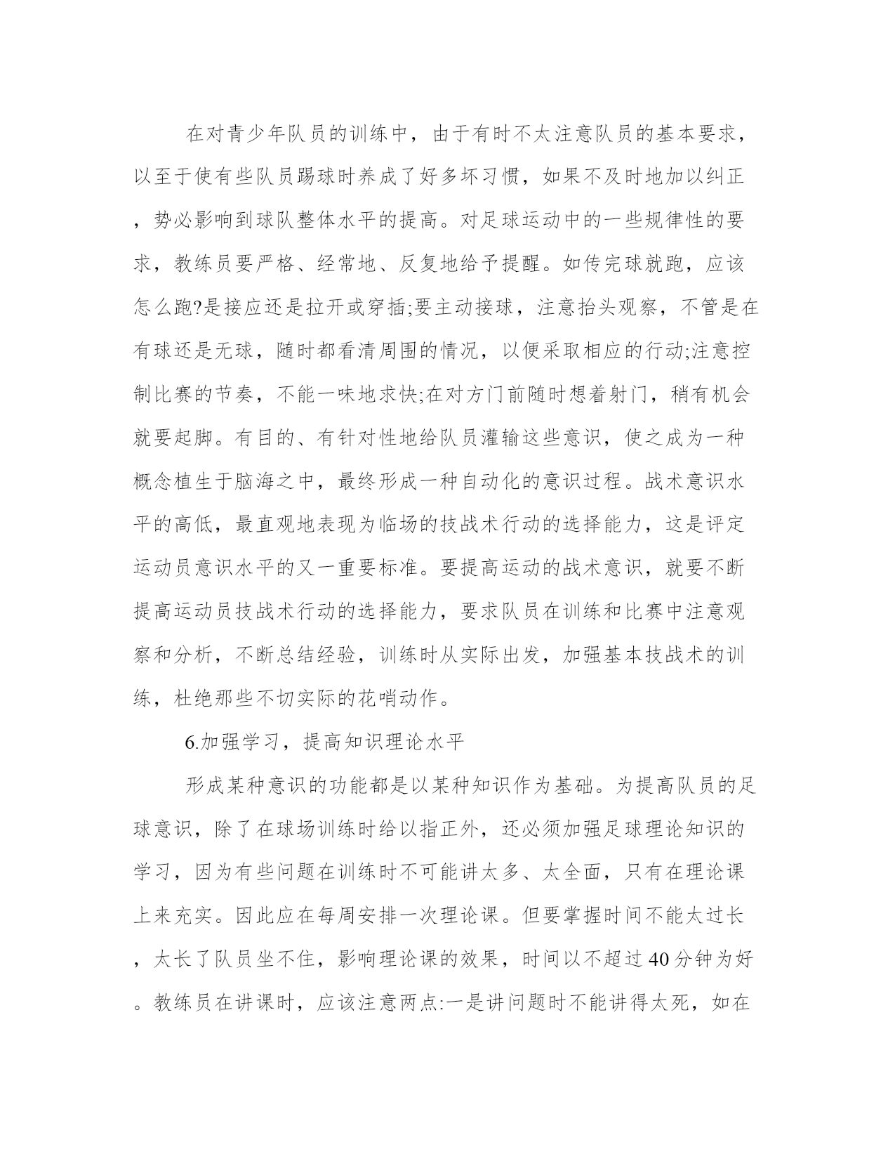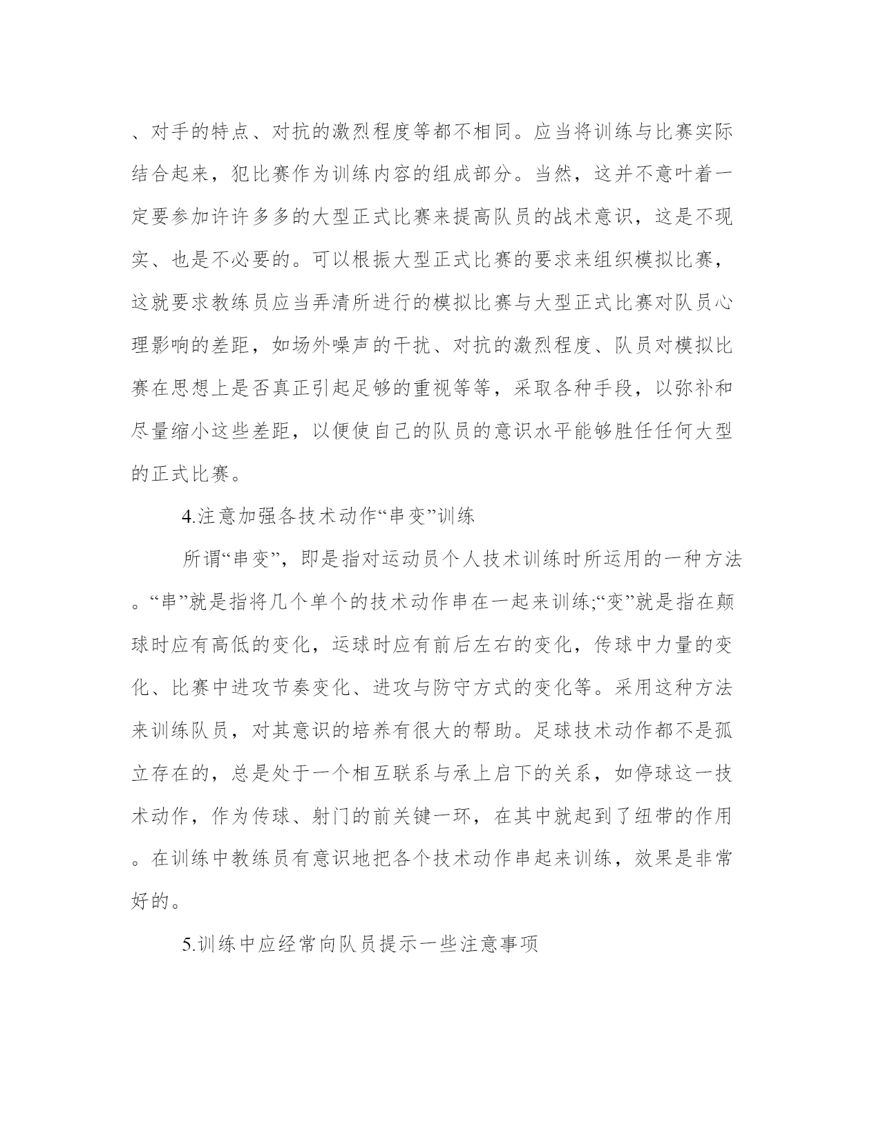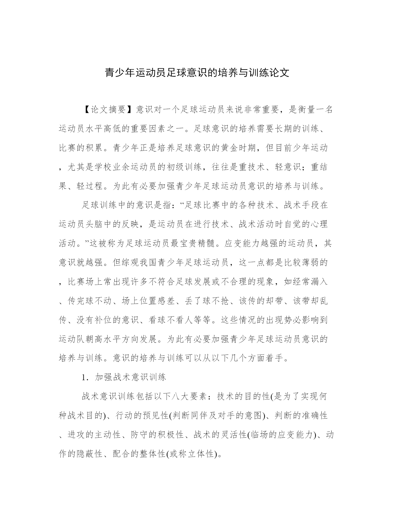 青少年运动员足球意识的培养与训练论文【论文摘要】意识对一个足球运动员来说非常重要,是衡量一名运动员水平高低的重要因素之一。足球意识的培养需要长期的训练、比赛的积累。青少年正是培养足球意识的黄金时期,但目前少年运动,尤其是学校业余运动员的初级训练,往往是重技术、轻意识;重结果、轻过程。为此有必要加强青少年足球运动员意识的培养与训练。足球训练中的意识是指:“足球比赛中的各种技术、战术手段在运动员头脑中的反映,是运动员在进行技术、战术活动时自觉的心理活动。”这被称为足球运动员最宝贵精髓。应变能力越强的运动员,其意识就越强。但综观我国青少年足球运动员,这一点都是比较薄弱的,比赛场上常出现许多不符合足球发展或不合理的现象,如经常漏入、传完球不动、场上位置感差、丢了球不抢、该传的却带、该带却乱传、没有补位的意识、看球不看人等等。这些情况的出现势必影响到运动队朝高水平方向发展。为此有必要加强青少年足球运动员意识的培养与训练。意识的培养与训练可以从以下几个方面着手。1.加强战术意识训练战术意识训练包括以下八大要素:技术的目的性(是为了实现何种战术目的)、行动的预见性(判断同伴及对手的意图)、判断的准确性、进攻的主动性、防守的积极性、战术的灵活性(临场的应变能力)、动作的隐蔽性、配合的整体性(或称立体性)。以上八个要素是密切联系的,既互有区别,又缺一不可,但对于不同技战术的运用,这八个要素并非是等量齐观的。例如在比赛中传球技战术的运用,很明显的,这里配合的整体性动作的隐蔽性所占的比重就相应大一些,而技战术行动的目的性、行动的预见性、判断的准确性则带有普遍意义。了解了以上八个要素,我们就可以根据这些要素,把运动员意识的培养纳入训练计划之中,进行有计划地、系统划训练,才能收到良好的效果。2.注皿技战术训练要培养与提高战术意识,还应熟练地掌握基沛技战术,这是提高运动员意识的物质基础。青少拜的心理尚未发育成熟,往往不能理解或不能完全理解技战术的目的性,表现在训练中往往喜欢从自已的兴趣出发,所以对青少年运动员的训练在一定移度上是带有强制性的,这就要求教练员不断地督伍其加强基本技战术的训练,并不断地启发其练习溉作的目的性,以强化刺激。同时还可以对其进行“系列化”的训练,即根据足球比赛的规律,针对比赛中可能出现的情况而设计的连续的技术动作,实质上这一系列化技术动作的练习就是意识的培养。青少年运动员的心理发展尚未成熟,往往不能完全理俪技术动作的目的性,而作为教练员则必须非常清楚,他应当告诉自己的队员在比赛场上遇到某种情况应当如何采取相应的措施,使其对这些系列化动作有初步的认识,提高其练习技术动作的目的性。这些可以称之为“意识培养的始发”或者是“青少年战术意识发展的萌芽”,也就是说当其在比赛中一旦遇到这种情况,就能够立刻做出相应反映,这实质上是一种反射过程。战术是指在比赛中,为了战胜对手,根据主客观的实际所采用的个人行动和集体配合的方法。它可在比赛中充分调动、发挥每一个队员的特点、能力和全队的集体力量以求战胜对方。因此在平时训练中加强对战术的训练就显得非常重要。究其原因主要表现在这几个方面:(一)战术训练最能体现实战,好多攻守的情况运用不同技术处理的应变能力。(二)战术训练处于高度的对抗中,从对抗中引出许多变化,这一切都是有意识的活动。(三)为了适度解决复杂的对抗情况,运动员必然会动脑去想,教练员也容易在训练中发现问题。无论是纠正错误的还是不对的,对于教与学双方都有利。(四)战术训练总是处于不断的攻守当中,这对提高队员的全面攻守技术和位t感会起到积极的作用。更为重要的是,在达到技术训练的目的的同时,意识与技术也紧密融为一体了。3.用比赛培养和提高意识经常地参加比赛,是培养和提高意识的重要手段。训练的最终目的,是为了争取比赛的胜利,同歇也是为了进一步检验训练的效果。基本的运动意i}的培养可通过训练,而特殊的战术意识则要靠比翻实践来提高。这是因为训练毕竟不同于比赛,这刚包括队员所处的环境、对手的特点、对抗的激烈程度等都不相同。应当将训练与比赛实际结合起来,犯比赛作为训练内容的组成部分。当然,这并不意叶着一定要参加许许多多的大型正式比赛来提高队员的战术意识,这是不现实、也是不必要的。可以根振大型正式比赛的要求来组织模拟比赛,这就要求教练员应当弄清所进行的模拟比赛与大型正式比赛对队员心理影响的差距,如场外噪声的干扰、对抗的激烈程度、队员对模拟比赛在思想上是否真正引起足够的重视等等,采取各种手段,以弥补和尽量缩小这些差距,以便使自己的队员的意识水平能够胜任任何大型的正式比赛。4.注意加强各技术动作“串变”训练所谓“串变”,即是指对运动员个人技术训练时所运用的一种方法。“串”就是指将几个单个的技术动作串在一起来训练;“变”就是指在颠球时应有