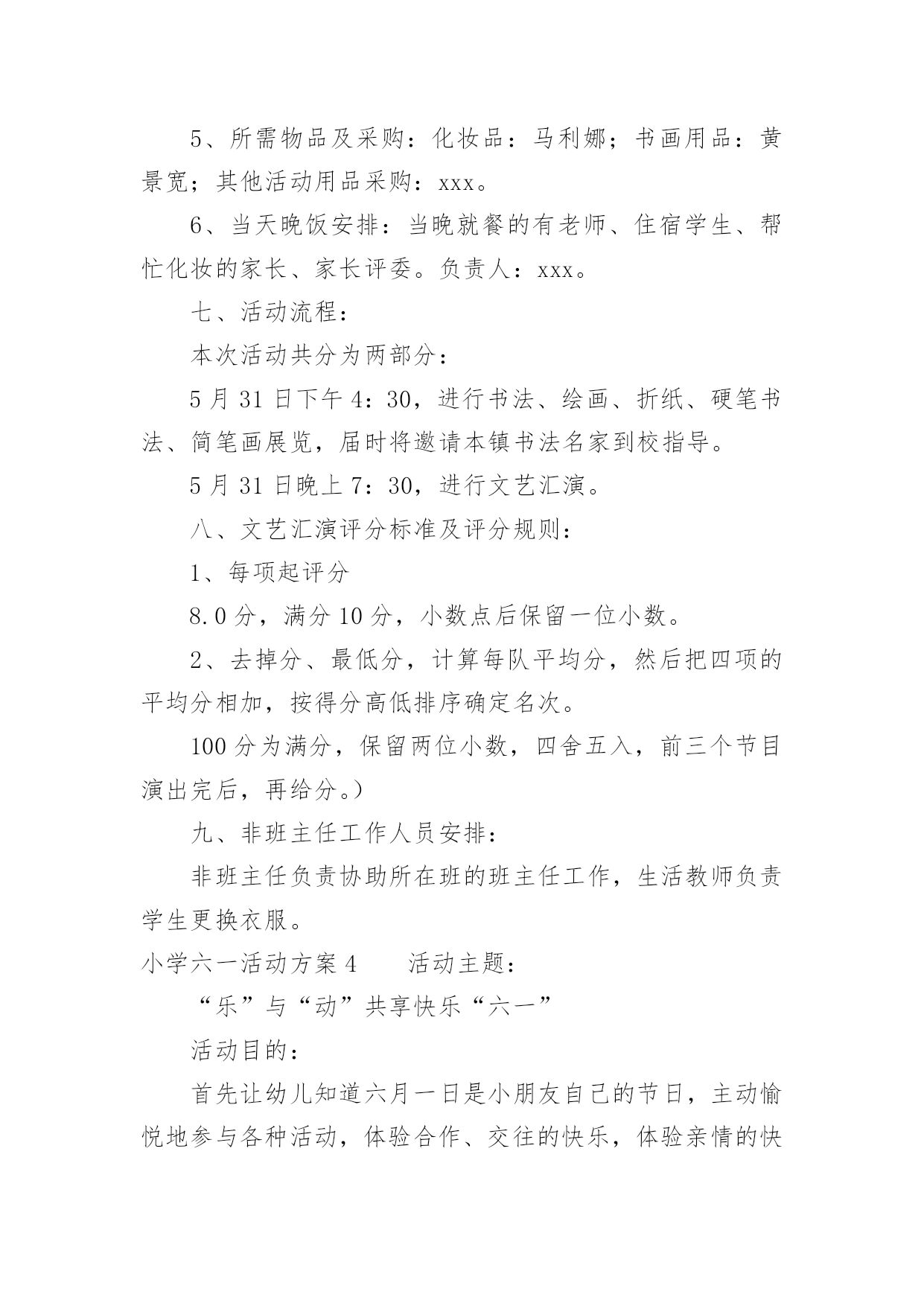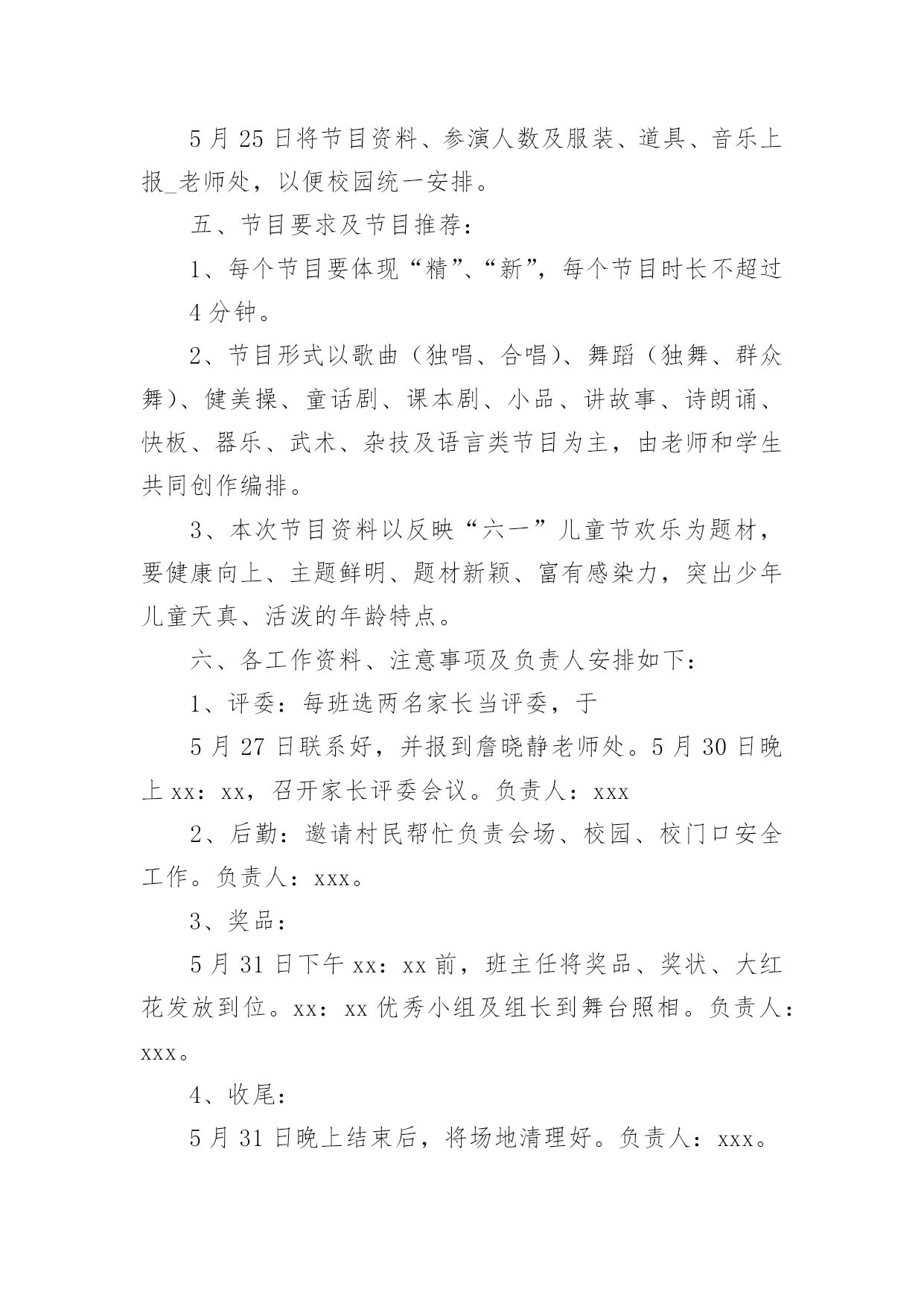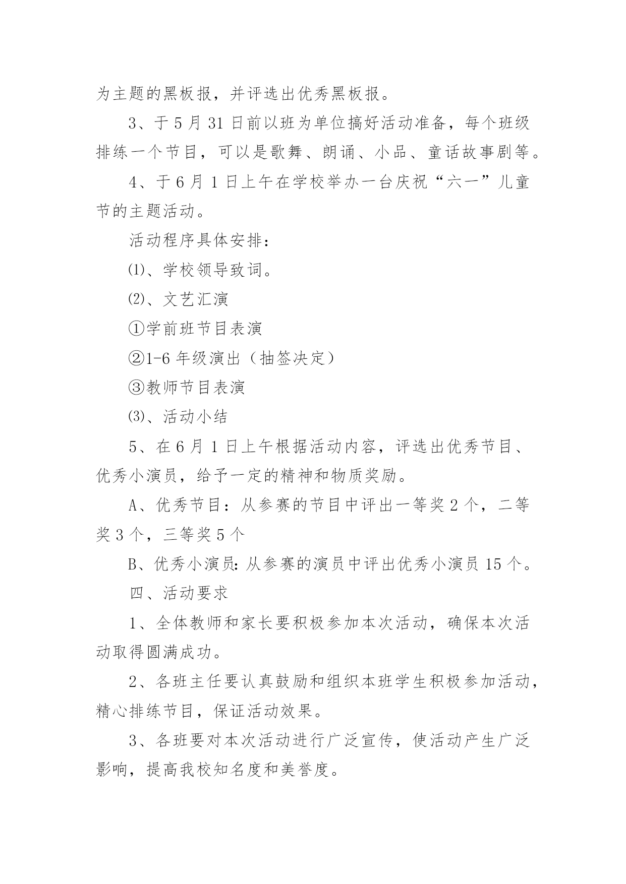 小学六一活动方案小学六一活动方案实用15篇为确保事情或工作高质量高水平开展,通常会被要求事先制定方案,方案是从目的、要求、方式、方法、进度等都部署具体、周密,并有很强可操作性的计划。那么我们该怎么去写方案呢?以下是小编为大家整理的小学六一活动方案,希望能够帮助到大家。小学六一活动方案1“六一”儿童节是少年儿童最隆重的一个节日,为隆重庆祝20xx年“六一”儿童节,我校将开展系列活动,为确保庆祝活动顺利进行,制定本方案。一、活动目标通过开展系列庆祝“六一”儿童节活动,使我校学生在积极参与活动中体验合作与交往的快乐,度过一个愉快、难忘、有意义的.“六一”儿童节,从而激发学生热爱生活、热爱学习、热爱校园的情感;通过向家长、社会展示我校学生的“六一”儿童节活动,进一步塑造我校积极向上、健康发展的良好形象。二、活动主题精诚合作、共享成长。三、活动安排1、于5月31日前布置好富有喜庆气氛的教室及学校周边环境,张贴宣传“六一”儿童节的标语。2、于5月31日前每班出好一期以庆祝“六一”儿童节为主题的黑板报,并评选出优秀黑板报。3、于5月31日前以班为单位搞好活动准备,每个班级排练一个节目,可以是歌舞、朗诵、小品、童话故事剧等。4、于6月1日上午在学校举办一台庆祝“六一”儿童节的主题活动。活动程序具体安排:⑴、学校领导致词。⑵、文艺汇演①学前班节目表演②1-6年级演出(抽签决定)③教师节目表演⑶、活动小结5、在6月1日上午根据活动内容,评选出优秀节目、优秀小演员,给予一定的精神和物质奖励。A、优秀节目:从参赛的节目中评出一等奖2个,二等奖3个,三等奖5个B、优秀小演员:从参赛的演员中评出优秀小演员15个。四、活动要求1、全体教师和家长要积极参加本次活动,确保本次活动取得圆满成功。2、各班主任要认真鼓励和组织本班学生积极参加活动,精心排练节目,保证活动效果。3、各班要对本次活动进行广泛宣传,使活动产生广泛影响,提高我校知名度和美誉度。小学六一活动方案2“六一”国际儿童节即将来临,为了贯彻落实南和县的联通知精神,让我校全体同学过一个丰富多彩、富有教育意义的“六一”国际儿童节,现根据本校实际,现将庆祝“六一”国际儿童节系列主题活动作如下安排。一、活动目的:1、邀请家长参与学校、学生活动。使学校、家长、学生有一个相互交流的机会。2、举行新队员入队仪式,使每位新入队的少先队员感受到自己的光荣,记住这个难忘的六一。3、各中队组织队员开展各种形式的'表演活动,使学生度过一个愉快而有意义的六一。二、活动内容:1、发展新队员,各班将新队员名单于5月29日前上报少先队大队部。每班至少准备一个节目(节目类型可以是舞蹈、相声、小品朗诵、合唱等),班主任、科任教师及音乐教师组织排练,于5月29日前将节目上报到少先队大队部。1、全校师生及其学生家长积极参与此项活动。2、各班正副班主任做好本中队各种形式的表演准备工作。3、要求一、年级班主任做好学生入队前的准备工作。三、注意事项:1、组织教育活动,关心每一位学生,通过活动的开展,展示我校学生的风采。2、六一活动时间安排只是其中的一个点,将活动与学生的德育教育有机结合,并能够长期坚持开展。3、开展活动的要以安全为前提,确保学生过一个安全、快乐、和谐、健康的六一儿童节。小学六一活动方案3一、活动目的:为给我校儿童学子搭建一个培养潜力,丰富我校文化生活,展现才华的舞台,激发学生热爱学习、热爱生活、热爱校园的情感,提高学生的全面素质,也让学生度过一个祥和、快乐、向上的“六一”国际儿童节。我校将精心安排庆“六一”文艺汇演活动。二、活动主题:为了让孩子们过一个更快乐的“六一儿童节”,我们本次的'活动主题是“一个也不能少”,每个班两个节目,其中一个节目务必是群众节目,所有的孩子都参加,让每一个孩子在属于他们的节日里,都能收获一份快乐!一份勇敢!一份自信!三、时间安排:20xx年5月31日。四、组织方法:1、以班级为单位参赛,每个单位出2个节目,参赛节目由班主任和其他科任教师调配时间进行指导与训练。2、为了保证节目的质量,各单位在5月25日将节目资料、参演人数及服装、道具、音乐上报_老师处,以便校园统一安排。五、节目要求及节目推荐:1、每个节目要体现“精”、“新”,每个节目时长不超过4分钟。2、节目形式以歌曲(独唱、合唱)、舞蹈(独舞、群众舞)、健美操、童话剧、课本剧、小品、讲故事、诗朗诵、快板、器乐、武术、杂技及语言类节目为主,由老师和学生共同创作编排。3、本次节目资料以反映“六一”儿童节欢乐为题材,要健康向上、主题鲜明、题材新颖、富有感染力,突出少年儿童天真、活泼的年龄特点。六、各工作资料、注意事项及负责人安排如下:1、评委:每班选两名家长当评委,于5月27日联系好,并报到詹晓静老师处。5月30日晚上xx:xx,召开家长评委会议。负责