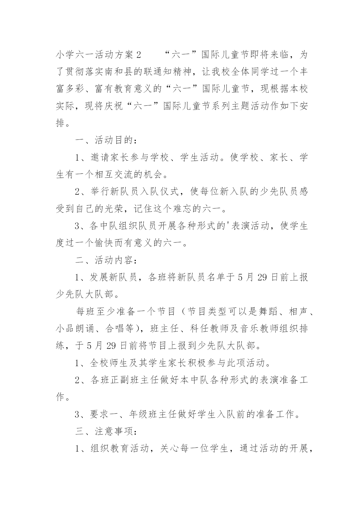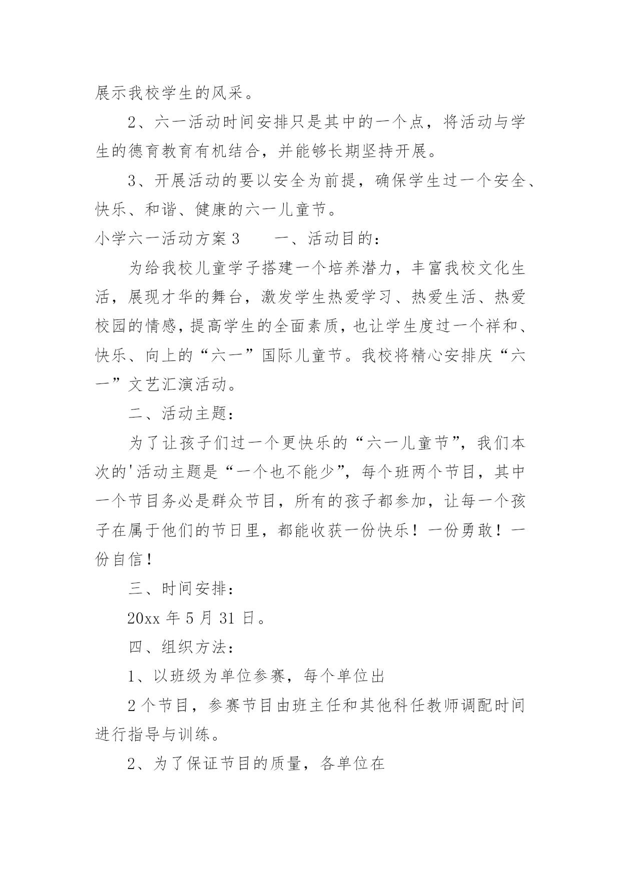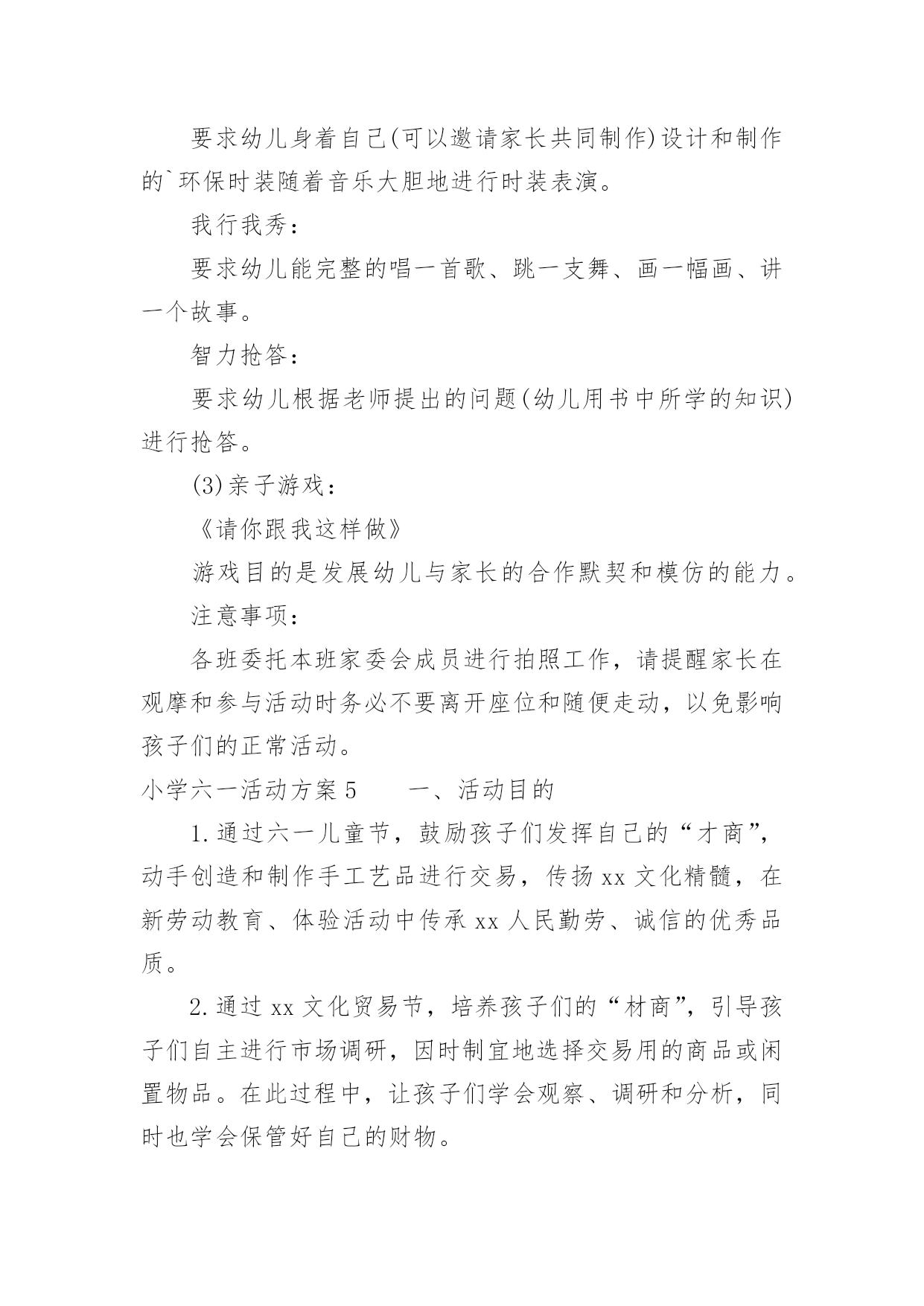 小学六一活动方案小学六一活动方案实用15篇为确保事情或工作高质量高水平开展,通常会被要求事先制定方案,方案是从目的、要求、方式、方法、进度等都部署具体、周密,并有很强可操作性的计划。那么我们该怎么去写方案呢?以下是小编为大家整理的小学六一活动方案,希望能够帮助到大家。小学六一活动方案1“六一”儿童节是少年儿童最隆重的一个节日,为隆重庆祝20xx年“六一”儿童节,我校将开展系列活动,为确保庆祝活动顺利进行,制定本方案。一、活动目标通过开展系列庆祝“六一”儿童节活动,使我校学生在积极参与活动中体验合作与交往的快乐,度过一个愉快、难忘、有意义的.“六一”儿童节,从而激发学生热爱生活、热爱学习、热爱校园的情感;通过向家长、社会展示我校学生的“六一”儿童节活动,进一步塑造我校积极向上、健康发展的良好形象。二、活动主题精诚合作、共享成长。三、活动安排1、于5月31日前布置好富有喜庆气氛的教室及学校周边环境,张贴宣传“六一”儿童节的标语。2、于5月31日前每班出好一期以庆祝“六一”儿童节为主题的黑板报,并评选出优秀黑板报。3、于5月31日前以班为单位搞好活动准备,每个班级排练一个节目,可以是歌舞、朗诵、小品、童话故事剧等。4、于6月1日上午在学校举办一台庆祝“六一”儿童节的主题活动。活动程序具体安排:⑴、学校领导致词。⑵、文艺汇演①学前班节目表演②1-6年级演出(抽签决定)③教师节目表演⑶、活动小结5、在6月1日上午根据活动内容,评选出优秀节目、优秀小演员,给予一定的精神和物质奖励。A、优秀节目:从参赛的节目中评出一等奖2个,二等奖3个,三等奖5个B、优秀小演员:从参赛的演员中评出优秀小演员15个。四、活动要求1、全体教师和家长要积极参加本次活动,确保本次活动取得圆满成功。2、各班主任要认真鼓励和组织本班学生积极参加活动,精心排练节目,保证活动效果。3、各班要对本次活动进行广泛宣传,使活动产生广泛影响,提高我校知名度和美誉度。小学六一活动方案2“六一”国际儿童节即将来临,为了贯彻落实南和县的联通知精神,让我校全体同学过一个丰富多彩、富有教育意义的“六一”国际儿童节,现根据本校实际,现将庆祝“六一”国际儿童节系列主题活动作如下安排。一、活动目的:1、邀请家长参与学校、学生活动。使学校、家长、学生有一个相互交流的机会。2、举行新队员入队仪式,使每位新入队的少先队员感受到自己的光荣,记住这个难忘的六一。3、各中队组织队员开展各种形式的'表演活动,使学生度过一个愉快而有意义的六一。二、活动内容:1、发展新队员,各班将新队员名单于5月29日前上报少先队大队部。每班至少准备一个节目(节目类型可以是舞蹈、相声、小品朗诵、合唱等),班主任、科任教师及音乐教师组织排练,于5月29日前将节目上报到少先队大队部。1、全校师生及其学生家长积极参与此项活动。2、各班正副班主任做好本中队各种形式的表演准备工作。3、要求一、年级班主任做好学生入队前的准备工作。三、注意事项:1、组织教育活动,关心每一位学生,通过活动的开展,展示我校学生的风采。2、六一活动时间安排只是其中的一个点,将活动与学生的德育教育有机结合,并能够长期坚持开展。3、开展活动的要以安全为前提,确保学生过一个安全、快乐、和谐、健康的六一儿童节。小学六一活动方案3一、活动目的:为给我校儿童学子搭建一个培养潜力,丰富我校文化生活,展现才华的舞台,激发学生热爱学习、热爱生活、热爱校园的情感,提高学生的全面素质,也让学生度过一个祥和、快乐、向上的“六一”国际儿童节。我校将精心安排庆“六一”文艺汇演活动。二、活动主题:为了让孩子们过一个更快乐的“六一儿童节”,我们本次的'活动主题是“一个也不能少”,每个班两个节目,其中一个节目务必是群众节目,所有的孩子都参加,让每一个孩子在属于他们的节日里,都能收获一份快乐!一份勇敢!一份自信!三、时间安排:20xx年5月31日。四、组织方法:1、以班级为单位参赛,每个单位出2个节目,参赛节目由班主任和其他科任教师调配时间进行指导与训练。2、为了保证节目的质量,各单位在5月25日将节目资料、参演人数及服装、道具、音乐上报_老师处,以便校园统一安排。五、节目要求及节目推荐:1、每个节目要体现“精”、“新”,每个节目时长不超过4分钟。2、节目形式以歌曲(独唱、合唱)、舞蹈(独舞、群众舞)、健美操、童话剧、课本剧、小品、讲故事、诗朗诵、快板、器乐、武术、杂技及语言类节目为主,由老师和学生共同创作编排。3、本次节目资料以反映“六一”儿童节欢乐为题材,要健康向上、主题鲜明、题材新颖、富有感染力,突出少年儿童天真、活泼的年龄特点。六、各工作资料、注意事项及负责人安排如下:1、评委:每班选两名家长当评委,于5月27日联系好,并报到詹晓静老师处。5月30日晚上xx:xx,召开家长评委会议。负责