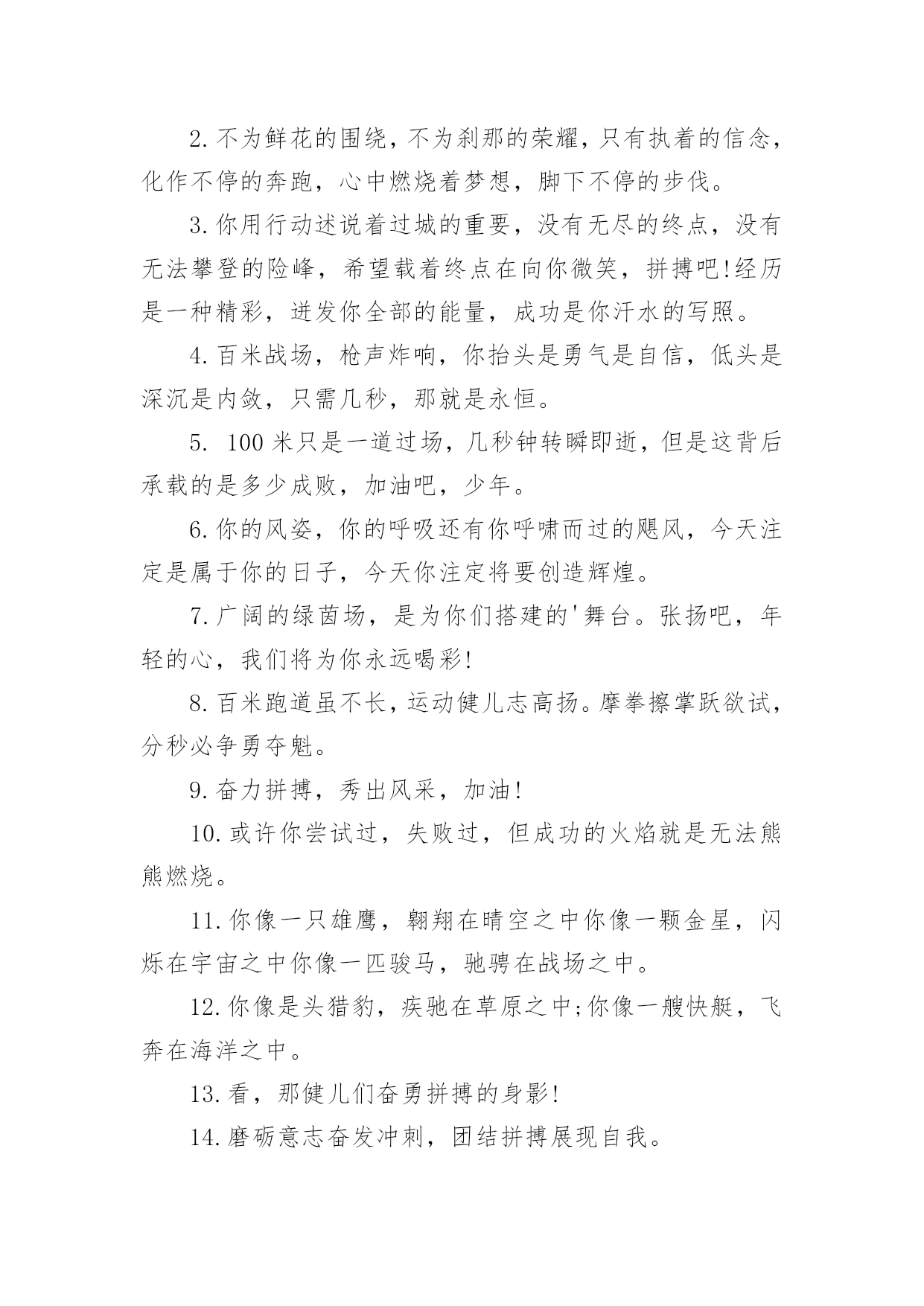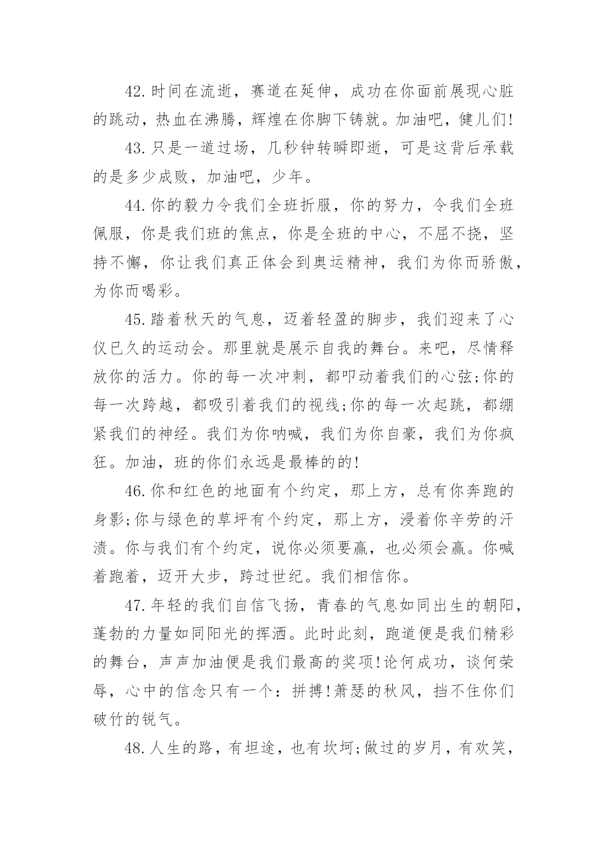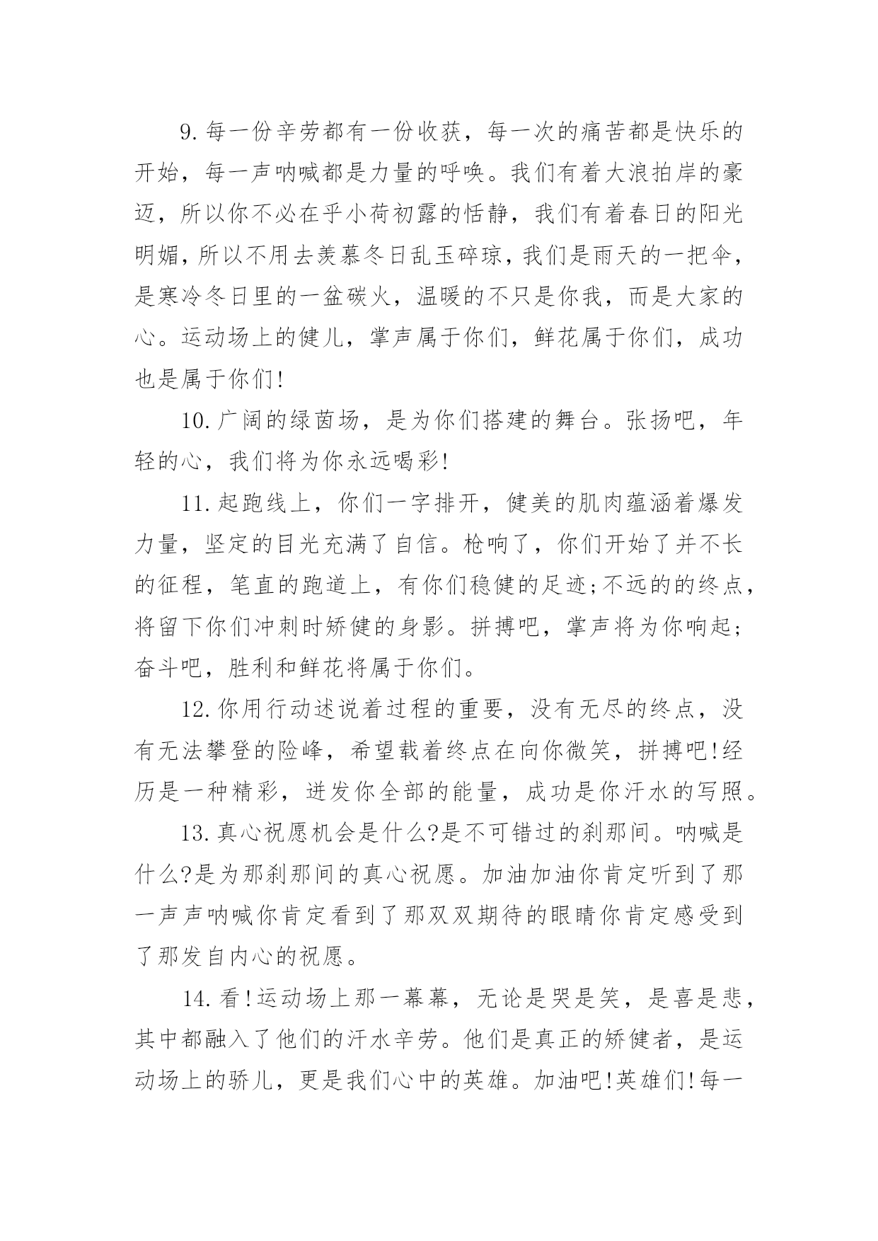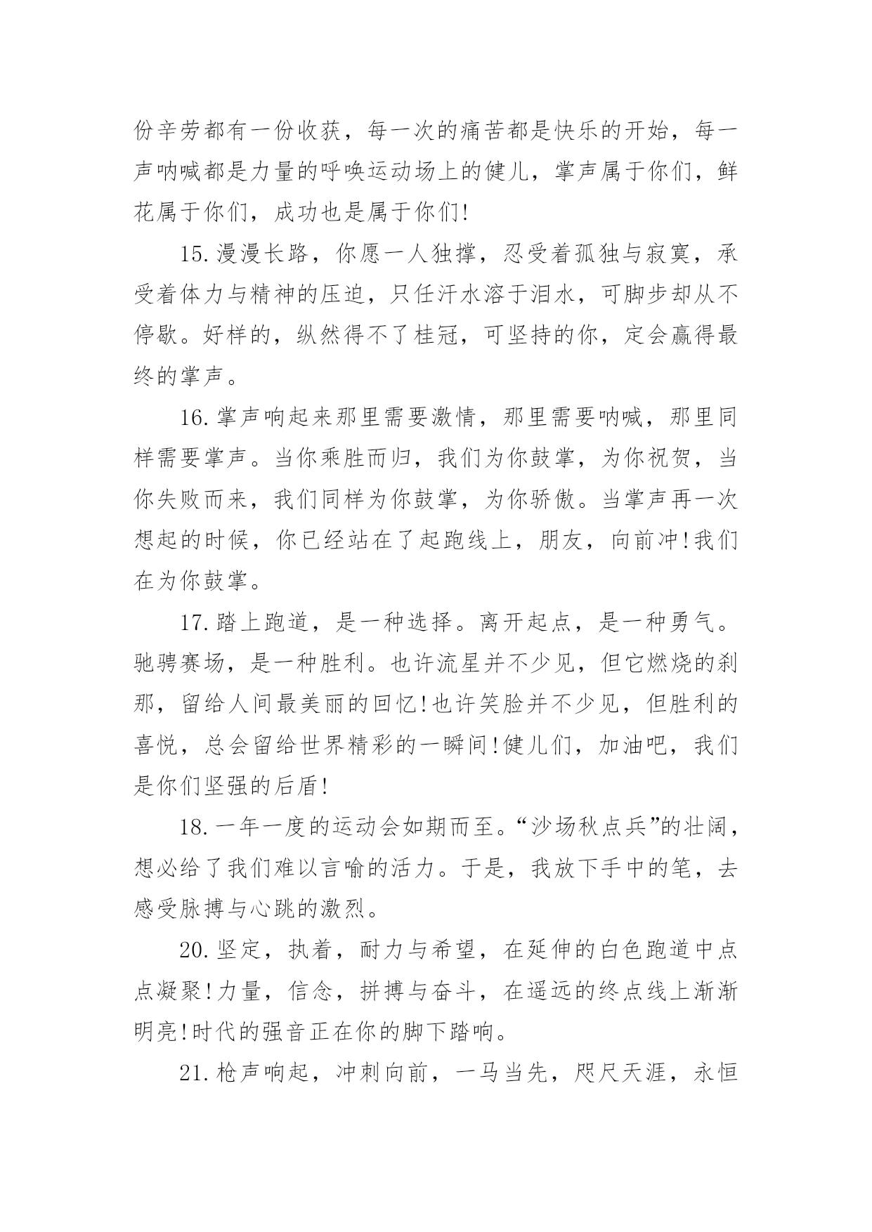 秋季运动会的加油稿秋季运动会的加油稿现如今,我们使用上加油稿的情况与日俱增,借助加油稿可以激励他人的士气。相信许多人会觉得加油稿很难写吧,下面是小编为大家整理的秋季运动会的加油稿,欢迎阅读与收藏。秋季运动会的加油稿1温暖的阳光洒在赛场上,男子乙组标枪的比赛即将开始。赛场上,一道道优美的弧线将轻盈地划过天空。健儿们用手中的标枪向距离的权限发起一轮又一轮的挑战。标枪在空中轻盈的姿态,是健儿们强健的力量和熟练的技巧的结合。谁能在这场激烈的竞争中获胜?让我们拭目以待,让我们为他们呐喊、助威吧!只有将力量与技巧合二为一的`人,才能获得胜利的桂冠!秋季运动会的加油稿21.你们处在最风光的一刻,无论第几坚持胜利的信心,只要跑下来,你们就是英雄。2.不为鲜花的围绕,不为刹那的荣耀,只有执着的信念,化作不停的奔跑,心中燃烧着梦想,脚下不停的步伐。3.你用行动述说着过城的重要,没有无尽的终点,没有无法攀登的险峰,希望载着终点在向你微笑,拼搏吧!经历是一种精彩,迸发你全部的能量,成功是你汗水的写照。4.百米战场,枪声炸响,你抬头是勇气是自信,低头是深沉是内敛,只需几秒,那就是永恒。5.100米只是一道过场,几秒钟转瞬即逝,但是这背后承载的是多少成败,加油吧,少年。6.你的风姿,你的呼吸还有你呼啸而过的飓风,今天注定是属于你的日子,今天你注定将要创造辉煌。7.广阔的绿茵场,是为你们搭建的'舞台。张扬吧,年轻的心,我们将为你永远喝彩!8.百米跑道虽不长,运动健儿志高扬。摩拳擦掌跃欲试,分秒必争勇夺魁。9.奋力拼搏,秀出风采,加油!10.或许你尝试过,失败过,但成功的火焰就是无法熊熊燃烧。11.你像一只雄鹰,翱翔在晴空之中你像一颗金星,闪烁在宇宙之中你像一匹骏马,驰骋在战场之中。12.你像是头猎豹,疾驰在草原之中;你像一艘快艇,飞奔在海洋之中。13.看,那健儿们奋勇拼搏的身影!14.磨砺意志奋发冲刺,团结拼搏展现自我。15.青春无悔、激情无限、顽强拼搏、勇夺第一。秋季运动会的加油稿31.动场上彩旗飘,运动健儿显英豪,加油!2.一根小小的木棒,连接的是团结和友爱一根小小的木棒,传递的是勇气和力量一根小小的木棒,演绎的是奋斗和拼搏加油吧!让这激动人心的时刻,一直回荡在我们心中!3.不为掌声的诠释,不为刻意的征服,只有辛勤的汗水化作追求的脚步,心中坚定的信念,脚下你的汗水洒在跑道,浇灌着成功的花朵开放。你的欢笑飞扬在赛场,为班争光数你最棒。跑吧,追吧在这广阔的赛场上,你似骏马似离铉的箭。跑吧,追吧你比虎猛比豹强。4.这是意志的拼搏,这是速度的挑战,胜利在向你们招手,胜利在向你们呼唤!5.你是否感到,烈日的照射那是烈日对你的祝福;你是否感到,彩旗的摇摆那是彩旗对你的呐喊人们的注视那是人们对你的希望,祝福在你身边呐喊在你耳边希望在你心中。的健儿,愿你们一展雄风,勇夺桂冠!6.不为掌声的注释,不为刻意的征服,不为失败的痛苦,仅有辛勤的汗水化作成功的脚步。8.你是运动场的心脏,跳动梦想;你是漫长路的精神,激励辉煌;你们是将上下求索的人!风为你加油,云为你助兴,坚定,执着,耐力与期望,在延伸的白色跑道中点点凝聚!力量,信念,拼搏与奋斗,在遥远的终点线上渐渐明亮!时代的强音正在你的脚下踏响。9.每一份辛劳都有一份收获,每一次的痛苦都是快乐的开始,每一声呐喊都是力量的呼唤。我们有着大浪拍岸的豪迈,所以你不必在乎小荷初露的恬静,我们有着春日的阳光明媚,所以不用去羡慕冬日乱玉碎琼,我们是雨天的一把伞,是寒冷冬日里的一盆碳火,温暖的不只是你我,而是大家的心。运动场上的健儿,掌声属于你们,鲜花属于你们,成功也是属于你们!10.广阔的绿茵场,是为你们搭建的舞台。张扬吧,年轻的心,我们将为你永远喝彩!11.起跑线上,你们一字排开,健美的肌肉蕴涵着爆发力量,坚定的目光充满了自信。枪响了,你们开始了并不长的征程,笔直的跑道上,有你们稳健的足迹;不远的的终点,将留下你们冲刺时矫健的身影。拼搏吧,掌声将为你响起;奋斗吧,胜利和鲜花将属于你们。12.你用行动述说着过程的重要,没有无尽的终点,没有无法攀登的险峰,希望载着终点在向你微笑,拼搏吧!经历是一种精彩,迸发你全部的能量,成功是你汗水的写照。13.真心祝愿机会是什么?是不可错过的刹那间。呐喊是什么?是为那刹那间的真心祝愿。加油加油你肯定听到了那一声声呐喊你肯定看到了那双双期待的眼睛你肯定感受到了那发自内心的祝愿。14.看!运动场上那一幕幕,无论是哭是笑,是喜是悲,其中都融入了他们的汗水辛劳。他们是真正的矫健者,是运动场上的骄儿,更是我们心中的英雄。加油吧!英雄们!每一份辛劳都有一份收获,每一次的痛苦都是快乐的开始,每一声呐喊都是力量的呼唤运动场上的健儿,掌声属于你们,鲜花属于你们,成功也是属于你们!15.漫漫长路,你愿一人独撑,忍受着孤独