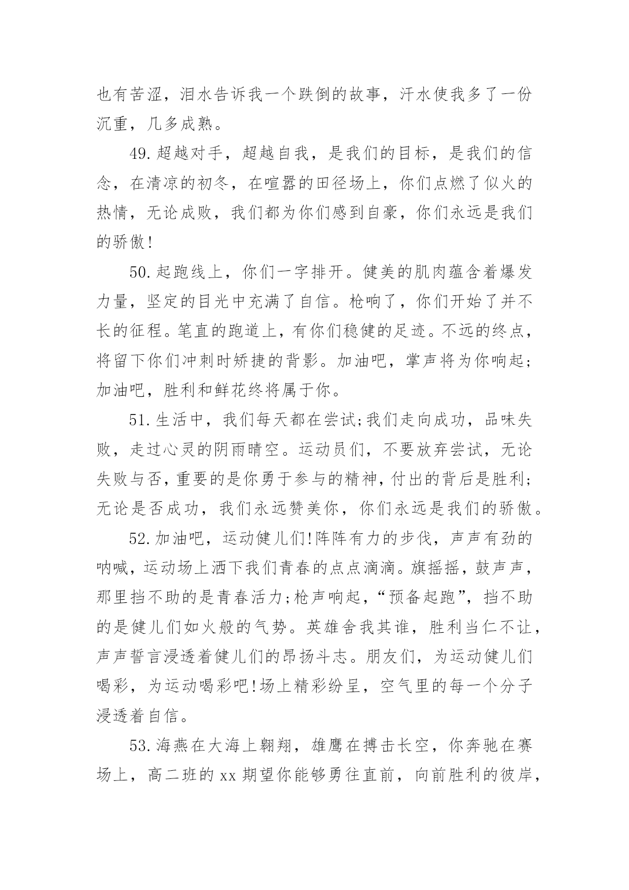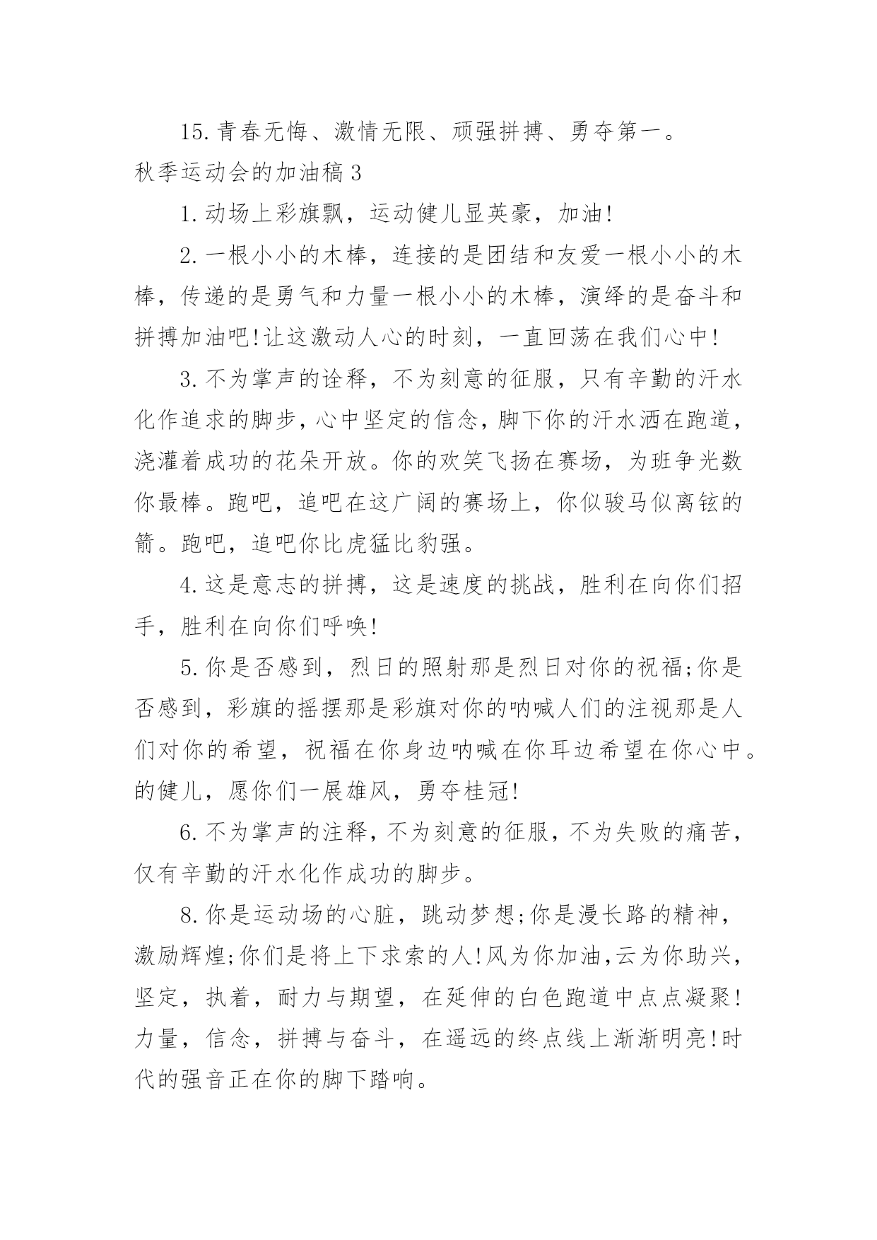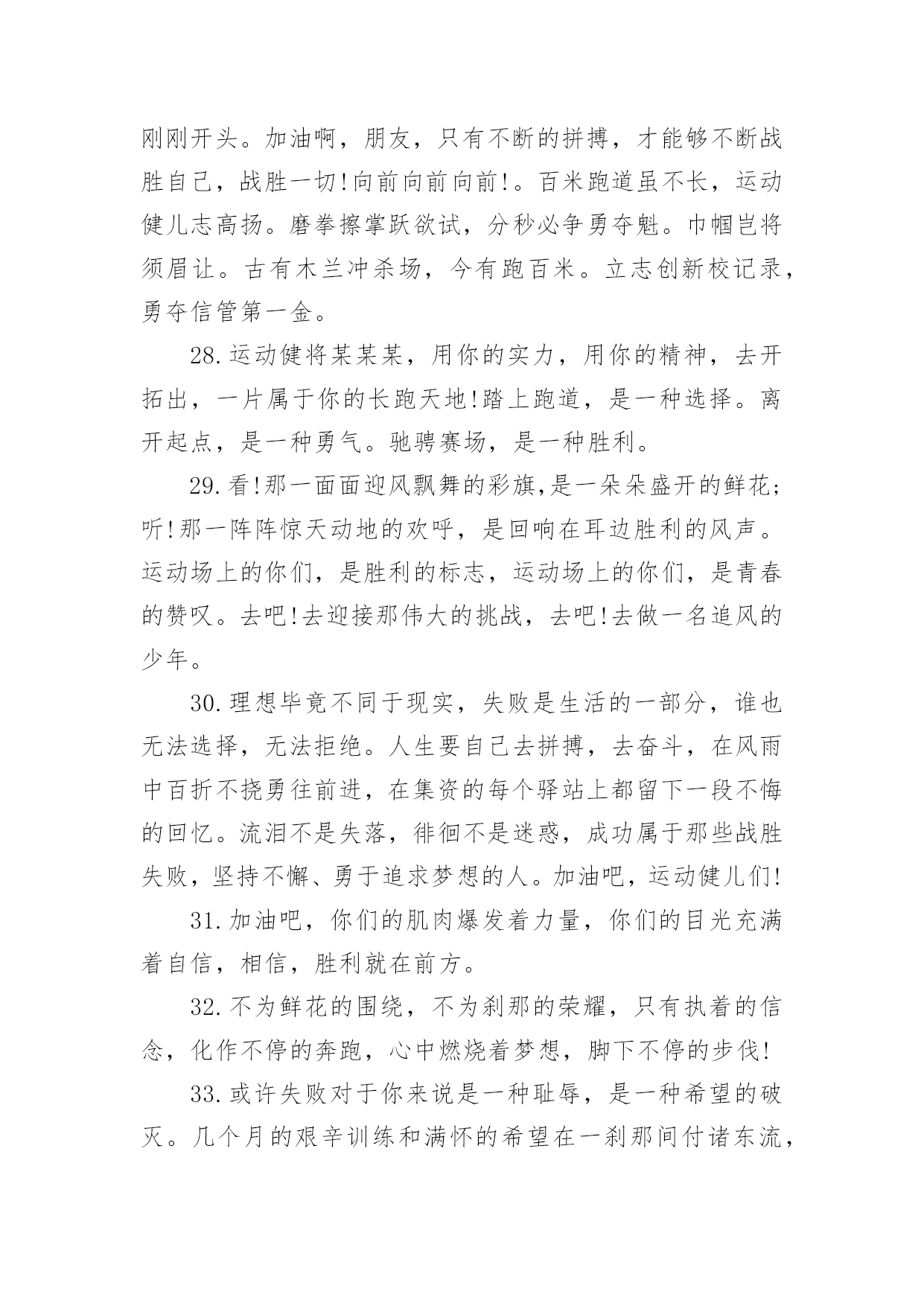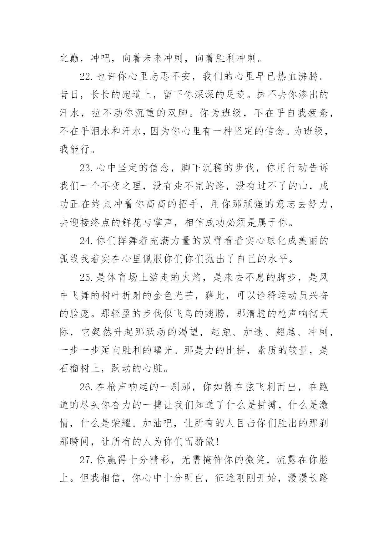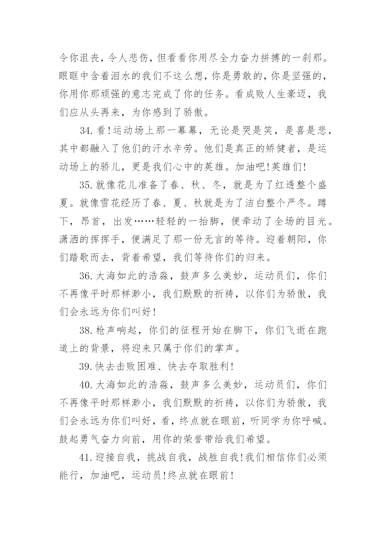秋季运动会的加油稿秋季运动会的加油稿现如今,我们使用上加油稿的情况与日俱增,借助加油稿可以激励他人的士气。相信许多人会觉得加油稿很难写吧,下面是小编为大家整理的秋季运动会的加油稿,欢迎阅读与收藏。秋季运动会的加油稿1温暖的阳光洒在赛场上,男子乙组标枪的比赛即将开始。赛场上,一道道优美的弧线将轻盈地划过天空。健儿们用手中的标枪向距离的权限发起一轮又一轮的挑战。标枪在空中轻盈的姿态,是健儿们强健的力量和熟练的技巧的结合。谁能在这场激烈的竞争中获胜?让我们拭目以待,让我们为他们呐喊、助威吧!只有将力量与技巧合二为一的`人,才能获得胜利的桂冠!秋季运动会的加油稿21.你们处在最风光的一刻,无论第几坚持胜利的信心,只要跑下来,你们就是英雄。2.不为鲜花的围绕,不为刹那的荣耀,只有执着的信念,化作不停的奔跑,心中燃烧着梦想,脚下不停的步伐。3.你用行动述说着过城的重要,没有无尽的终点,没有无法攀登的险峰,希望载着终点在向你微笑,拼搏吧!经历是一种精彩,迸发你全部的能量,成功是你汗水的写照。4.百米战场,枪声炸响,你抬头是勇气是自信,低头是深沉是内敛,只需几秒,那就是永恒。5.100米只是一道过场,几秒钟转瞬即逝,但是这背后承载的是多少成败,加油吧,少年。6.你的风姿,你的呼吸还有你呼啸而过的飓风,今天注定是属于你的日子,今天你注定将要创造辉煌。7.广阔的绿茵场,是为你们搭建的'舞台。张扬吧,年轻的心,我们将为你永远喝彩!8.百米跑道虽不长,运动健儿志高扬。摩拳擦掌跃欲试,分秒必争勇夺魁。9.奋力拼搏,秀出风采,加油!10.或许你尝试过,失败过,但成功的火焰就是无法熊熊燃烧。11.你像一只雄鹰,翱翔在晴空之中你像一颗金星,闪烁在宇宙之中你像一匹骏马,驰骋在战场之中。12.你像是头猎豹,疾驰在草原之中;你像一艘快艇,飞奔在海洋之中。13.看,那健儿们奋勇拼搏的身影!14.磨砺意志奋发冲刺,团结拼搏展现自我。15.青春无悔、激情无限、顽强拼搏、勇夺第一。秋季运动会的加油稿31.动场上彩旗飘,运动健儿显英豪,加油!2.一根小小的木棒,连接的是团结和友爱一根小小的木棒,传递的是勇气和力量一根小小的木棒,演绎的是奋斗和拼搏加油吧!让这激动人心的时刻,一直回荡在我们心中!3.不为掌声的诠释,不为刻意的征服,只有辛勤的汗水化作追求的脚步,心中坚定的信念,脚下你的汗水洒在跑道,浇灌着成功的花朵开放。你的欢笑飞扬在赛场,为班争光数你最棒。跑吧,追吧在这广阔的赛场上,你似骏马似离铉的箭。跑吧,追吧你比虎猛比豹强。4.这是意志的拼搏,这是速度的挑战,胜利在向你们招手,胜利在向你们呼唤!5.你是否感到,烈日的照射那是烈日对你的祝福;你是否感到,彩旗的摇摆那是彩旗对你的呐喊人们的注视那是人们对你的希望,祝福在你身边呐喊在你耳边希望在你心中。的健儿,愿你们一展雄风,勇夺桂冠!6.不为掌声的注释,不为刻意的征服,不为失败的痛苦,仅有辛勤的汗水化作成功的脚步。8.你是运动场的心脏,跳动梦想;你是漫长路的精神,激励辉煌;你们是将上下求索的人!风为你加油,云为你助兴,坚定,执着,耐力与期望,在延伸的白色跑道中点点凝聚!力量,信念,拼搏与奋斗,在遥远的终点线上渐渐明亮!时代的强音正在你的脚下踏响。9.每一份辛劳都有一份收获,每一次的痛苦都是快乐的开始,每一声呐喊都是力量的呼唤。我们有着大浪拍岸的豪迈,所以你不必在乎小荷初露的恬静,我们有着春日的阳光明媚,所以不用去羡慕冬日乱玉碎琼,我们是雨天的一把伞,是寒冷冬日里的一盆碳火,温暖的不只是你我,而是大家的心。运动场上的健儿,掌声属于你们,鲜花属于你们,成功也是属于你们!10.广阔的绿茵场,是为你们搭建的舞台。张扬吧,年轻的心,我们将为你永远喝彩!11.起跑线上,你们一字排开,健美的肌肉蕴涵着爆发力量,坚定的目光充满了自信。枪响了,你们开始了并不长的征程,笔直的跑道上,有你们稳健的足迹;不远的的终点,将留下你们冲刺时矫健的身影。拼搏吧,掌声将为你响起;奋斗吧,胜利和鲜花将属于你们。12.你用行动述说着过程的重要,没有无尽的终点,没有无法攀登的险峰,希望载着终点在向你微笑,拼搏吧!经历是一种精彩,迸发你全部的能量,成功是你汗水的写照。13.真心祝愿机会是什么?是不可错过的刹那间。呐喊是什么?是为那刹那间的真心祝愿。加油加油你肯定听到了那一声声呐喊你肯定看到了那双双期待的眼睛你肯定感受到了那发自内心的祝愿。14.看!运动场上那一幕幕,无论是哭是笑,是喜是悲,其中都融入了他们的汗水辛劳。他们是真正的矫健者,是运动场上的骄儿,更是我们心中的英雄。加油吧!英雄们!每一份辛劳都有一份收获,每一次的痛苦都是快乐的开始,每一声呐喊都是力量的呼唤运动场上的健儿,掌声属于你们,鲜花属于你们,成功也是属于你们!15.漫漫长路,你愿一人独撑,忍受着孤独