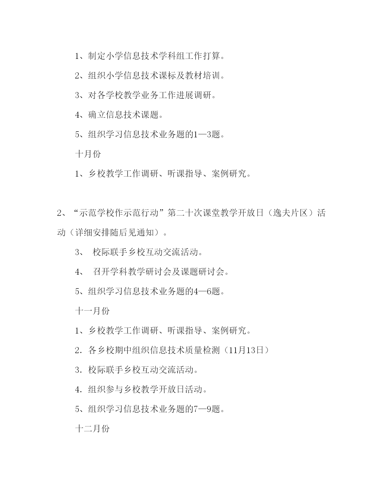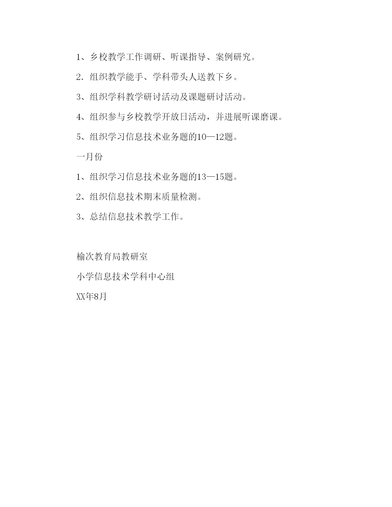 小学信息技术学科工作参考计划榆次区小学信息技术学科工作打算(XX-XX学年第一学期)本学期,认真贯彻XX年《根底教育信息技术课程标准》精神,立足以学生为中心,以大信息技术教育教研为理念,结合信息技术学科教学的实践和创新特点,开展信息技术与其他学科整合研究,实在提高信息技术教学质量和老师的教学水平。详细工作任务如下:一、建立一个信息技术课程的考核机制。信息技术在中小学教育中的应用,必须按照系统原则进展科学治理,才能充分发挥其功能作用和效益。有的学校甚至只学不考,这种评价或不评价的方式极不合理,更不利于学生充分发挥本人的想象力、制造力,这学年我预备组织小学信息技术考试及制定评估标准和相应的政策,分类推进,督导检查。通过这些工作,提高学校和信息技术老师的注重程度,促进信息技术应用的制度化、标准化治理。二、接着加强培养信息技术骨干老师,利用电子白板、班班通等现有设备,与电教馆结合组织研训活动。积极组织引导信息技术老师进展网络教研活动,构成基层信息教研网络。建立并完善动漫学科教学资源,以加强教材研究,优化教学设计,提高课堂教学实效。发觉和培养信息技术学科的骨干老师队伍。三、充分利用“示范学校作示范”活动,带动综合实践开展。在本学期,充分利用“示范学校作示范行动”活动,积极参与综合实践的听课、磨课、研课。并大力推进网络教研,实现观课、议课、研课、磨课多位一体的教学研究活动,进而促进本学科的开展。四、接着治理和维护好教研网络平台,进一步推进整体老师信息技术水平。五、加强农村信息技术教研工作。消除“数字鸿沟”,实在提高(文章转自有用文档频道XX09)农村信息技术教学质量。六、推进信息技术教研与综合实践课互相融通,有机整合,互相促进。逐月工作安排:九月份:1、制定小学信息技术学科组工作打算。2、组织小学信息技术课标及教材培训。3、对各学校教学业务工作进展调研。4、确立信息技术课题。5、组织学习信息技术业务题的1—3题。十月份1、乡校教学工作调研、听课指导、案例研究。2、“示范学校作示范行动”第二十次课堂教学开放日(逸夫片区)活动(详细安排随后见通知)。3、校际联手乡校互动交流活动。4、召开学科教学研讨会及课题研讨会。5、组织学习信息技术业务题的4—6题。十一月份1、乡校教学工作调研、听课指导、案例研究。2.各乡校期中组织信息技术质量检测(11月13日)3.校际联手乡校互动交流活动。4.组织参与乡校教学开放日活动。5、组织学习信息技术业务题的7—9题。十二月份1、乡校教学工作调研、听课指导、案例研究。2.组织教学能手、学科带头人送教下乡。3、组织学科教学研讨活动及课题研讨活动。4、组织参与乡校教学开放日活动,并进展听课磨课。5、组织学习信息技术业务题的10—12题。一月份1、组织学习信息技术业务题的13—15题。2、组织信息技术期末质量检测。3、总结信息技术教学工作。榆次教育局教研室小学信息技术学科中心组XX年8月