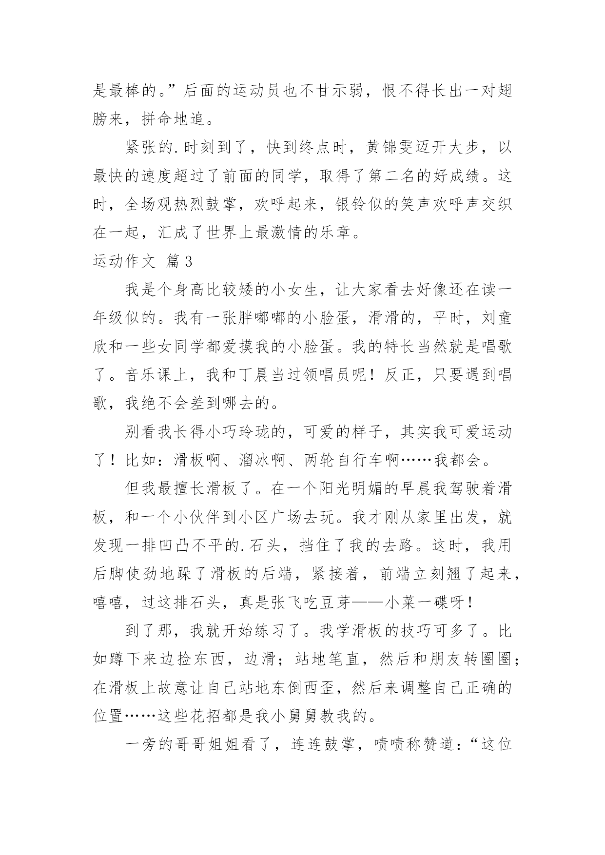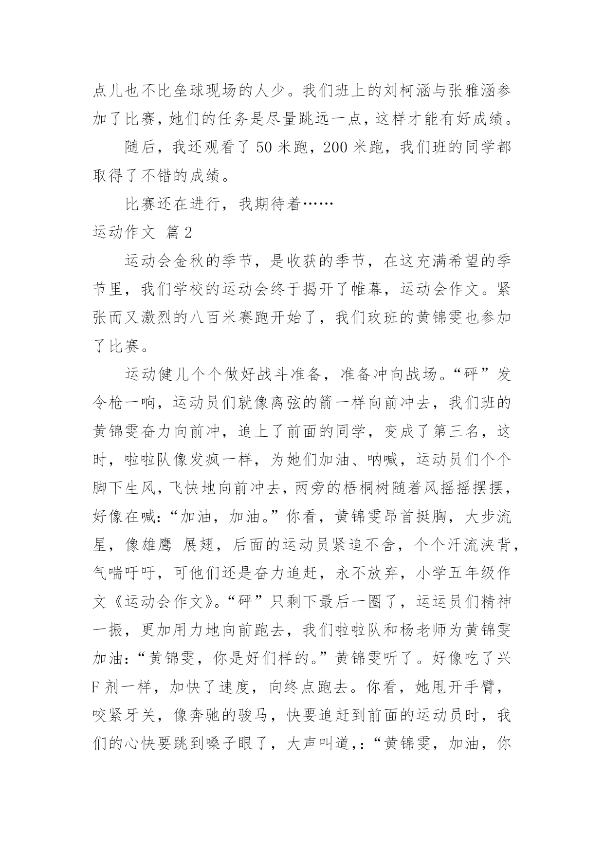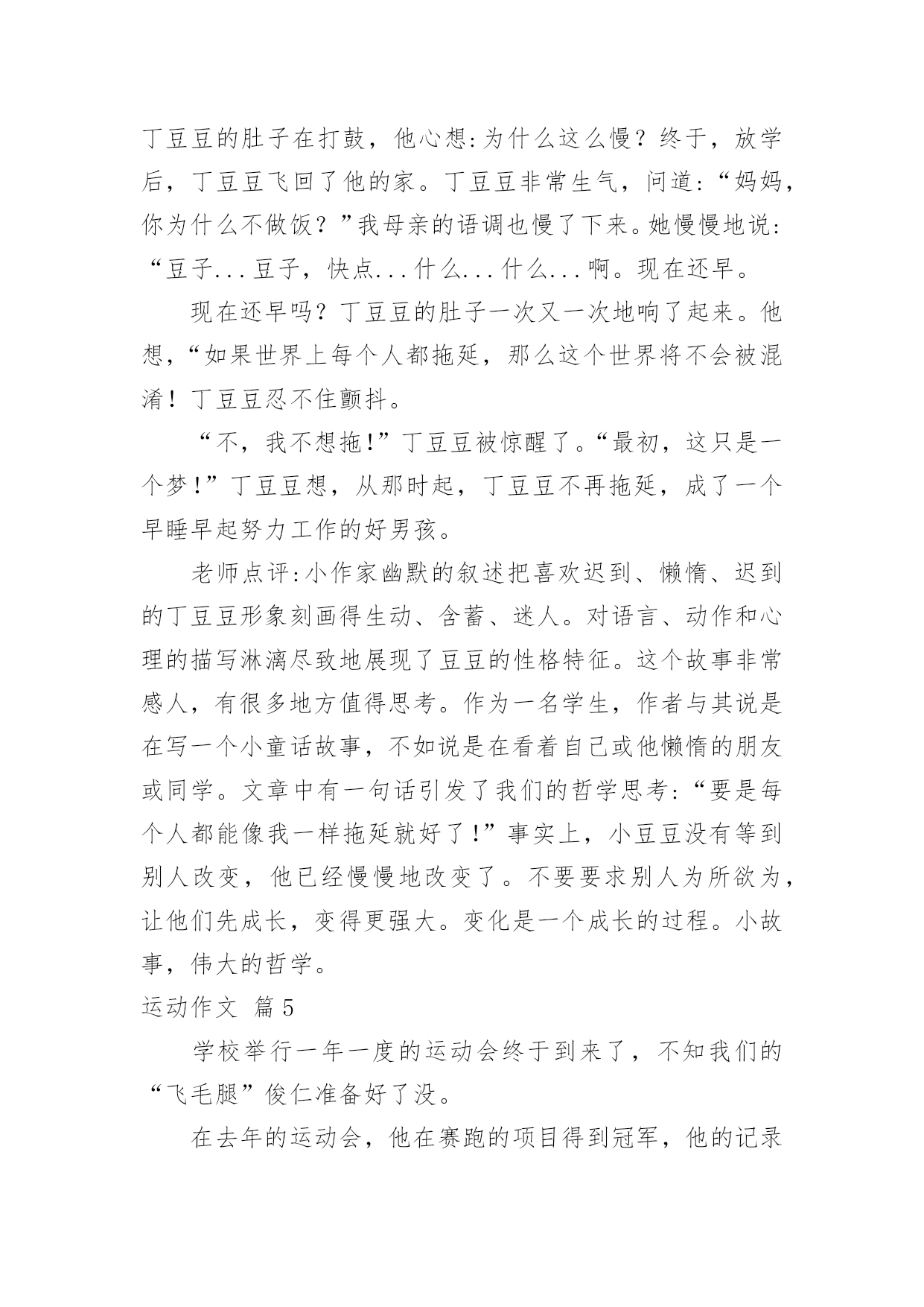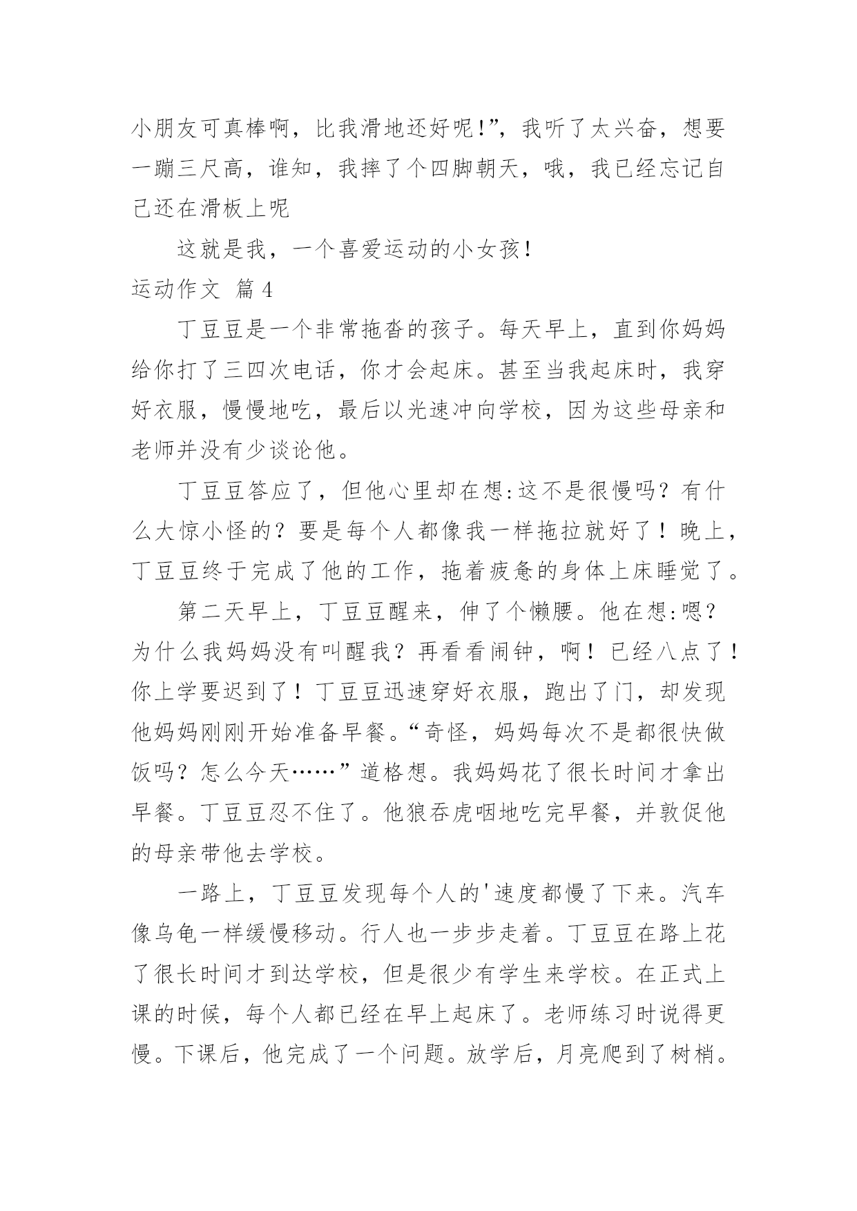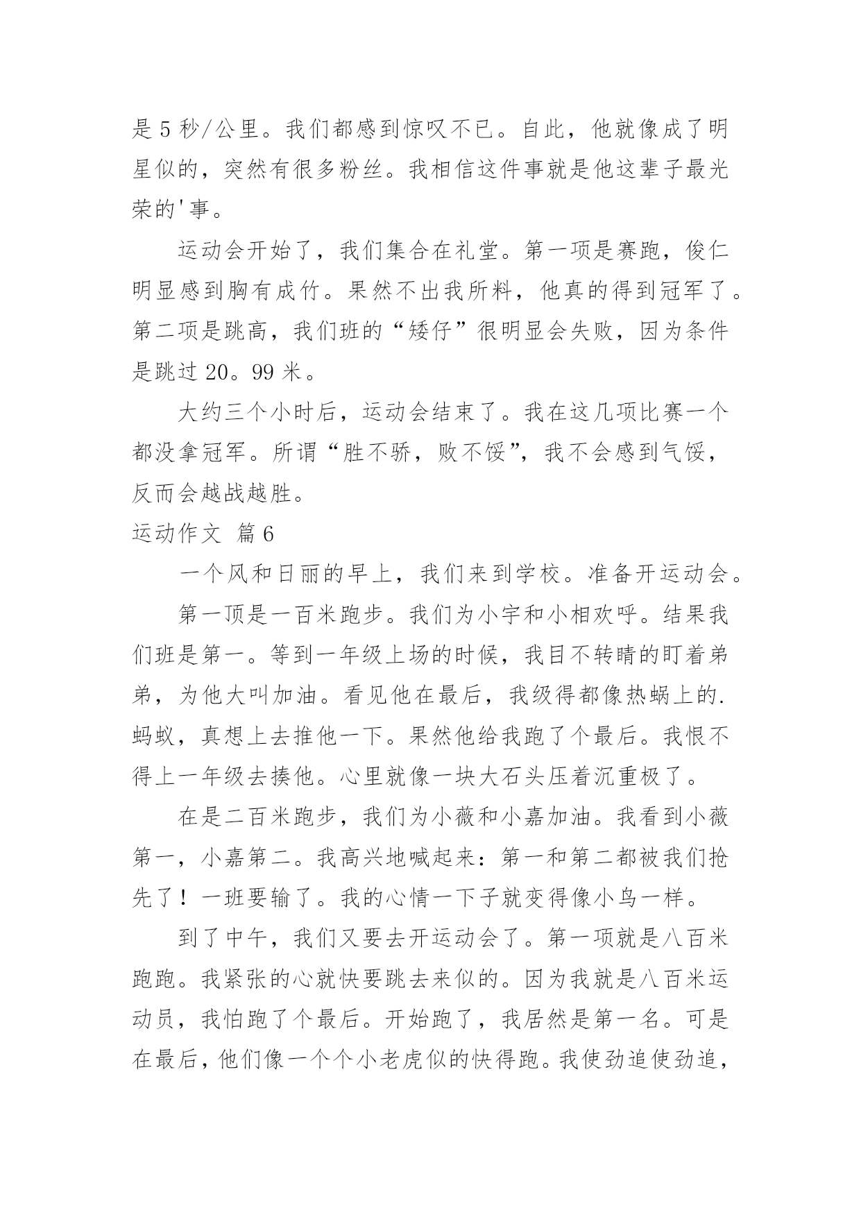 运动作文运动作文(热)在日复一日的学习、工作或生活中,大家都经常看到作文的身影吧,作文是人们以书面形式表情达意的言语活动。你知道作文怎样写才规范吗?下面是小编收集整理的运动作文6篇,欢迎阅读,希望大家能够喜欢。运动作文篇1今天,鸟儿在枝头用美好的歌声迎接美好的一天。对,没错,今天我们全校将举办第二十届春季田径运动会随着太阳公公不作美的阳光直射到绿茵场上时,开幕式拉开了帷幕,一个个班级用自己的整齐队伍入场了。轮到我们班了!只见我们班同学一个个穿着整齐的校服,戴着鲜艳的红领巾,井然有序地进入了自己的位置。随着校长的一声令下,比赛开始了。垒球场在“水泥山”后,操场的的一片空地上举行。我赶到那里时,已经是人山人海,我好不容易才挤出了一个位置。我伸出了头,此时,正是我们班的李嘉欣在投球。只见李嘉欣一只手拎着垒球,使出全身力气把垒球投了出来。垒球在空中划出了一道漂亮的'曲线,所有的啦啦队都在呐喊,我们的心都提到了嗓子眼上。随着垒球落地,我的世界一片空白……跳远现场离垒球现场只有十米远,可依然人起云涌,一点儿也不比垒球现场的人少。我们班上的刘柯涵与张雅涵参加了比赛,她们的任务是尽量跳远一点,这样才能有好成绩。随后,我还观看了50米跑,200米跑,我们班的同学都取得了不错的成绩。比赛还在进行,我期待着……运动作文篇2运动会金秋的季节,是收获的季节,在这充满希望的季节里,我们学校的运动会终于揭开了帷幕,运动会作文。紧张而又激烈的八百米赛跑开始了,我们玫班的黄锦雯也参加了比赛。运动健儿个个做好战斗准备,准备冲向战场。“砰”发令枪一响,运动员们就像离弦的箭一样向前冲去,我们班的黄锦雯奋力向前冲,追上了前面的同学,变成了第三名,这时,啦啦队像发疯一样,为她们加油、呐喊,运动员们个个脚下生风,飞快地向前冲去,两旁的梧桐树随着风摇摇摆摆,好像在喊:“加油,加油。”你看,黄锦雯昂首挺胸,大步流星,像雄鹰展翅,后面的运动员紧追不舍,个个汗流浃背,气喘吁吁,可他们还是奋力追赶,永不放弃,小学五年级作文《运动会作文》。“砰”只剩下最后一圈了,运运员们精神一振,更加用力地向前跑去,我们啦啦队和杨老师为黄锦雯加油:“黄锦雯,你是好们样的。”黄锦雯听了。好像吃了兴F剂一样,加快了速度,向终点跑去。你看,她甩开手臂,咬紧牙关,像奔驰的骏马,快要追赶到前面的运动员时,我们的心快要跳到嗓子眼了,大声叫道,:“黄锦雯,加油,你是最棒的。”后面的运动员也不甘示弱,恨不得长出一对翅膀来,拼命地追。紧张的.时刻到了,快到终点时,黄锦雯迈开大步,以最快的速度超过了前面的同学,取得了第二名的好成绩。这时,全场观热烈鼓掌,欢呼起来,银铃似的笑声欢呼声交织在一起,汇成了世界上最激情的乐章。运动作文篇3我是个身高比较矮的小女生,让大家看去好像还在读一年级似的。我有一张胖嘟嘟的小脸蛋,滑滑的,平时,刘童欣和一些女同学都爱摸我的小脸蛋。我的特长当然就是唱歌了。音乐课上,我和丁晨当过领唱员呢!反正,只要遇到唱歌,我绝不会差到哪去的。别看我长得小巧玲珑的,可爱的样子,其实我可爱运动了!比如:滑板啊、溜冰啊、两轮自行车啊……我都会。但我最擅长滑板了。在一个阳光明媚的早晨我驾驶着滑板,和一个小伙伴到小区广场去玩。我才刚从家里出发,就发现一排凹凸不平的.石头,挡住了我的去路。这时,我用后脚使劲地跺了滑板的后端,紧接着,前端立刻翘了起来,嘻嘻,过这排石头,真是张飞吃豆芽——小菜一碟呀!到了那,我就开始练习了。我学滑板的技巧可多了。比如蹲下来边捡东西,边滑;站地笔直,然后和朋友转圈圈;在滑板上故意让自己站地东倒西歪,然后来调整自己正确的位置……这些花招都是我小舅舅教我的。一旁的哥哥姐姐看了,连连鼓掌,啧啧称赞道:“这位小朋友可真棒啊,比我滑地还好呢!”,我听了太兴奋,想要一蹦三尺高,谁知,我摔了个四脚朝天,哦,我已经忘记自己还在滑板上呢这就是我,一个喜爱运动的小女孩!运动作文篇4丁豆豆是一个非常拖沓的孩子。每天早上,直到你妈妈给你打了三四次电话,你才会起床。甚至当我起床时,我穿好衣服,慢慢地吃,最后以光速冲向学校,因为这些母亲和老师并没有少谈论他。丁豆豆答应了,但他心里却在想:这不是很慢吗?有什么大惊小怪的?要是每个人都像我一样拖拉就好了!晚上,丁豆豆终于完成了他的工作,拖着疲惫的身体上床睡觉了。第二天早上,丁豆豆醒来,伸了个懒腰。他在想:嗯?为什么我妈妈没有叫醒我?再看看闹钟,啊!已经八点了!你上学要迟到了!丁豆豆迅速穿好衣服,跑出了门,却发现他妈妈刚刚开始准备早餐。“奇怪,妈妈每次不是都很快做饭吗?怎么今天……”道格想。我妈妈花了很长时间才拿出早餐。丁豆豆忍不住了。他狼吞虎咽地吃完早餐,并敦促他的母亲带他去学校。一路上,丁豆豆发现每个人的'速度都慢了下来。汽车像乌龟一样缓慢移动。行人也一步步走着。丁豆
