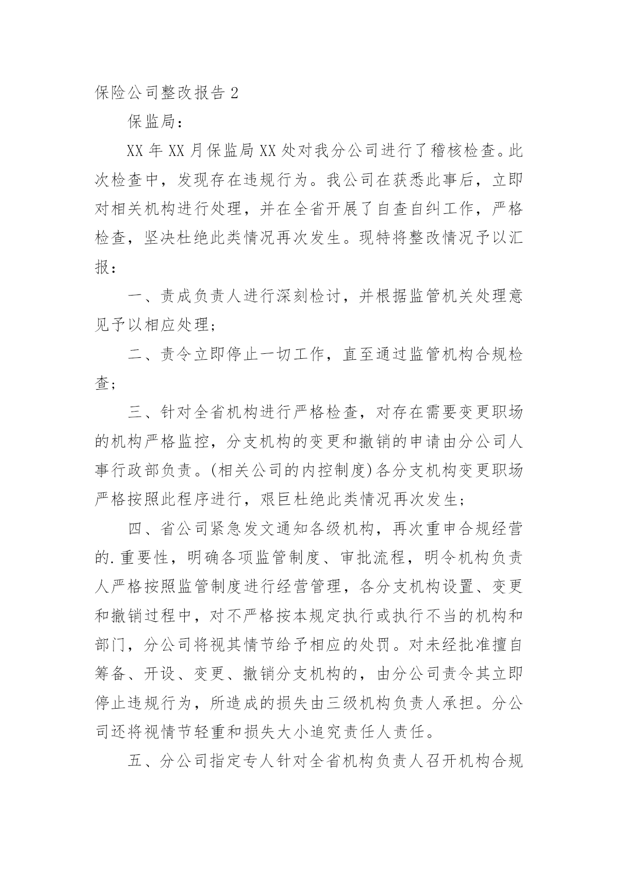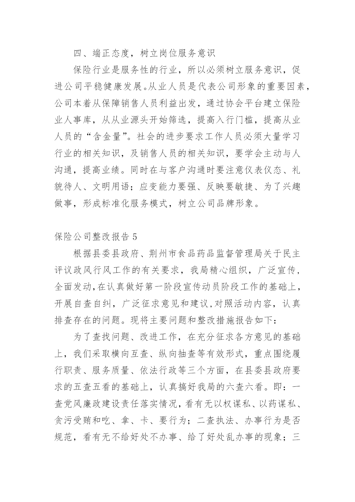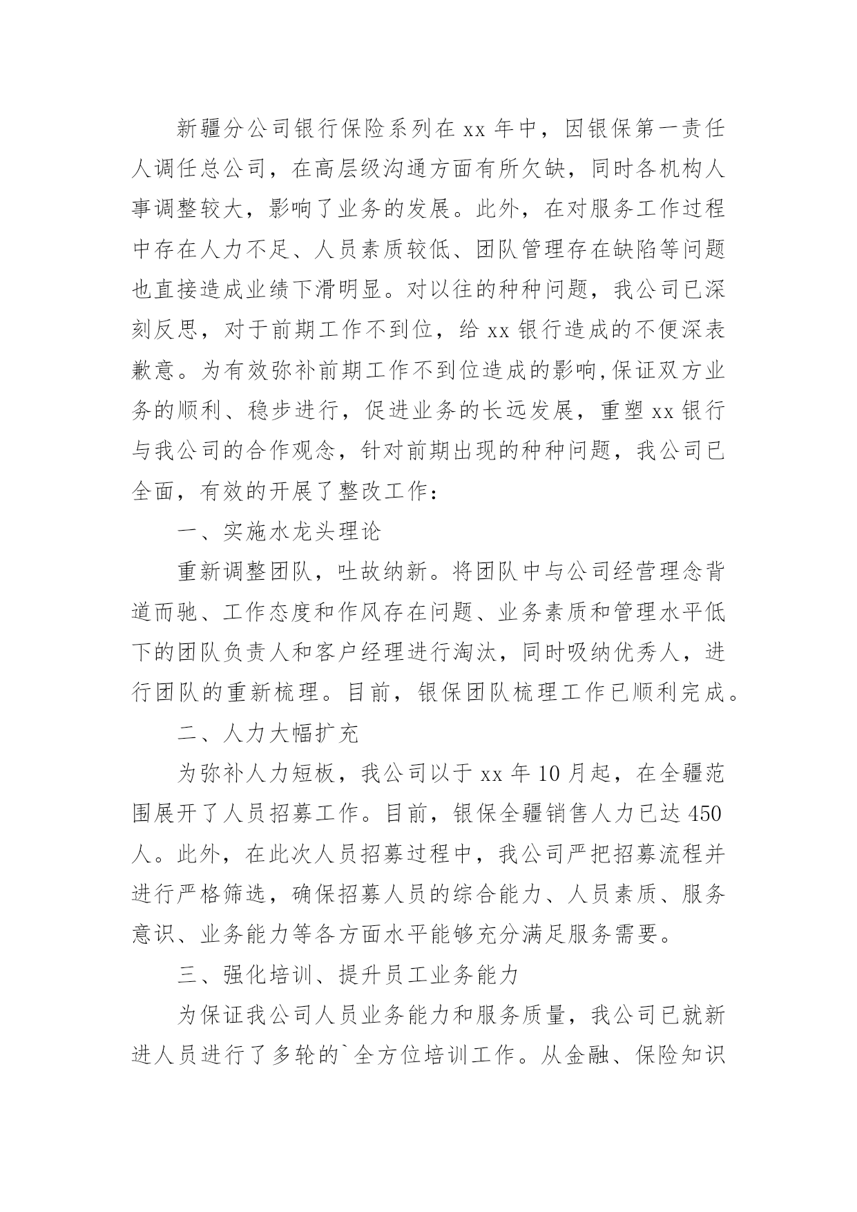 保险公司整改报告保险公司整改报告合集8篇在当下这个社会中,报告的使用成为日常生活的常态,报告中涉及到专业性术语要解释清楚。那么一般报告是怎么写的呢?以下是小编整理的保险公司整改报告,希望能够帮助到大家。保险公司整改报告1中国银行新疆分行:xx银行保险自xx年进驻新疆,便与xx银行新疆分行展开了银代业务合作。在前期的合作中,双方本着互利互惠,携手共赢的态度共同致力于银代业务的提升和发展。业绩不断增长、保费平台不断提升,从合作伊始的800万元平台跨越到1.3亿平台,创造了银代业务的合作高峰。xx年,在我公司销售产品结构进行调整的情况下,依然突破了8000万元大关。可以说,双方共同缔造了一次次辉煌,取得了不匪的成绩。进入xx年,我公司在渠道银代业务持续下滑并呈现颓势,20xx年全年业绩仅为5800万元,较历年下滑明显。对此,新疆分公司从总经理室至银保上下高度重视并产生了严峻的紧迫感。作为我公司一直以来最大和最重要的合作伙伴,业绩的大幅下滑和诸多情况的发生为我公司银代业务发展敲响了警钟。对此,我公司进行了认真的分析、总结不足。新疆分公司银行保险系列在xx年中,因银保第一责任人调任总公司,在高层级沟通方面有所欠缺,同时各机构人事调整较大,影响了业务的发展。此外,在对服务工作过程中存在人力不足、人员素质较低、团队管理存在缺陷等问题也直接造成业绩下滑明显。对以往的种种问题,我公司已深刻反思,对于前期工作不到位,给xx银行造成的不便深表歉意。为有效弥补前期工作不到位造成的影响,保证双方业务的顺利、稳步进行,促进业务的长远发展,重塑xx银行与我公司的合作观念,针对前期出现的种种问题,我公司已全面,有效的开展了整改工作:一、实施水龙头理论重新调整团队,吐故纳新。将团队中与公司经营理念背道而驰、工作态度和作风存在问题、业务素质和管理水平低下的团队负责人和客户经理进行淘汰,同时吸纳优秀人,进行团队的重新梳理。目前,银保团队梳理工作已顺利完成。二、人力大幅扩充为弥补人力短板,我公司以于xx年10月起,在全疆范围展开了人员招募工作。目前,银保全疆销售人力已达450人。此外,在此次人员招募过程中,我公司严把招募流程并进行严格筛选,确保招募人员的综合能力、人员素质、服务意识、业务能力等各方面水平能够充分满足服务需要。三、强化培训、提升员工业务能力为保证我公司人员业务能力和服务质量,我公司已就新进人员进行了多轮的`全方位培训工作。从金融、保险知识到产品,从销售业务技能到售前、售后服务等进行了全面的岗前培训。同时,分公司银保部已拟定了xx年培训计划,将会对客户经理进行高密度的反复培训,确保各项能力不断提升。四、营业部架构的建立今年,总分公司在销售人员架构上进行了较大幅度的调整。各机构特别建立了营业部,专项服务于渠道。乌鲁木齐地区在现有渠道下,细化为三个营业部,分区、分网点对进行全方位的服务。在营业部人员配备方面,我公司在全疆范围内特别甄选精英人员调入营业部,将银保部的最强业务阵容全部配备至渠道和营业部,保证服务工作高质量完成。目前渠道及营业部人员均已到位。五、明确制度,建立客户服务体系为保证服务高质量,确保客户和渠道充分满意,银行保险部特别制定了客户经理服务制度,对客户经理网点跟进、销售流程、售后回访及客户问题处理等均进行了明确规范,使全疆银保有法可依,同时严格执行、赏罚分明。为配合x年业务,特别是期缴业务的增长,我公司要求所有渠道客户经理必须实现驻点经营,确保在任何情况下,均能第一时间解决问题。同时,专门将客户服务部门划归统一管理并进行人员调整,保证售后服务周到,令客户满意!银保客服能力大大增强。六、加大投入对渠道加大政策的投入。在政策方面向渠道给予大力倾斜,在人力资源等方面以渠道为优先渠道。特别针对渠道制定独立的业务合作方案,全面提升全疆各渠道客户经理以及各层级销售人员的业务积极性,促升业务.七、强化公司内部督导针对业务,进行强力督导。派专人对业务精细到以日为单位进行独立的追踪工作,同时在周例会、月会中将渠道各项业务指标进行单独考核,以保证全疆银保上下对渠道的绝对重视。对于业务竞赛方案等活动,进行专项追踪,并定期向进行数据的报送。八、建立沟通常态化xx年,新疆分公司各层级将定期、频繁的与业务沟通、汇报等工作,加强层级交流,以满足不同时期业务服务工作的需要。新疆分公司上下将严格执行总、分公司和各项要求,全力弥补不足,在今后的工作中,秉承公司专业化、规范化的销售流程,本着客户为上,渠道为本的经营理念提供及时、高效、优质的各项服务,不断强化与之间的良好关系、携手共赢的合作方针,在xx年实现双方银代业务复兴,同时也希望xx银行能一如既往的对我公司给与帮助和指导。保险股份有限公司新疆分公司20xx年x月x日保险公司整改报告2保监局:XX年XX月保监局XX处对我分公
