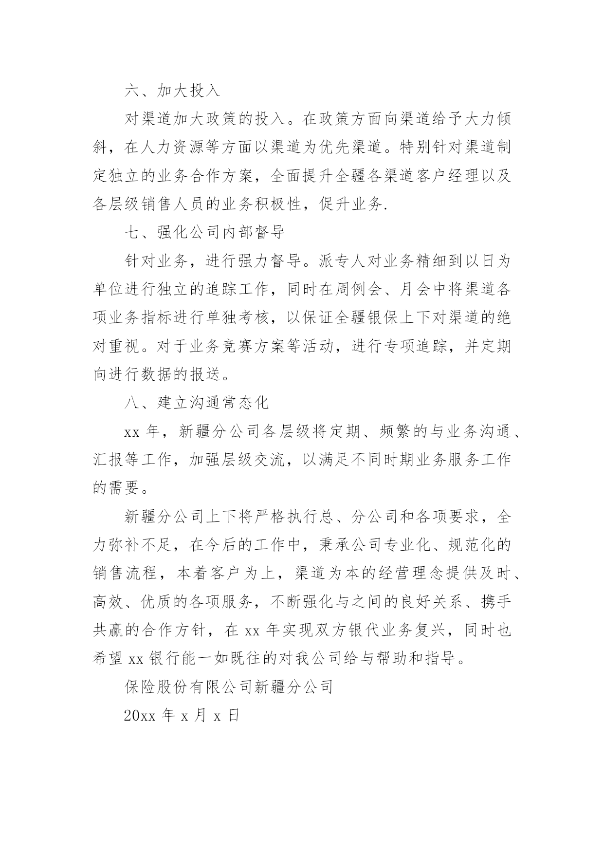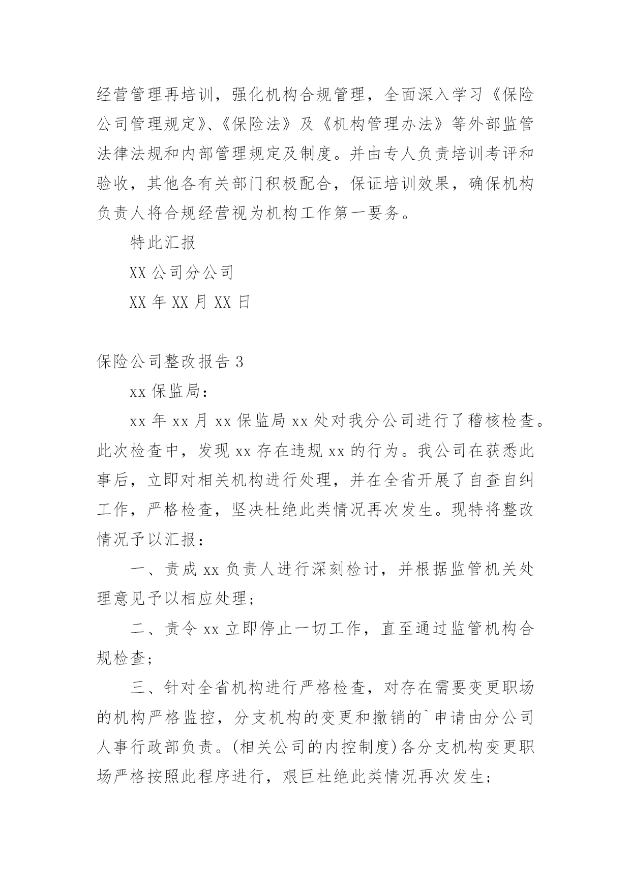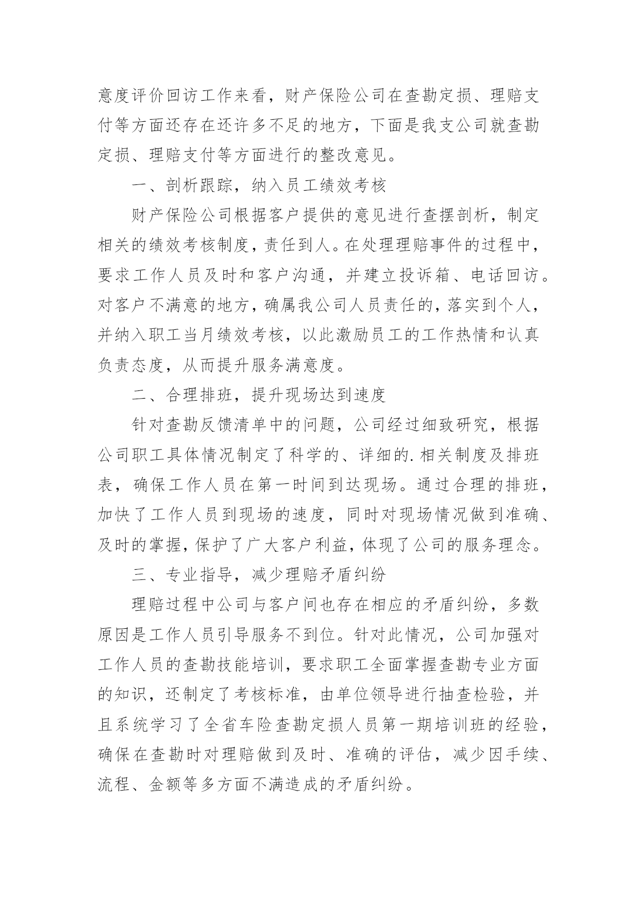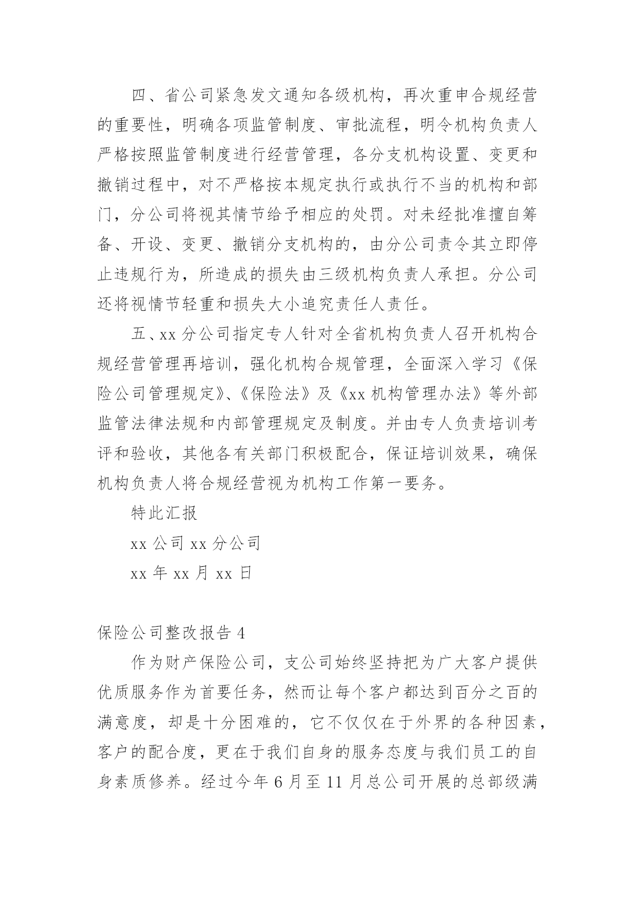 保险公司整改报告保险公司整改报告合集8篇在当下这个社会中,报告的使用成为日常生活的常态,报告中涉及到专业性术语要解释清楚。那么一般报告是怎么写的呢?以下是小编整理的保险公司整改报告,希望能够帮助到大家。保险公司整改报告1中国银行新疆分行:xx银行保险自xx年进驻新疆,便与xx银行新疆分行展开了银代业务合作。在前期的合作中,双方本着互利互惠,携手共赢的态度共同致力于银代业务的提升和发展。业绩不断增长、保费平台不断提升,从合作伊始的800万元平台跨越到1.3亿平台,创造了银代业务的合作高峰。xx年,在我公司销售产品结构进行调整的情况下,依然突破了8000万元大关。可以说,双方共同缔造了一次次辉煌,取得了不匪的成绩。进入xx年,我公司在渠道银代业务持续下滑并呈现颓势,20xx年全年业绩仅为5800万元,较历年下滑明显。对此,新疆分公司从总经理室至银保上下高度重视并产生了严峻的紧迫感。作为我公司一直以来最大和最重要的合作伙伴,业绩的大幅下滑和诸多情况的发生为我公司银代业务发展敲响了警钟。对此,我公司进行了认真的分析、总结不足。新疆分公司银行保险系列在xx年中,因银保第一责任人调任总公司,在高层级沟通方面有所欠缺,同时各机构人事调整较大,影响了业务的发展。此外,在对服务工作过程中存在人力不足、人员素质较低、团队管理存在缺陷等问题也直接造成业绩下滑明显。对以往的种种问题,我公司已深刻反思,对于前期工作不到位,给xx银行造成的不便深表歉意。为有效弥补前期工作不到位造成的影响,保证双方业务的顺利、稳步进行,促进业务的长远发展,重塑xx银行与我公司的合作观念,针对前期出现的种种问题,我公司已全面,有效的开展了整改工作:一、实施水龙头理论重新调整团队,吐故纳新。将团队中与公司经营理念背道而驰、工作态度和作风存在问题、业务素质和管理水平低下的团队负责人和客户经理进行淘汰,同时吸纳优秀人,进行团队的重新梳理。目前,银保团队梳理工作已顺利完成。二、人力大幅扩充为弥补人力短板,我公司以于xx年10月起,在全疆范围展开了人员招募工作。目前,银保全疆销售人力已达450人。此外,在此次人员招募过程中,我公司严把招募流程并进行严格筛选,确保招募人员的综合能力、人员素质、服务意识、业务能力等各方面水平能够充分满足服务需要。三、强化培训、提升员工业务能力为保证我公司人员业务能力和服务质量,我公司已就新进人员进行了多轮的`全方位培训工作。从金融、保险知识到产品,从销售业务技能到售前、售后服务等进行了全面的岗前培训。同时,分公司银保部已拟定了xx年培训计划,将会对客户经理进行高密度的反复培训,确保各项能力不断提升。四、营业部架构的建立今年,总分公司在销售人员架构上进行了较大幅度的调整。各机构特别建立了营业部,专项服务于渠道。乌鲁木齐地区在现有渠道下,细化为三个营业部,分区、分网点对进行全方位的服务。在营业部人员配备方面,我公司在全疆范围内特别甄选精英人员调入营业部,将银保部的最强业务阵容全部配备至渠道和营业部,保证服务工作高质量完成。目前渠道及营业部人员均已到位。五、明确制度,建立客户服务体系为保证服务高质量,确保客户和渠道充分满意,银行保险部特别制定了客户经理服务制度,对客户经理网点跟进、销售流程、售后回访及客户问题处理等均进行了明确规范,使全疆银保有法可依,同时严格执行、赏罚分明。为配合x年业务,特别是期缴业务的增长,我公司要求所有渠道客户经理必须实现驻点经营,确保在任何情况下,均能第一时间解决问题。同时,专门将客户服务部门划归统一管理并进行人员调整,保证售后服务周到,令客户满意!银保客服能力大大增强。六、加大投入对渠道加大政策的投入。在政策方面向渠道给予大力倾斜,在人力资源等方面以渠道为优先渠道。特别针对渠道制定独立的业务合作方案,全面提升全疆各渠道客户经理以及各层级销售人员的业务积极性,促升业务.七、强化公司内部督导针对业务,进行强力督导。派专人对业务精细到以日为单位进行独立的追踪工作,同时在周例会、月会中将渠道各项业务指标进行单独考核,以保证全疆银保上下对渠道的绝对重视。对于业务竞赛方案等活动,进行专项追踪,并定期向进行数据的报送。八、建立沟通常态化xx年,新疆分公司各层级将定期、频繁的与业务沟通、汇报等工作,加强层级交流,以满足不同时期业务服务工作的需要。新疆分公司上下将严格执行总、分公司和各项要求,全力弥补不足,在今后的工作中,秉承公司专业化、规范化的销售流程,本着客户为上,渠道为本的经营理念提供及时、高效、优质的各项服务,不断强化与之间的良好关系、携手共赢的合作方针,在xx年实现双方银代业务复兴,同时也希望xx银行能一如既往的对我公司给与帮助和指导。保险股份有限公司新疆分公司20xx年x月x日保险公司整改报告2保监局:XX年XX月保监局XX处对我分公