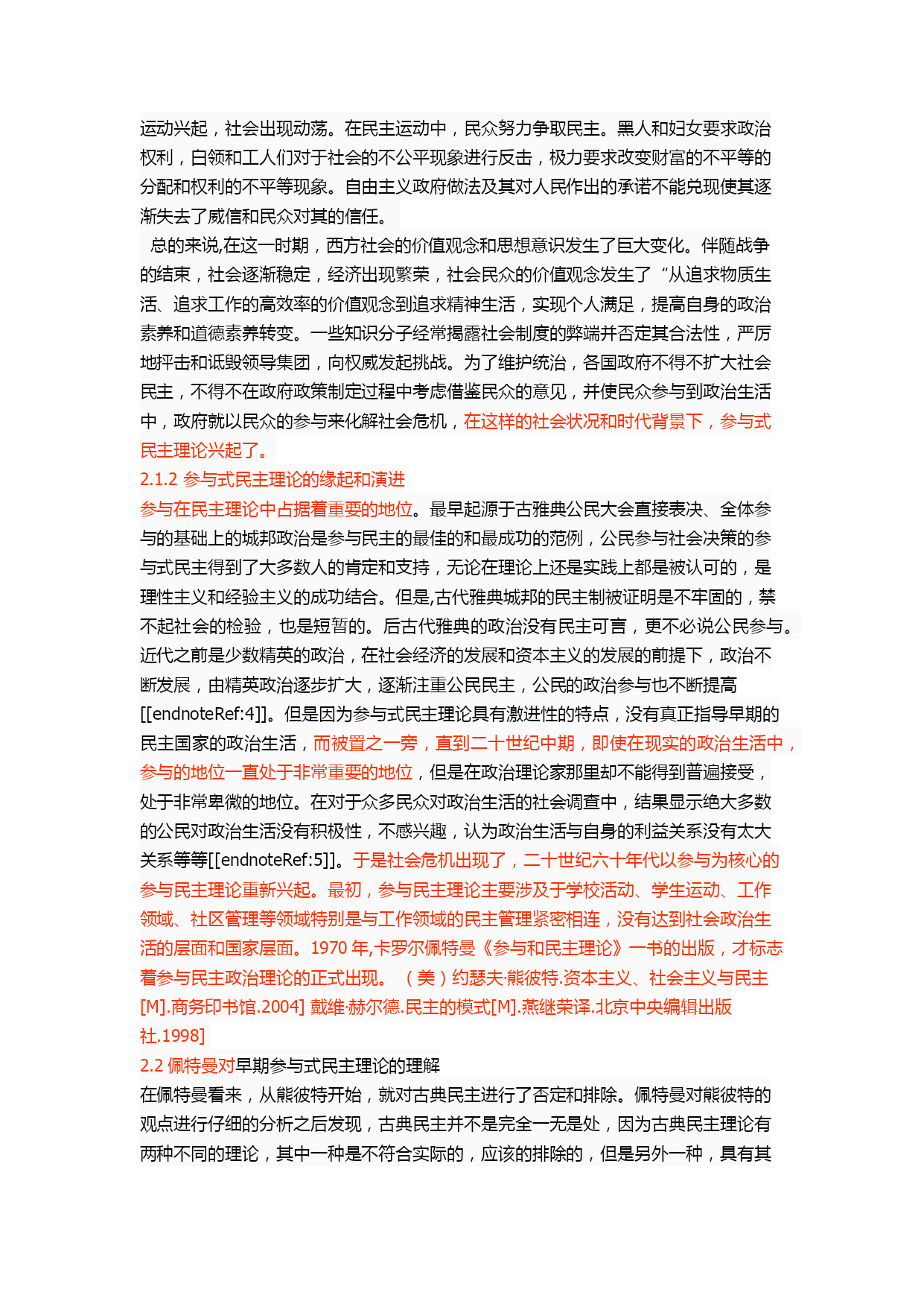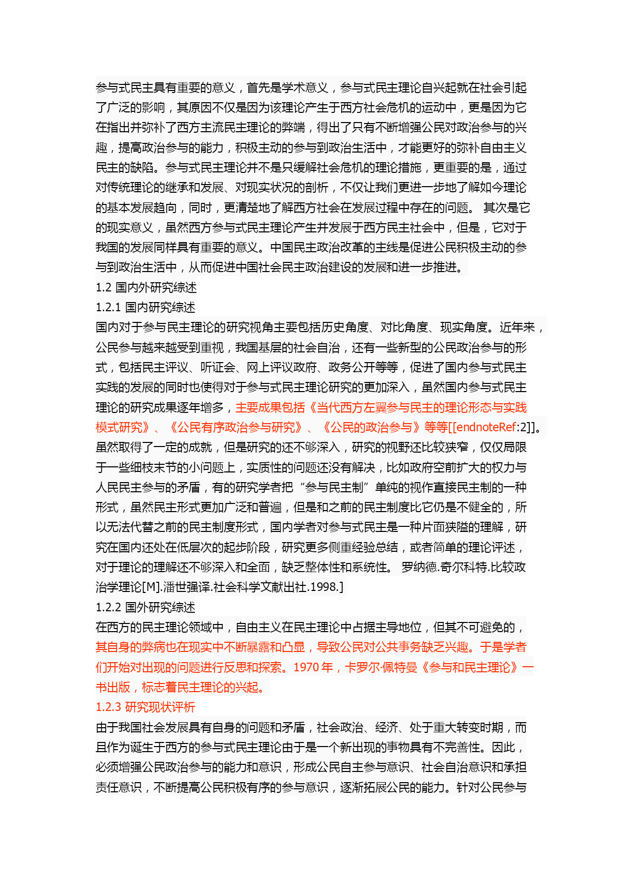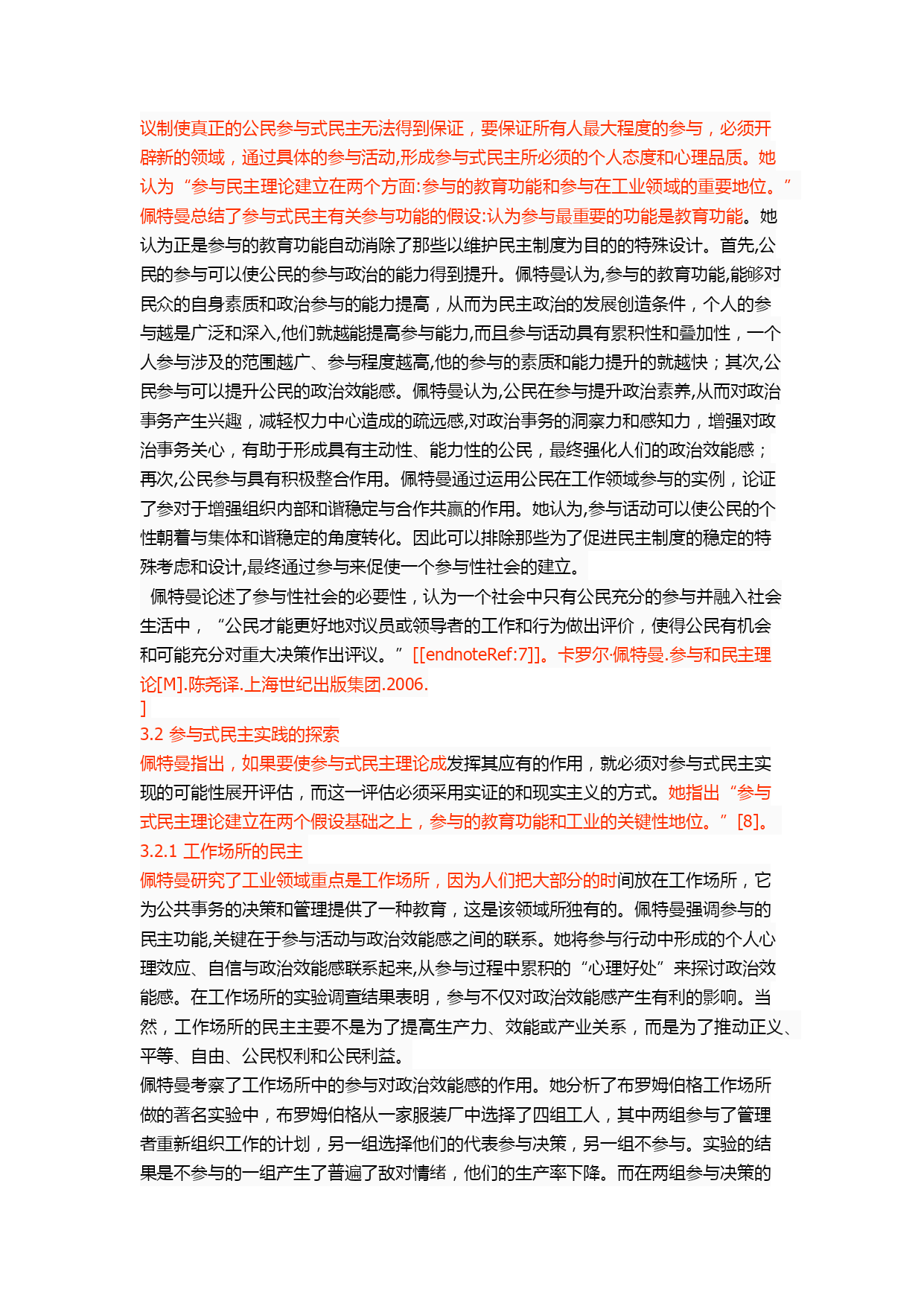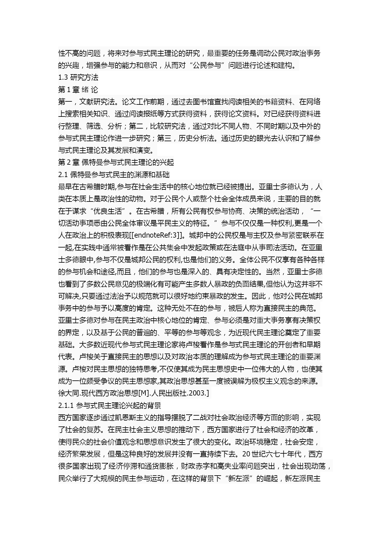 摘要在20世纪六七十年代,西方社会爆发了追求民主运动,但是参与却受不到重视,民众对社会事务冷漠,不感兴趣。于是学者们进行不断的反省、思索,HYPERLINK"javascript:;"于1960年,阿诺德·考夫曼首次提出了“参与民主”这一概念。于1970年,佩特曼出版《参与和民主理论》一书,该书是参与式民主理论的正式兴起的标志,从理论和社会实践对参与式民主理论进行诠释和构建[[endnoteRef:0]]。佩特曼的参与式民主理论具有其合理性和局限性。王晓丽.卡罗尔·佩特曼的参与民主理论评析[J].内蒙古大学学报(哲学社会科学版).2009.]关键词:佩特曼;参与;民主;参与式民主理论;AbstractInthe60sand70stwentiethCentury,theDemocraticMovementbrokeoutinthewesternsociety,buttherewasnopositioninthecontemporarydemocratictheoryinthemainstream.Inmoderntimes,inthefieldofWesterndemocraticresearch,representativedemocracywithliberalismasavalueorientationhasoccupiedthemainstreamofthetheoryofthepeople,butitsdisadvantagesinreality.Theendisalsograduallyshowingthatcitizensare"indifferent"towardssocialpublicaffairs.Insuchasocialbackground,scholarshaveconstantlyintrospection,thinkandexploretherealityofthesituation,in1960ArnoldKaufmanfirstproposedtheconceptof"participationindemocracy".In1970,Pettmanpublishedabookonparticipationanddemocracy,whichmarkstheformalriseoftheparticipatorydemocracytheory.Thisbookconstructsandinterpretstheparticipatorydemocratictheoryfromtheconnotation,function,realizationlevelandParticipatorySocietyofparticipatorydemocracy.Pettman'sparticipatorydemocracytheorynotonlyhasbenifit,butalsohasshortcoming.Keywords:Pettman;participation;democracy;participatorydemocracytheory;contemporaryenlightenment.-7-第1章绪论1.1选题的依据及意义在追求民主日益成为当代世界主流话语背景下,以及我国公民参与热情日益高涨,社会经济繁荣,政治文化的发展,公民素质以及政治素养的提高,公民要求获得更多的政治参与的权利,但是众多社会矛盾的作用下,公民的政治参与得不到真正的保证,同时还有另外一种情况的出现就是“政治冷漠”,公民的政治参与能力不高,积极性不高,社会责任意识不高等问题亟待解决[[endnoteRef:1]]。参与式民主理论有利于推动政府决策的民主化、科学化,促进政府职能的转变和政府民主政治建设、使得政府的决策充分反映民意,增强政府的威信和公民对政府的信任和支持。参与式民主理论强调公民积极主动的参与社会政治生活,增强公民政治参与的能力、素质和政治参与的积极性,从而建设全民参与的参与型社会,佩特曼参与式民主理论不仅对于西方社会具有借鉴意义,对于我国的社会主义民主政治建设同样具有一定的社会作用。针对参与式民主理论的发展状况,我国不能单纯的借鉴西方的参与式民主理论,还要根据我国的实际情况加以发展,从而能够针对我国民主政治建设的弊病加以对症下药。从我国社会管理体制改革的角度来说,参与式民主有利于促进社会民主治理。所以研究参与式民主理论具有一定的意义。刘军宁.民主与民主化[M].北京商务印书馆.1999]参与式民主具有重要的意义,首先是学术意义,参与式民主理论自兴起就在社会引起了广泛的影响,其原因不仅是因为该理论产生于西方社会危机的运动中,更是因为它在指出并弥补了西方主流民主理论的弊端,得出了只有不断增强公民对政治参与的兴趣,