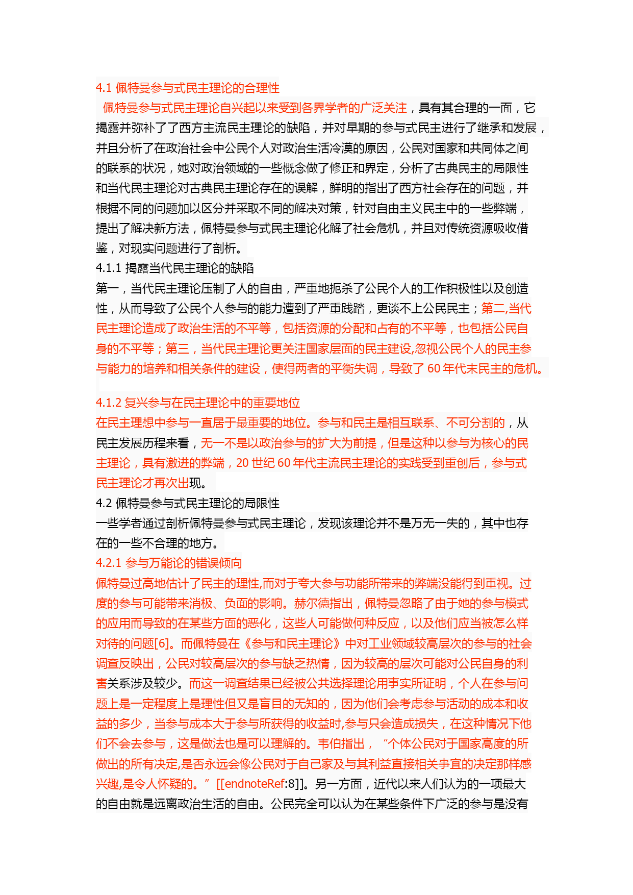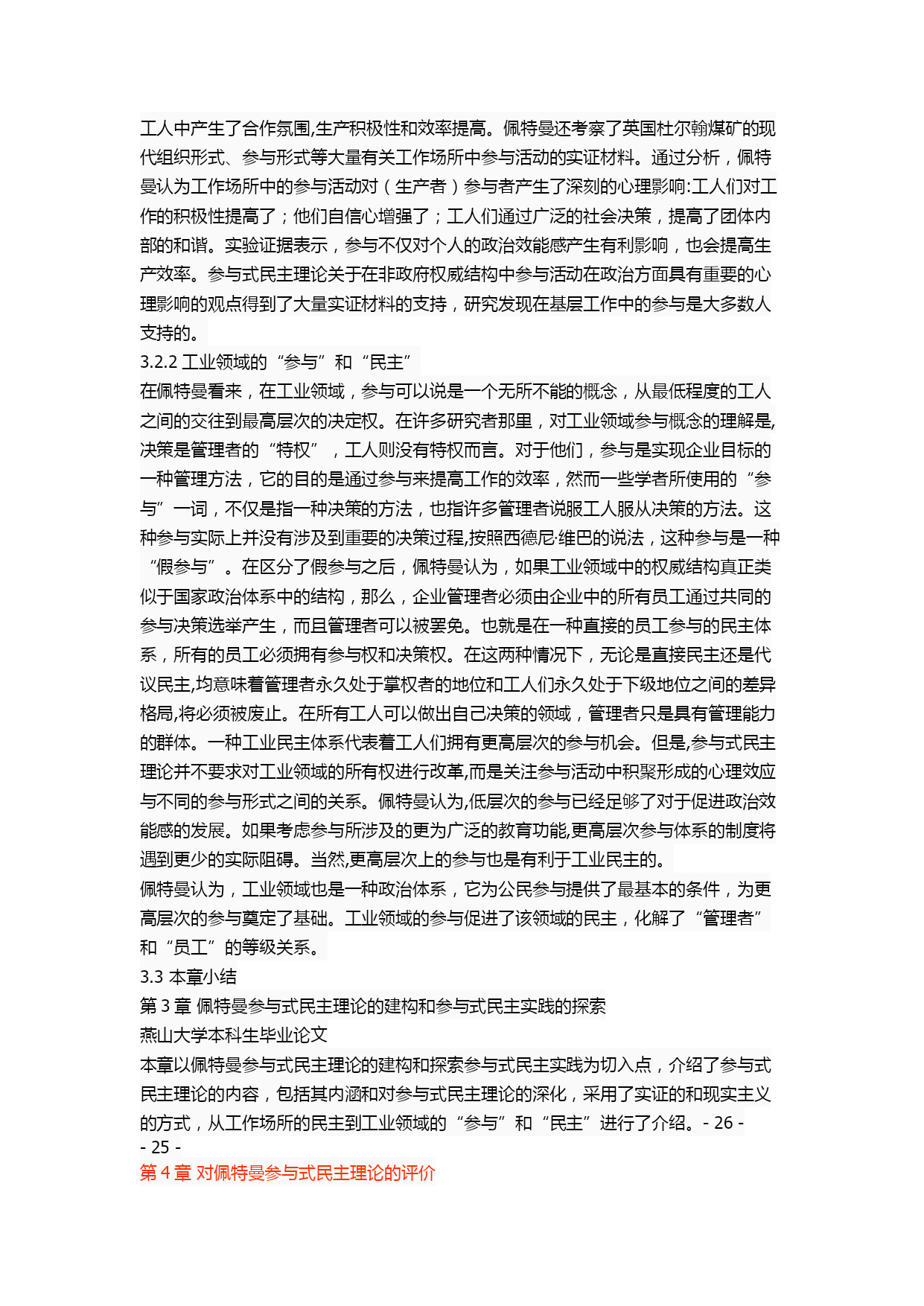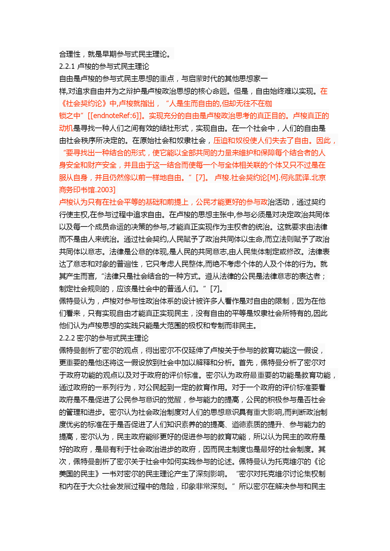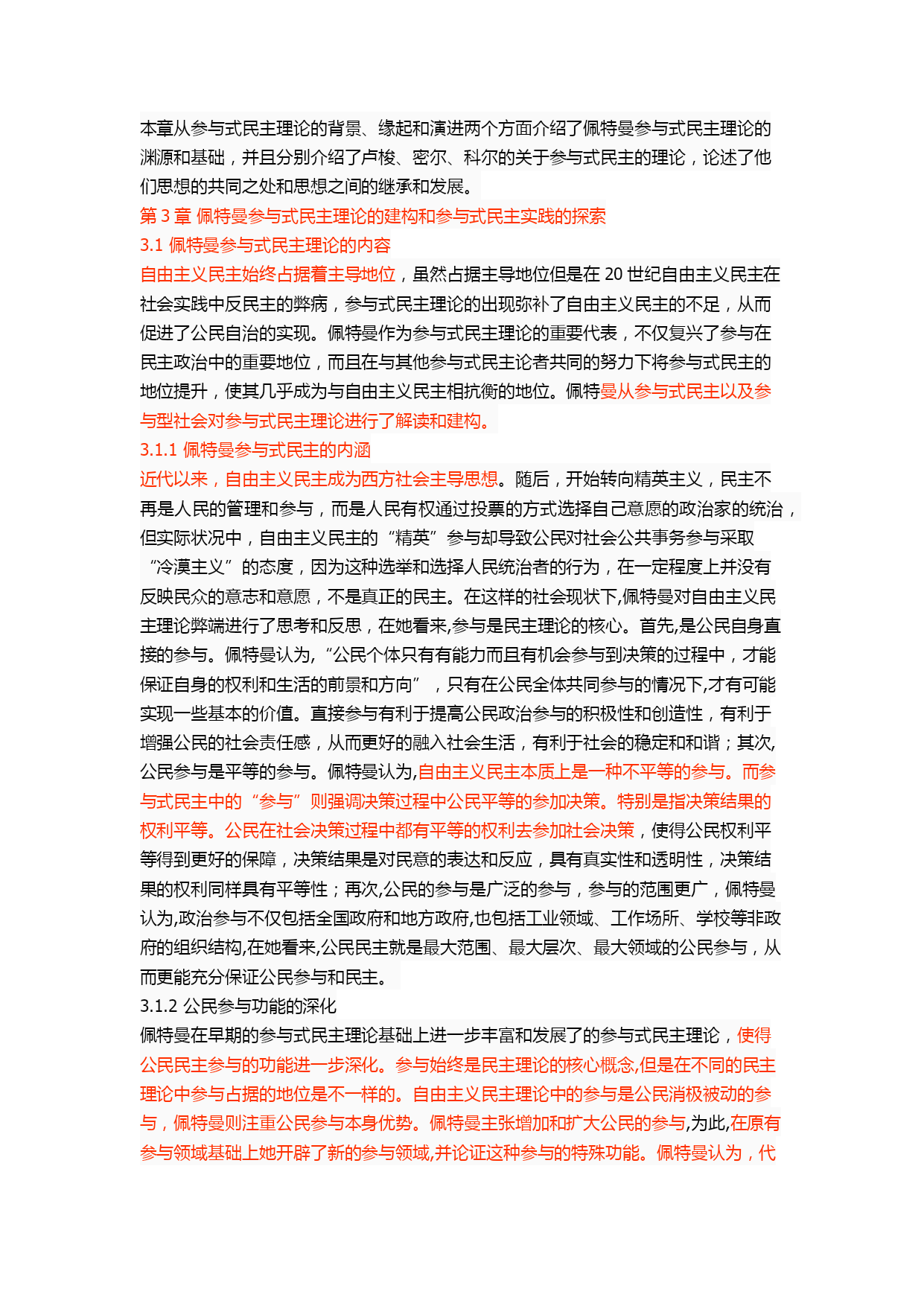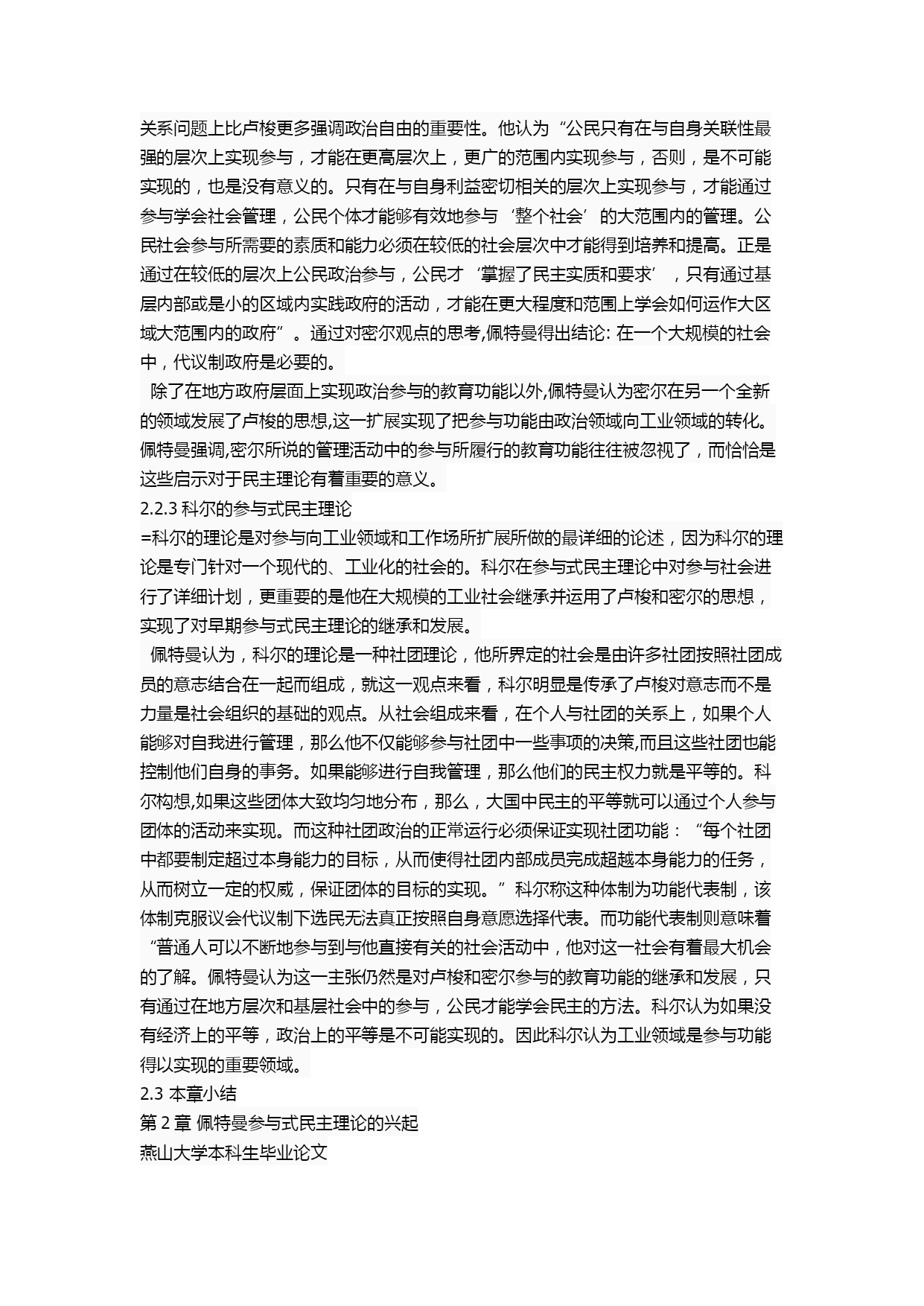 摘要在20世纪六七十年代,西方社会爆发了追求民主运动,但是参与却受不到重视,民众对社会事务冷漠,不感兴趣。于是学者们进行不断的反省、思索,HYPERLINK"javascript:;"于1960年,阿诺德·考夫曼首次提出了“参与民主”这一概念。于1970年,佩特曼出版《参与和民主理论》一书,该书是参与式民主理论的正式兴起的标志,从理论和社会实践对参与式民主理论进行诠释和构建[[endnoteRef:0]]。佩特曼的参与式民主理论具有其合理性和局限性。王晓丽.卡罗尔·佩特曼的参与民主理论评析[J].内蒙古大学学报(哲学社会科学版).2009.]关键词:佩特曼;参与;民主;参与式民主理论;AbstractInthe60sand70stwentiethCentury,theDemocraticMovementbrokeoutinthewesternsociety,buttherewasnopositioninthecontemporarydemocratictheoryinthemainstream.Inmoderntimes,inthefieldofWesterndemocraticresearch,representativedemocracywithliberalismasavalueorientationhasoccupiedthemainstreamofthetheoryofthepeople,butitsdisadvantagesinreality.Theendisalsograduallyshowingthatcitizensare"indifferent"towardssocialpublicaffairs.Insuchasocialbackground,scholarshaveconstantlyintrospection,thinkandexploretherealityofthesituation,in1960ArnoldKaufmanfirstproposedtheconceptof"participationindemocracy".In1970,Pettmanpublishedabookonparticipationanddemocracy,whichmarkstheformalriseoftheparticipatorydemocracytheory.Thisbookconstructsandinterpretstheparticipatorydemocratictheoryfromtheconnotation,function,realizationlevelandParticipatorySocietyofparticipatorydemocracy.Pettman'sparticipatorydemocracytheorynotonlyhasbenifit,butalsohasshortcoming.Keywords:Pettman;participation;democracy;participatorydemocracytheory;contemporaryenlightenment.-7-第1章绪论1.1选题的依据及意义在追求民主日益成为当代世界主流话语背景下,以及我国公民参与热情日益高涨,社会经济繁荣,政治文化的发展,公民素质以及政治素养的提高,公民要求获得更多的政治参与的权利,但是众多社会矛盾的作用下,公民的政治参与得不到真正的保证,同时还有另外一种情况的出现就是“政治冷漠”,公民的政治参与能力不高,积极性不高,社会责任意识不高等问题亟待解决[[endnoteRef:1]]。参与式民主理论有利于推动政府决策的民主化、科学化,促进政府职能的转变和政府民主政治建设、使得政府的决策充分反映民意,增强政府的威信和公民对政府的信任和支持。参与式民主理论强调公民积极主动的参与社会政治生活,增强公民政治参与的能力、素质和政治参与的积极性,从而建设全民参与的参与型社会,佩特曼参与式民主理论不仅对于西方社会具有借鉴意义,对于我国的社会主义民主政治建设同样具有一定的社会作用。针对参与式民主理论的发展状况,我国不能单纯的借鉴西方的参与式民主理论,还要根据我国的实际情况加以发展,从而能够针对我国民主政治建设的弊病加以对症下药。从我国社会管理体制改革的角度来说,参与式民主有利于促进社会民主治理。所以研究参与式民主理论具有一定的意义。刘军宁.民主与民主化[M].北京商务印书馆.1999]参与式民主具有重要的意义,首先是学术意义,参与式民主理论自兴起就在社会引起了广泛的影响,其原因不仅是因为该理论产生于西方社会危机的运动中,更是因为它在指出并弥补了西方主流民主理论的弊端,得出了只有不断增强公民对政治参与的兴趣,