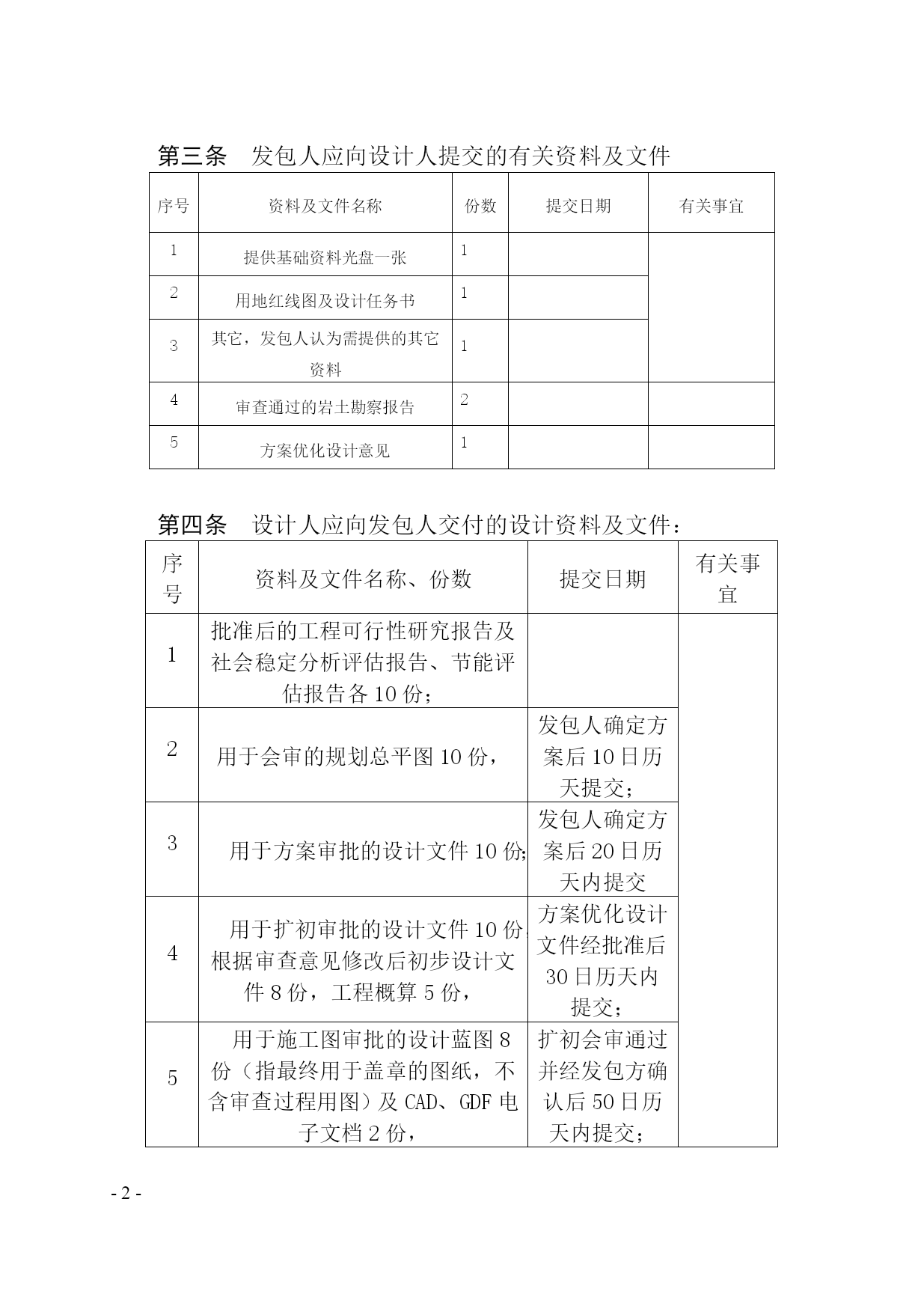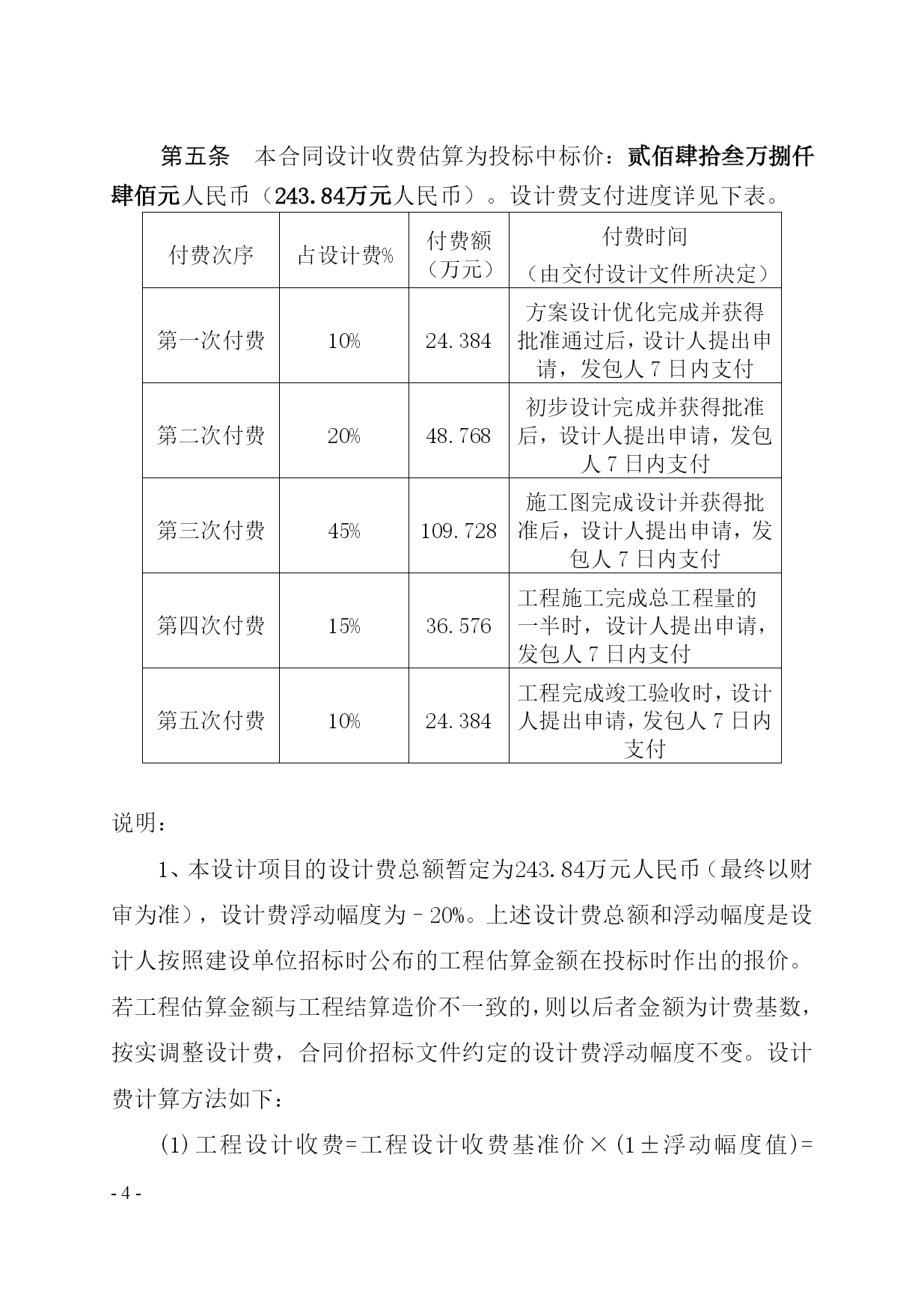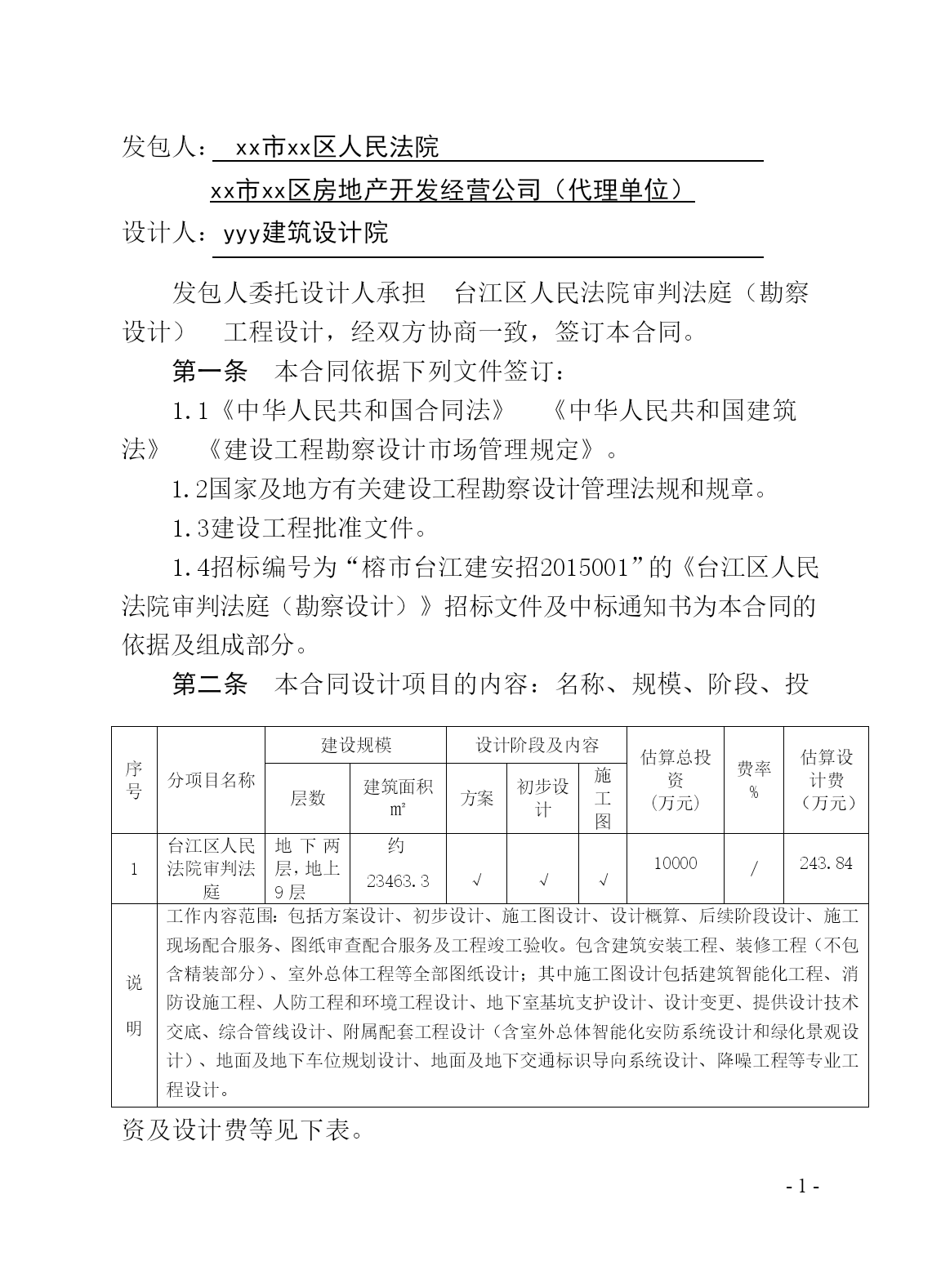 PAGEPAGE-15-GF-2000-0209建设工程设计合同(一)(民用建设工程设计合同)工程名称:台江区人民法院审判法庭工程地点:福建省xx市xx区合同编号:2016-15(由设计人编填)设计证书等级:建筑工程设计甲级资质发包人:xx市xx区人民法院xx市xx区房地产开发经营公司(代理单位)设计人:yyy建筑设计院签订日期:2016年12月中华人民共和国住建部监制国家工商行政管理局发包人:xx市xx区人民法院xx市xx区房地产开发经营公司(代理单位)设计人:yyy建筑设计院发包人委托设计人承担台江区人民法院审判法庭(勘察设计)工程设计,经双方协商一致,签订本合同。第一条本合同依据下列文件签订:1.1《中华人民共和国合同法》《中华人民共和国建筑法》《建设工程勘察设计市场管理规定》。1.2国家及地方有关建设工程勘察设计管理法规和规章。1.3建设工程批准文件。1.4招标编号为“榕市台江建安招2015001”的《台江区人民法院审判法庭(勘察设计)》招标文件及中标通知书为本合同的依据及组成部分。第二条本合同设计项目的内容:名称、规模、阶段、投资及设计费等见下表。序号分项目名称建设规模设计阶段及内容估算总投资(万元)费率%估算设计费(万元)层数建筑面积㎡方案初步设计施工图1台江区人民法院审判法庭地下两层,地上9层约23463.3√√√10000/243.84说明工作内容范围:包括方案设计、初步设计、施工图设计、设计概算、后续阶段设计、施工现场配合服务、图纸审查配合服务及工程竣工验收。包含建筑安装工程、装修工程(不包含精装部分)、室外总体工程等全部图纸设计;其中施工图设计包括建筑智能化工程、消防设施工程、人防工程和环境工程设计、地下室基坑支护设计、设计变更、提供设计技术交底、综合管线设计、附属配套工程设计(含室外总体智能化安防系统设计和绿化景观设计)、地面及地下车位规划设计、地面及地下交通标识导向系统设计、降噪工程等专业工程设计。第三条发包人应向设计人提交的有关资料及文件序号资料及文件名称份数提交日期有关事宜1提供基础资料光盘一张12用地红线图及设计任务书13其它,发包人认为需提供的其它资料14审查通过的岩土勘察报告25方案优化设计意见1第四条设计人应向发包人交付的设计资料及文件:序号资料及文件名称、份数提交日期有关事宜1批准后的工程可行性研究报告及社会稳定分析评估报告、节能评估报告各10份;2用于会审的规划总平图10份,发包人确定方案后10日历天提交;3用于方案审批的设计文件10份;发包人确定方案后20日历天内提交4用于扩初审批的设计文件10份,根据审查意见修改后初步设计文件8份,工程概算5份,方案优化设计文件经批准后30日历天内提交;5用于施工图审批的设计蓝图8份(指最终用于盖章的图纸,不含审查过程用图)及CAD、GDF电子文档2份,扩初会审通过并经发包方确认后50日历天内提交;6根据施工图审查意见及相关部门审查意见修改后的建筑单体以及人防、消防、安防等施工图修订文本12份,在施工图审查合格后15日历天;7专项设计(包含轻型钢结构、建筑智能化、环境设计等)12份,在施工图审查合格后30日历天内提供;8室外总体(含道路广场、园林景观、给水排水、路灯照明等)施工图12份,在施工图审查合格后30日历天内提供;9最终成果的书面计算书一份,全部存档图纸的光盘两张,CAD图纸光盘应按照发包人要求提交(设计方不得加密、设置使用权限等,应方便发包人编制工程控制价以及相关报建手续办理等);施工图审批设计文件经批准后10日历天内提交,10如另有加晒图纸。以A4图纸每张0.5元,A3图纸每张1元,A2图纸每张2元,A1以上图纸每张4元收取工本费;第五条本合同设计收费估算为投标中标价:贰佰肆拾叁万捌仟肆佰元人民币(243.84万元人民币)。设计费支付进度详见下表。付费次序占设计费%付费额(万元)付费时间(由交付设计文件所决定)第一次付费10%24.384方案设计优化完成并获得批准通过后,设计人提出申请,发包人7日内支付第二次付费20%48.768初步设计完成并获得批准后,设计人提出申请,发包人7日内支付第三次付费45%109.728施工图完成设计并获得批准后,设计人提出申请,发包人7日内支付第四次付费15%36.576工程施工完成总工程量的一半时,设计人提出申请,发包人7日内支付第五次付费10%24.384工程完成竣工验收时,设计人提出申请,发包人7日内支付说明:1、本设计项目的设计费总额暂定为243.84万元人民币(最终以财审为准),设计费浮动幅度为–20%。上述设计费总额和浮动幅度是设计人按照建设单位招标时公布的工程估算金额在投标时作出