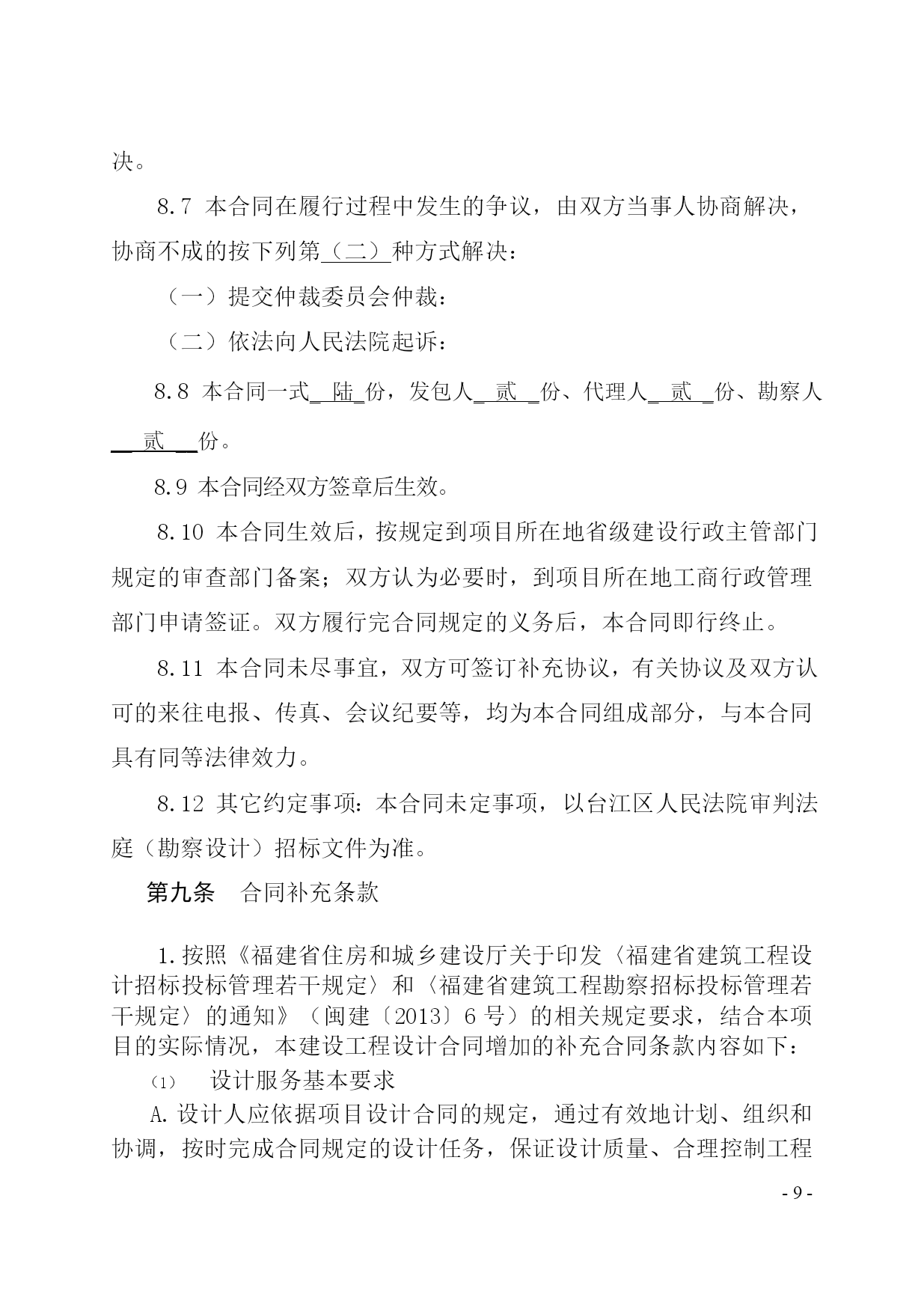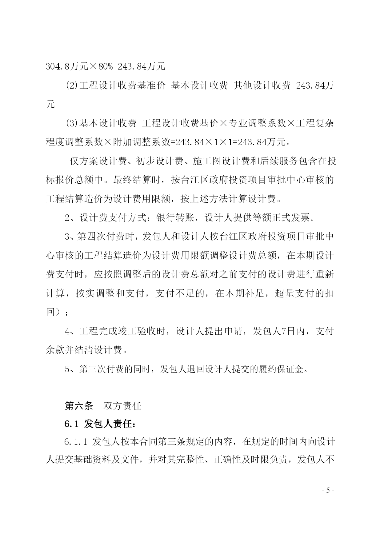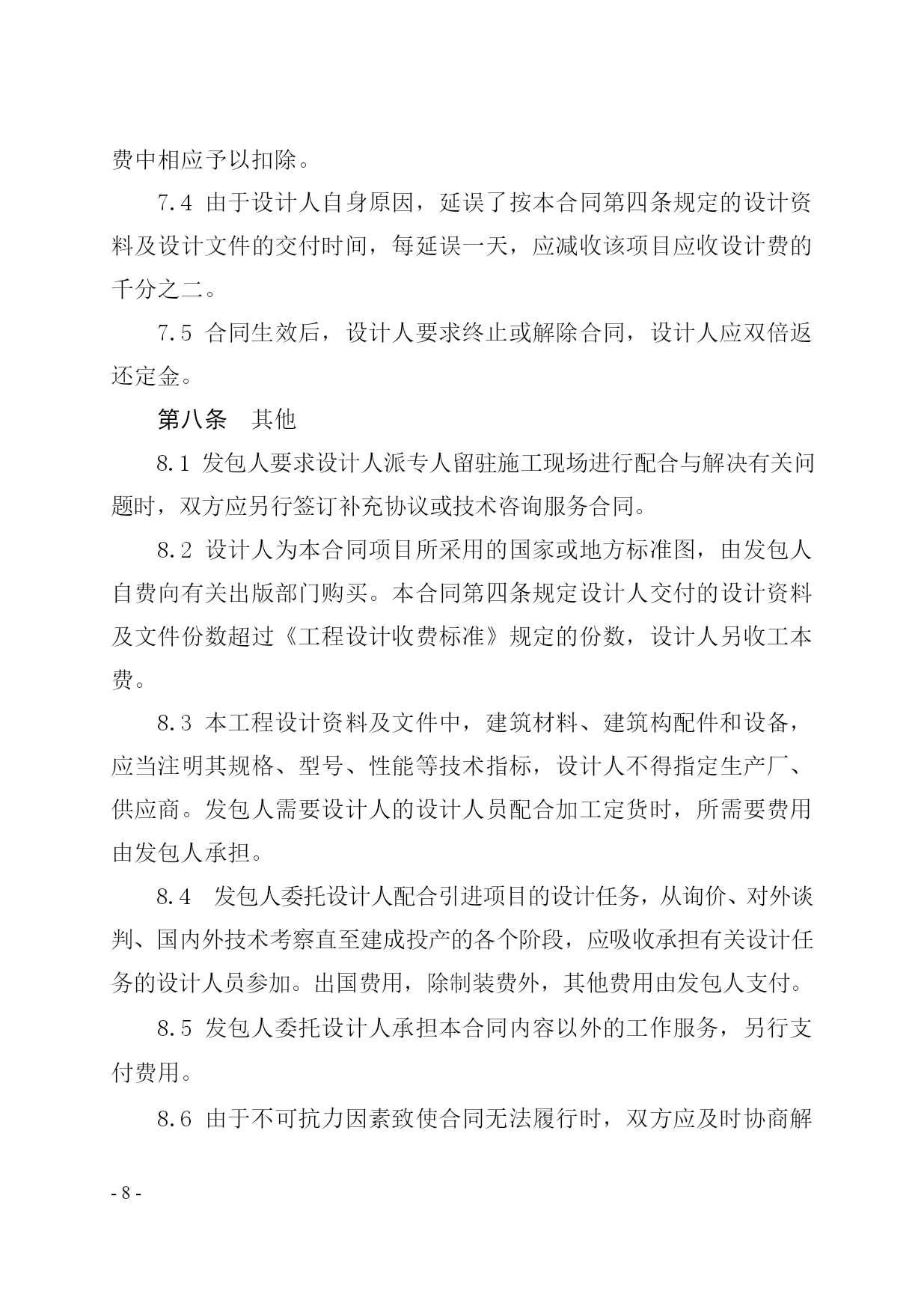 PAGEPAGE-15-GF-2000-0209建设工程设计合同(一)(民用建设工程设计合同)工程名称:台江区人民法院审判法庭工程地点:福建省xx市xx区合同编号:2016-15(由设计人编填)设计证书等级:建筑工程设计甲级资质发包人:xx市xx区人民法院xx市xx区房地产开发经营公司(代理单位)设计人:yyy建筑设计院签订日期:2016年12月中华人民共和国住建部监制国家工商行政管理局发包人:xx市xx区人民法院xx市xx区房地产开发经营公司(代理单位)设计人:yyy建筑设计院发包人委托设计人承担台江区人民法院审判法庭(勘察设计)工程设计,经双方协商一致,签订本合同。第一条本合同依据下列文件签订:1.1《中华人民共和国合同法》《中华人民共和国建筑法》《建设工程勘察设计市场管理规定》。1.2国家及地方有关建设工程勘察设计管理法规和规章。1.3建设工程批准文件。1.4招标编号为“榕市台江建安招2015001”的《台江区人民法院审判法庭(勘察设计)》招标文件及中标通知书为本合同的依据及组成部分。第二条本合同设计项目的内容:名称、规模、阶段、投资及设计费等见下表。序号分项目名称建设规模设计阶段及内容估算总投资(万元)费率%估算设计费(万元)层数建筑面积㎡方案初步设计施工图1台江区人民法院审判法庭地下两层,地上9层约23463.3√√√10000/243.84说明工作内容范围:包括方案设计、初步设计、施工图设计、设计概算、后续阶段设计、施工现场配合服务、图纸审查配合服务及工程竣工验收。包含建筑安装工程、装修工程(不包含精装部分)、室外总体工程等全部图纸设计;其中施工图设计包括建筑智能化工程、消防设施工程、人防工程和环境工程设计、地下室基坑支护设计、设计变更、提供设计技术交底、综合管线设计、附属配套工程设计(含室外总体智能化安防系统设计和绿化景观设计)、地面及地下车位规划设计、地面及地下交通标识导向系统设计、降噪工程等专业工程设计。第三条发包人应向设计人提交的有关资料及文件序号资料及文件名称份数提交日期有关事宜1提供基础资料光盘一张12用地红线图及设计任务书13其它,发包人认为需提供的其它资料14审查通过的岩土勘察报告25方案优化设计意见1第四条设计人应向发包人交付的设计资料及文件:序号资料及文件名称、份数提交日期有关事宜1批准后的工程可行性研究报告及社会稳定分析评估报告、节能评估报告各10份;2用于会审的规划总平图10份,发包人确定方案后10日历天提交;3用于方案审批的设计文件10份;发包人确定方案后20日历天内提交4用于扩初审批的设计文件10份,根据审查意见修改后初步设计文件8份,工程概算5份,方案优化设计文件经批准后30日历天内提交;5用于施工图审批的设计蓝图8份(指最终用于盖章的图纸,不含审查过程用图)及CAD、GDF电子文档2份,扩初会审通过并经发包方确认后50日历天内提交;6根据施工图审查意见及相关部门审查意见修改后的建筑单体以及人防、消防、安防等施工图修订文本12份,在施工图审查合格后15日历天;7专项设计(包含轻型钢结构、建筑智能化、环境设计等)12份,在施工图审查合格后30日历天内提供;8室外总体(含道路广场、园林景观、给水排水、路灯照明等)施工图12份,在施工图审查合格后30日历天内提供;9最终成果的书面计算书一份,全部存档图纸的光盘两张,CAD图纸光盘应按照发包人要求提交(设计方不得加密、设置使用权限等,应方便发包人编制工程控制价以及相关报建手续办理等);施工图审批设计文件经批准后10日历天内提交,10如另有加晒图纸。以A4图纸每张0.5元,A3图纸每张1元,A2图纸每张2元,A1以上图纸每张4元收取工本费;第五条本合同设计收费估算为投标中标价:贰佰肆拾叁万捌仟肆佰元人民币(243.84万元人民币)。设计费支付进度详见下表。付费次序占设计费%付费额(万元)付费时间(由交付设计文件所决定)第一次付费10%24.384方案设计优化完成并获得批准通过后,设计人提出申请,发包人7日内支付第二次付费20%48.768初步设计完成并获得批准后,设计人提出申请,发包人7日内支付第三次付费45%109.728施工图完成设计并获得批准后,设计人提出申请,发包人7日内支付第四次付费15%36.576工程施工完成总工程量的一半时,设计人提出申请,发包人7日内支付第五次付费10%24.384工程完成竣工验收时,设计人提出申请,发包人7日内支付说明:1、本设计项目的设计费总额暂定为243.84万元人民币(最终以财审为准),设计费浮动幅度为–20%。上述设计费总额和浮动幅度是设计人按照建设单位招标时公布的工程估算金额在投标时作出
