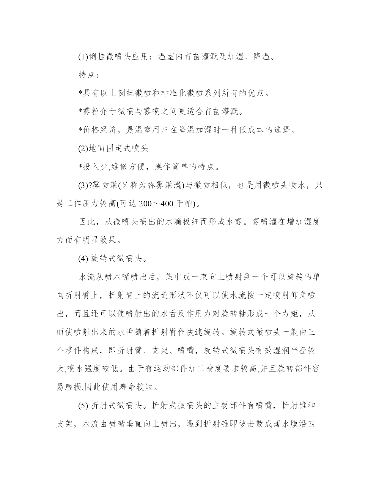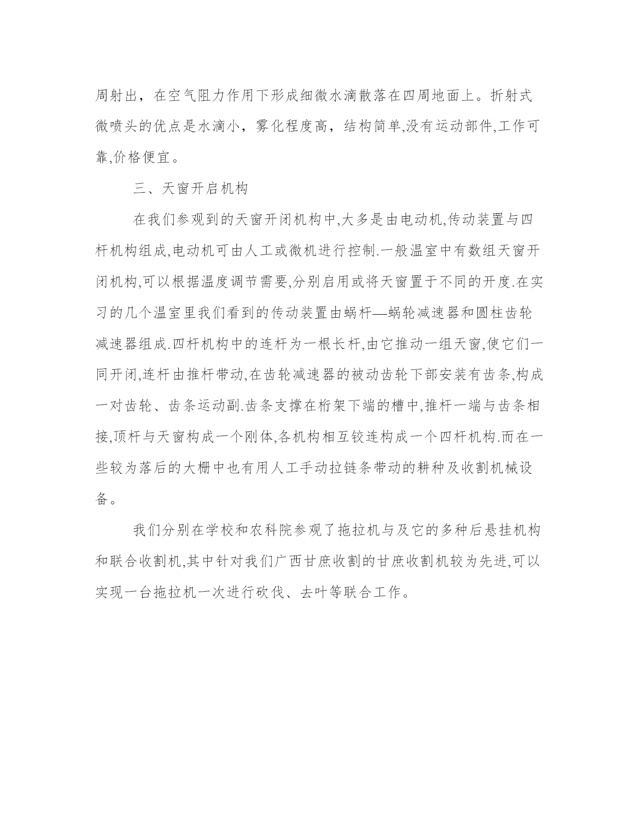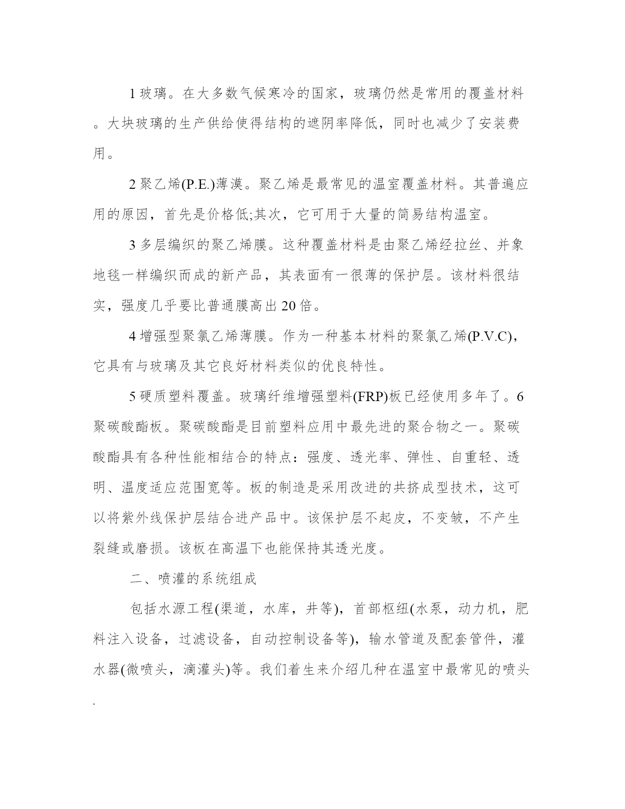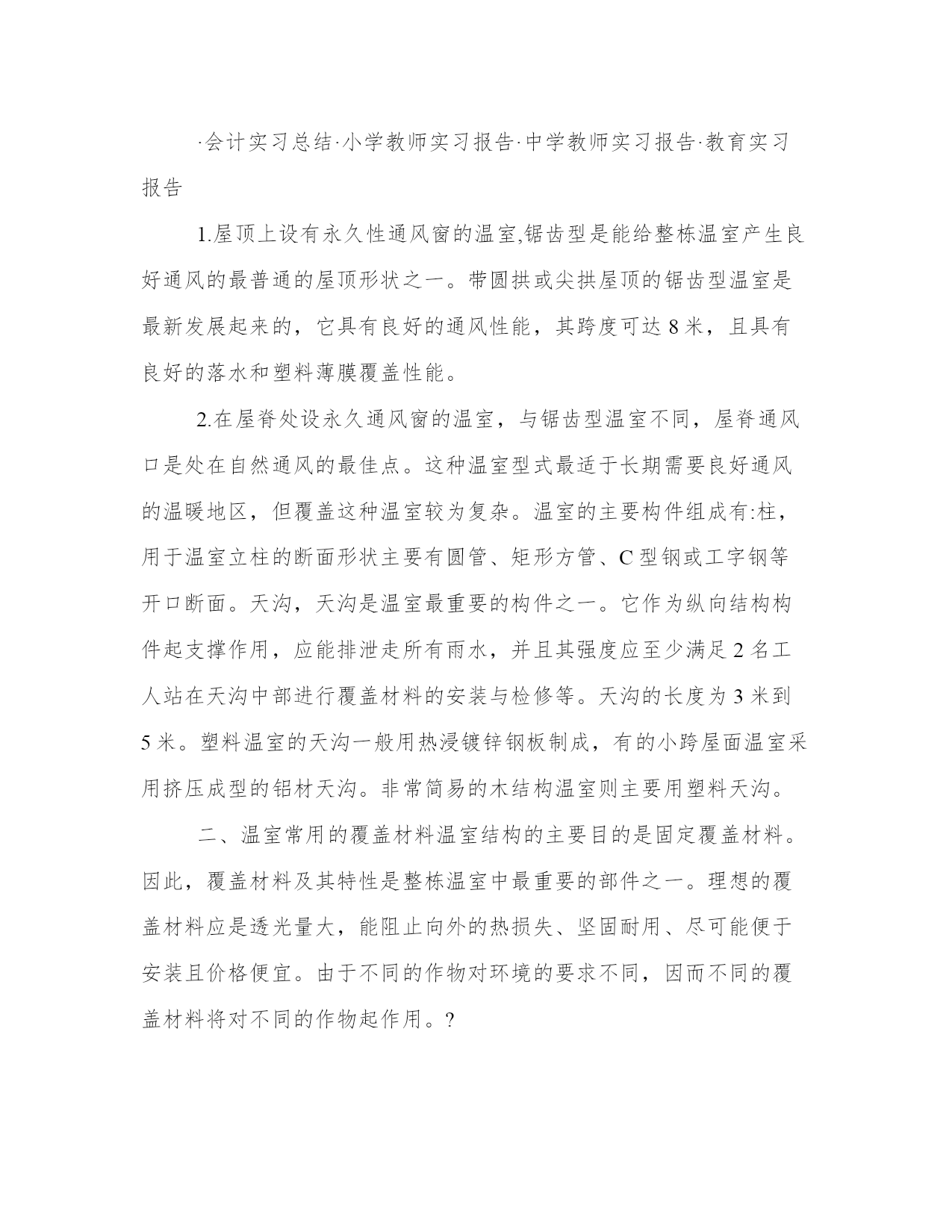 园林机械实习报告一、温室大栅结构。二、温室大栅的喷灌系统。三、温室大栅的的天窗开启系统。四、耕种及收割机械设备。一个完整的温室系统通常包括下列各个部分或其中的部分内容:1.建筑结构;2.覆盖材料;3.通风系统;4.降温系统;5.加热系统;6.保温节能系统;7.遮光系统;8.室内空气循环系统;9.CO2施肥系统;10.人工光照;11.栽培床(架)与基质;12.计算机控制的灌溉与施肥系统;13.环境控制系统;14.材料处理设备。一个温室中是否需要包括上述各项内容,通常要看所种植的作物的种类、当地的气候条件和经济制约的影响而取舍。一、在实习中我们所见到的温室的主要类型与屋顶形状有:(一)圆拱型屋顶(二)尖拱型屋顶(三)双坡或单坡屋顶。上述三种屋顶形状的温室结构,既可以设屋脊通风口(天窗)、天沟通风口(谷间窗),也可以完全密闭不设自然通风口。·电工实习报告·工厂实习报告·广告实习报告·电视台实习报告·土木实习报告·电信实习报告·计算机专业实习报告·外贸实习报告·会计实习总结·小学教师实习报告·中学教师实习报告·教育实习报告1.屋顶上设有永久性通风窗的温室,锯齿型是能给整栋温室产生良好通风的最普通的屋顶形状之一。带圆拱或尖拱屋顶的锯齿型温室是最新发展起来的,它具有良好的通风性能,其跨度可达8米,且具有良好的落水和塑料薄膜覆盖性能。2.在屋脊处设永久通风窗的温室,与锯齿型温室不同,屋脊通风口是处在自然通风的最佳点。这种温室型式最适于长期需要良好通风的温暖地区,但覆盖这种温室较为复杂。温室的主要构件组成有:柱,用于温室立柱的断面形状主要有圆管、矩形方管、C型钢或工字钢等开口断面。天沟,天沟是温室最重要的构件之一。它作为纵向结构构件起支撑作用,应能排泄走所有雨水,并且其强度应至少满足2名工人站在天沟中部进行覆盖材料的安装与检修等。天沟的长度为3米到5米。塑料温室的天沟一般用热浸镀锌钢板制成,有的小跨屋面温室采用挤压成型的铝材天沟。非常简易的木结构温室则主要用塑料天沟。二、温室常用的覆盖材料温室结构的主要目的是固定覆盖材料。因此,覆盖材料及其特性是整栋温室中最重要的部件之一。理想的覆盖材料应是透光量大,能阻止向外的热损失、坚固耐用、尽可能便于安装且价格便宜。由于不同的作物对环境的要求不同,因而不同的覆盖材料将对不同的作物起作用。?1玻璃。在大多数气候寒冷的国家,玻璃仍然是常用的覆盖材料。大块玻璃的生产供给使得结构的遮阴率降低,同时也减少了安装费用。2聚乙烯(P.E.)薄漠。聚乙烯是最常见的温室覆盖材料。其普遍应用的原因,首先是价格低;其次,它可用于大量的简易结构温室。3多层编织的聚乙烯膜。这种覆盖材料是由聚乙烯经拉丝、并象地毯一样编织而成的新产品,其表面有一很薄的保护层。该材料很结实,强度几乎要比普通膜高出20倍。4增强型聚氯乙烯薄膜。作为一种基本材料的聚氯乙烯(P.V.C),它具有与玻璃及其它良好材料类似的优良特性。5硬质塑料覆盖。玻璃纤维增强塑料(FRP)板已经使用多年了。6聚碳酸酯板。聚碳酸酯是目前塑料应用中最先进的聚合物之一。聚碳酸酯具有各种性能相结合的特点:强度、透光率、弹性、自重轻、透明、温度适应范围宽等。板的制造是采用改进的共挤成型技术,这可以将紫外线保护层结合进产品中。该保护层不起皮,不变皱,不产生裂缝或磨损。该板在高温下也能保持其透光度。二、喷灌的系统组成包括水源工程(渠道,水库,井等),首部枢纽(水泵,动力机,肥料注入设备,过滤设备,自动控制设备等),输水管道及配套管件,灌水器(微喷头,滴灌头)等。我们着生来介绍几种在温室中最常见的喷头.(1)倒挂微喷头应用:温室内育苗灌溉及加湿、降温。特点:*具有以上倒挂微喷和标准化微喷系列所有的优点。*雾粒介于微喷与雾喷之间更适合育苗灌溉。*价格经济,是温室用户在降温加湿时一种低成本的选择。(2)地面固定式喷头*投入少,维修方便,操作简单的特点。(3)?雾喷灌(又称为弥雾灌溉)与微喷相似,也是用微喷头喷水,只是工作压力较高(可达200~400干帕)。因此,从微喷头喷出的水滴极细而形成水雾。雾喷灌在增加湿度方面有明显效果。(4).旋转式微喷头。水流从喷水嘴喷出后,集中成一束向上喷射到一个可以旋转的单向折射臂上,折射臂上的流道形状不仅可以使水流按一定喷射仰角喷出,而且还可以使喷射出的水舌反作用力对旋转轴形成一个力矩,从而使喷射出来的水舌随着折射臂作快速旋转。旋转式微喷头一般由三个零件构成,即折射臂、支架、喷嘴,旋转式微喷头有效湿润半径较大,喷水强度较低。由于有运动部件加工精度要求较高,并且旋转部件容易磨损,因此使用寿命较短。(5).折射式微喷头。折射式微喷头的主要部件有喷嘴,折射锥和支架,水流由喷嘴垂直向上喷出,遇到折射锥即