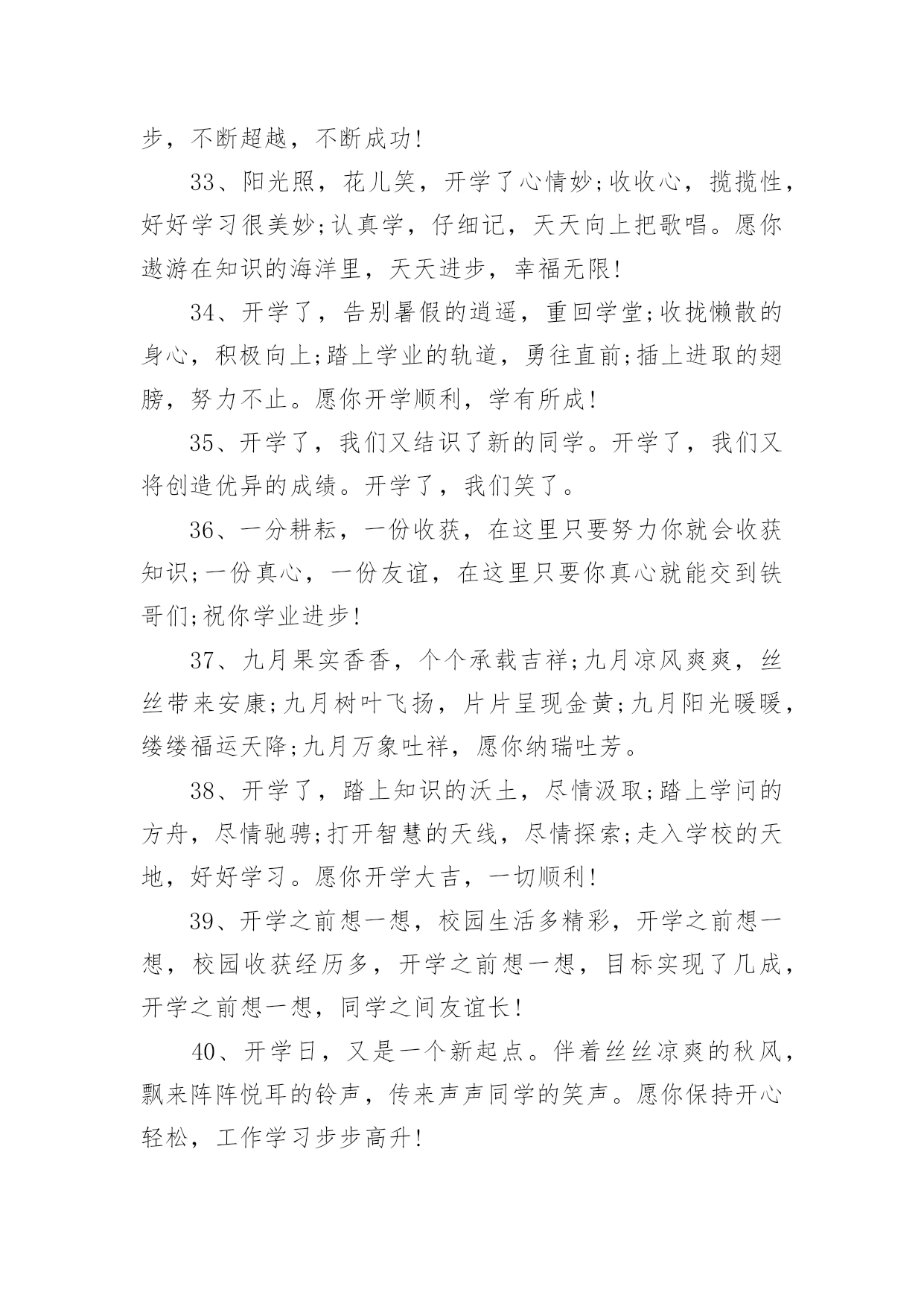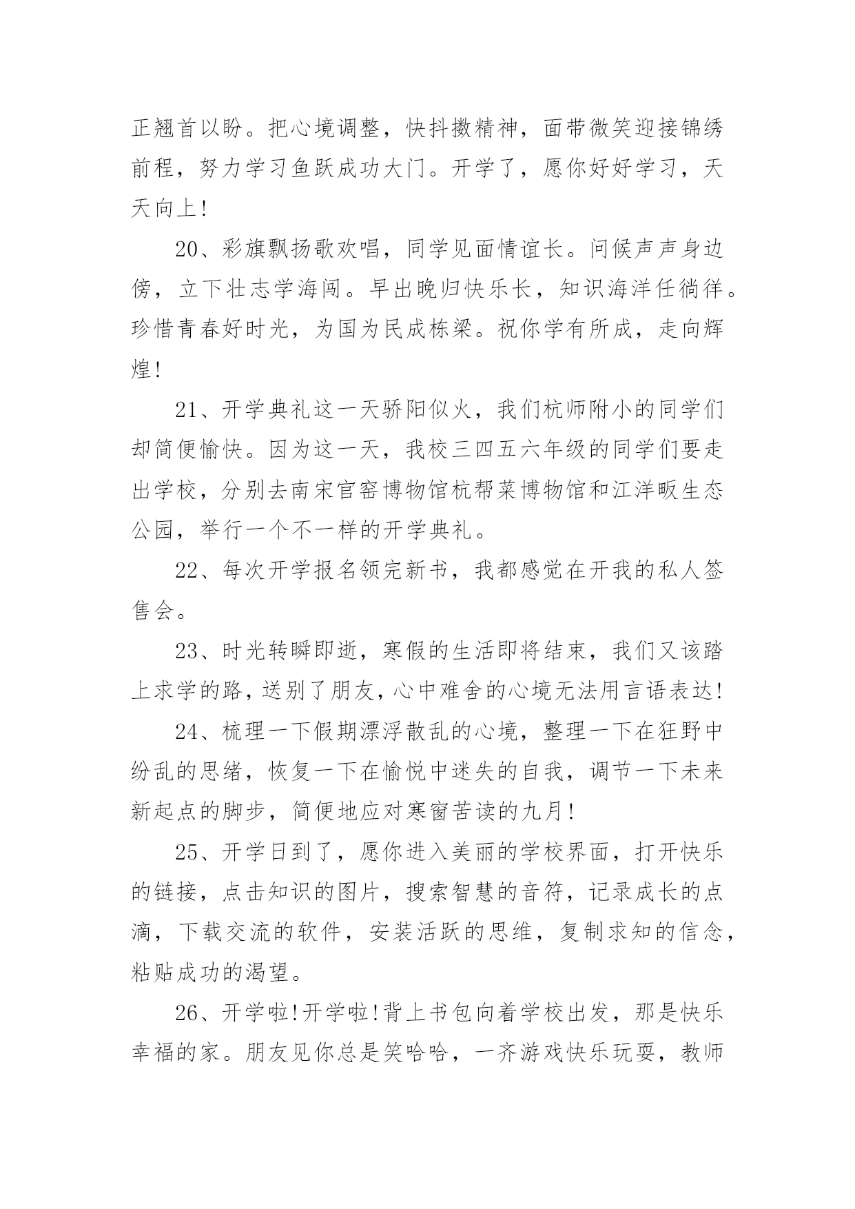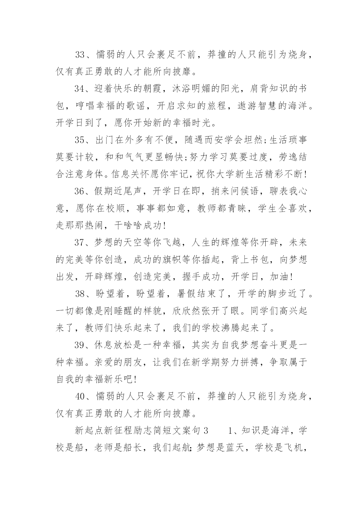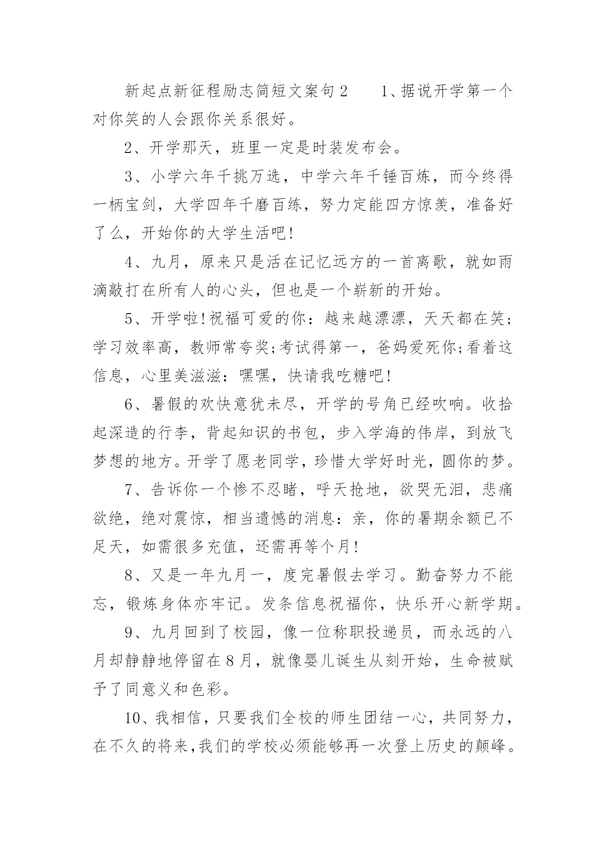 新起点新征程励志简短文案新起点新征程励志简短文案(通用140句)随着社交平台的兴起,大家都看到过文案吧,文案用于记录和分享生活中有意义的事。想发文案却总是不知道怎么组织语言?下面是小编收集整理的新起点新征程励志简短文案,希望对大家有所帮助。新起点新征程励志简短文案句11、开学了,和暑假说声再见,和玩乐说声拜拜,和自在说声再会,和开学说声加油。祝愿你在新的学期里有新的目标新的希望新的起点新的口号新的面貌新的进步,愿你百尺竿头更进一步!2、金秋的风景怡人性情,九月的开学别样美丽。快乐的伙伴相约一起,快乐的歌声心底唱响。知识的花朵散发芬芳,幸福的课堂绽放光芒。3、开学了!开学了!”随着一阵阵欢呼的叫声,把我从假期的梦中唤醒。说实话,一个月没来学校,我还真有点怀念在学校的生活呢!4、重返美丽校园,与勤奋为伍,认真读书,开创美好明天,昔日同学再见,以团结为伴,互帮互助,演译同学情深,开学日,愿你加油鼓劲,开拓辉煌未来!5、一年好景君须记,最是橙黄橘绿时,金秋迎来新学年,巨轮扬帆鸣汽笛,放飞梦想前程灿,健康成长,全面发展!6、昨日是烟花,辉煌也陨落;今日是水花,及时把种子播;明日是礼花,一定为你缤纷闪烁。开学了,祝你踩着智慧,挥舞勤奋,看着指引,把成功写进这个学期的年轮。7、学会对你淡忘,从开学季开始。8、知识的大门,为你敞开;学问的天地,邀你驰骋;世界的奥妙,等你发掘;开学的号角,为你吹响。开学了,愿你学途坦荡,学业有成!9、清晨曙光初现,幸福在你身边,中午艳阳高照,微笑在你心间,傍晚日落西山,欢乐随你一天,关心你的朋友,从早晨到夜晚!10、开学了,校园里又变回以前那样的喧闹了。操场上很多同学,有散步的、有打排球的、有打篮球的、热闹极了!11、开学日,开开心心学东西,开门见山捡宝贝,开花结果成好事,开疆拓土创奇迹。祝福你开阔眼界,学有所成;开云见日,幸福普照。12、九月一日就开学,懒散行为快抛掉,学习计划要定好,贪吃贪睡必收敛,学习态度须端正,人生价值定位高,奋进小舟速启航,愿你学业成辉煌,新学期收获满满!13、九月干燥的季节,开学了又回熟悉的校园,又看见亲切的笑脸,又听到欢快的叫声。14、开学日到了,愿你进入美丽的校园界面,打开快乐的链接,点击知识的图片,搜索智慧的音符,记录成长的点滴,下载交流的软件,安装活跃的思维,复制求知的信念,粘贴成功的渴望。15、才能像粥,要勤奋的水,加智慧的火,下功夫熬知识,方能出炉能力的大餐,滋养你理想的躯干。新的学期来了,祝愿你学习有所成,梦想挂彩虹,理想腾蛟龙。16、岁月绽放青春笑容,又到九一开学日。熟悉的学堂充满全新的气息,可爱的同学依旧充满着朝气。知识的魅力,为你注满前进的动力,开心新学期。17、开学了,就代表一个新的学期又到来了。学习,是一个不断充实自己的过程,是一个不断超越自己的过程。18、新学期,让我们都加油去超越自己,开心享受青春岁月的绚丽多彩,把每一个日子都串起,编织一条闪亮的珍珠,藏在心灵深处。19、学校的铃声在召唤,同学的笑声在呼唤,别再将懒觉睡,别再将好梦追,迎着朝阳笑一笑,祝福陪你进学校。20、9月1日,我背着轻轻的书包,哼着小曲,来到了阔别已久的学校。校园里,玉兰树长高了许多,桂花树像一位发福的老人,圆滚滚的肚子正在朝我们摇晃。好像是邀请我们去那里遮荫。21、开学了,我保证您的学习生活是充满新鲜感的哦,知识是勤奋努力就能获取的哦,烦恼是终生包退的哦,快乐是随时能联系到的哦,祝福是真心实意送出的哦,记得回个信息给个好评哦。22、再多的悠闲时光已随时光远去,在一片欢声笑语中迎来新的学期。与家人挥挥手,迈出坚定的脚步;与朋友肩并肩,走向校园美景。23、知识的海洋等待你去遨游,知识的高-峰等待你去攀登。心中的梦想在向你招手,美好的未来在等你去开创。开学日到了,愿你勤奋努力,为成功开辟道路。加油!24、开学咯,开始骑车的生涯咯!一切从头开始,我现在只是一张白纸,从新开始!25、开学了,就好好读书吧,别想他了,未来更重要。26、知识的芬芳在前方飘荡,悦耳的铃声在校园里回响,亲密的伙伴等候在课桌旁,快乐的回忆在教室里闪光。开学日到了,愿你开心去上学,迎接灿烂朝霞。27、愿你张开青春的翅膀,翻过高高的书山,愿你迈开豪迈的脚步,跨过茫茫的题海。在崭新的学期里,祝你拥有灿烂辉煌的明天。开学日到了,你准备好了吗?28、秋季飘荡芬芳,瓜果纷纷吐香。校园格外宁静,到处都是风景。开足快乐马力,保持鲜活记忆。知识殿堂敞开,书写青春豪迈。开学日到了,背上书包,向着学校挺进。29、开学啦,不管是学校的学习,还是社会的学习,都愿你脚踏实地,勤奋努力,百尺竿头,更进一步。你最棒,加油!30、开学第一件事就是在布满灰尘的课桌上用手指写上某个人的名字,会心一笑,然后擦掉。31、开学日到了,愿你伴着凉爽的清风,带上轻