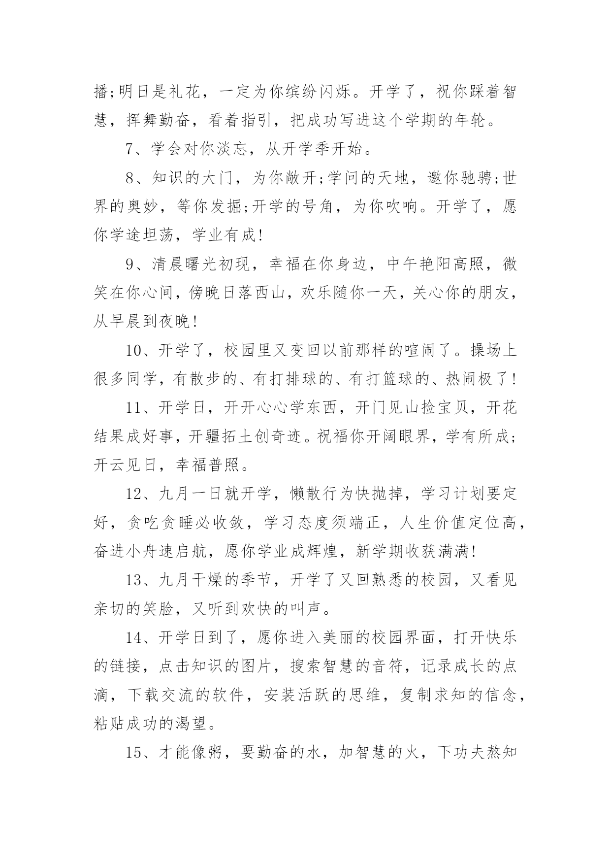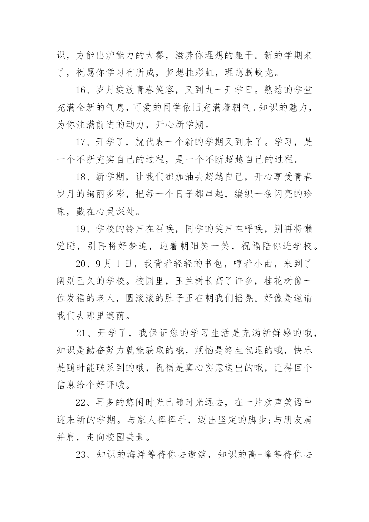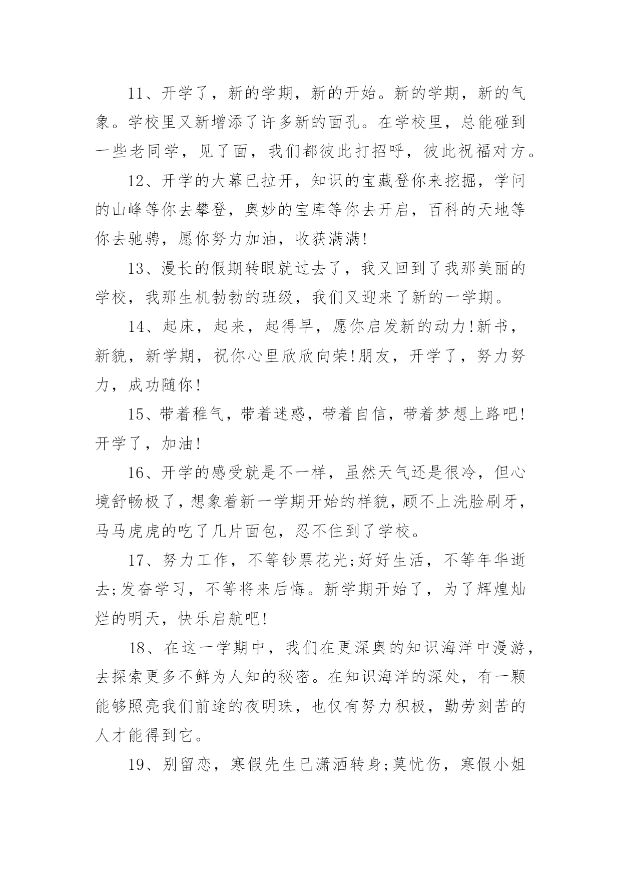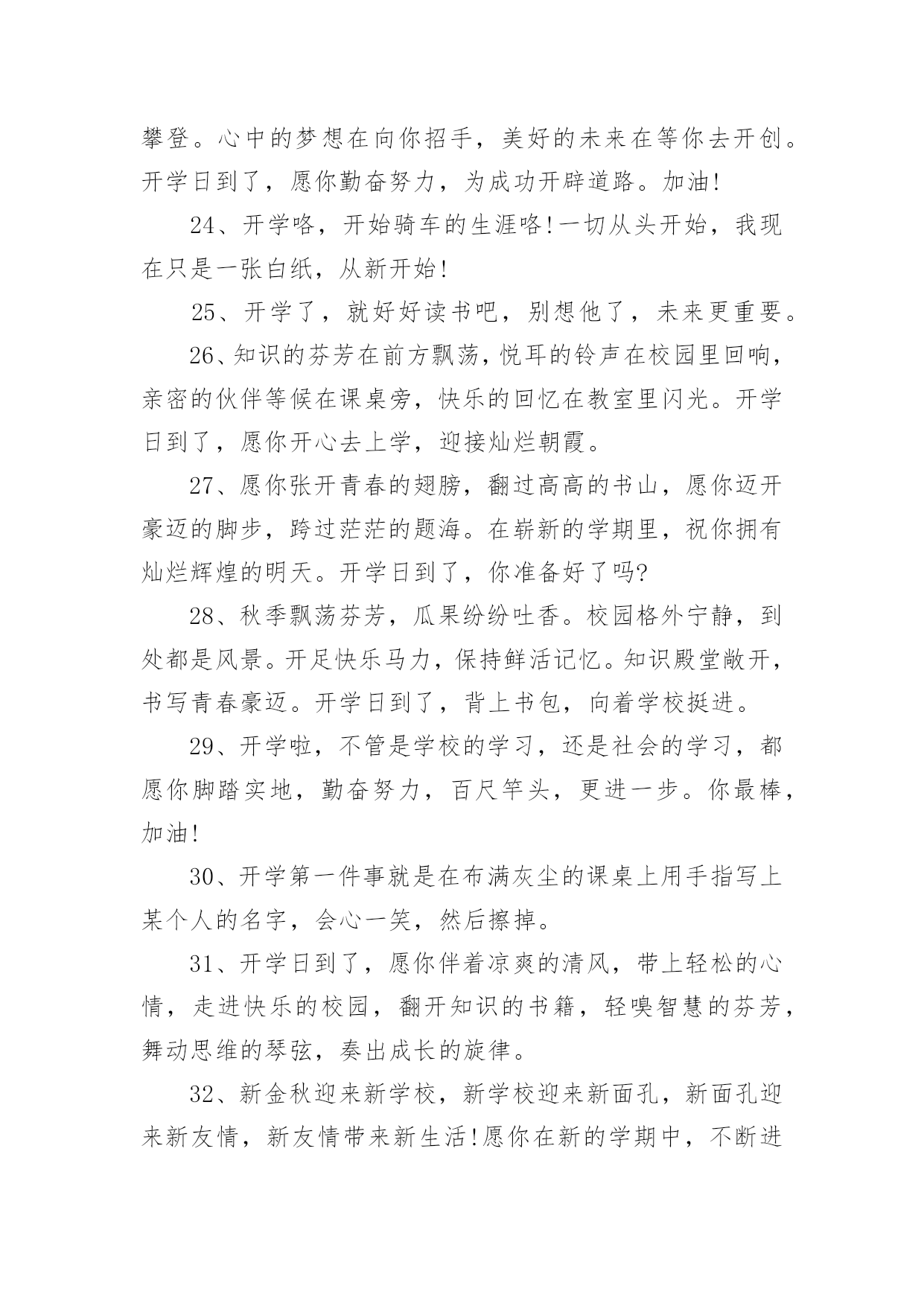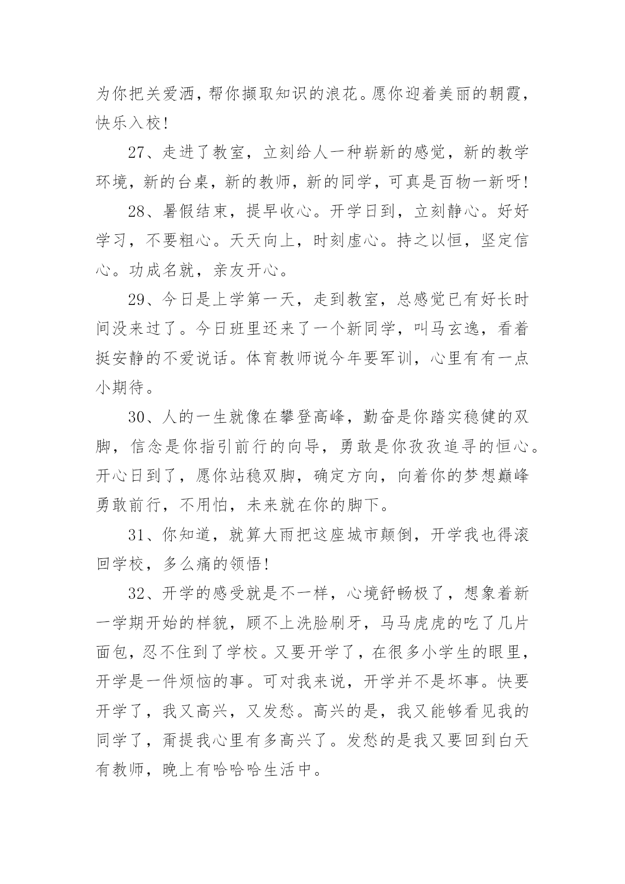 新起点新征程励志简短文案新起点新征程励志简短文案(通用140句)随着社交平台的兴起,大家都看到过文案吧,文案用于记录和分享生活中有意义的事。想发文案却总是不知道怎么组织语言?下面是小编收集整理的新起点新征程励志简短文案,希望对大家有所帮助。新起点新征程励志简短文案句11、开学了,和暑假说声再见,和玩乐说声拜拜,和自在说声再会,和开学说声加油。祝愿你在新的学期里有新的目标新的希望新的起点新的口号新的面貌新的进步,愿你百尺竿头更进一步!2、金秋的风景怡人性情,九月的开学别样美丽。快乐的伙伴相约一起,快乐的歌声心底唱响。知识的花朵散发芬芳,幸福的课堂绽放光芒。3、开学了!开学了!”随着一阵阵欢呼的叫声,把我从假期的梦中唤醒。说实话,一个月没来学校,我还真有点怀念在学校的生活呢!4、重返美丽校园,与勤奋为伍,认真读书,开创美好明天,昔日同学再见,以团结为伴,互帮互助,演译同学情深,开学日,愿你加油鼓劲,开拓辉煌未来!5、一年好景君须记,最是橙黄橘绿时,金秋迎来新学年,巨轮扬帆鸣汽笛,放飞梦想前程灿,健康成长,全面发展!6、昨日是烟花,辉煌也陨落;今日是水花,及时把种子播;明日是礼花,一定为你缤纷闪烁。开学了,祝你踩着智慧,挥舞勤奋,看着指引,把成功写进这个学期的年轮。7、学会对你淡忘,从开学季开始。8、知识的大门,为你敞开;学问的天地,邀你驰骋;世界的奥妙,等你发掘;开学的号角,为你吹响。开学了,愿你学途坦荡,学业有成!9、清晨曙光初现,幸福在你身边,中午艳阳高照,微笑在你心间,傍晚日落西山,欢乐随你一天,关心你的朋友,从早晨到夜晚!10、开学了,校园里又变回以前那样的喧闹了。操场上很多同学,有散步的、有打排球的、有打篮球的、热闹极了!11、开学日,开开心心学东西,开门见山捡宝贝,开花结果成好事,开疆拓土创奇迹。祝福你开阔眼界,学有所成;开云见日,幸福普照。12、九月一日就开学,懒散行为快抛掉,学习计划要定好,贪吃贪睡必收敛,学习态度须端正,人生价值定位高,奋进小舟速启航,愿你学业成辉煌,新学期收获满满!13、九月干燥的季节,开学了又回熟悉的校园,又看见亲切的笑脸,又听到欢快的叫声。14、开学日到了,愿你进入美丽的校园界面,打开快乐的链接,点击知识的图片,搜索智慧的音符,记录成长的点滴,下载交流的软件,安装活跃的思维,复制求知的信念,粘贴成功的渴望。15、才能像粥,要勤奋的水,加智慧的火,下功夫熬知识,方能出炉能力的大餐,滋养你理想的躯干。新的学期来了,祝愿你学习有所成,梦想挂彩虹,理想腾蛟龙。16、岁月绽放青春笑容,又到九一开学日。熟悉的学堂充满全新的气息,可爱的同学依旧充满着朝气。知识的魅力,为你注满前进的动力,开心新学期。17、开学了,就代表一个新的学期又到来了。学习,是一个不断充实自己的过程,是一个不断超越自己的过程。18、新学期,让我们都加油去超越自己,开心享受青春岁月的绚丽多彩,把每一个日子都串起,编织一条闪亮的珍珠,藏在心灵深处。19、学校的铃声在召唤,同学的笑声在呼唤,别再将懒觉睡,别再将好梦追,迎着朝阳笑一笑,祝福陪你进学校。20、9月1日,我背着轻轻的书包,哼着小曲,来到了阔别已久的学校。校园里,玉兰树长高了许多,桂花树像一位发福的老人,圆滚滚的肚子正在朝我们摇晃。好像是邀请我们去那里遮荫。21、开学了,我保证您的学习生活是充满新鲜感的哦,知识是勤奋努力就能获取的哦,烦恼是终生包退的哦,快乐是随时能联系到的哦,祝福是真心实意送出的哦,记得回个信息给个好评哦。22、再多的悠闲时光已随时光远去,在一片欢声笑语中迎来新的学期。与家人挥挥手,迈出坚定的脚步;与朋友肩并肩,走向校园美景。23、知识的海洋等待你去遨游,知识的高-峰等待你去攀登。心中的梦想在向你招手,美好的未来在等你去开创。开学日到了,愿你勤奋努力,为成功开辟道路。加油!24、开学咯,开始骑车的生涯咯!一切从头开始,我现在只是一张白纸,从新开始!25、开学了,就好好读书吧,别想他了,未来更重要。26、知识的芬芳在前方飘荡,悦耳的铃声在校园里回响,亲密的伙伴等候在课桌旁,快乐的回忆在教室里闪光。开学日到了,愿你开心去上学,迎接灿烂朝霞。27、愿你张开青春的翅膀,翻过高高的书山,愿你迈开豪迈的脚步,跨过茫茫的题海。在崭新的学期里,祝你拥有灿烂辉煌的明天。开学日到了,你准备好了吗?28、秋季飘荡芬芳,瓜果纷纷吐香。校园格外宁静,到处都是风景。开足快乐马力,保持鲜活记忆。知识殿堂敞开,书写青春豪迈。开学日到了,背上书包,向着学校挺进。29、开学啦,不管是学校的学习,还是社会的学习,都愿你脚踏实地,勤奋努力,百尺竿头,更进一步。你最棒,加油!30、开学第一件事就是在布满灰尘的课桌上用手指写上某个人的名字,会心一笑,然后擦掉。31、开学日到了,愿你伴着凉爽的清风,带上轻
